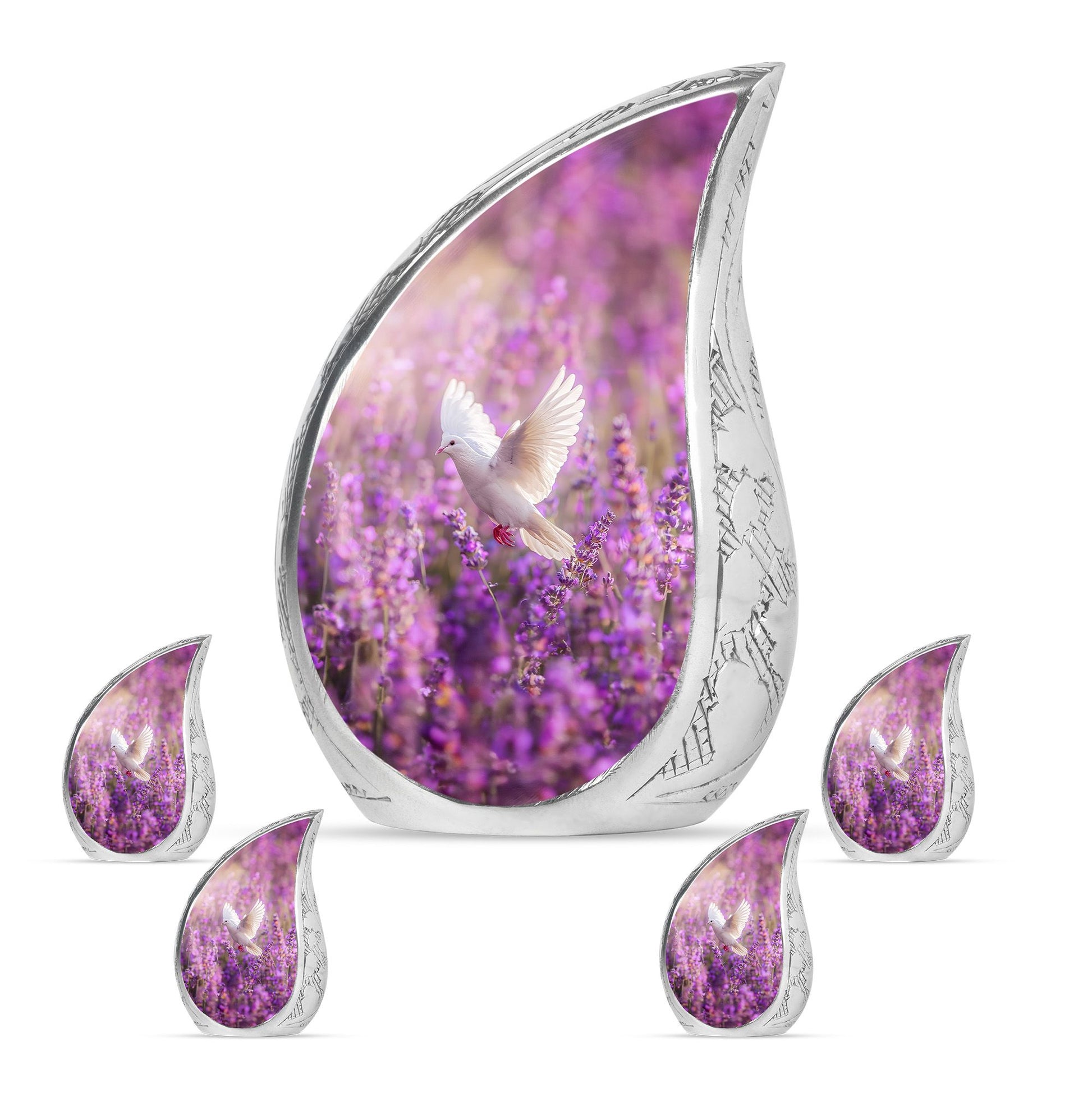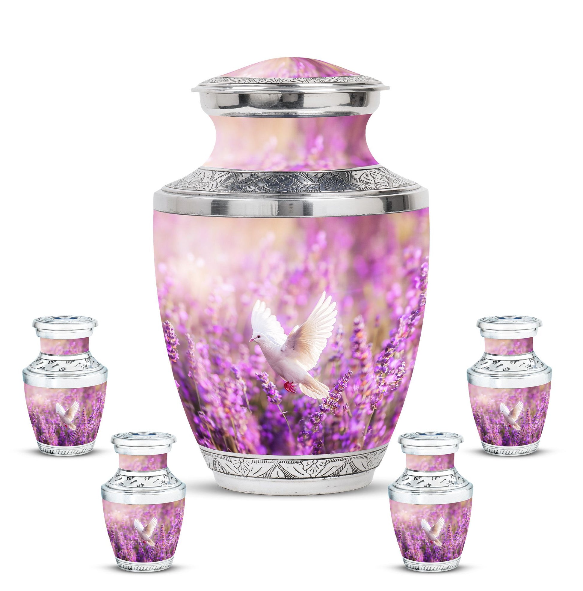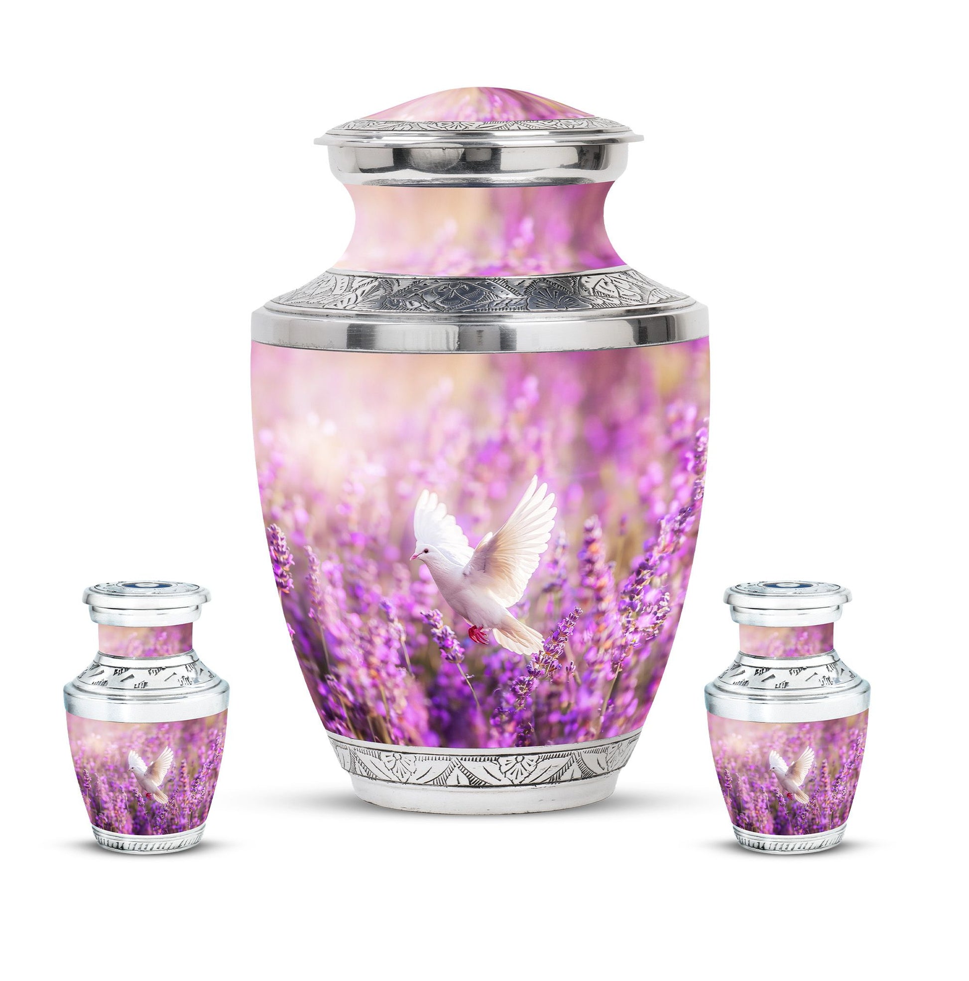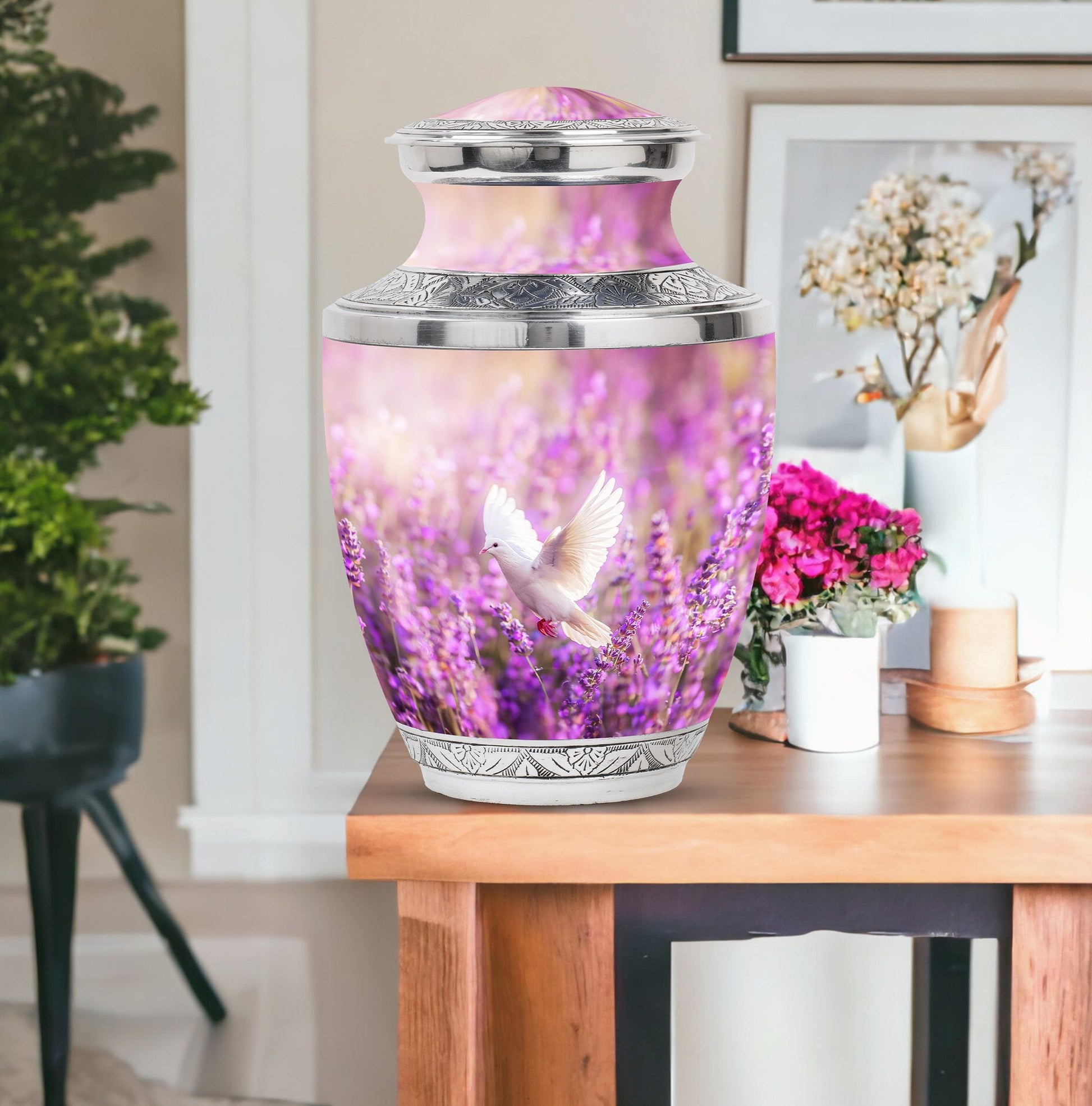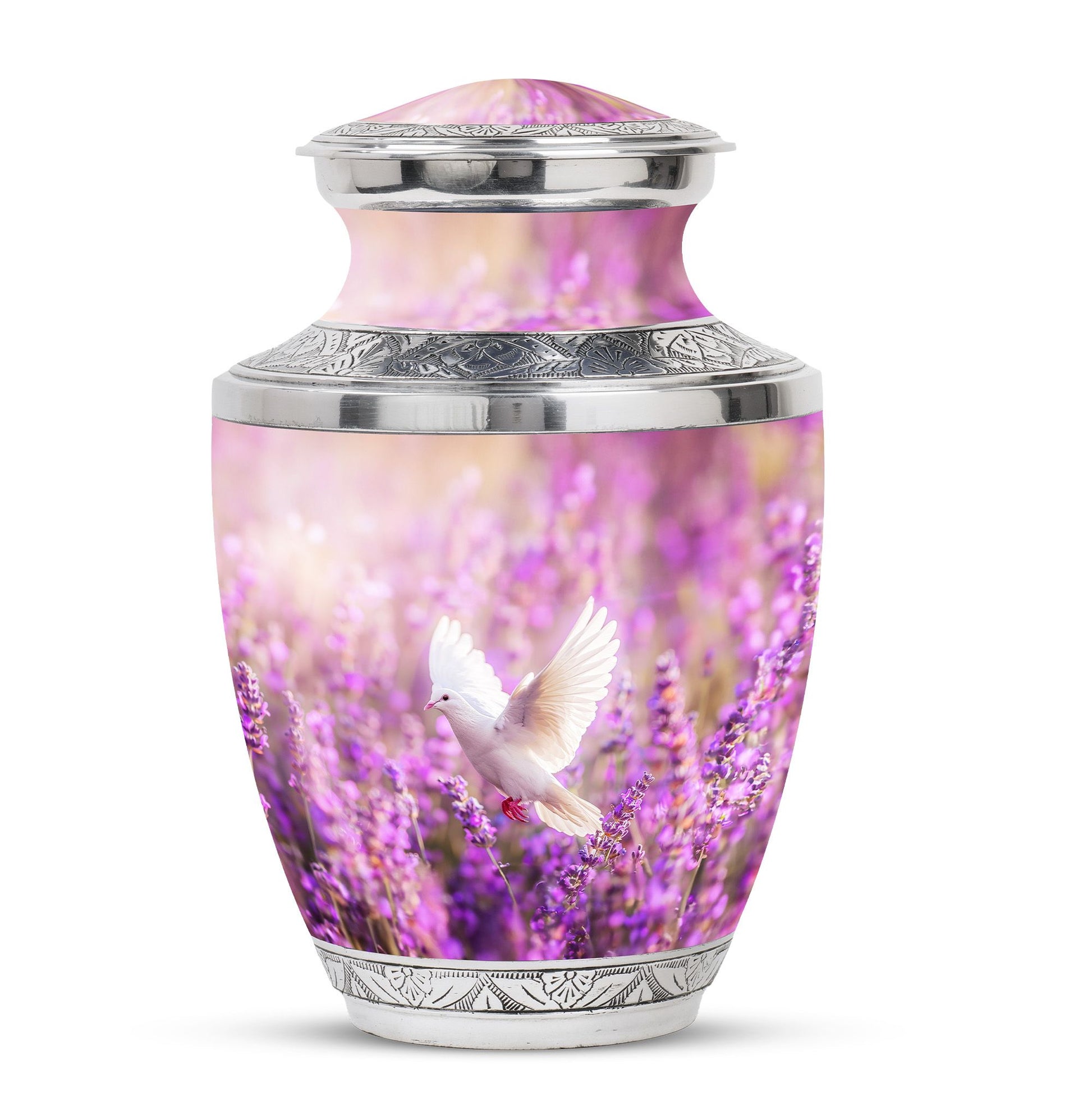 Made from durable aluminium, this urn is designed with exquisite craftsmanship and detailed artistry. It is both functional and elegant, suitable as large urns for human ashes adult female, urns for ashes adult male large, or large cremation urns. Its pristine white finish with a graceful dove design offers timeless beauty, allowing it to serve as both a dignified resting place and a decorative memorial piece.