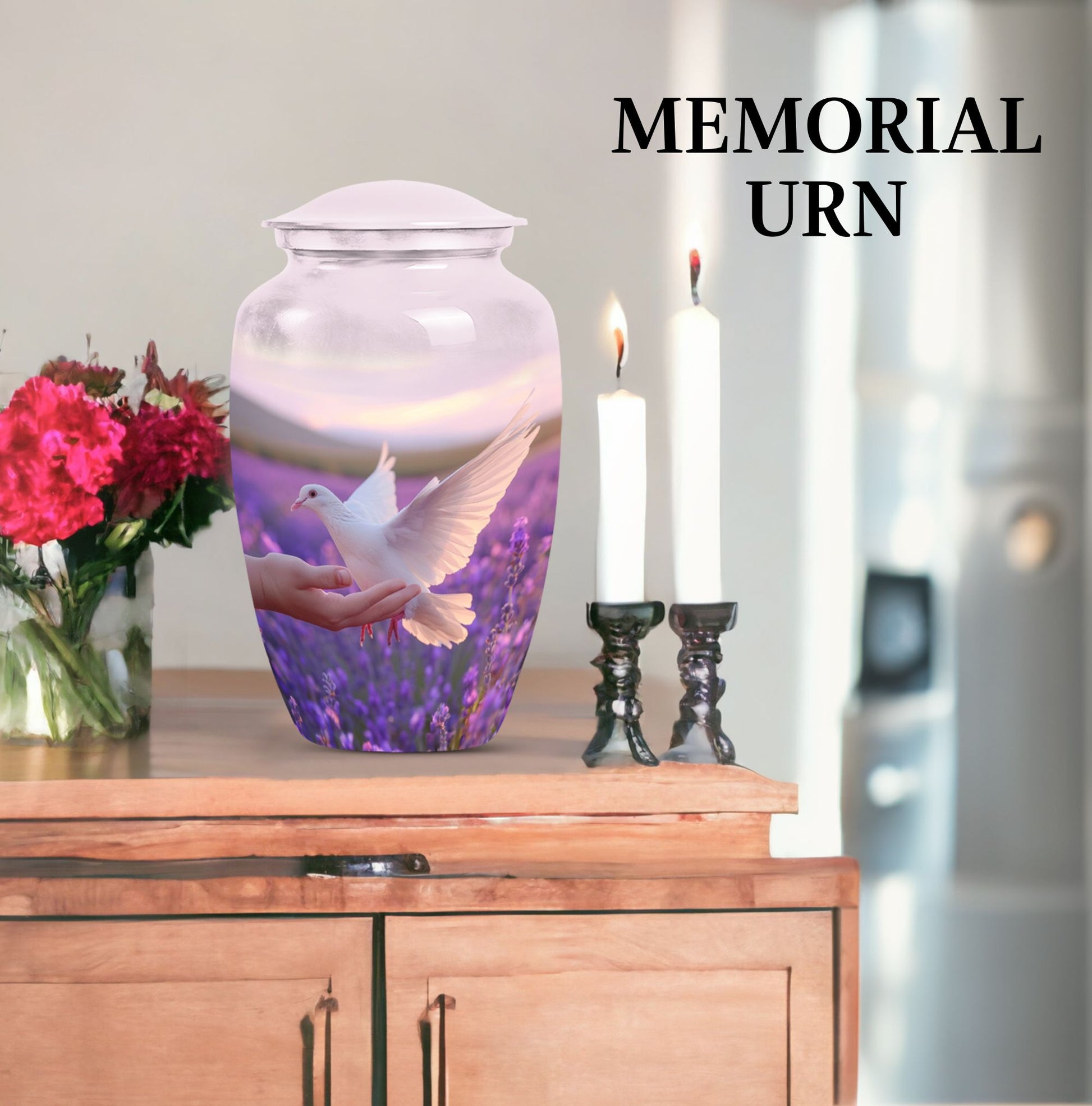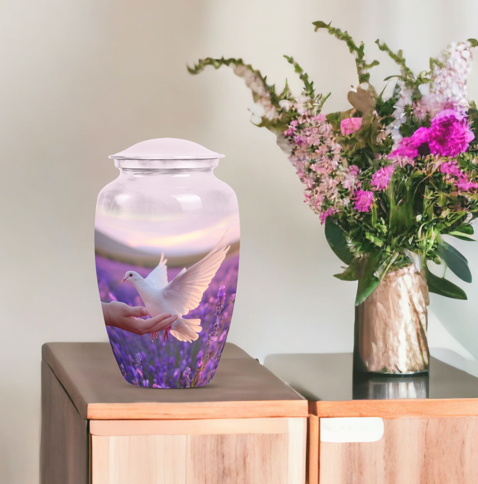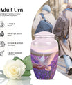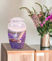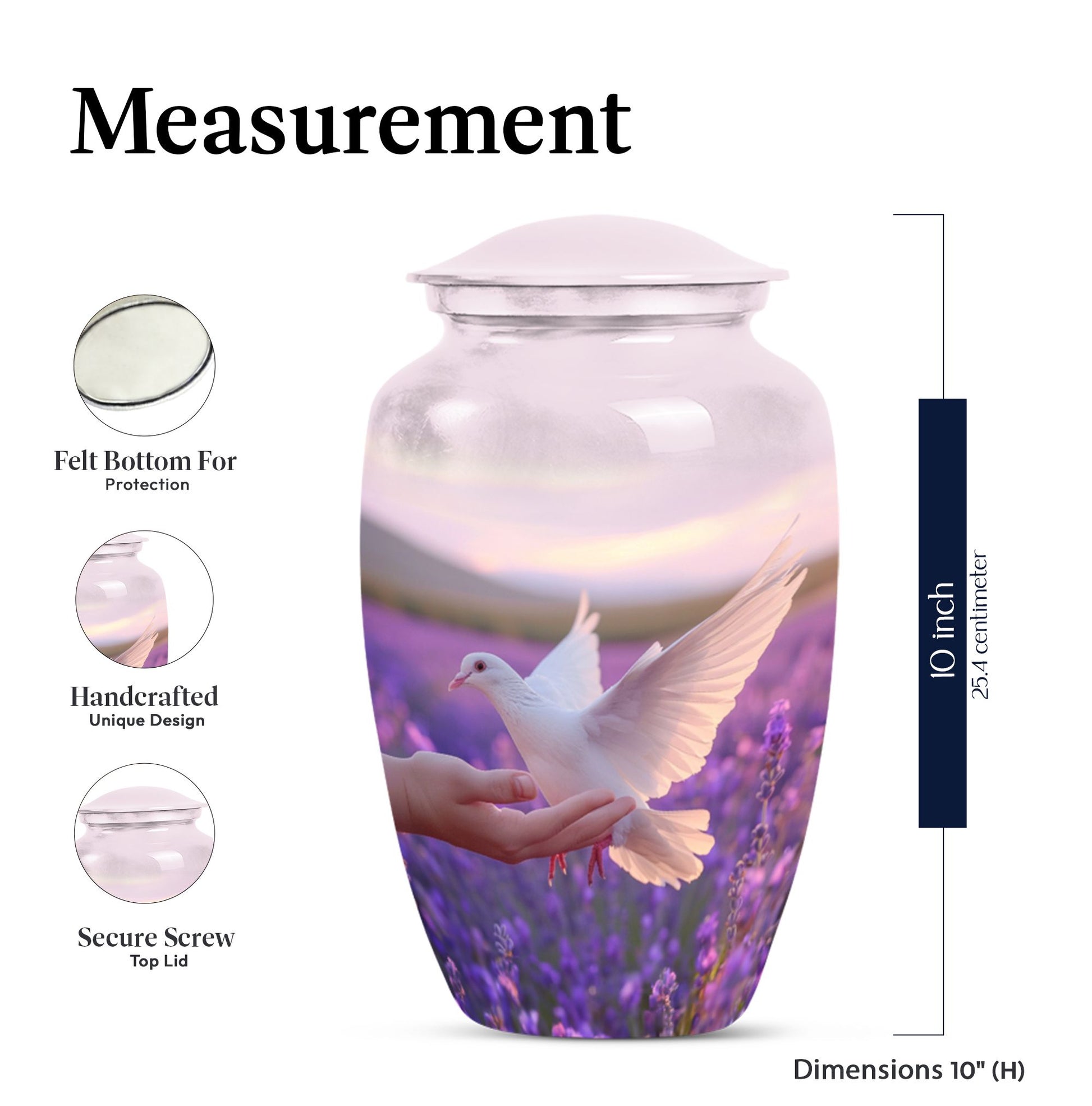 Embrace a cherished, timeless tribute to your loved ones with this elegantly designed, white dove on purple classic urn. This large 10-inch aluminium urn is robust with a comforting weight of 3.3 pounds, ensuring reliability and longevity – a truly symbolic home for your beloved ones. Its capacity of 200 cubic inches is ample to hold the ashes, with an added velvet pouch assuring respectful containment. What makes this urn special is that it's also customizable; engraving the names adds an intimate touch making it unique and personal. The soulful butterfly theme further adds to its beauty and serenity. This urn isn't just an item but a vessel of endearing memories and lasting respect. This cremation urn is a compassionate gift idea for adults and seniors. Resonating with phrases like 'memorial urns', 'burial large urn for women ashes', 'funeral urns ashes' and 'metal urns for human ashes adult female', it aids in finding comfort and expressing love even in times of grief.