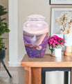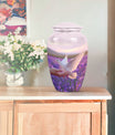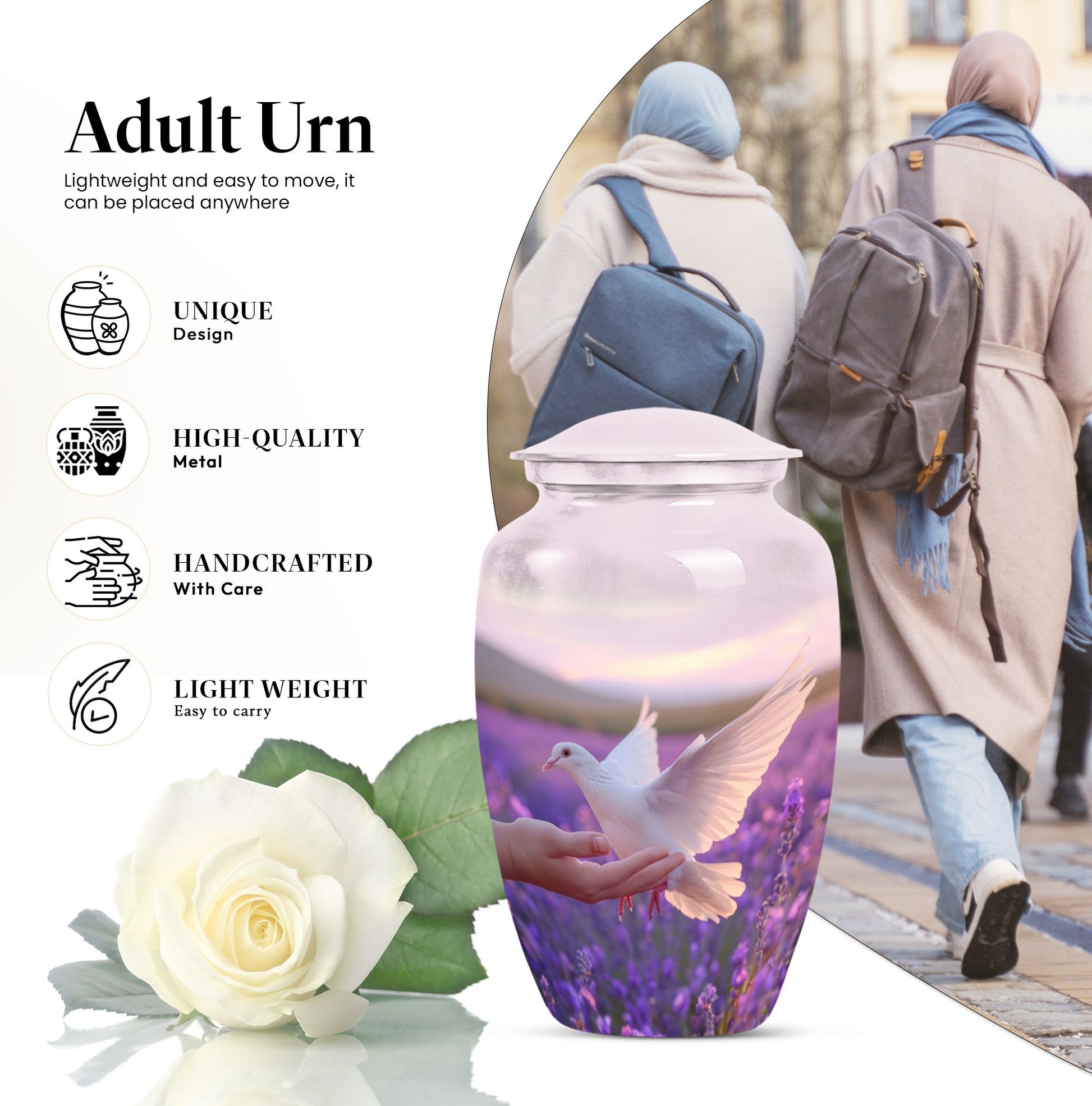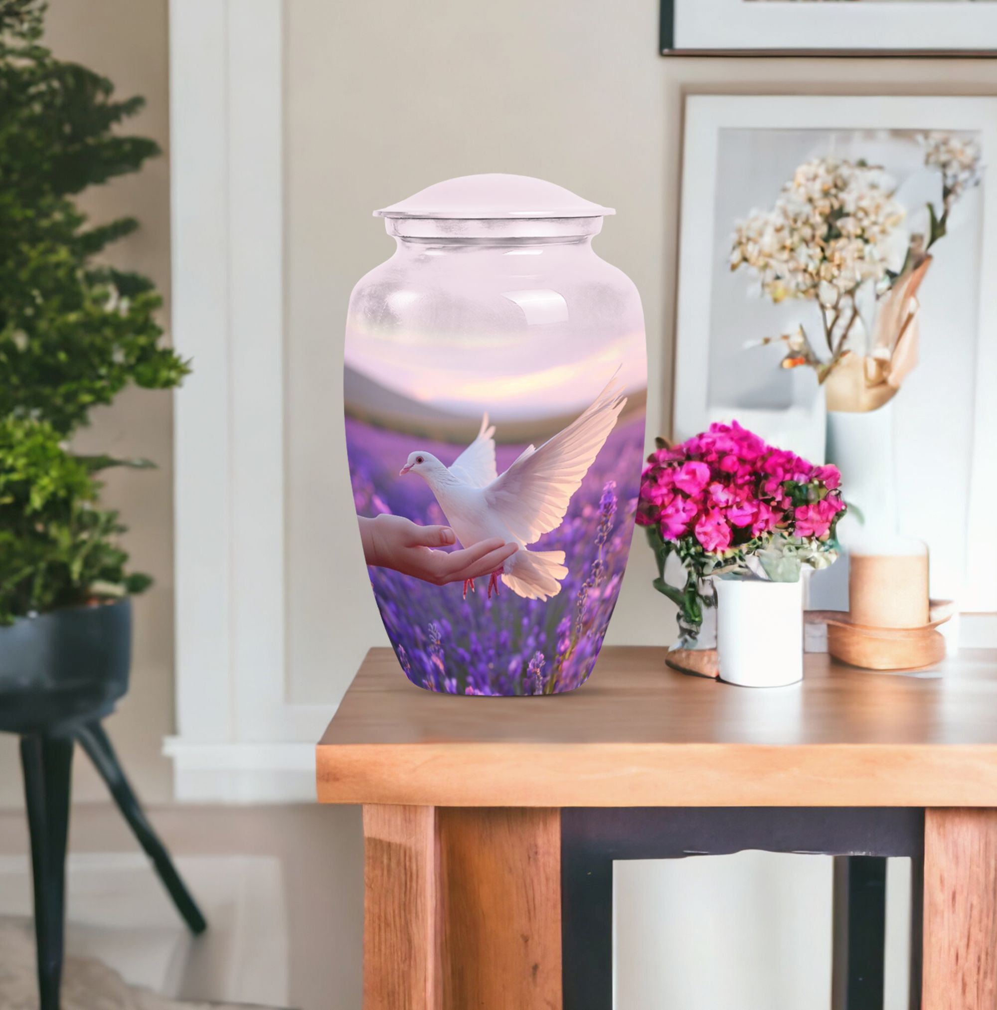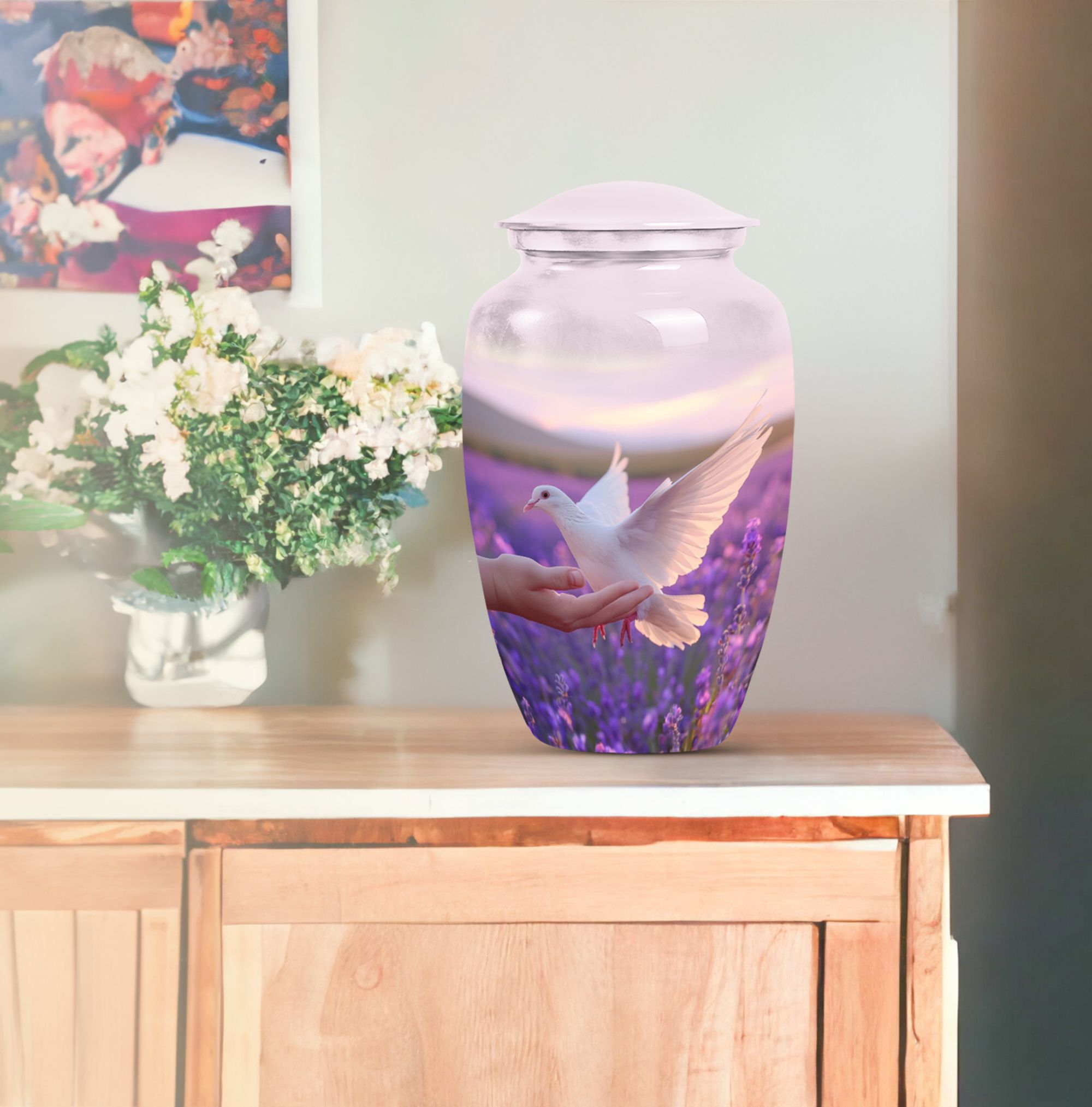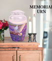Embrace a cherished, timeless tribute to your loved ones with this elegantly designed, white dove on purple classic urn. This large 10-inch aluminium urn is robust with a comforting weight of 3.3 pounds, ensuring reliability and longevity – a truly symbolic home for your beloved ones. Its capacity of 200 cubic inches is ample to hold the ashes, with an added velvet pouch assuring respectful containment. What makes this urn special is that it's also customizable; engraving the names adds an intimate touch making it unique and personal. The soulful butterfly theme further adds to its beauty and serenity. This urn isn't just an item but a vessel of endearing memories and lasting respect. This cremation urn is a compassionate gift idea for adults and seniors. Resonating with phrases like 'memorial urns', 'burial large urn for women ashes', 'funeral urns ashes' and 'metal urns for human ashes adult female', it aids in finding comfort and expressing love even in times of grief.