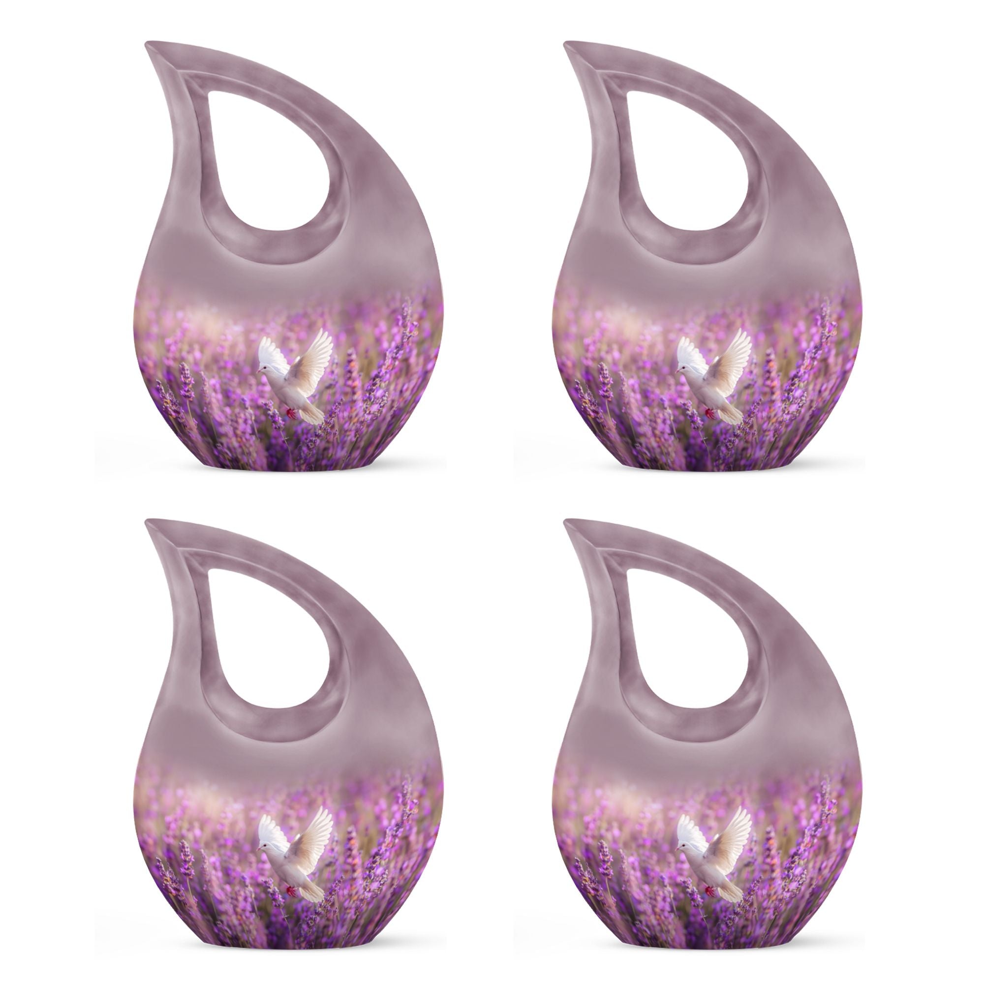 Cherish the memory of your loved ones with our 'White Dove On Purple Urn', a modern and unique addition to memorial urns. Dominating a size of 10 inches, this large urn is elegantly sculpted from durable aluminium and weighs a sturdy 3.3 pounds. Its standout ‘Cross Drop’ theme underscores the blissful ascension, apt for Elders appreciating symbolisms. The urn can hold up to 200 cubic inches of ashes safely enclosed within its dimensions. Moreover, this urn comes with a velvet pouch, ensuring the containment of ashes remains notable yet discreet. Personalize it with engraved names, adding a heartfelt touch to this tangible piece of memory. Ideal as burial urns for human ashes or as remembrance urns for ashes, it makes a fitting tribute for your angels. Consider it if you are looking for urns for mom, bringing together a thoughtful combination of purpose, design and sentiment. This White Dove on Purple Urn ensures a dignified remembrance resplendent in rich hues.