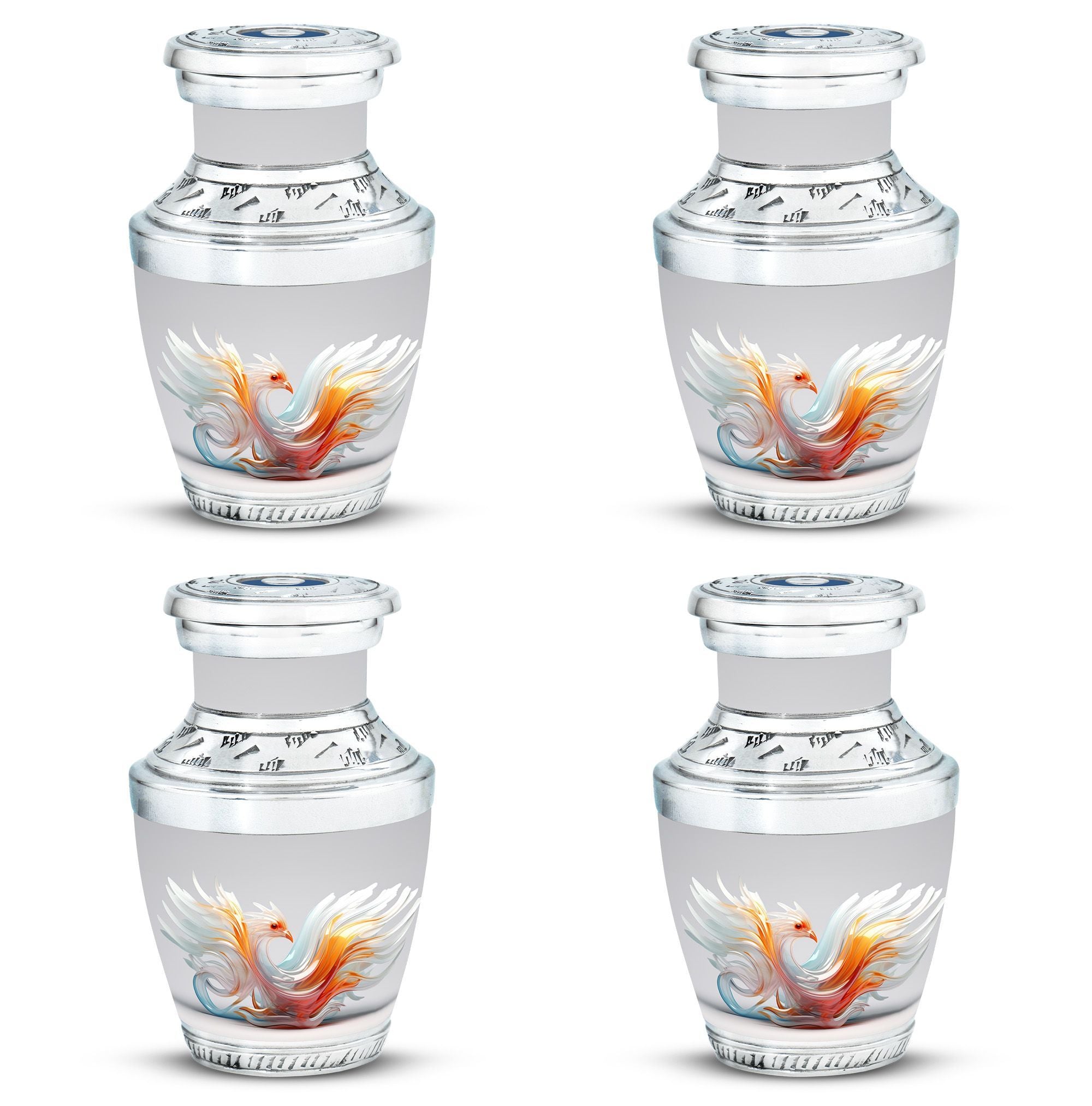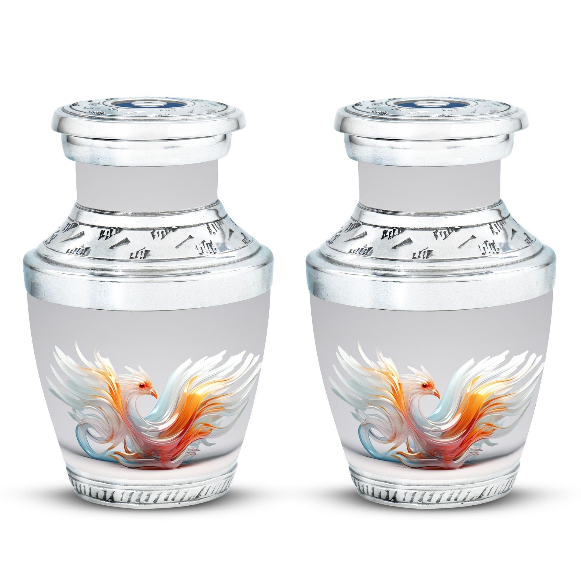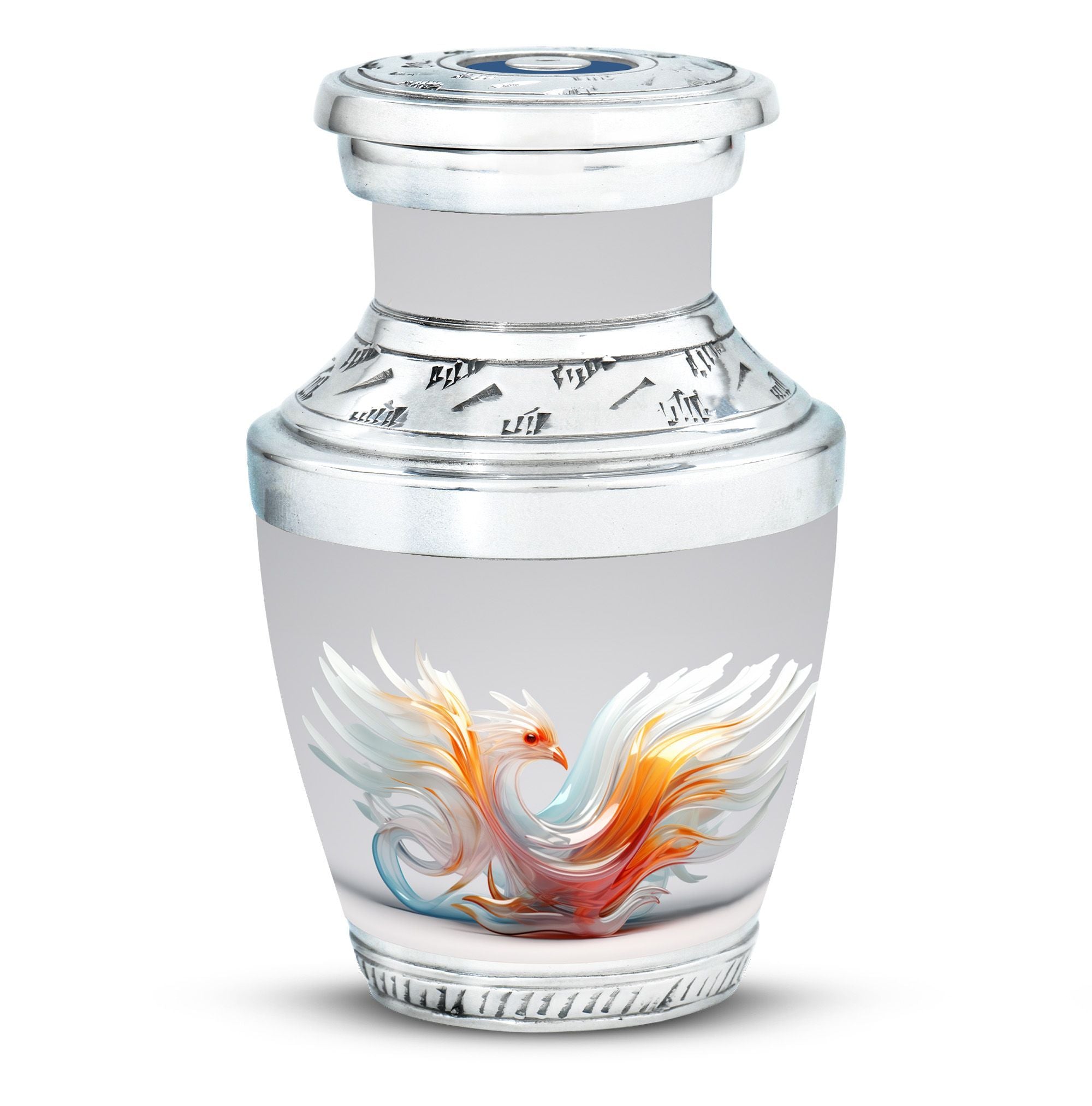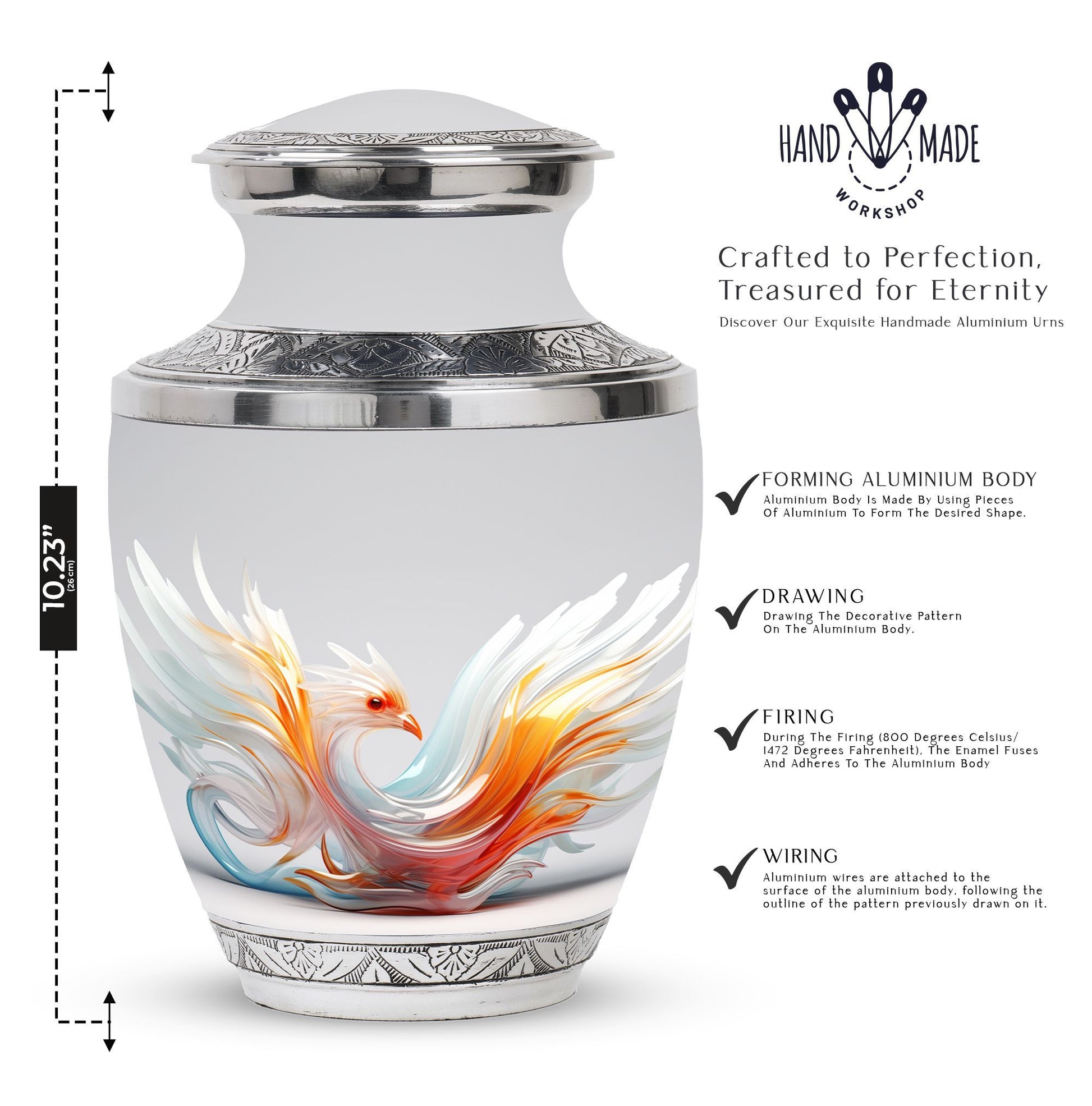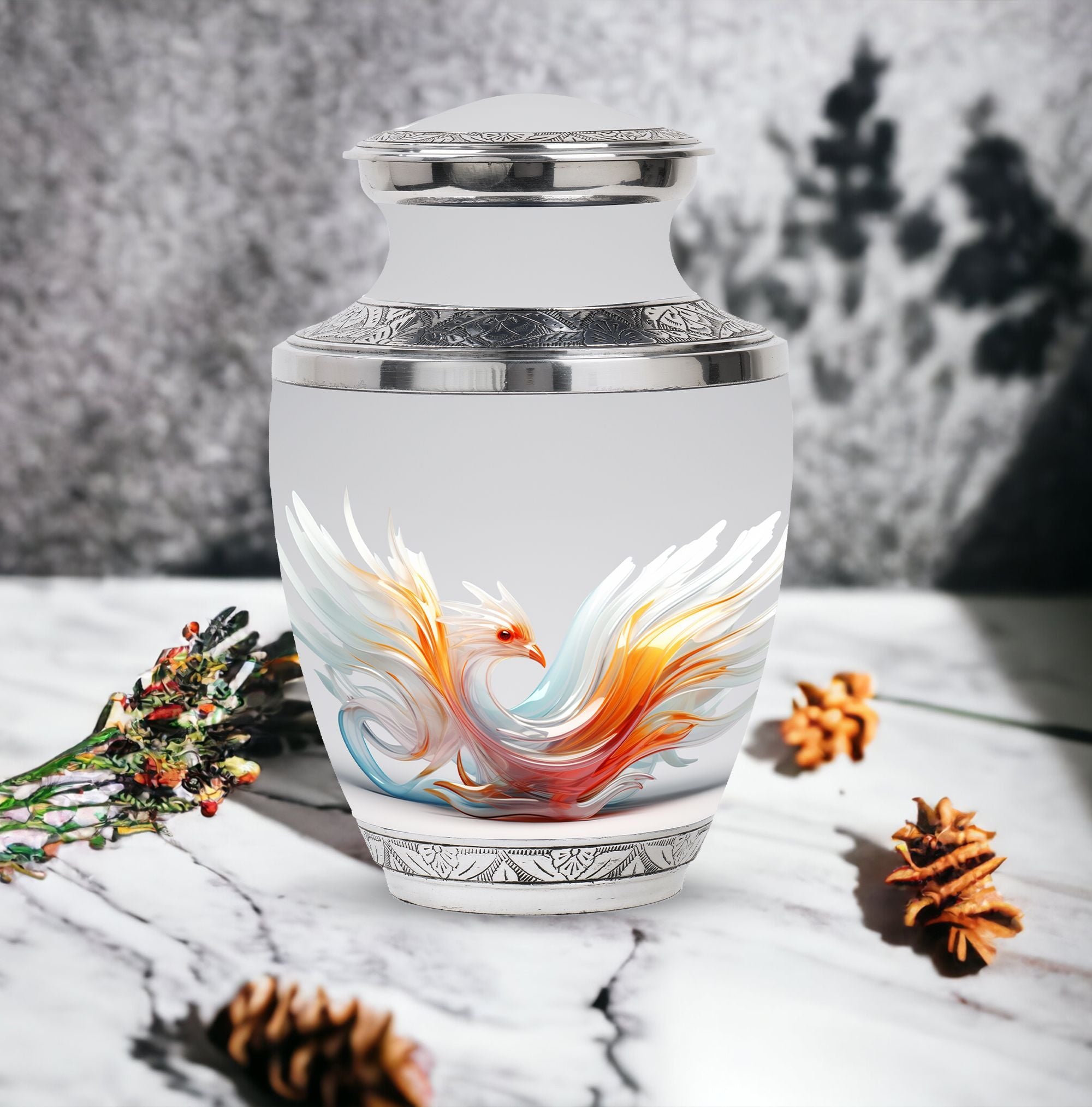 Provide a dignified final resting place for your loved one with our White Phoenix Urn. This large 3-inch metal cremation urn is meticulously crafted from premium aluminium and designed to last. With its ability to accommodate 200 cubic inches, it is perfectly suitable for adults and easily contains the cremation ashes of most individuals. Its weight is a solid 3.3 pounds, standing 10 inches in height which symbolizes strength and eternity, an appropriate homage to your loved one. You can get this urn customized by adding engraved names, allowing you to create a more personalized and heartfelt memorial. Furthermore, each urn comes with a velvet pouch in which to securely and respectfully keep the ashes. Forget the mundane, choose our memorial urns, a unique fusion of function, durability, and personal sentiment. Opt for urns for cremation and make the memorial ceremony genuinely special - a tribute to honor the lasting memory of a cherished life.