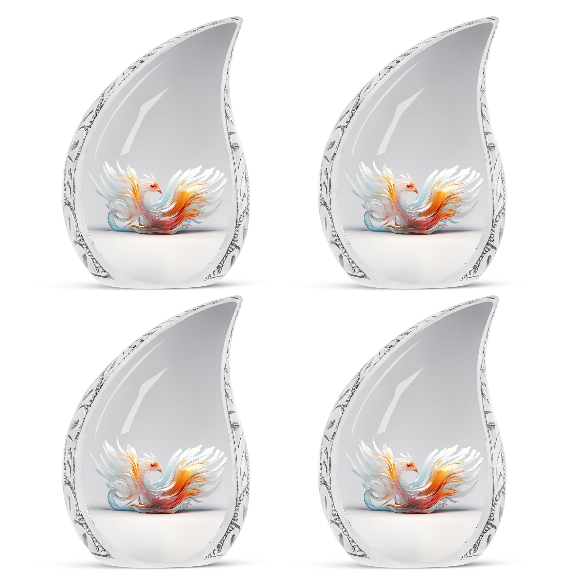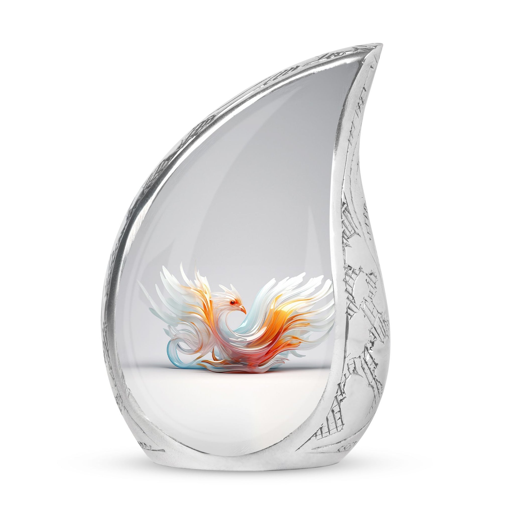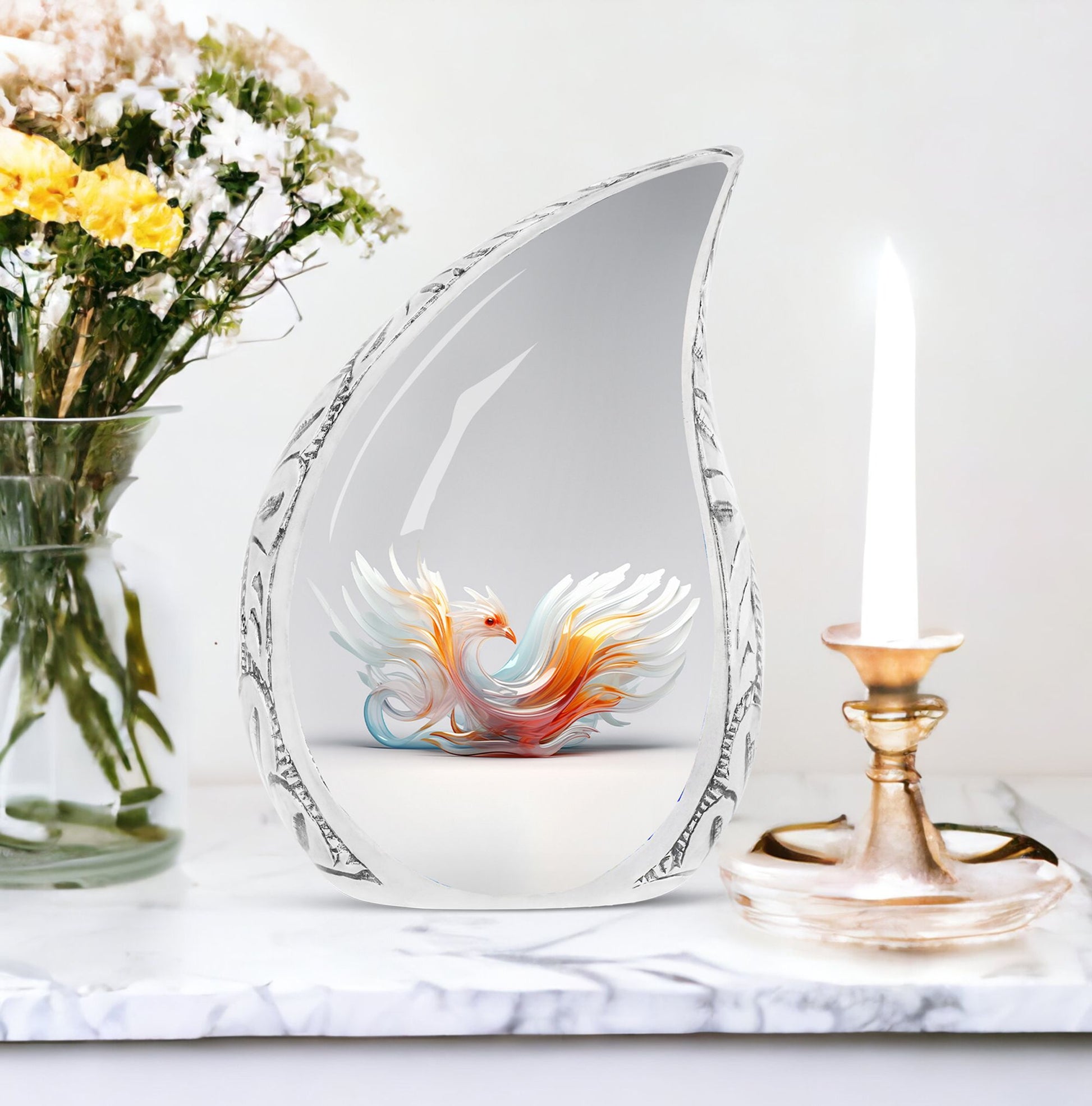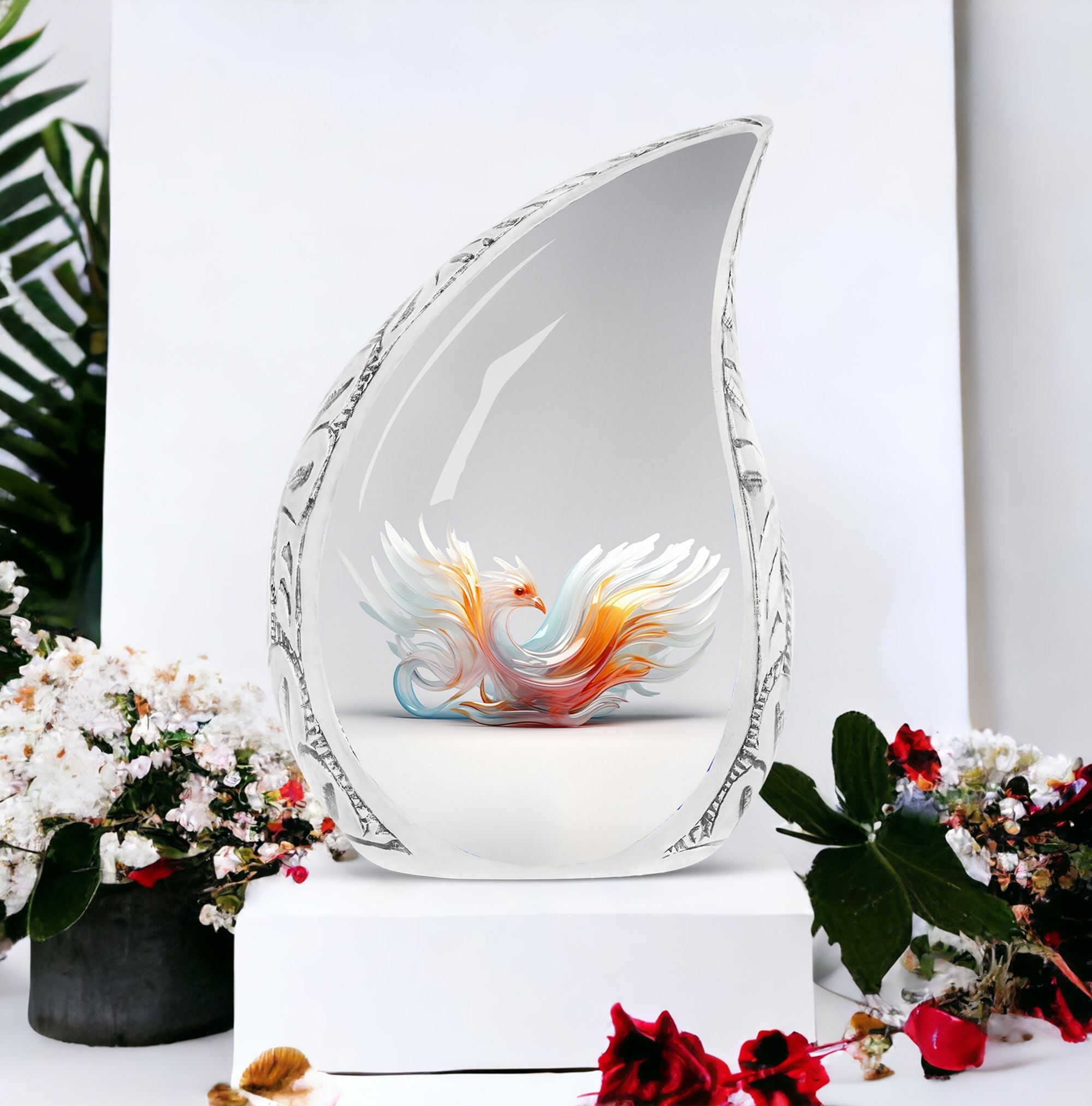 Unveiling the White Phoenix Urn, our majestic entrant into our collection of large memorial urns for honoring cherished loved ones. Noted for its substantial 200 cubic inches capacity, this urn is specifically crafted to securely hold the ashes of the departed adult. Painstakingly crafted from high-quality aluminium, it has the strength to withstand time, just like the respect and memories you hold for the deceased. It stands impressively tall at 10 inches and weighs in at a solid 3.3 pounds, ensuring its presence will not be missed at any memorial ceremony. This distinguished 3-inch urn comes with a soft velvet pouch designed for the respectful containment of ashes. Additionally, it offers an intimate customization feature allowing for the engraving of names, making it a truly unique and personalized remembrance for your loved one. The White Phoenix Urn, meticulously engineered for those who value the respectful storage of ashes and the dignified recall of departed souls.