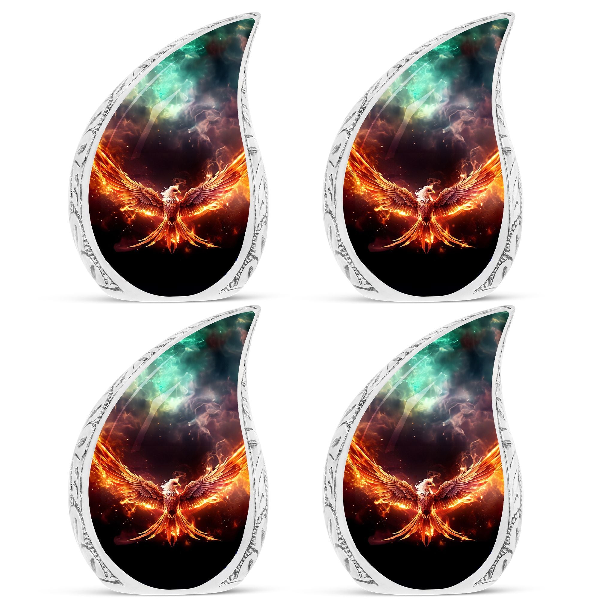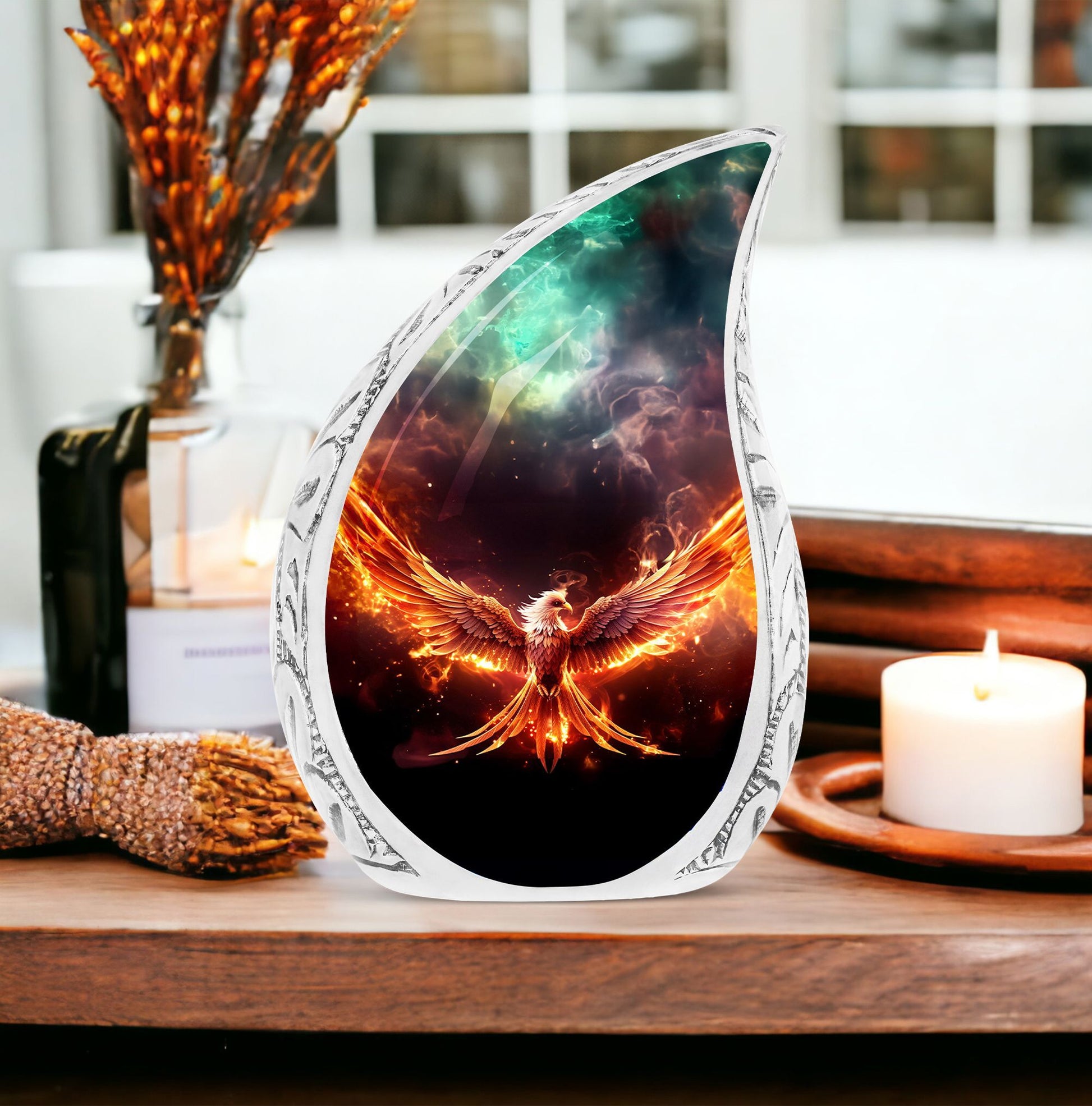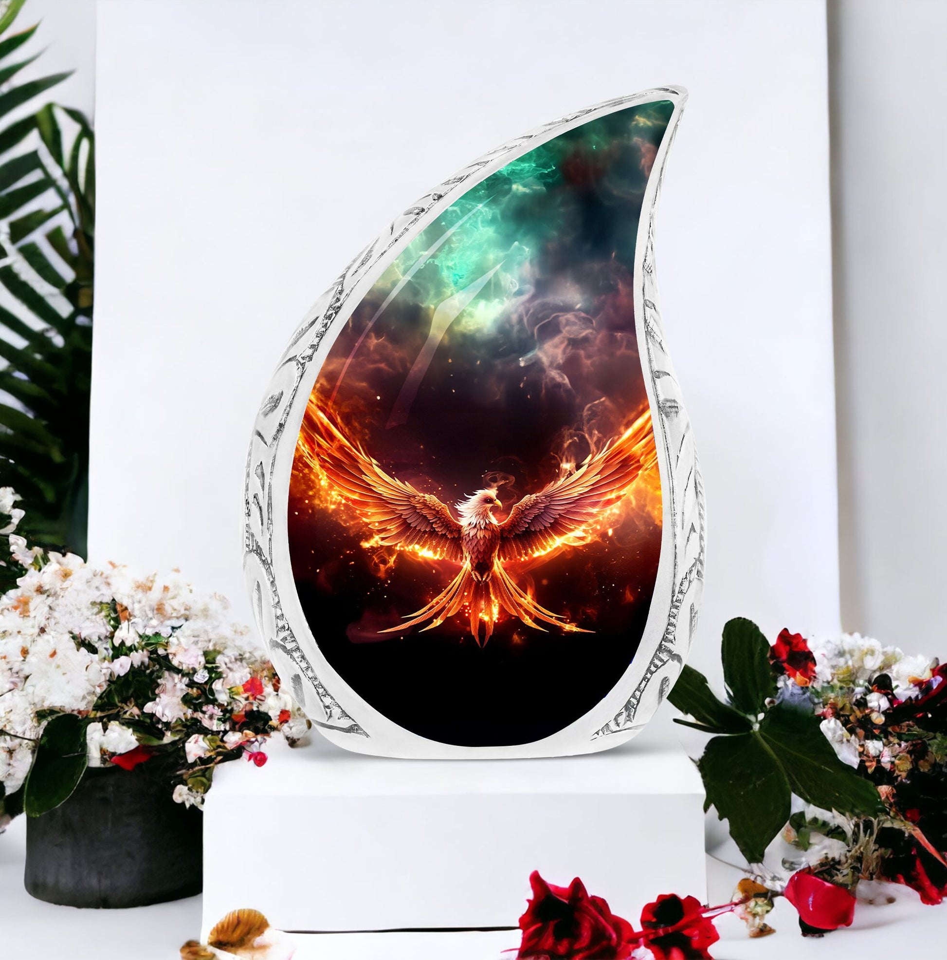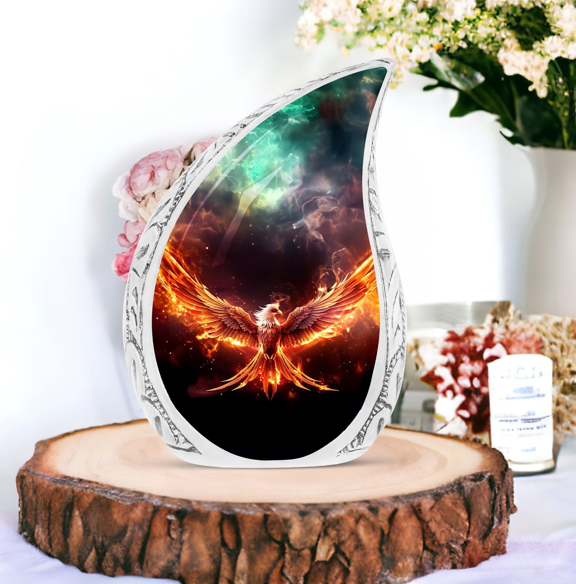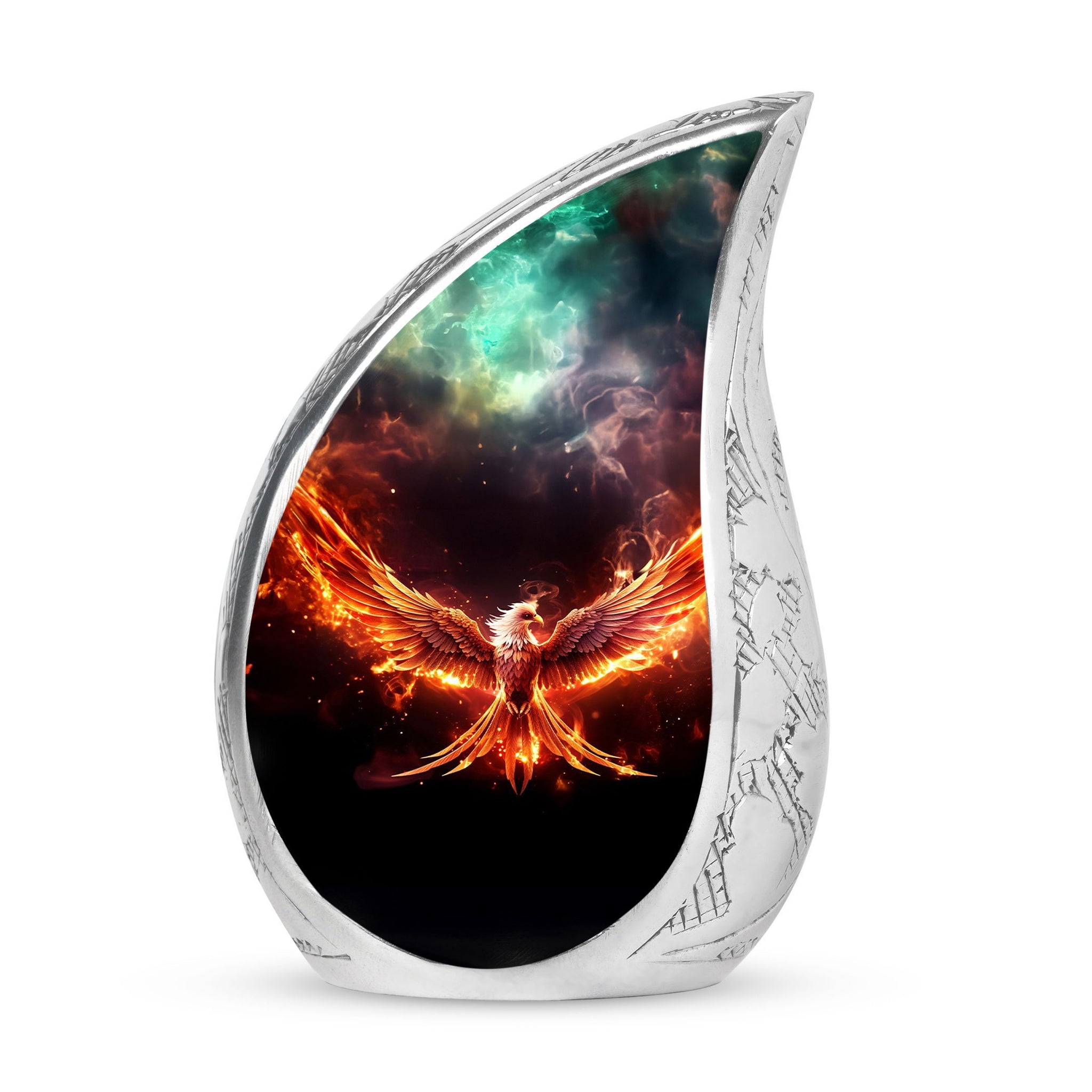 Honor a forever cherished memory with our White Phoenix Memorial Urn, an artistic blend of timeless elegance and modern sophistication. At a sizeable 3 inches and 10 inches in height, this large urn has the substantial capacity of 200 cubic inches, an ample space to house the ashes of your beloved mum. Weighing only 3.3 pounds, our Aluminium-made urn is designed to last and endure, just like the memories of your lost loved ones should. What sets our urn apart is its personalization feature -- you can engrave names to add that personal touch to this respectful homage piece. Your order is also inclusive of a velvet pouch, offering a tasteful containment solution for the ashes. With the selection of our White Phoenix Urn, you're not just paying tribute; you’re redefining what modern, personalized memorial urns look like.