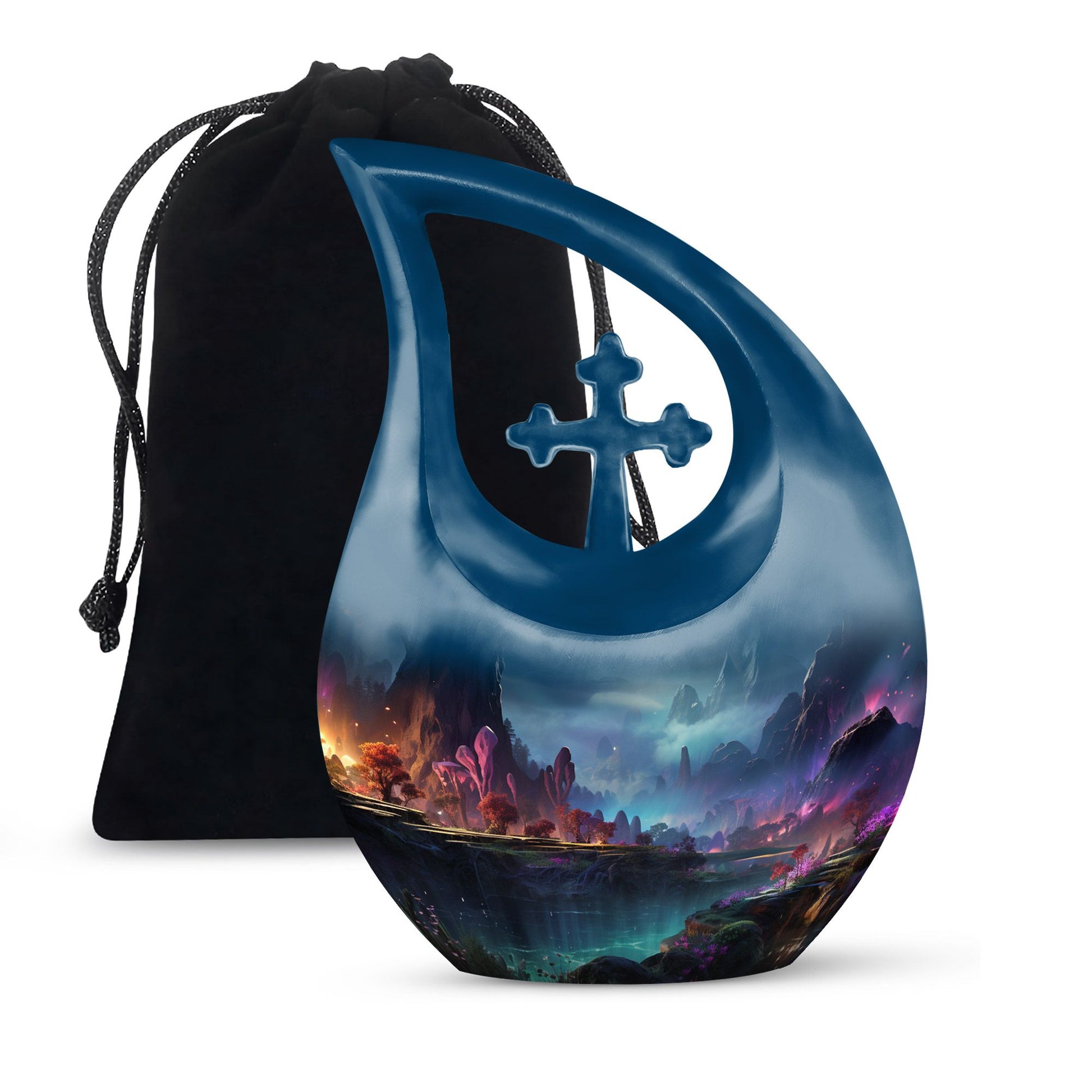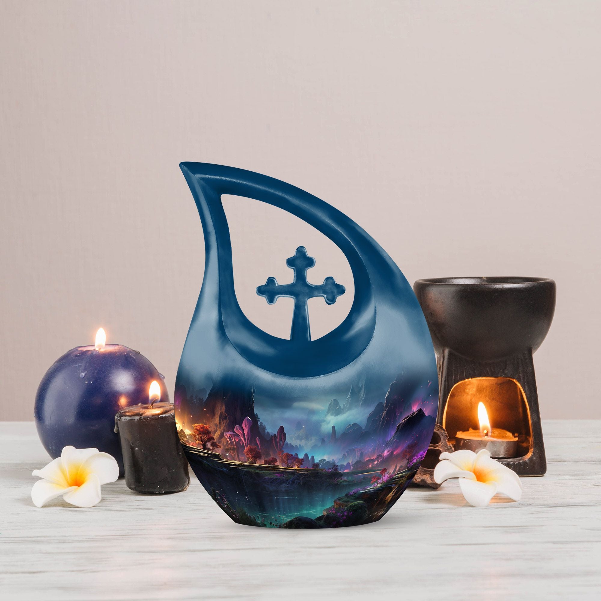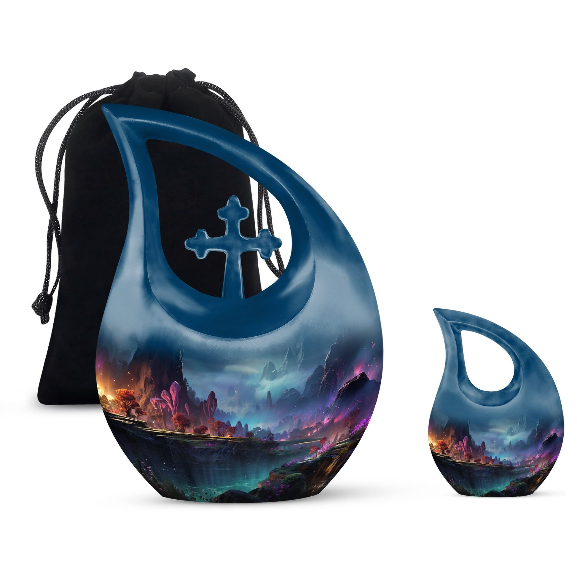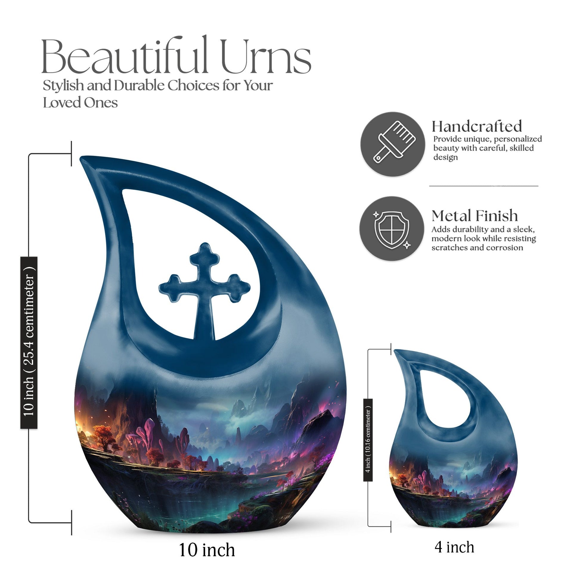 Unveiling a striking example of artful profundity, rendered in a 'Wilderness' theme with our large 'Cross Drop' urn. This 10-inch memorial urn, also known as Wilderness Urn, strikes a cordial balance between refinement and conveying the profound meaning of remembrance. Made with high-quality aluminium, it weighs a substantial 3.3 pounds and has a holding capacity of 200 cubic inches, making it aptly suited for adults. Personalize it to add that unique touch, with engraved names of your loved ones. Along with the urn, a velvet pouch is provided to hold the ashes securely. This cremation box aptly encapsulates the essence of exhaustive journeys and captures the spirit of Wilderness, making it an excellent choice amongst cremation boxes for adults or urns for women's ashes. Whether you are searching for a fitting tribute to a loved one or a cherished keepsake, this urn will serve you well by encapsulating cherished memories and the spirit of your loved one.