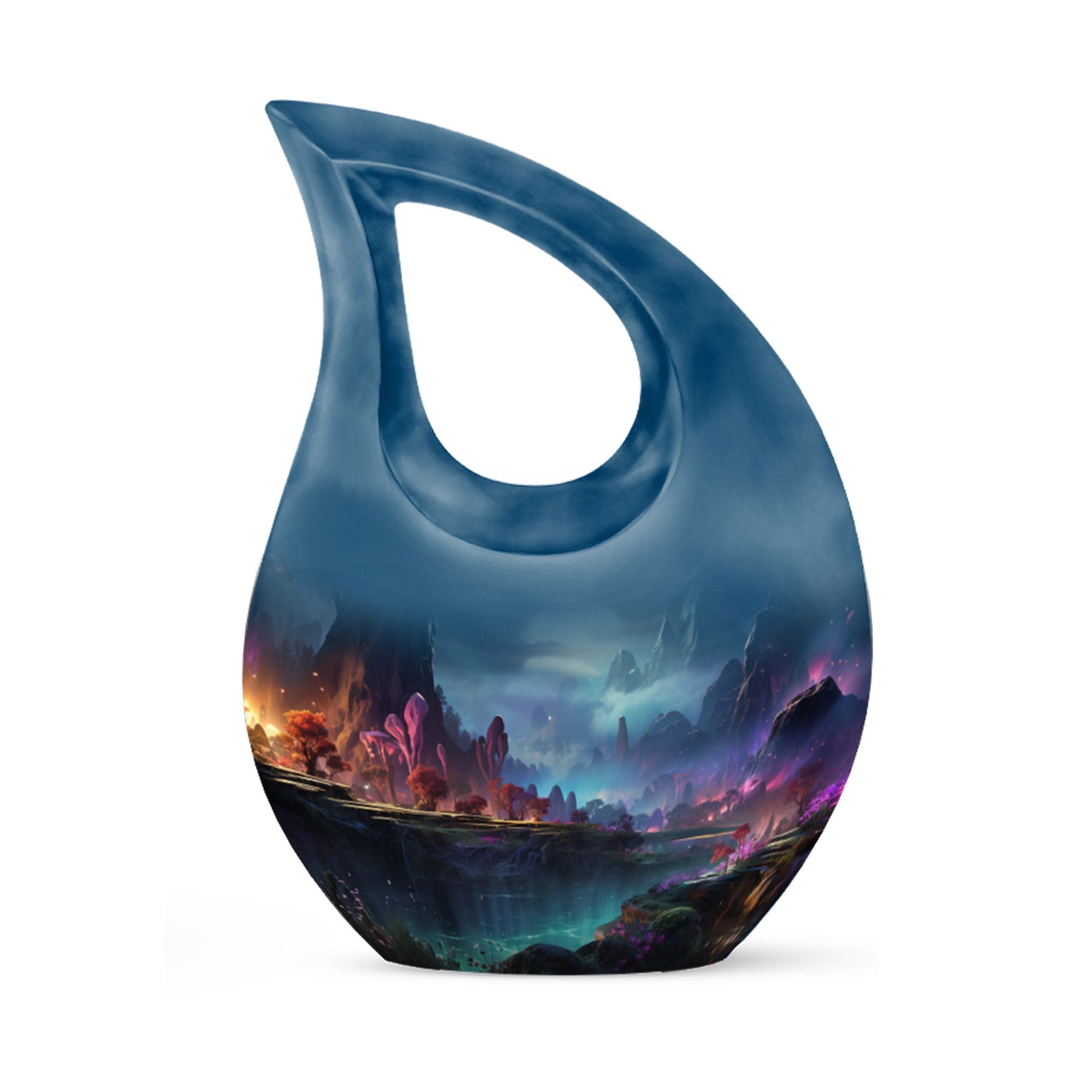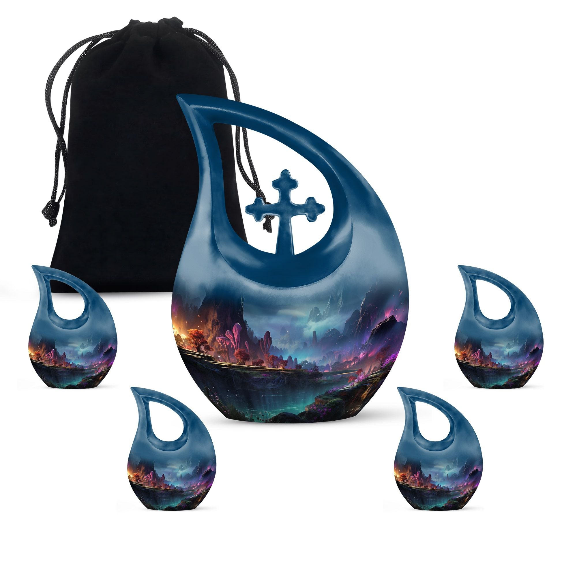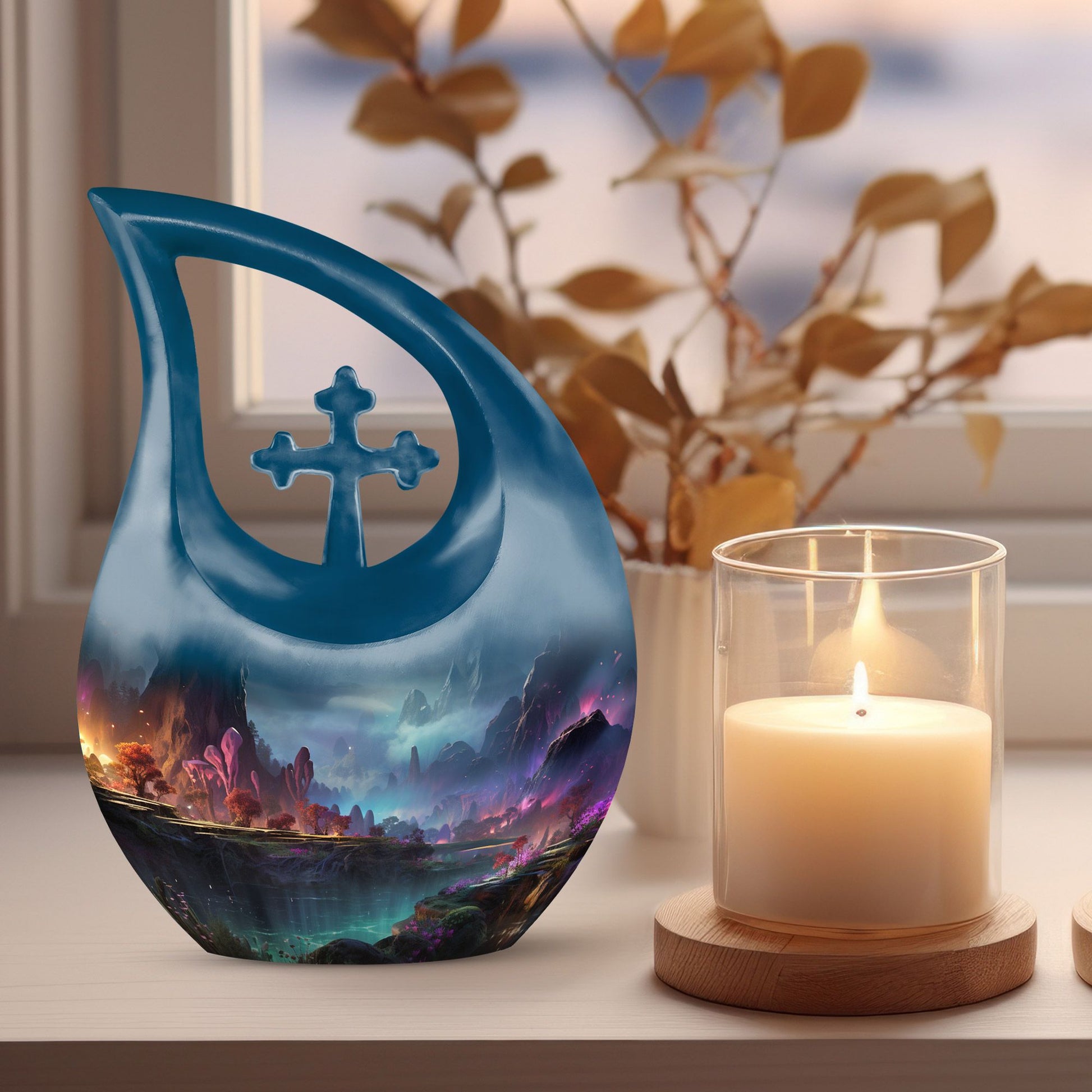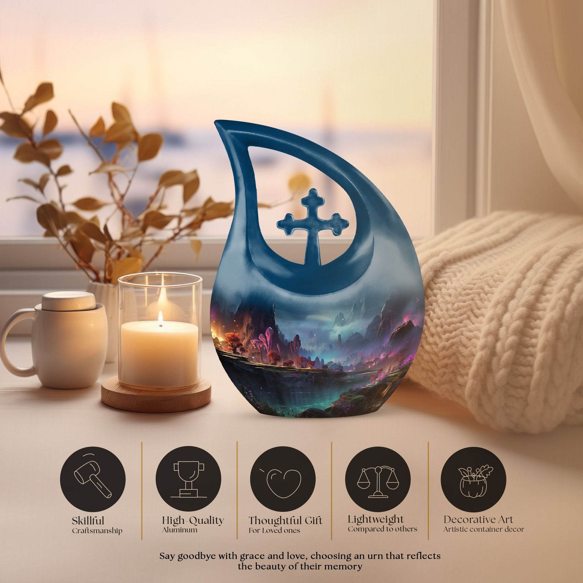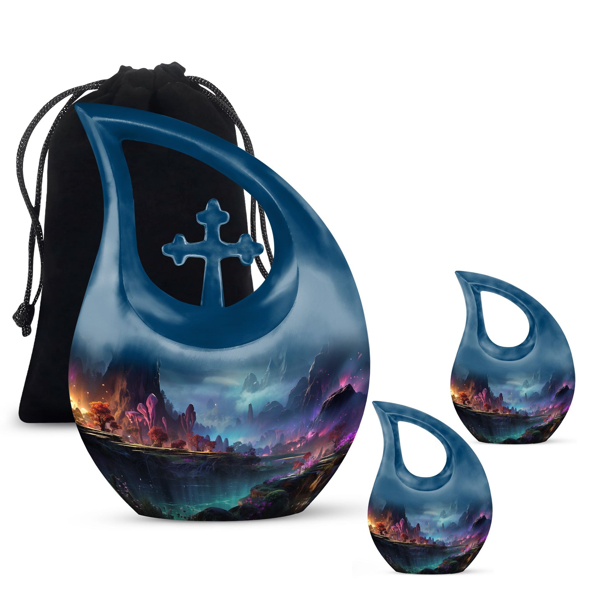 Unveiling a striking example of artful profundity, rendered in a 'Wilderness' theme with our large 'Cross Drop' urn. This 10-inch memorial urn, also known as Wilderness Urn, strikes a cordial balance between refinement and conveying the profound meaning of remembrance. Made with high-quality aluminium, it weighs a substantial 3.3 pounds and has a holding capacity of 200 cubic inches, making it aptly suited for adults. Personalize it to add that unique touch, with engraved names of your loved ones. Along with the urn, a velvet pouch is provided to hold the ashes securely. This cremation box aptly encapsulates the essence of exhaustive journeys and captures the spirit of Wilderness, making it an excellent choice amongst cremation boxes for adults or urns for women's ashes. Whether you are searching for a fitting tribute to a loved one or a cherished keepsake, this urn will serve you well by encapsulating cherished memories and the spirit of your loved one.