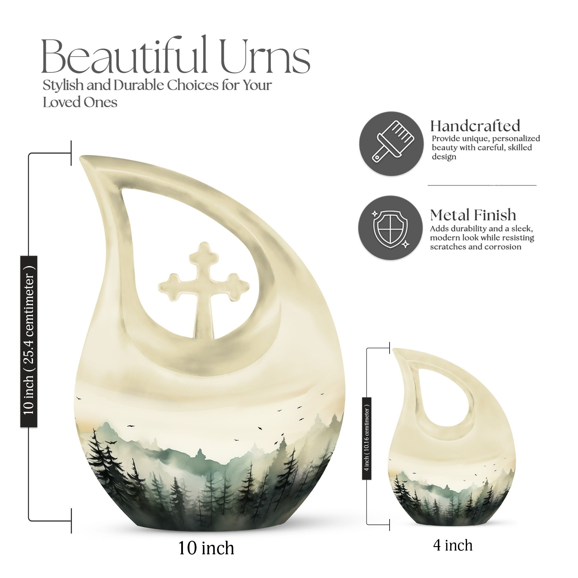 Features:• Material: Aluminium• Dimensions: Height 10 inches• Capacity: 200 cubic inches• Lid: Secure screw-top lid• Design: Forest landscape–themed memorial artwork• Use: Adult Male/Female Cremation