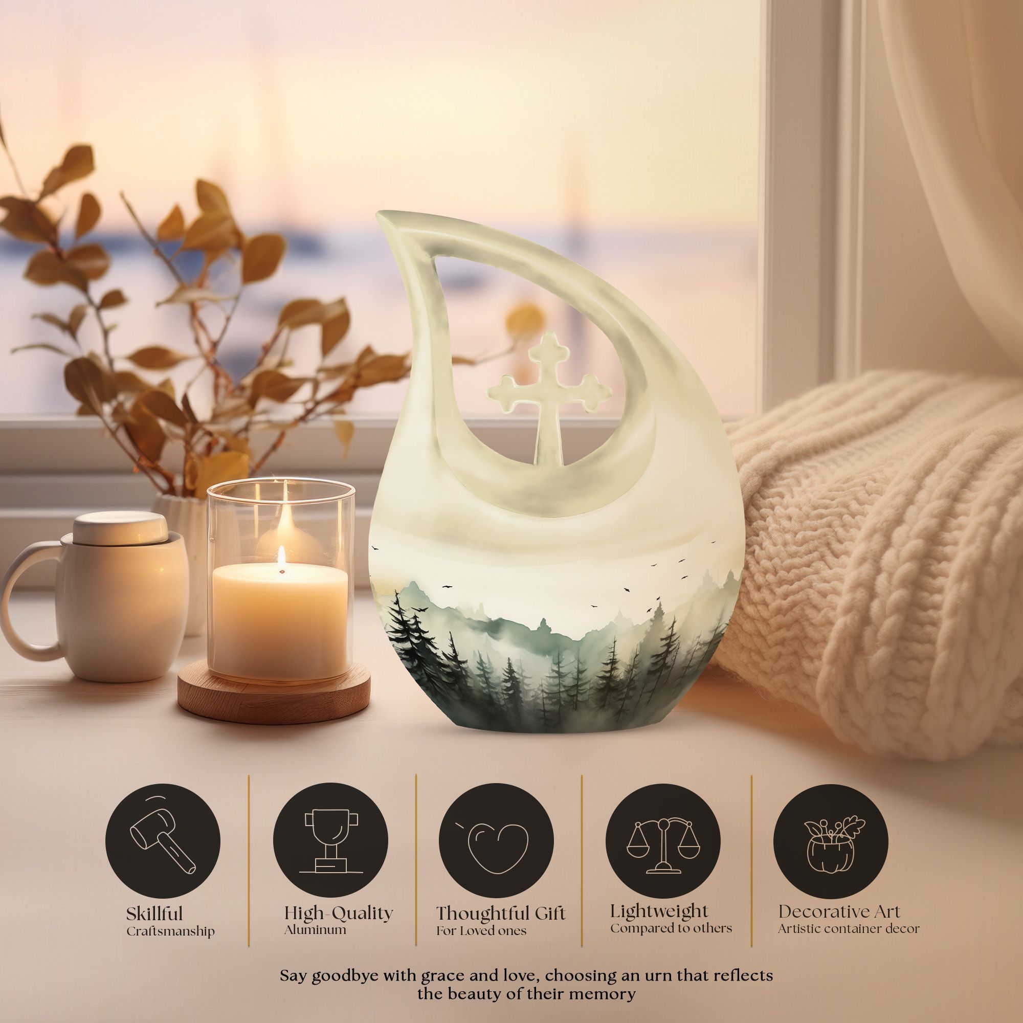 Made from durable aluminum, this landscape memorial urn features a detailed forest-inspired design symbolizing tranquility, renewal, and eternal connection. The secure screw-top lid ensures lasting protection, while its full adult capacity makes it suitable for funeral urns for adult ashes men, adult urns for human ashes men, or adult urns for human ashes women. Families who prefer to share ashes can pair it with a small urn for ashes for women, keepsake urns for women, mini small urns for men, or a mini urn for ashes for women. It also complements ashes keepsake for men or cremation keepsakes for men beautifully when creating a coordinated memorial set.