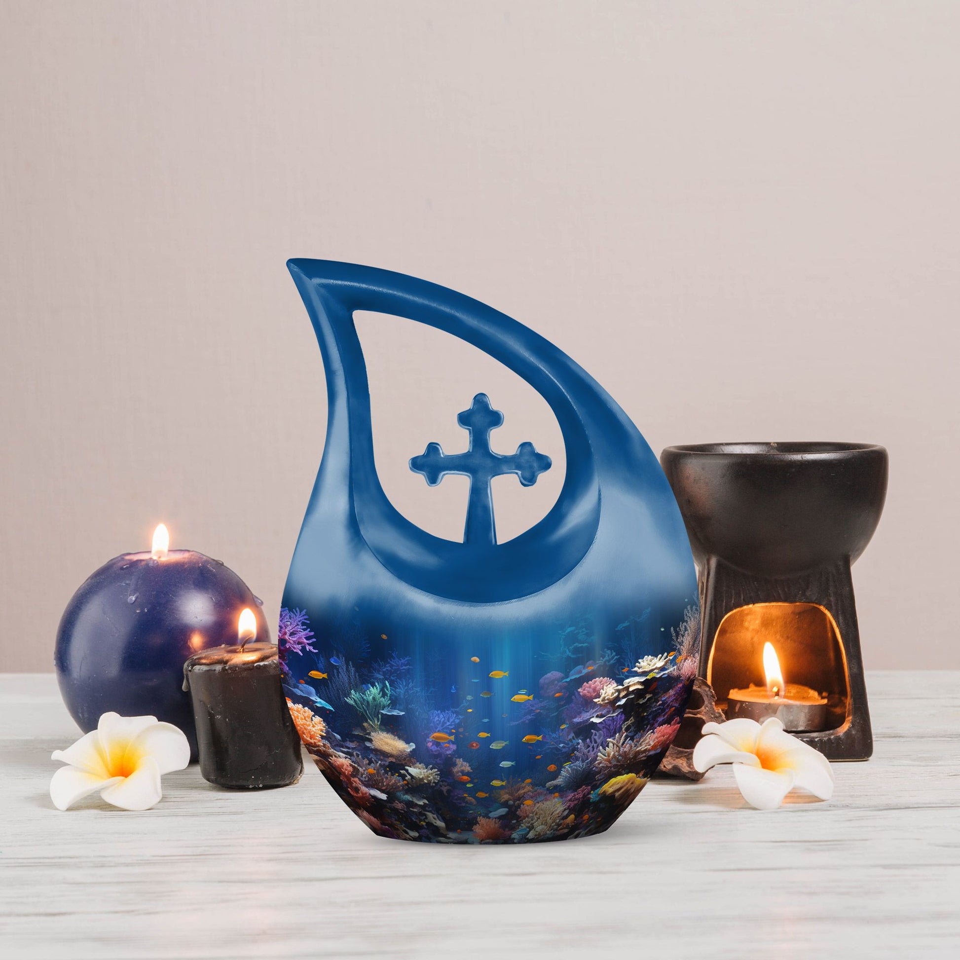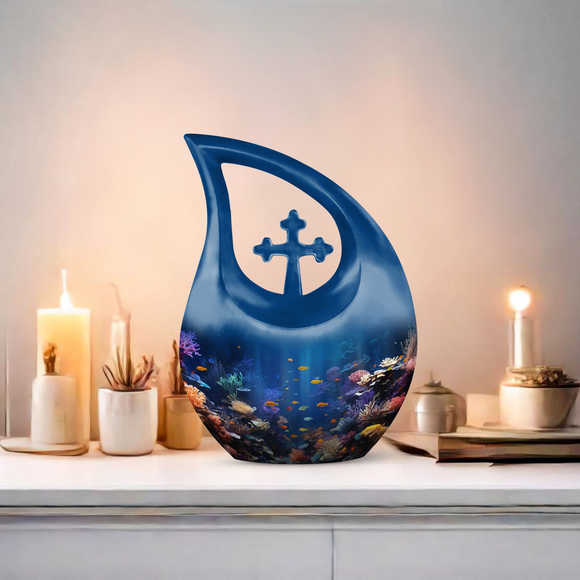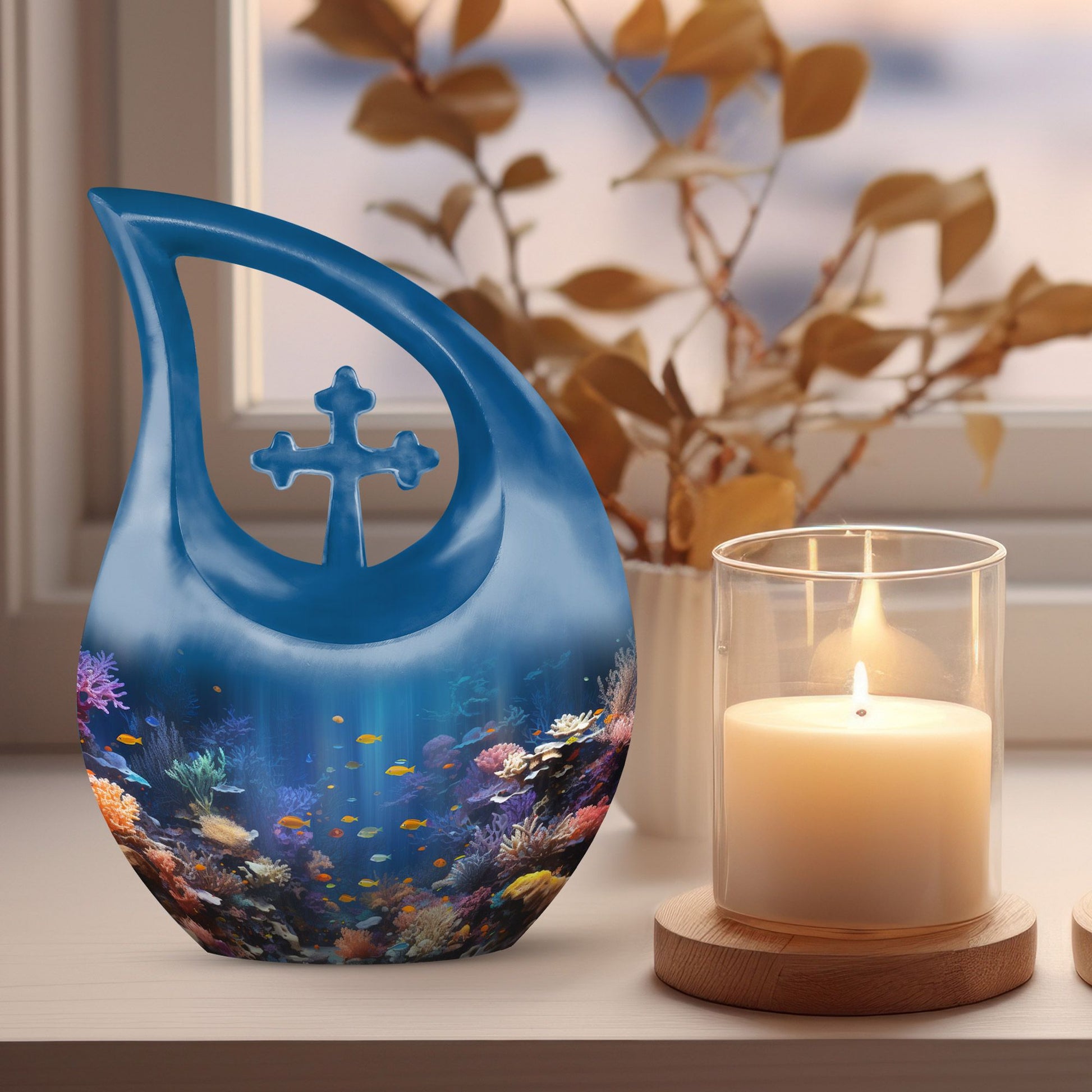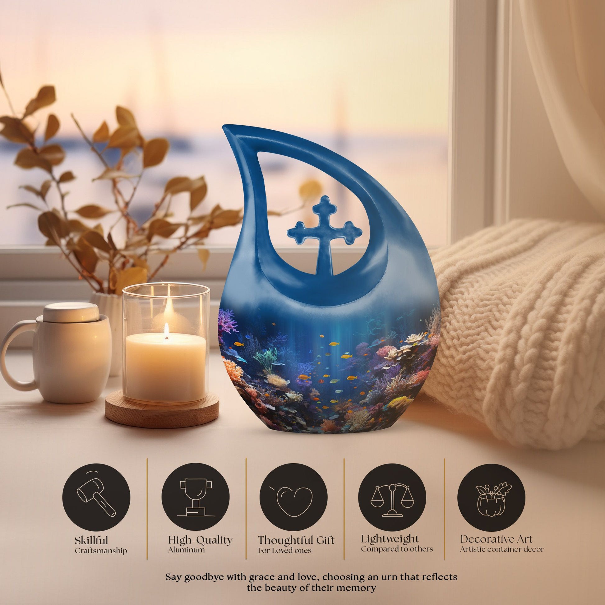 Delicately crafted from aluminium, this 10-inch Wilderness Urn is a reverent ceremonial symbol designed to retrospectively honor your loved ones. Weighing 3.3 pounds, this burial urn is large enough to securely contain the remnants of two departed souls, with its capacity reaching up to 200 cubic inches of ashes. Its wilderness theme showcases an elegant Cross Drop design that brings a sense of serenity and respect towards nature. This urn comes with a velvet pouch to respectfully contain your loved ones' memory. To add an intimate personal touch, this urn can be customized with the engraved names, making it a genuinely unique keepsake. A perfect choice for those searching for 'Memorial Urns' or 'Urns For Ashes', this Wilderness Urn unites sentimental value and elegant design. Keep your dear one's memory alive with this elegant Wilderness Urn, an exclusive addition to 'Custom Made Urns' and 'Burial Cremation Urns For Adults' collection.