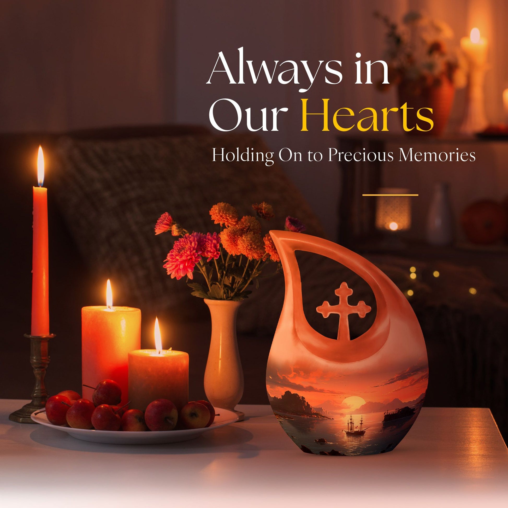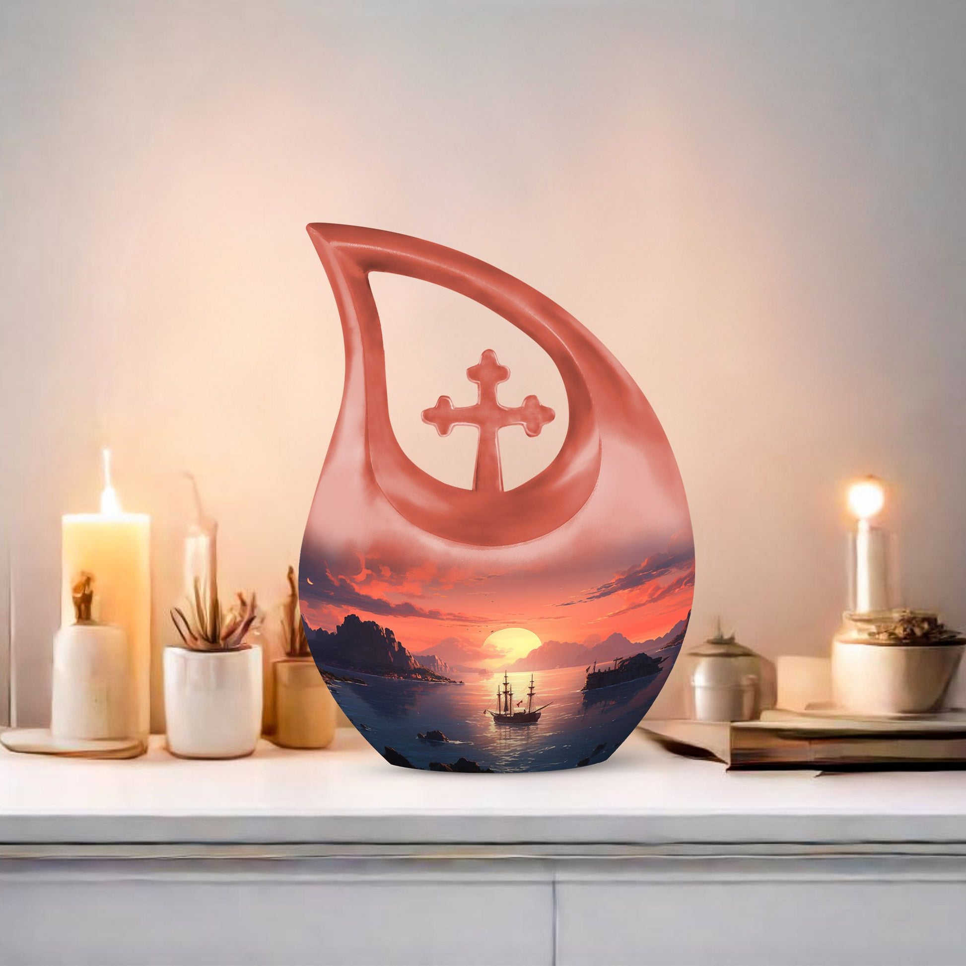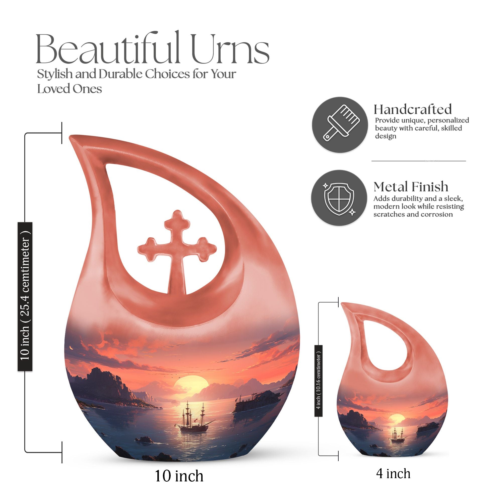 Embrace the tranquility of the wilderness with our thoughtfully crafted Memorial Urn. This 10-inch Ashes Container garners solace and serenity, designed especially for those seeking substance in silence. Fashioned from robust Aluminium, this large urn proves sturdy, with a weight of 3.3 pounds and dimensions standing proudly at 10 inches in height. The Wilderness Urn triumphs in its capacity too, reverently storing up to 200 cubic inches of ashes. Each urn comes with a velvet pouch, a sacred space for holding your cherished memories. Our urns do not merely store ashes, they encapsulate life's rich experiences in their solemn folds, providing a physical, tangible form to trace back to your treasured moments. Immerse yourself in the peaceful esprit as the Cross-Drop theme graces this urn, infusing it with an ethereal sense of the divine. Pushing past the boundaries of mere remembrance, we also offer an opportunity to personalize this urn with engraved names, rendering it a timeless keepsake. Broaden your search beyond memorial urns and explore our collection of Cremation Boxes, Custom Urins, and Expensive Urns designed for human ashes. Make an authentic and heartfelt choice with our Wilderness Urn.