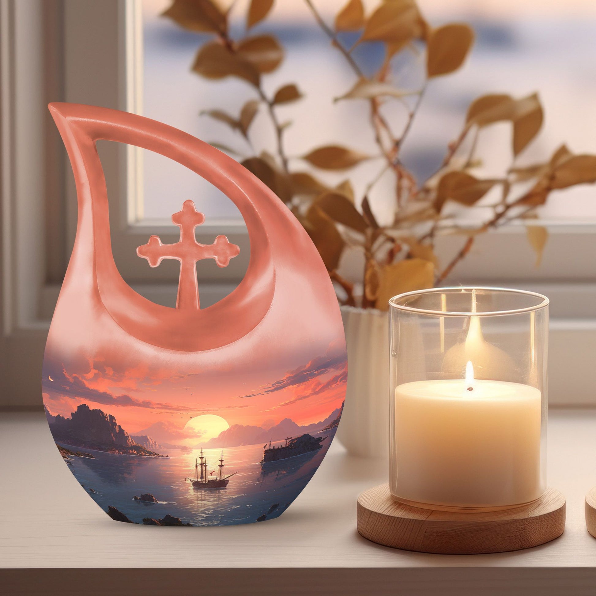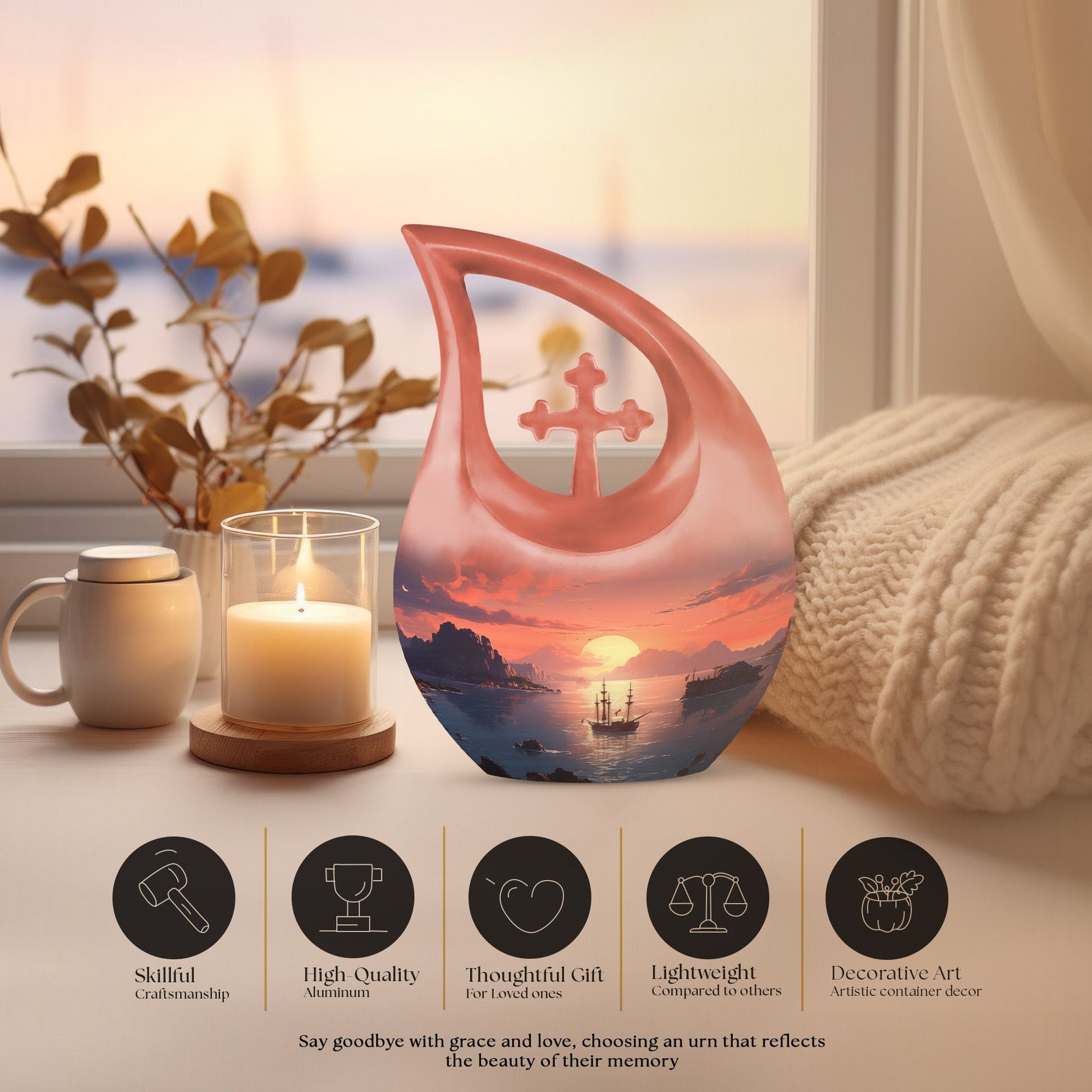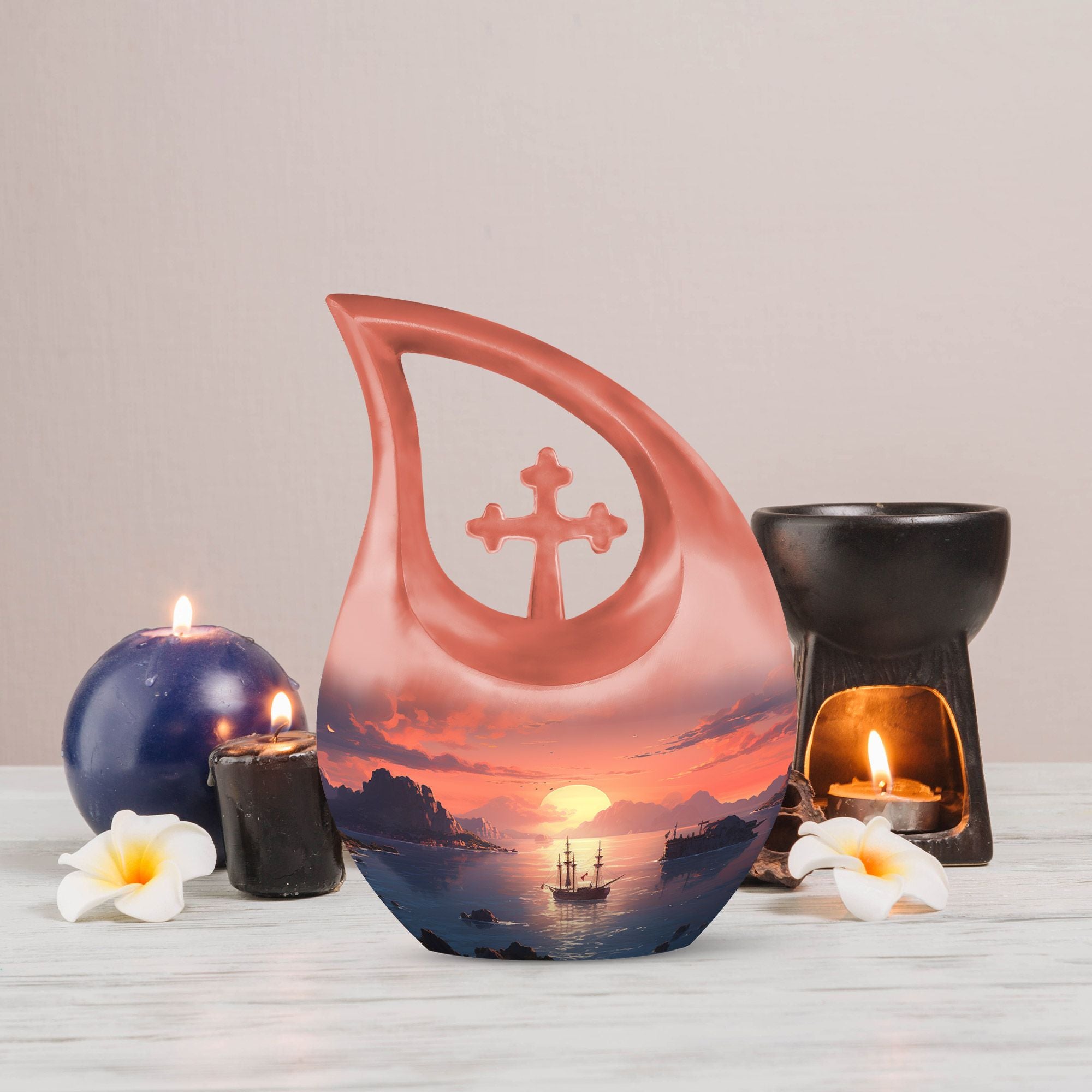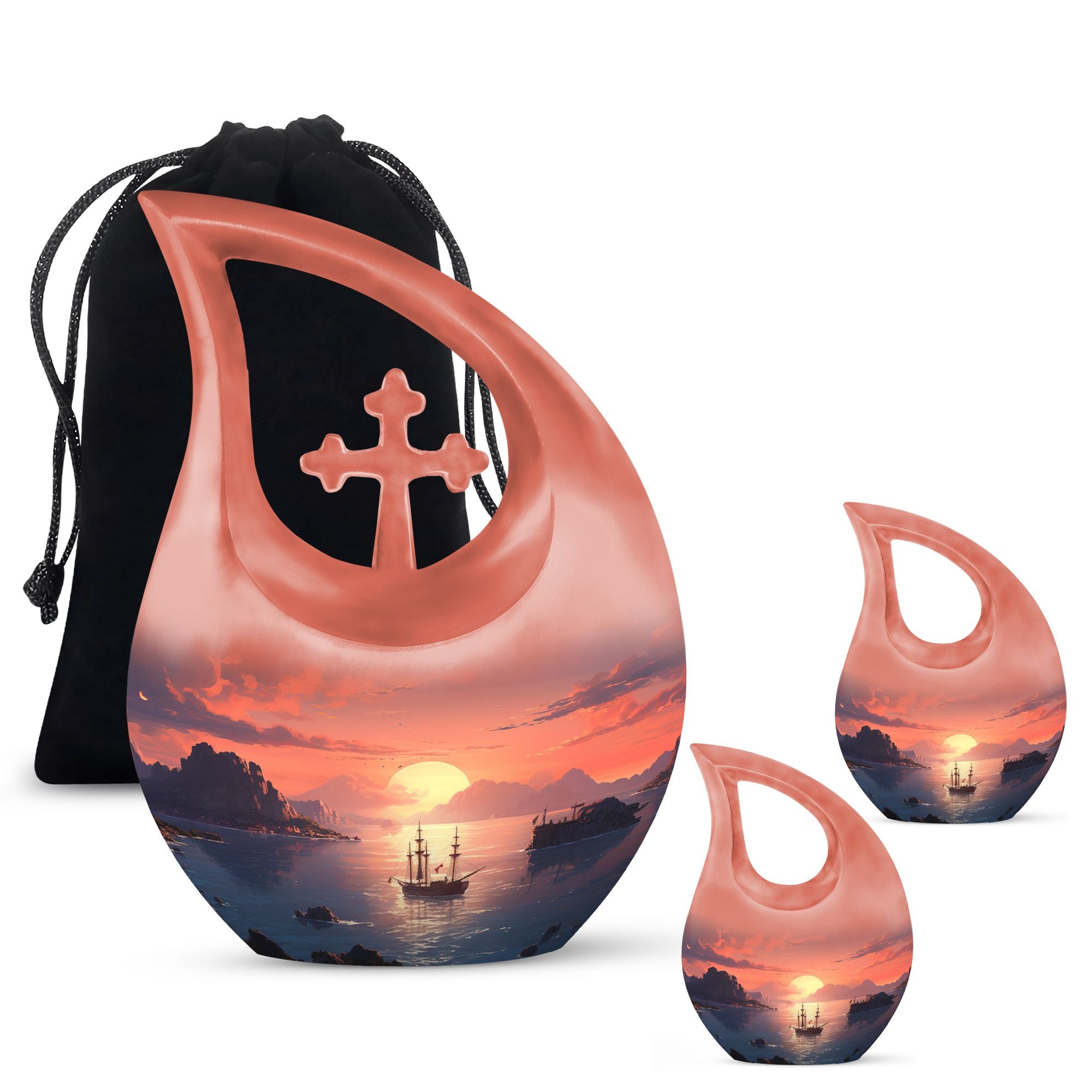 Embrace the tranquility of the wilderness with our thoughtfully crafted Memorial Urn. This 10-inch Ashes Container garners solace and serenity, designed especially for those seeking substance in silence. Fashioned from robust Aluminium, this large urn proves sturdy, with a weight of 3.3 pounds and dimensions standing proudly at 10 inches in height. The Wilderness Urn triumphs in its capacity too, reverently storing up to 200 cubic inches of ashes. Each urn comes with a velvet pouch, a sacred space for holding your cherished memories. Our urns do not merely store ashes, they encapsulate life's rich experiences in their solemn folds, providing a physical, tangible form to trace back to your treasured moments. Immerse yourself in the peaceful esprit as the Cross-Drop theme graces this urn, infusing it with an ethereal sense of the divine. Pushing past the boundaries of mere remembrance, we also offer an opportunity to personalize this urn with engraved names, rendering it a timeless keepsake. Broaden your search beyond memorial urns and explore our collection of Cremation Boxes, Custom Urins, and Expensive Urns designed for human ashes. Make an authentic and heartfelt choice with our Wilderness Urn.