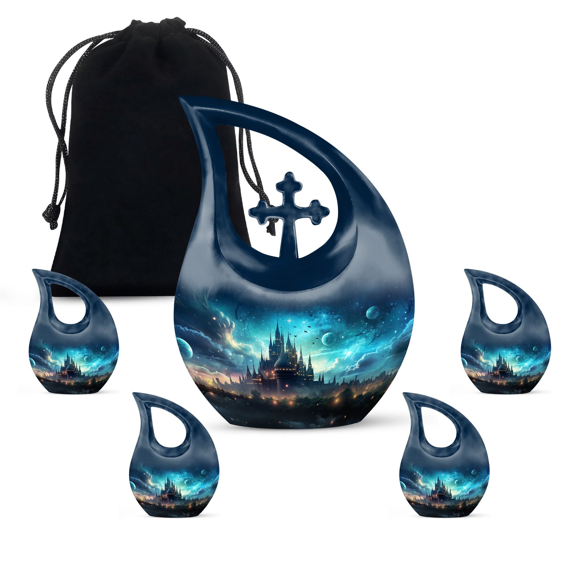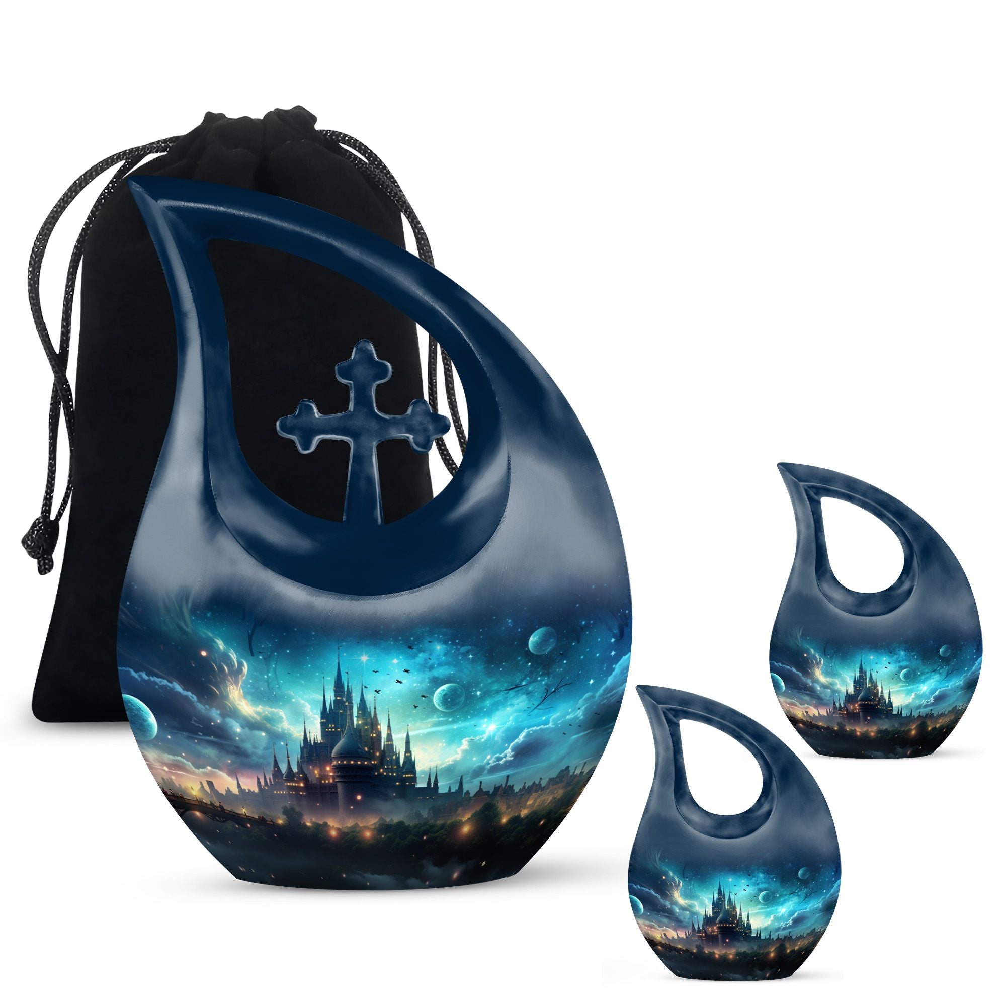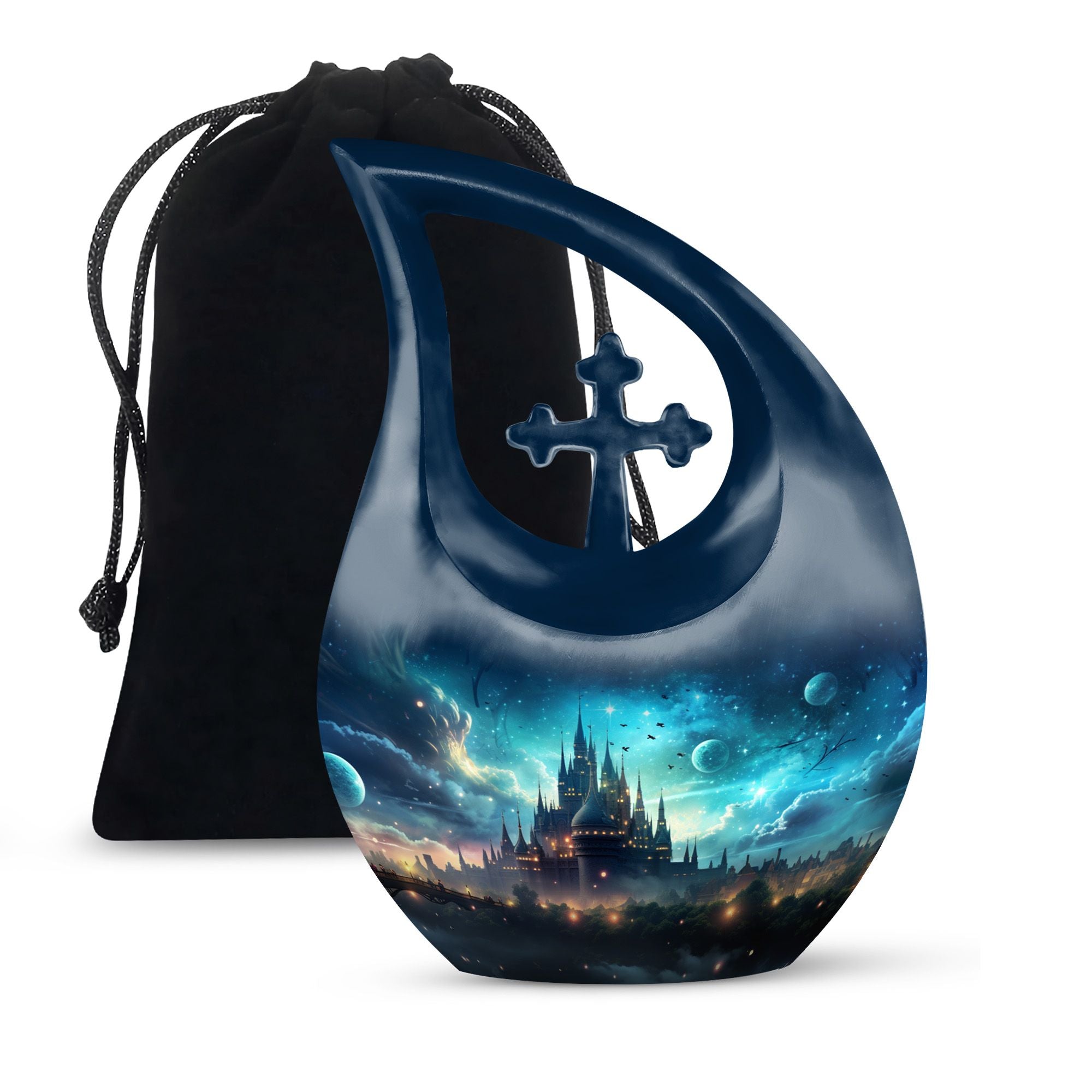 Crafted with care from durable aluminum, this princess castle urn for women features a serene night sky, twinkling stars, and a softly illuminated castle—symbolizing hope, protection, and eternal remembrance. The 10-inch adult size makes it a dependable option among human cremation urns, adult size cremation urn, and cremation urn for human ashes. Families who wish to share ashes may add coordinating pieces such as cremation urn keepsake, small cremation keepsakes, cremation keepsake urns for ashes, or keepsake cremation urns for human ashes adult. This urn also pairs beautifully with sets designed as cremation urns with keepsake.