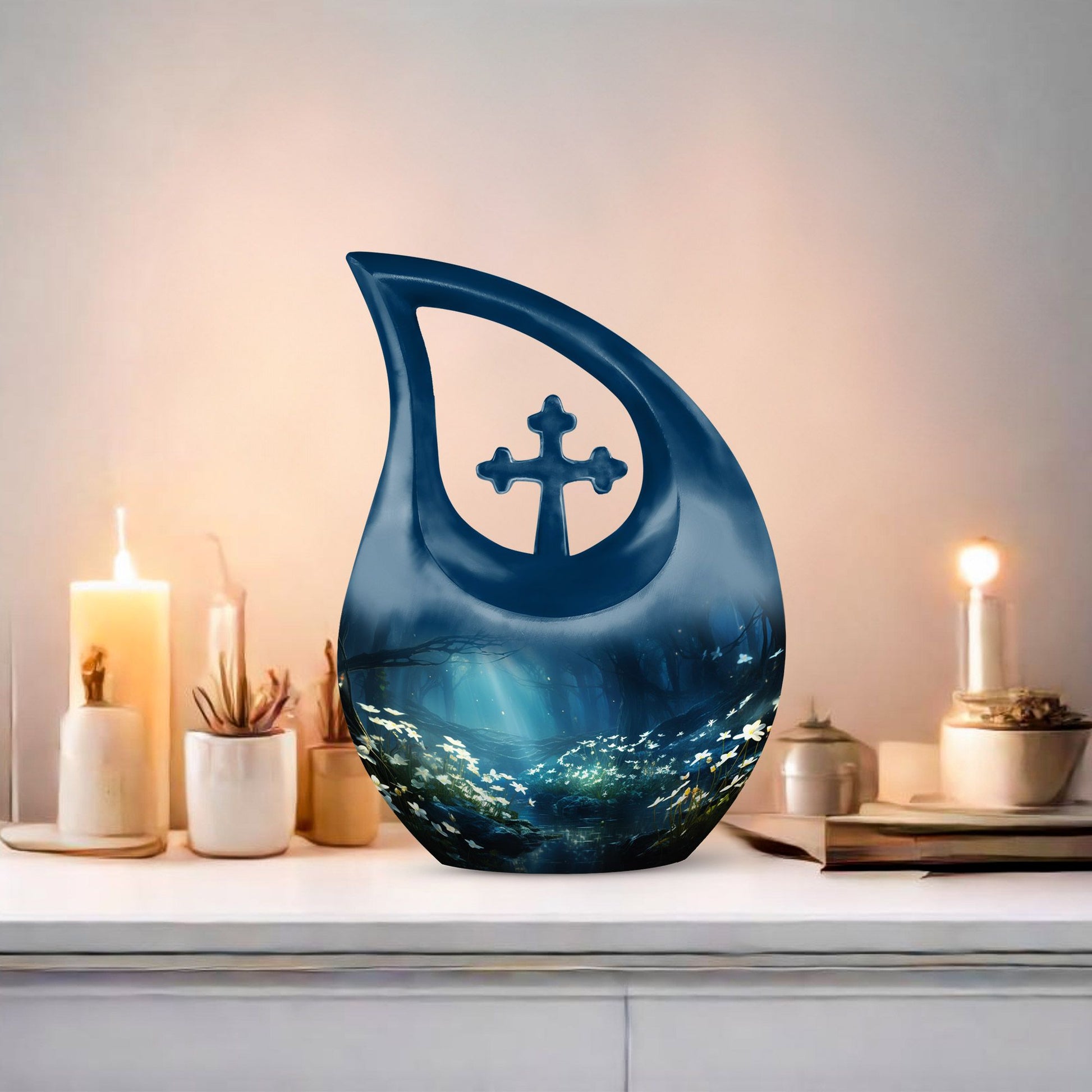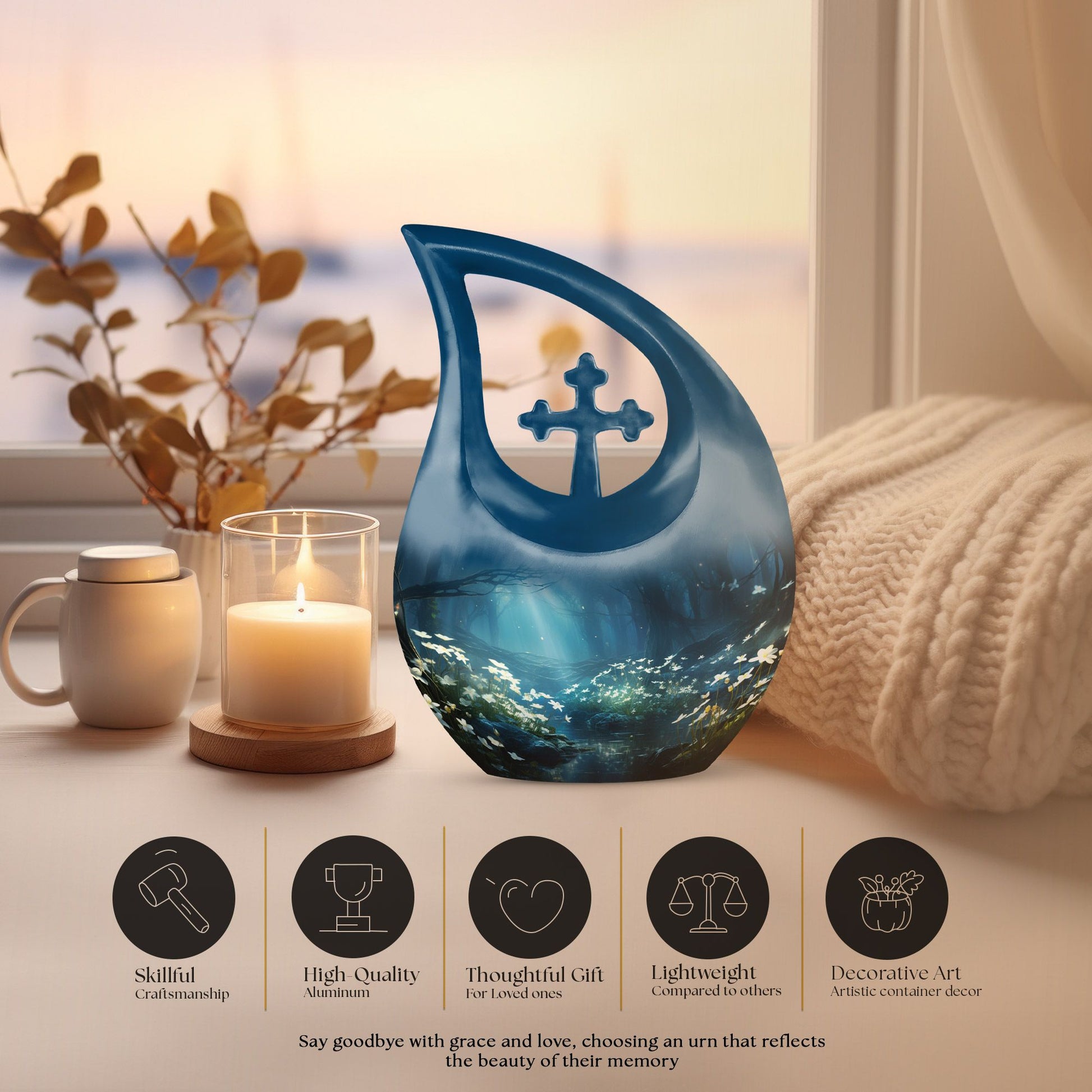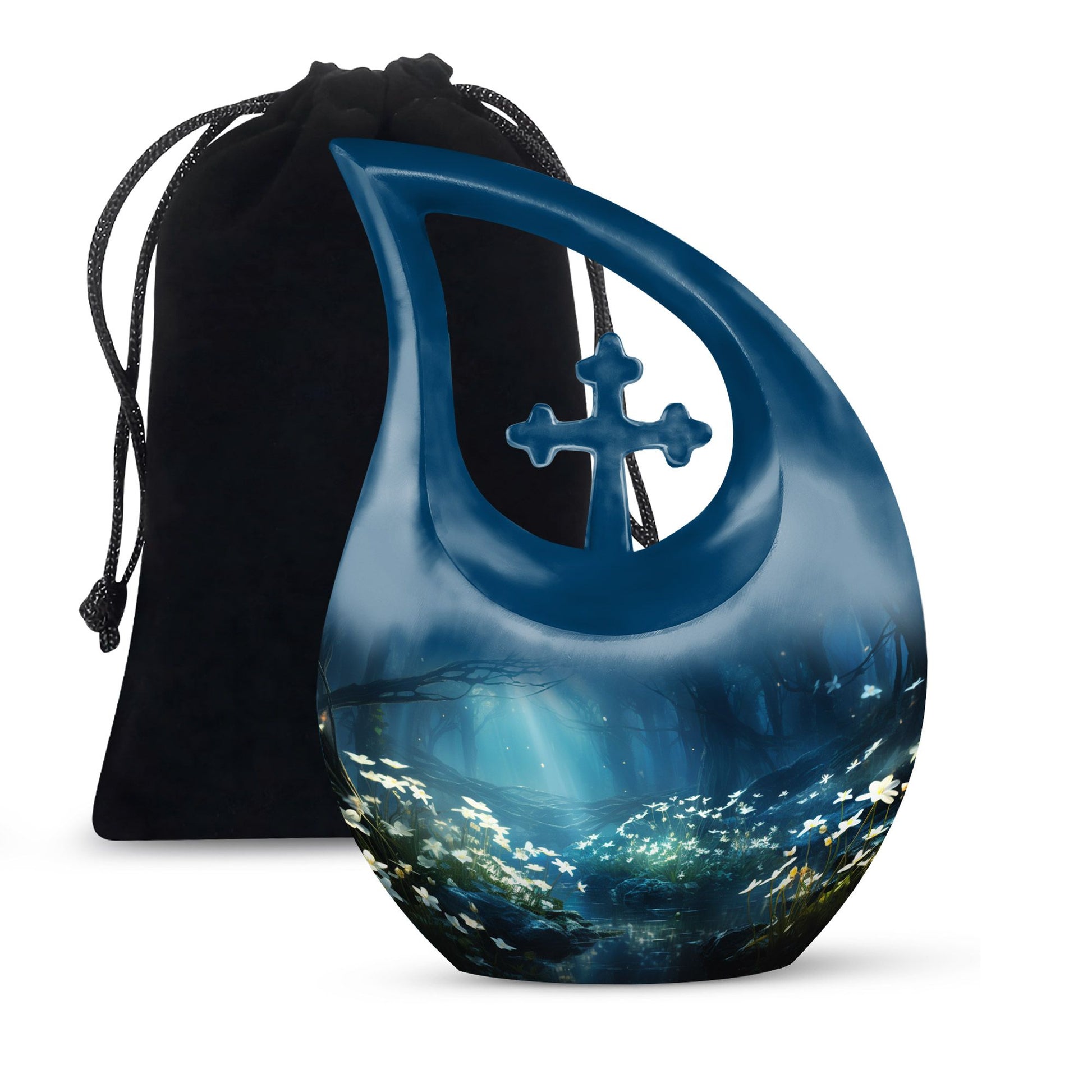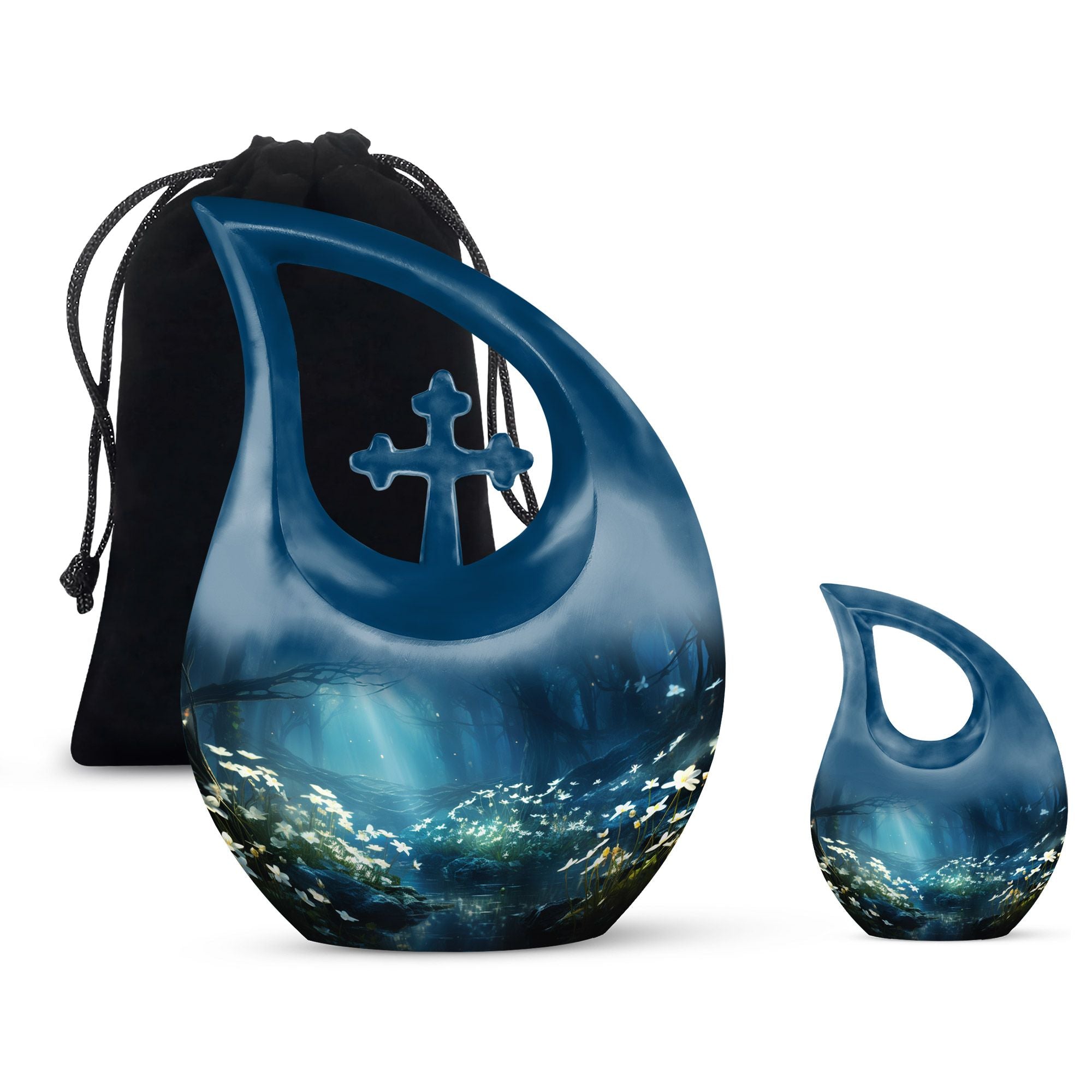 Experience a touch of the serene wilderness with our elegantly crafted Wilderness Urn. This 10-inch urn is a heartfelt and respectful resting place for loved ones. Sculpted with refinement, it features a symbolic 'Cross Drop' emblem, signifying hope and faith. The sturdy aluminium construction gives a solid, yet graceful appeal, while carefully balancing lightness at a mere 3.3lbs. Its capacity of 200 cubic inches comfortably holds the ashes of an adult, thus serving as one of our distinguished large urns. For an extra personal touch, we offer customization options, allowing you to engrave names and create a truly personalized urn for adults. It is meticulously packed in a sumptuous velvet pouch, ensuring the respectful containment of ashes. The Wilderness Urn embraces memorial urns' solemnity with a spirit of timeless grace, making it an excellent choice for those looking to buy urn for ashes. This unique cremation keepsake is not just an urn, but a tribute to cherished memories.