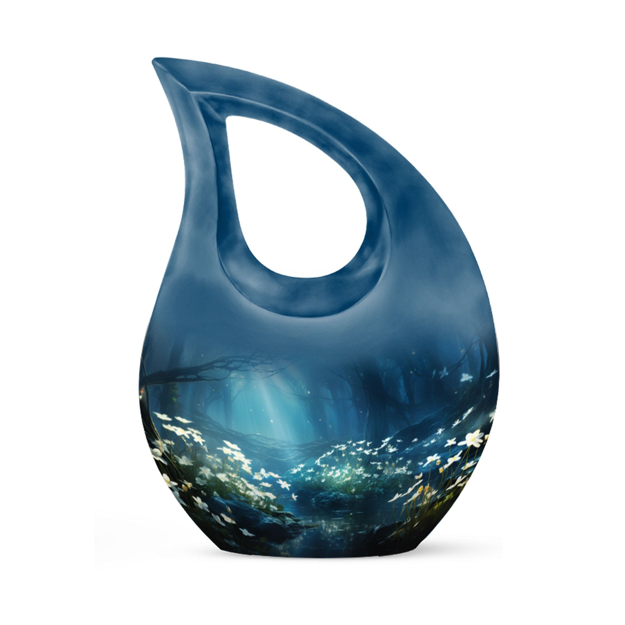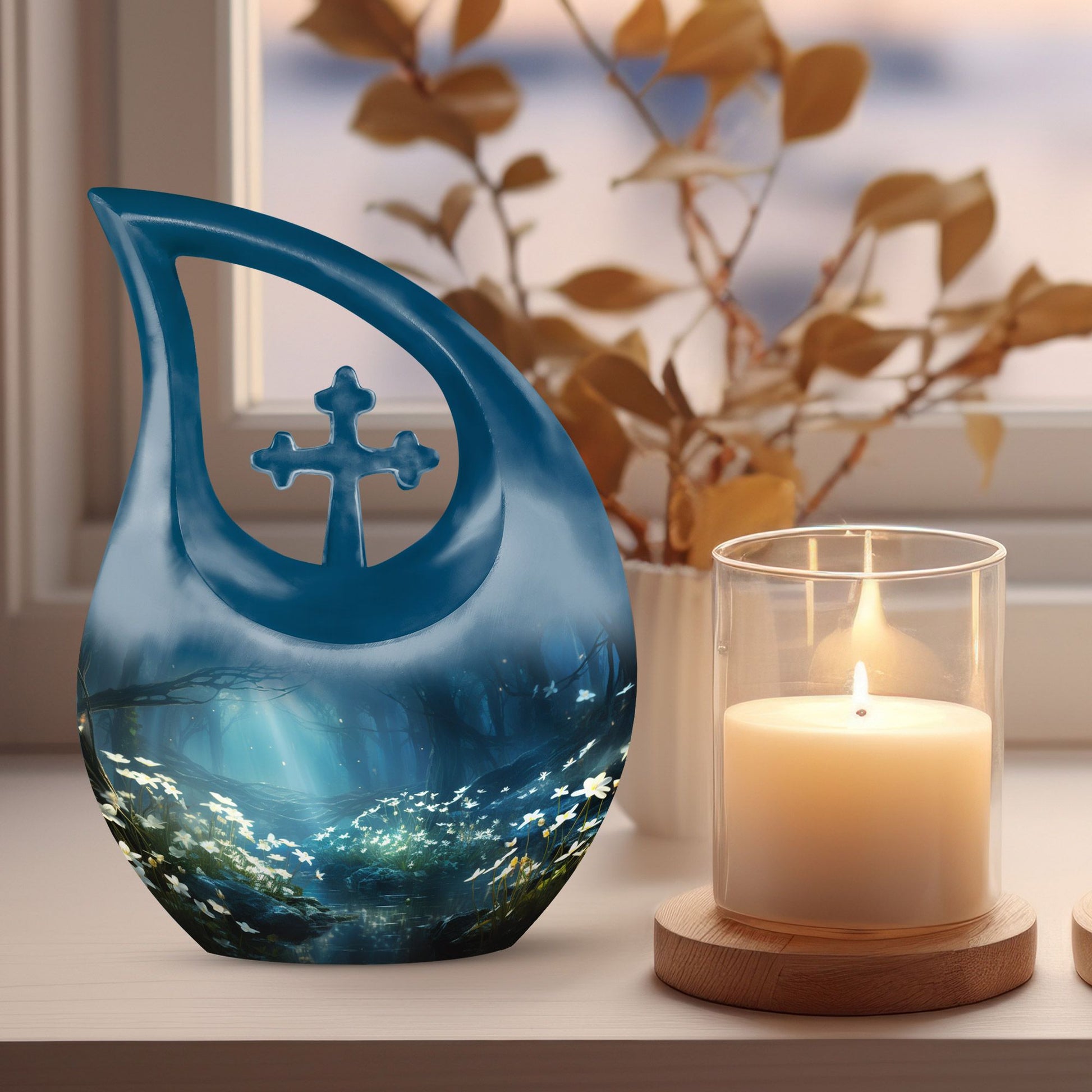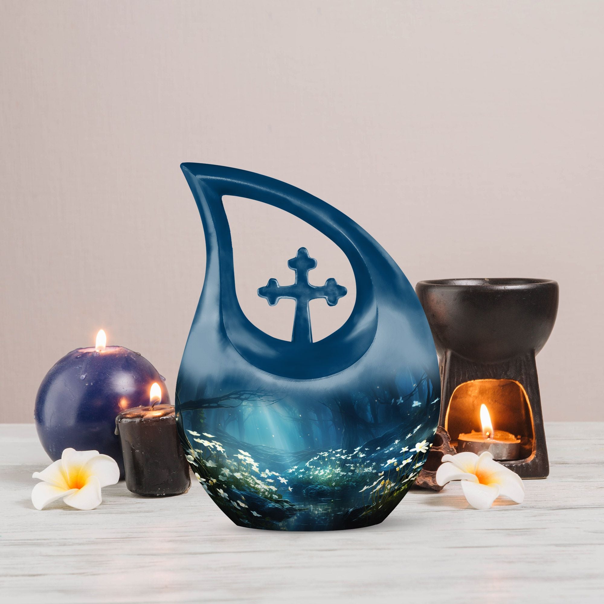 Experience a touch of the serene wilderness with our elegantly crafted Wilderness Urn. This 10-inch urn is a heartfelt and respectful resting place for loved ones. Sculpted with refinement, it features a symbolic 'Cross Drop' emblem, signifying hope and faith. The sturdy aluminium construction gives a solid, yet graceful appeal, while carefully balancing lightness at a mere 3.3lbs. Its capacity of 200 cubic inches comfortably holds the ashes of an adult, thus serving as one of our distinguished large urns. For an extra personal touch, we offer customization options, allowing you to engrave names and create a truly personalized urn for adults. It is meticulously packed in a sumptuous velvet pouch, ensuring the respectful containment of ashes. The Wilderness Urn embraces memorial urns' solemnity with a spirit of timeless grace, making it an excellent choice for those looking to buy urn for ashes. This unique cremation keepsake is not just an urn, but a tribute to cherished memories.