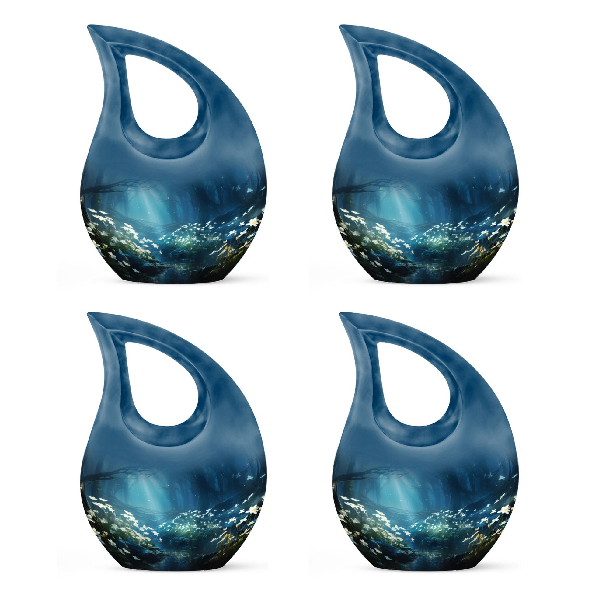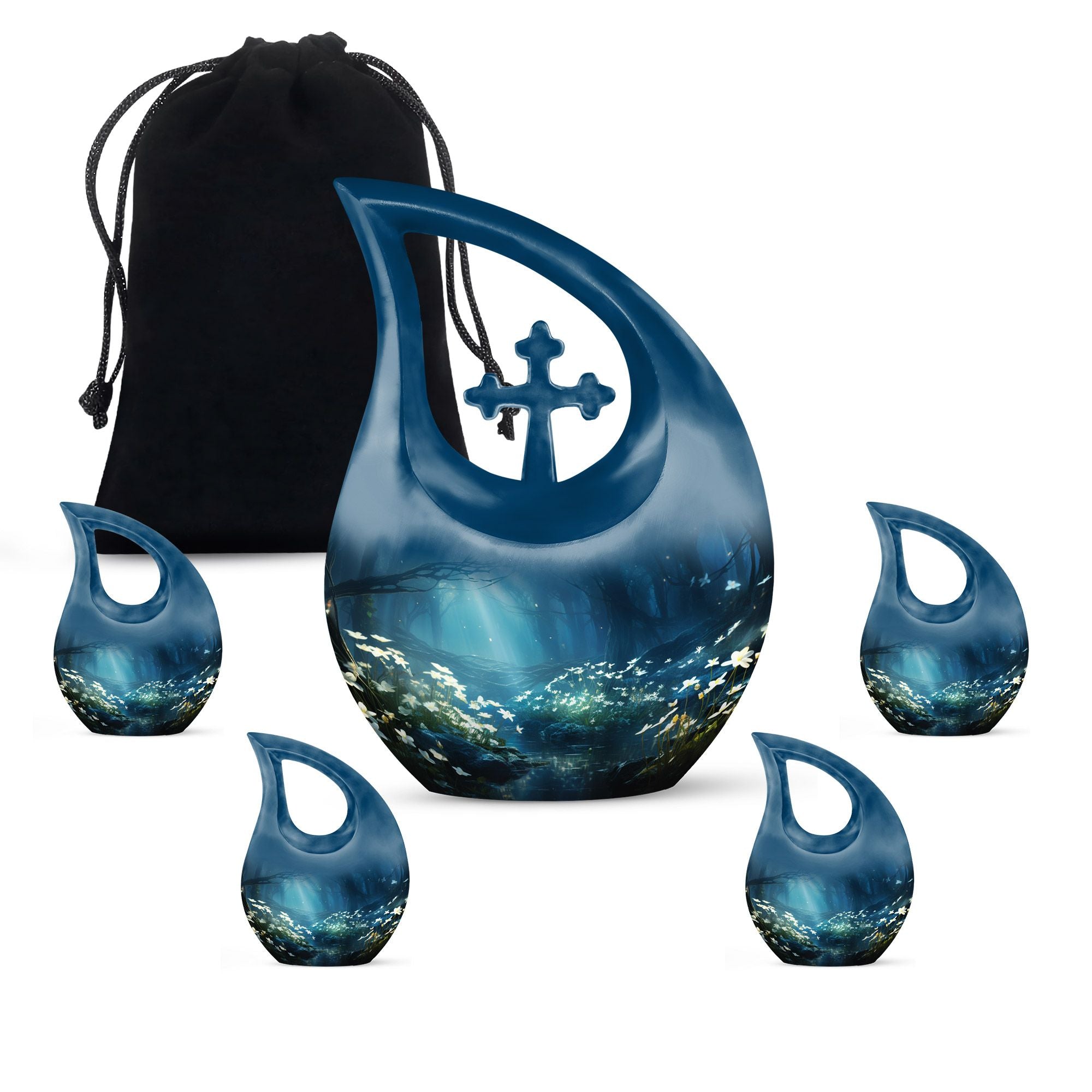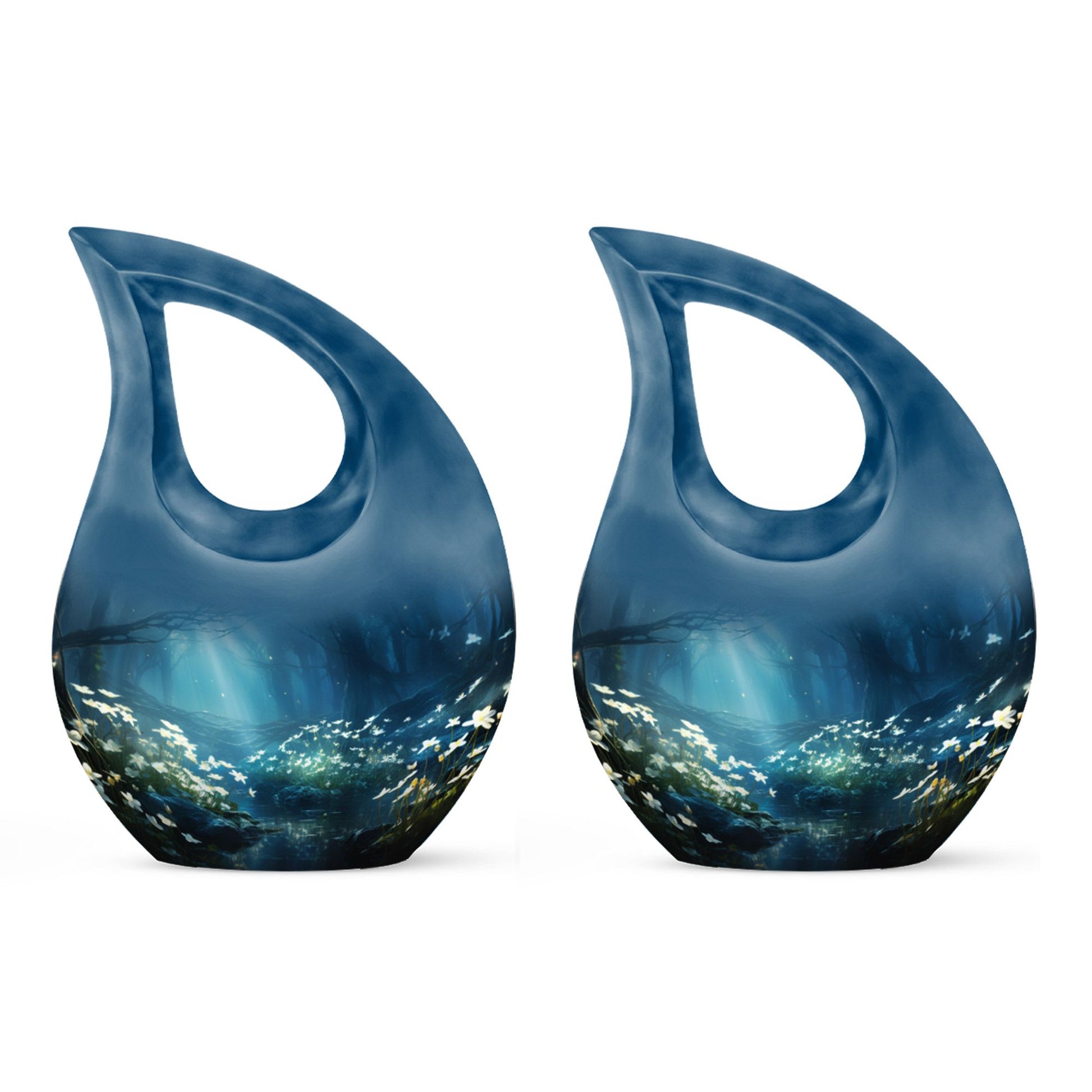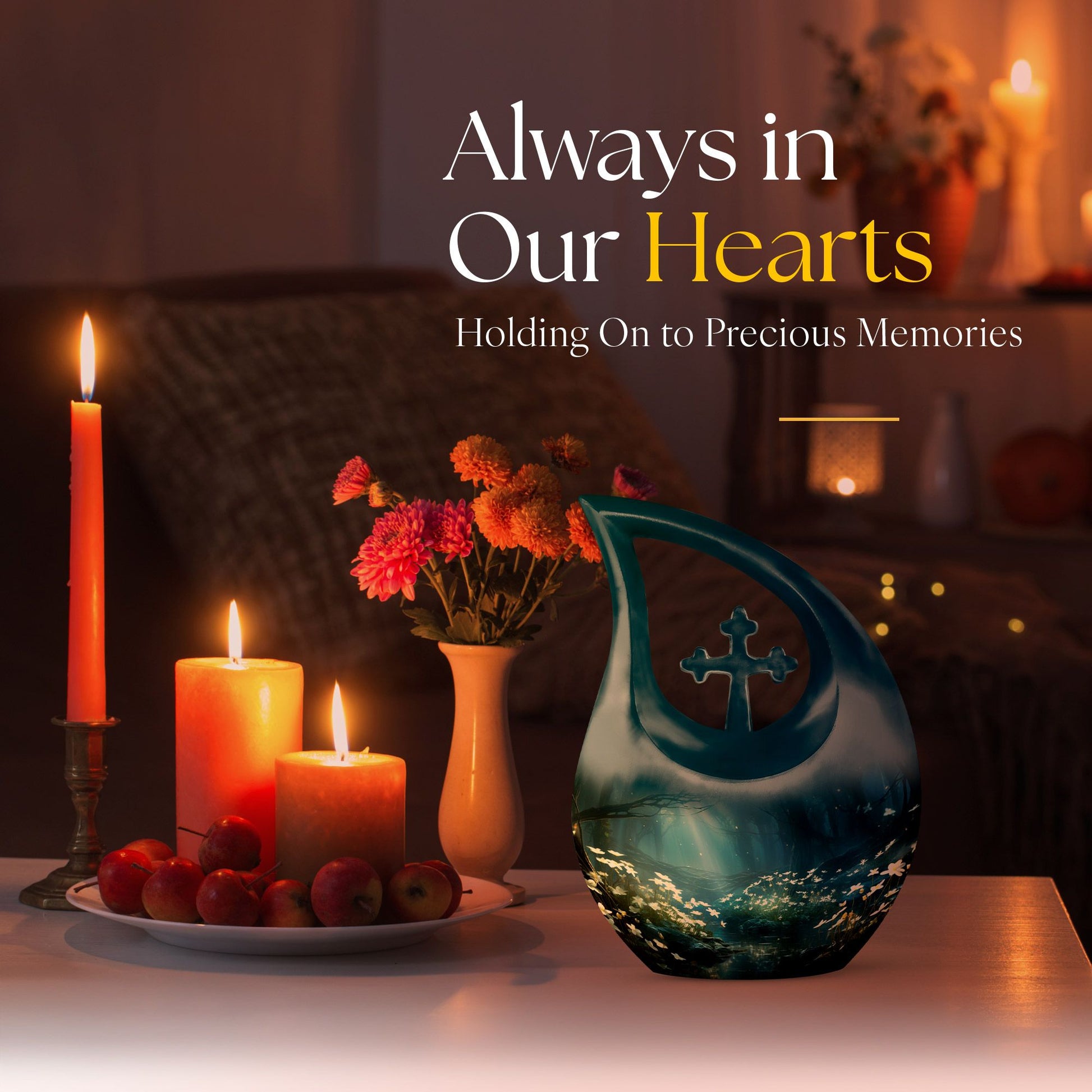 Experience a touch of the serene wilderness with our elegantly crafted Wilderness Urn. This 10-inch urn is a heartfelt and respectful resting place for loved ones. Sculpted with refinement, it features a symbolic 'Cross Drop' emblem, signifying hope and faith. The sturdy aluminium construction gives a solid, yet graceful appeal, while carefully balancing lightness at a mere 3.3lbs. Its capacity of 200 cubic inches comfortably holds the ashes of an adult, thus serving as one of our distinguished large urns. For an extra personal touch, we offer customization options, allowing you to engrave names and create a truly personalized urn for adults. It is meticulously packed in a sumptuous velvet pouch, ensuring the respectful containment of ashes. The Wilderness Urn embraces memorial urns' solemnity with a spirit of timeless grace, making it an excellent choice for those looking to buy urn for ashes. This unique cremation keepsake is not just an urn, but a tribute to cherished memories.