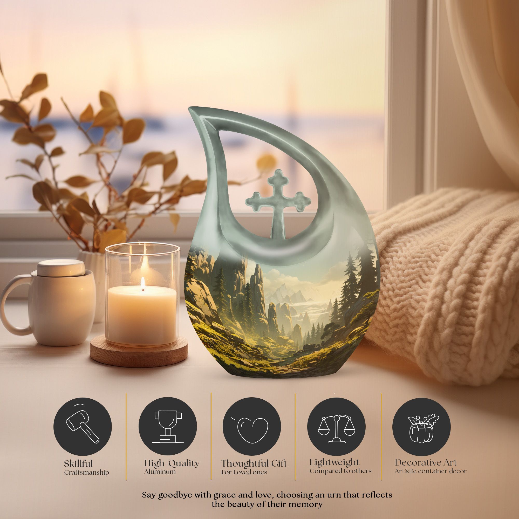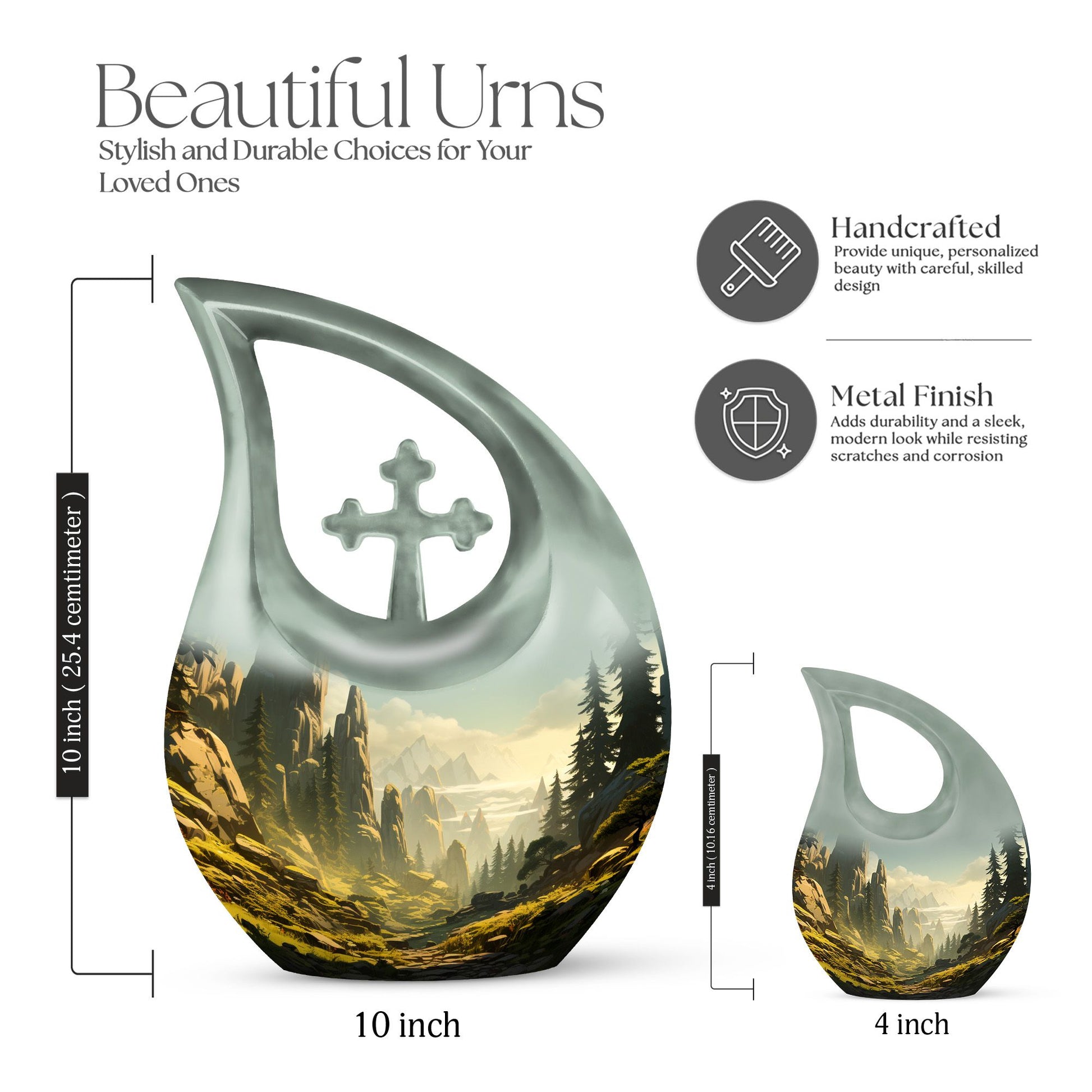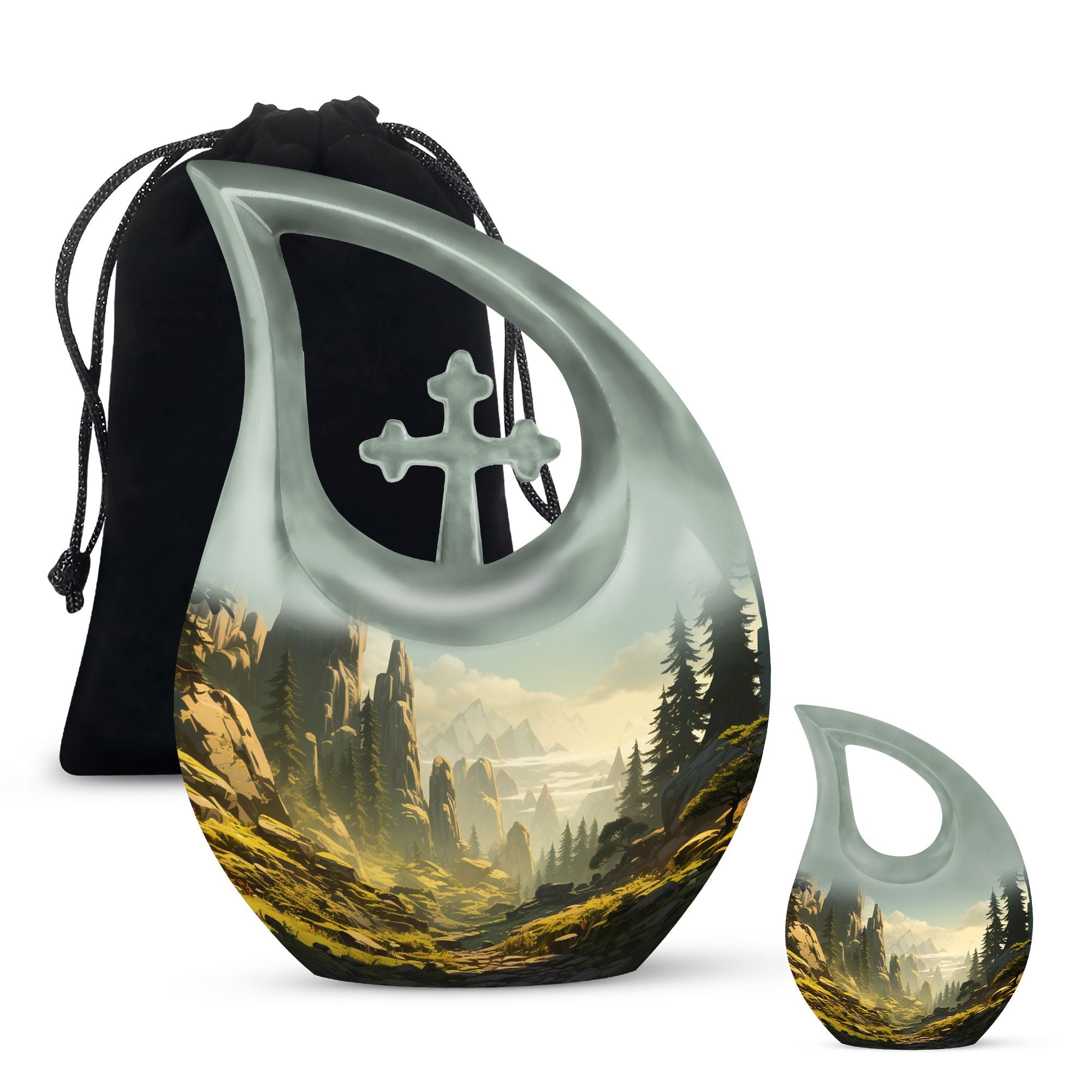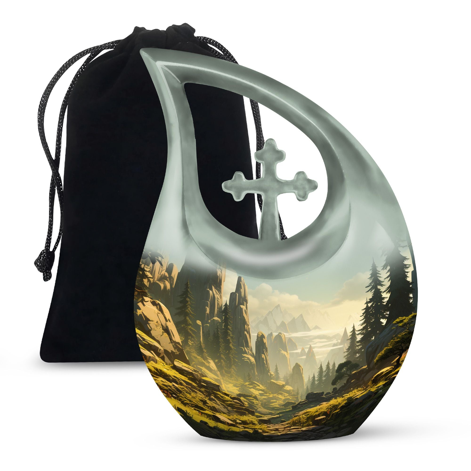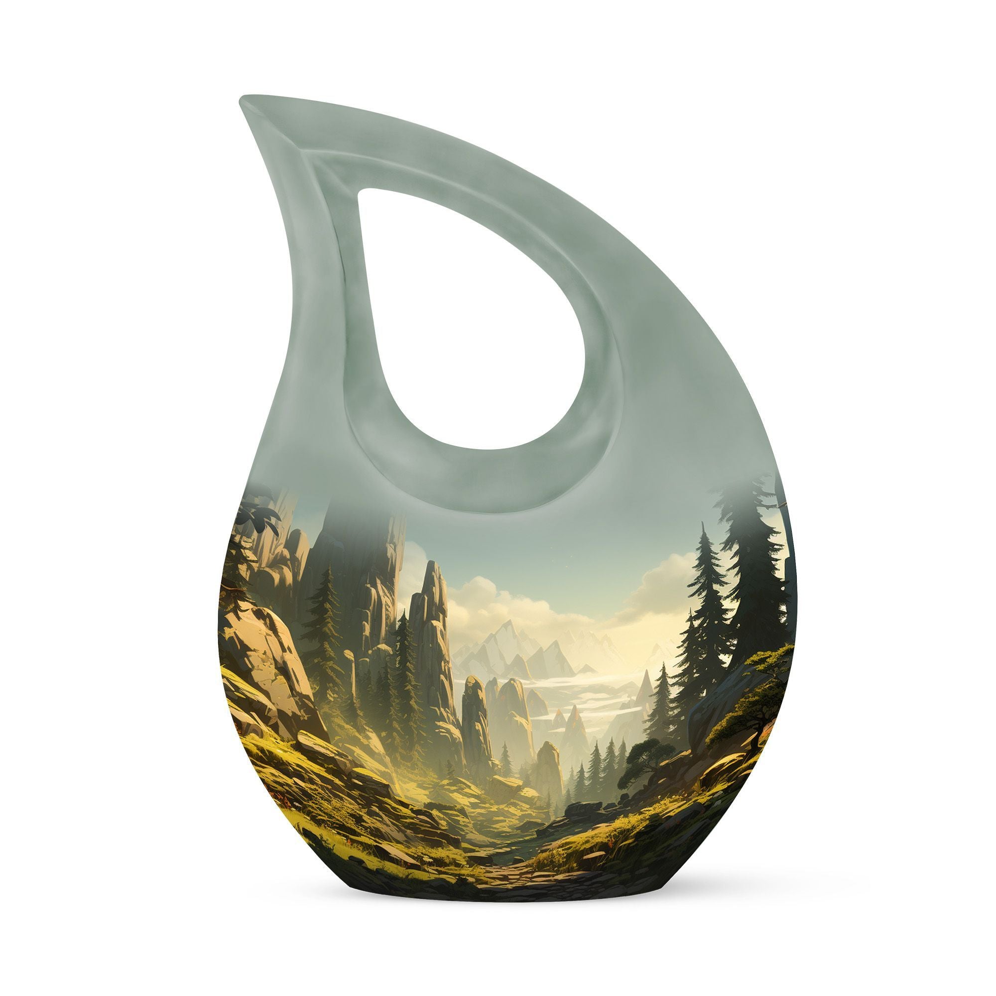 Introducing our Wilderness Urn, a testament to natural beauty and solace in times of grief. This aluminum urn is an epitome of craftsmanship, designed specifically for human ashes. Standing at 10 inches high, it holds a capacity of 200 cubic inches, making it ideal for ceremonial uses. Weighing in at a steady 3.3 pounds, it provides the robustness and tranquility of the wilderness theme it represents. Our Unusual Urn comes packed in an elegant velvet pouch for secure containment, accentuating the notion of remembrance and honor. The urn provides the option for customization; engrave the names of your beloved on it for an even more personal tribute. Although void of any overt design, our Double Cremation urn is high on aesthetics. Embrace this unique way to remember loved ones passed and honor their presence in your life with this Burial Urn. Instilling a sense of tranquility and reverence, it stands out among Memorial Urns in the market. Its suitability for adults and seniors makes it an outstanding choice among Large Urns and Small Urns for cremation ashes.