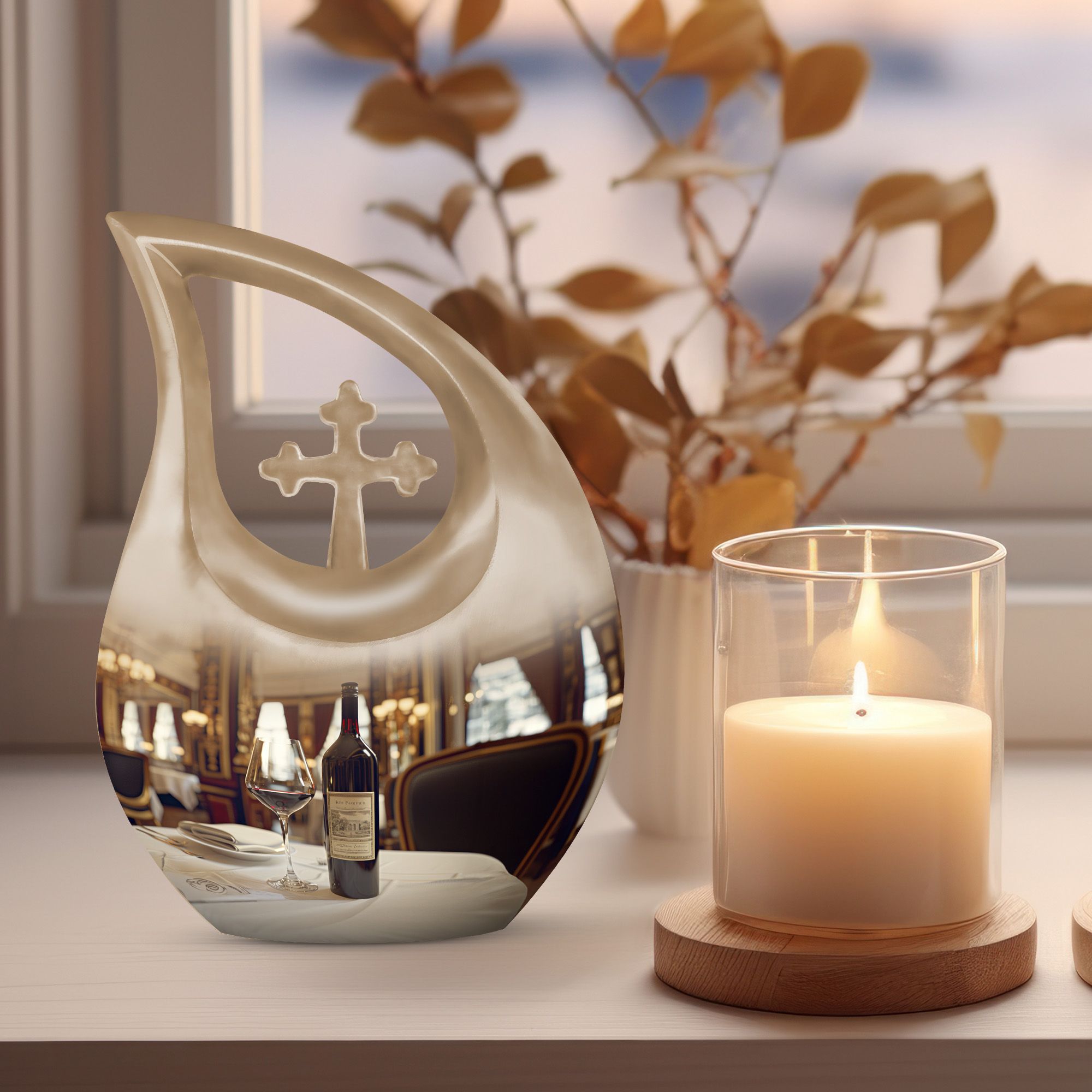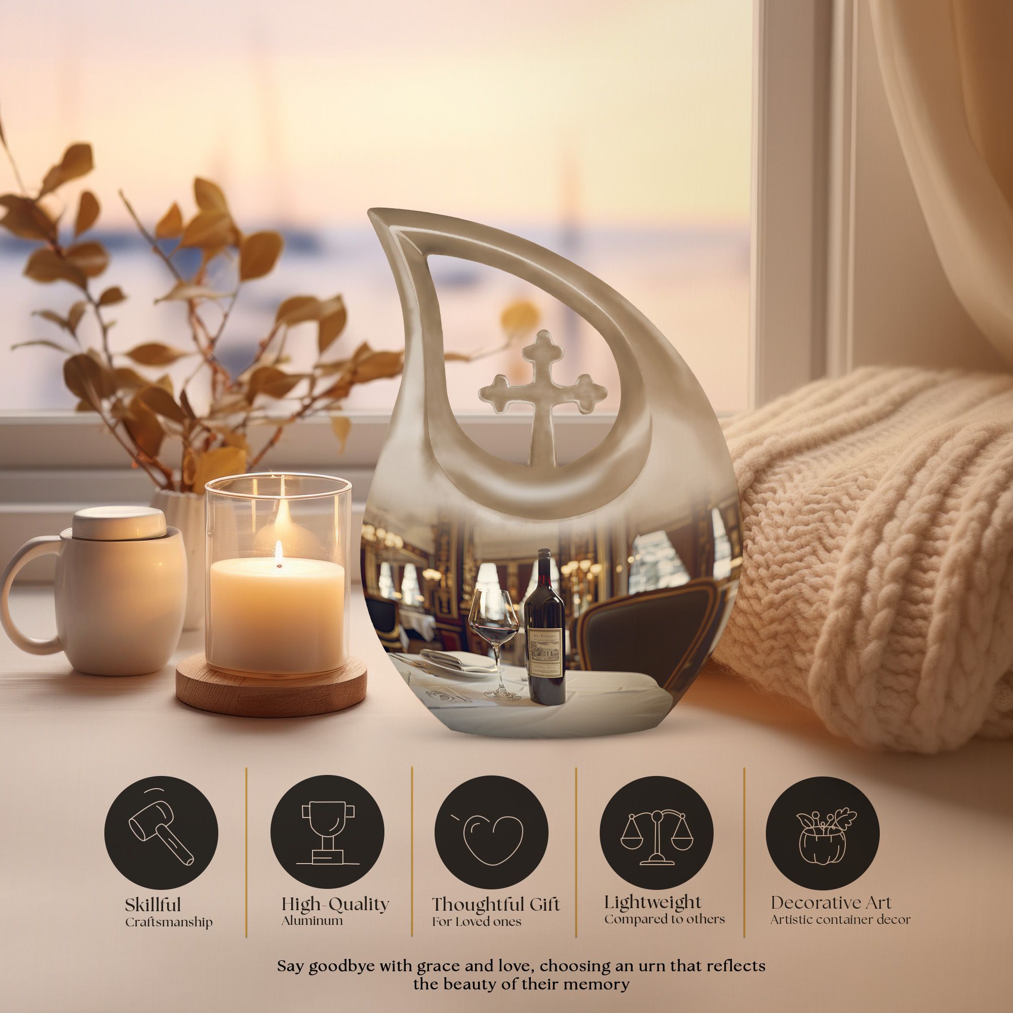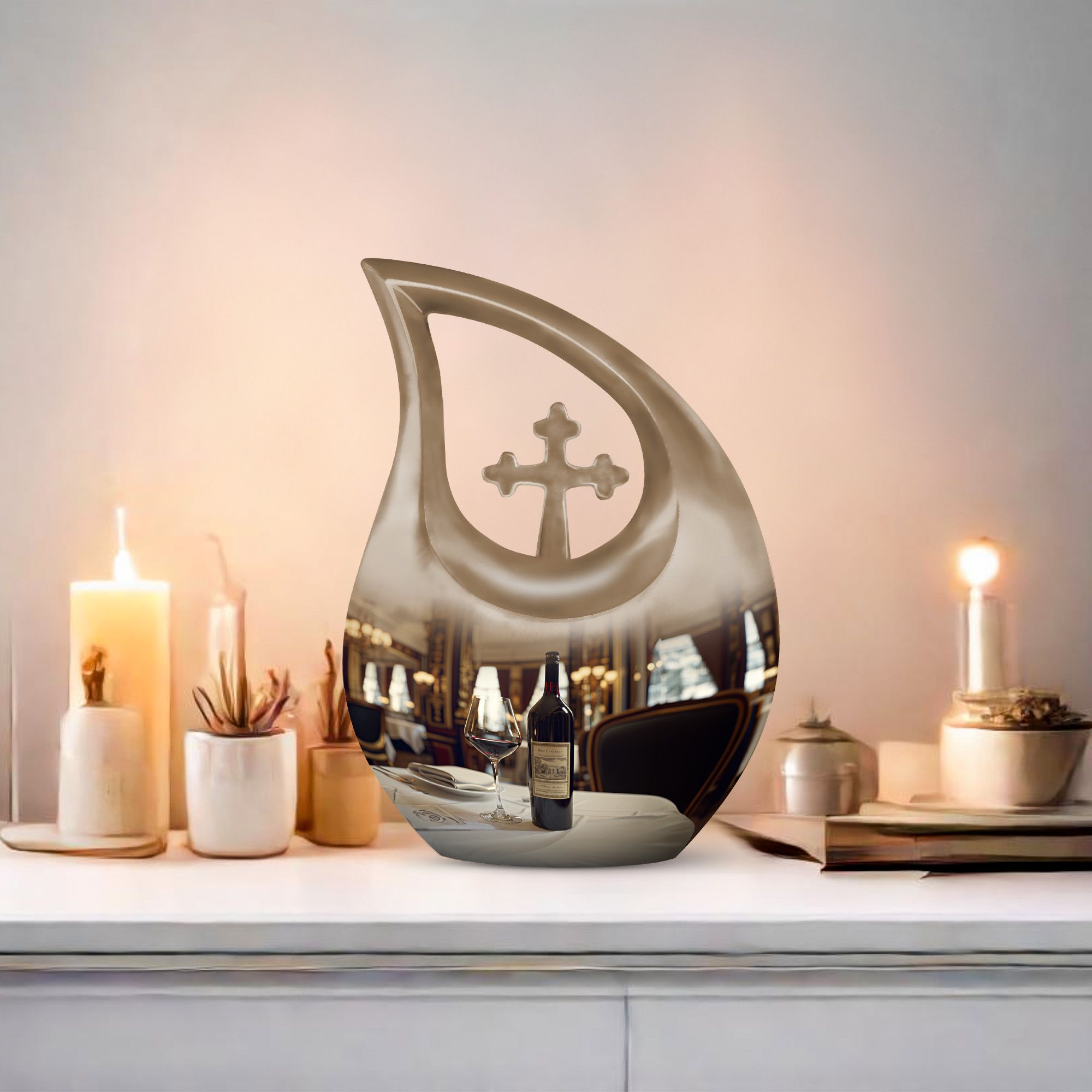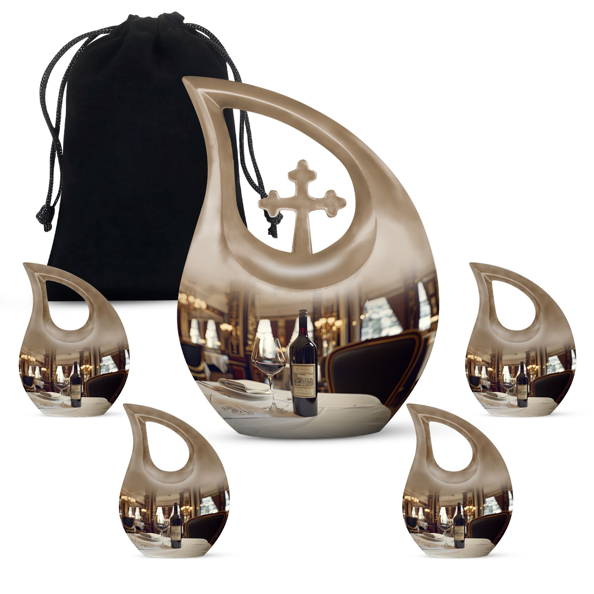 Honor your loved one's memories with an enduring token of remembrance, the Cross Drop Wine Urn. This 10-inch aluminum Memorial Urn for Ashes features an artistic cross-drop pattern and a deep, rich wine theme, suggesting serenity, peace, and strength. Weighing in at 3.3 pounds, our memorial urn provides a spacious capacity of 200 cubic inches, ample room for preserving the ashes of your loved ones. Along with the urn, we offer an elegant velvet pouch for respectful containment of ashes. Goodbyes are difficult, but the right symbol of love makes it slightly easier. This large urn's beauty lies in its customizability—make it special by engraving names on it, adding a personal touch. Our Cross Drop Wine Urn is not just an urn, it's a keepsake that symbolizes endless love and respect. Purchase our finely crafted urns and create a memorial that truly reflects the spirit of your loved ones.