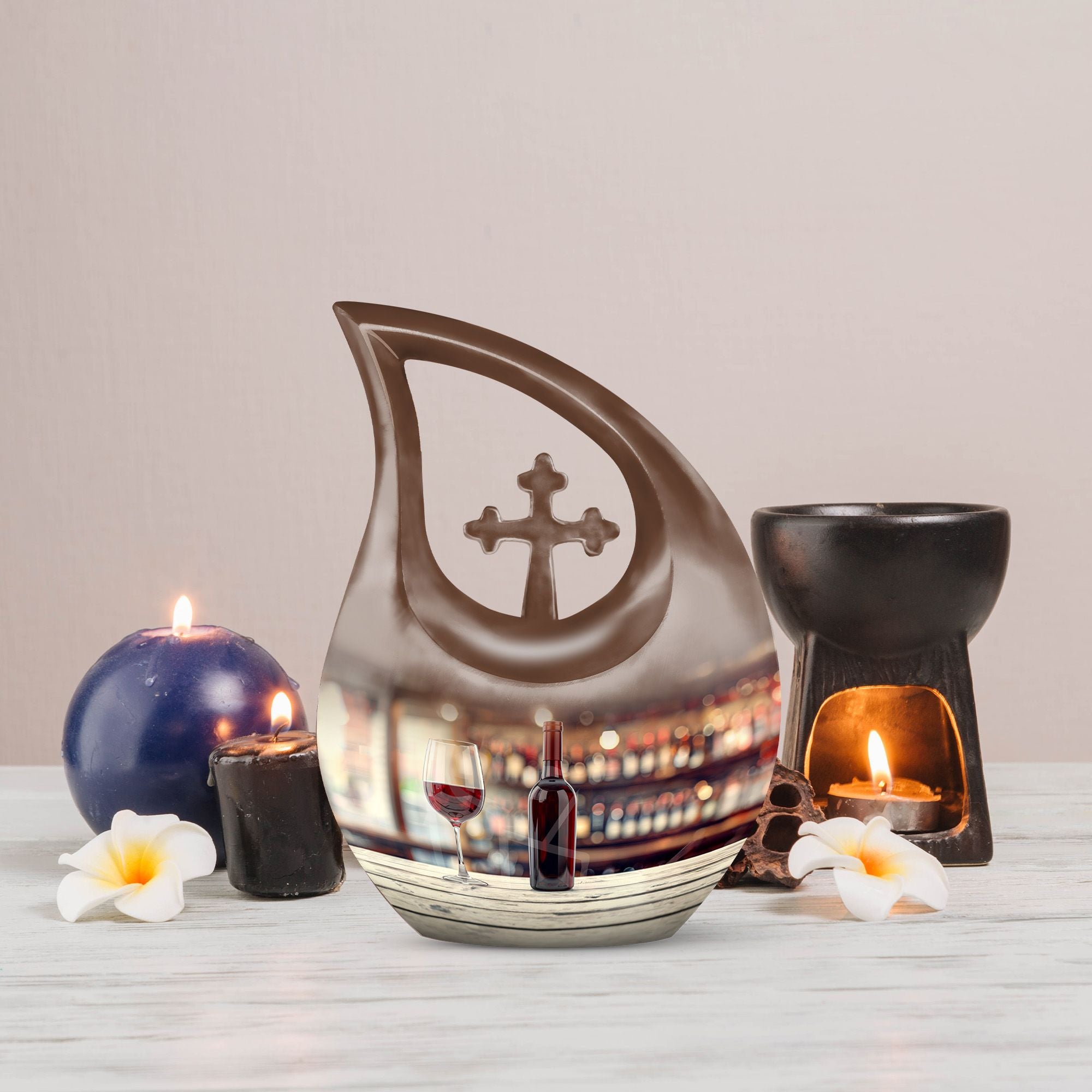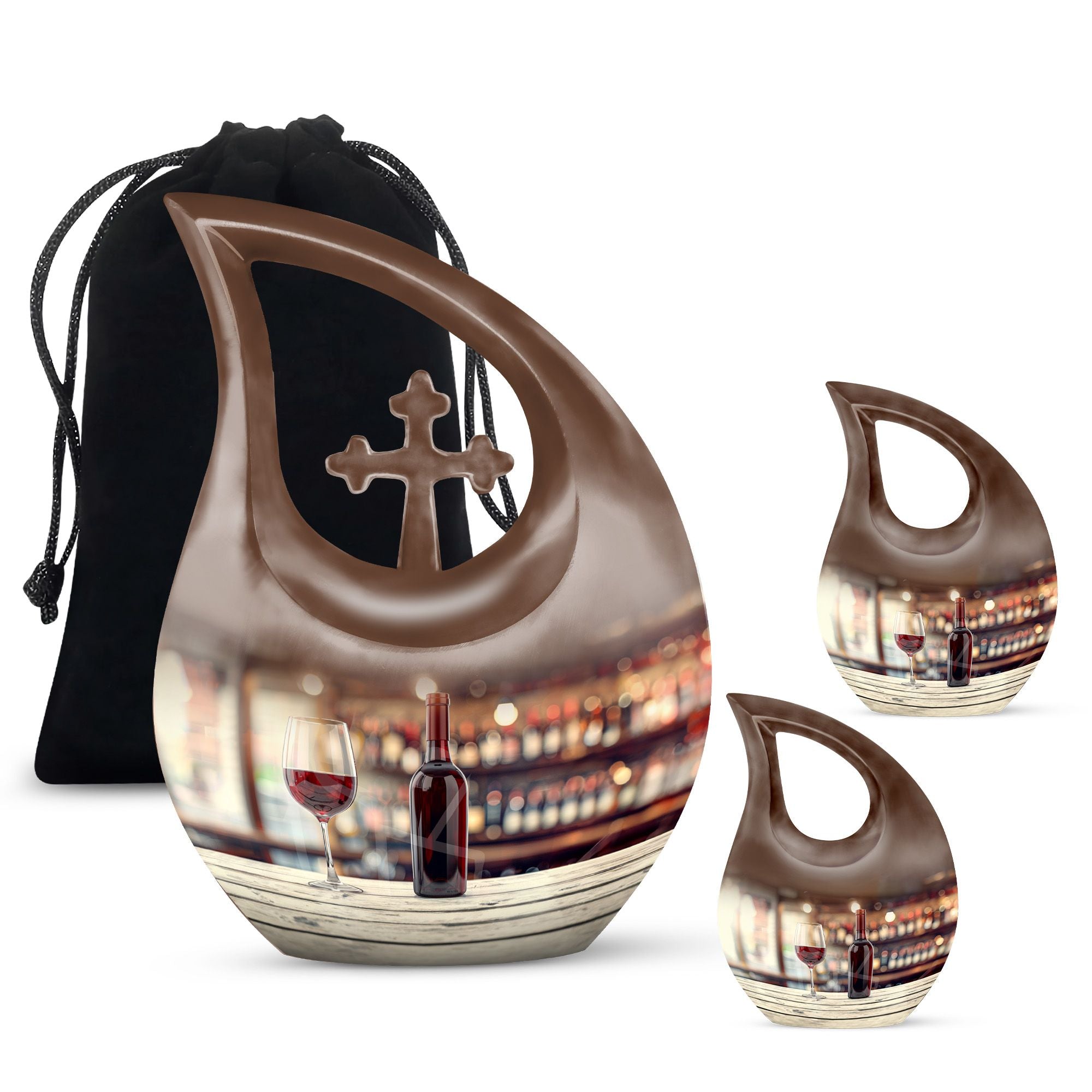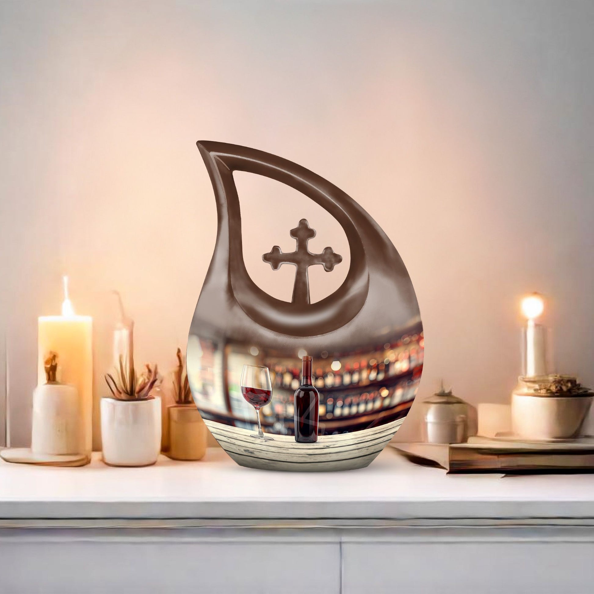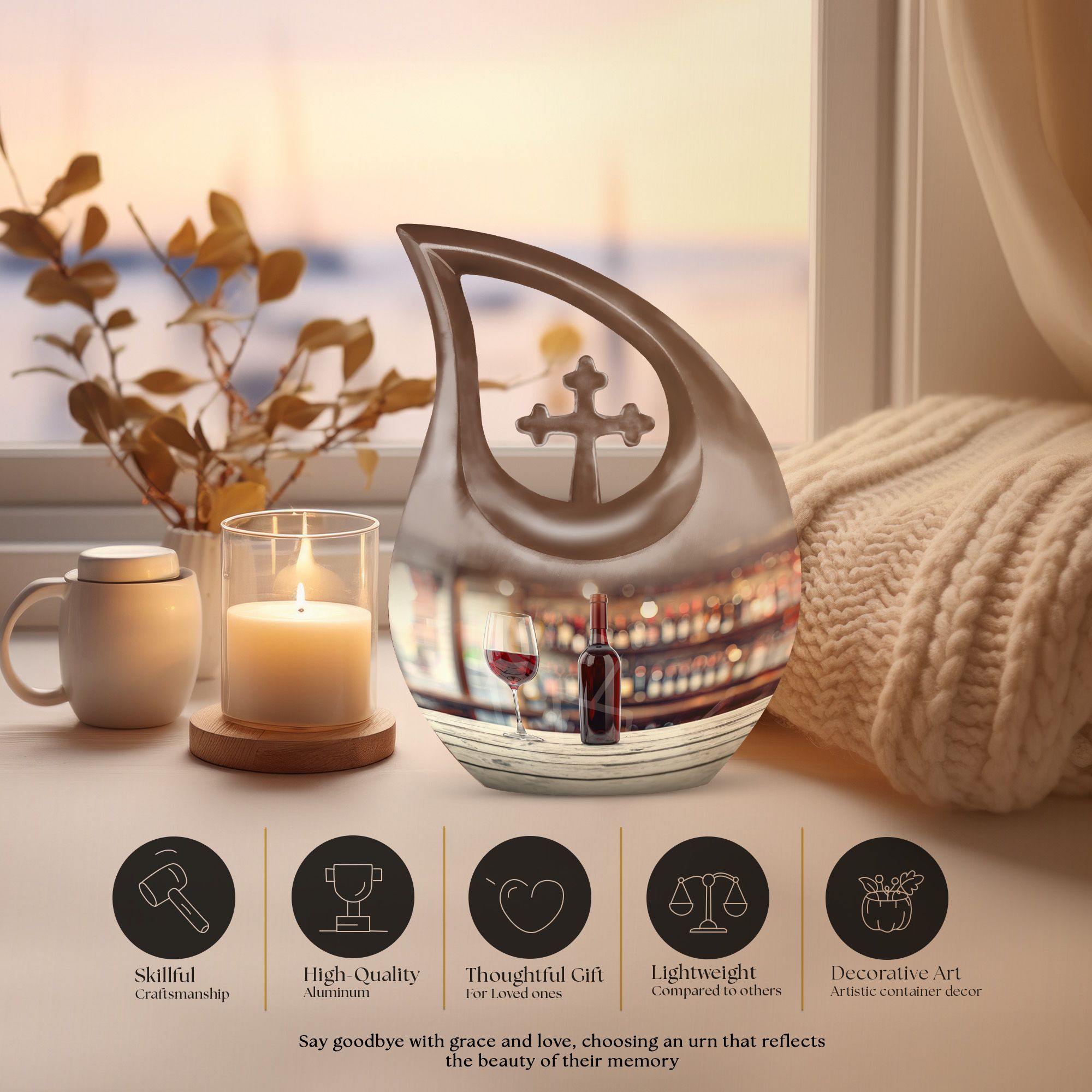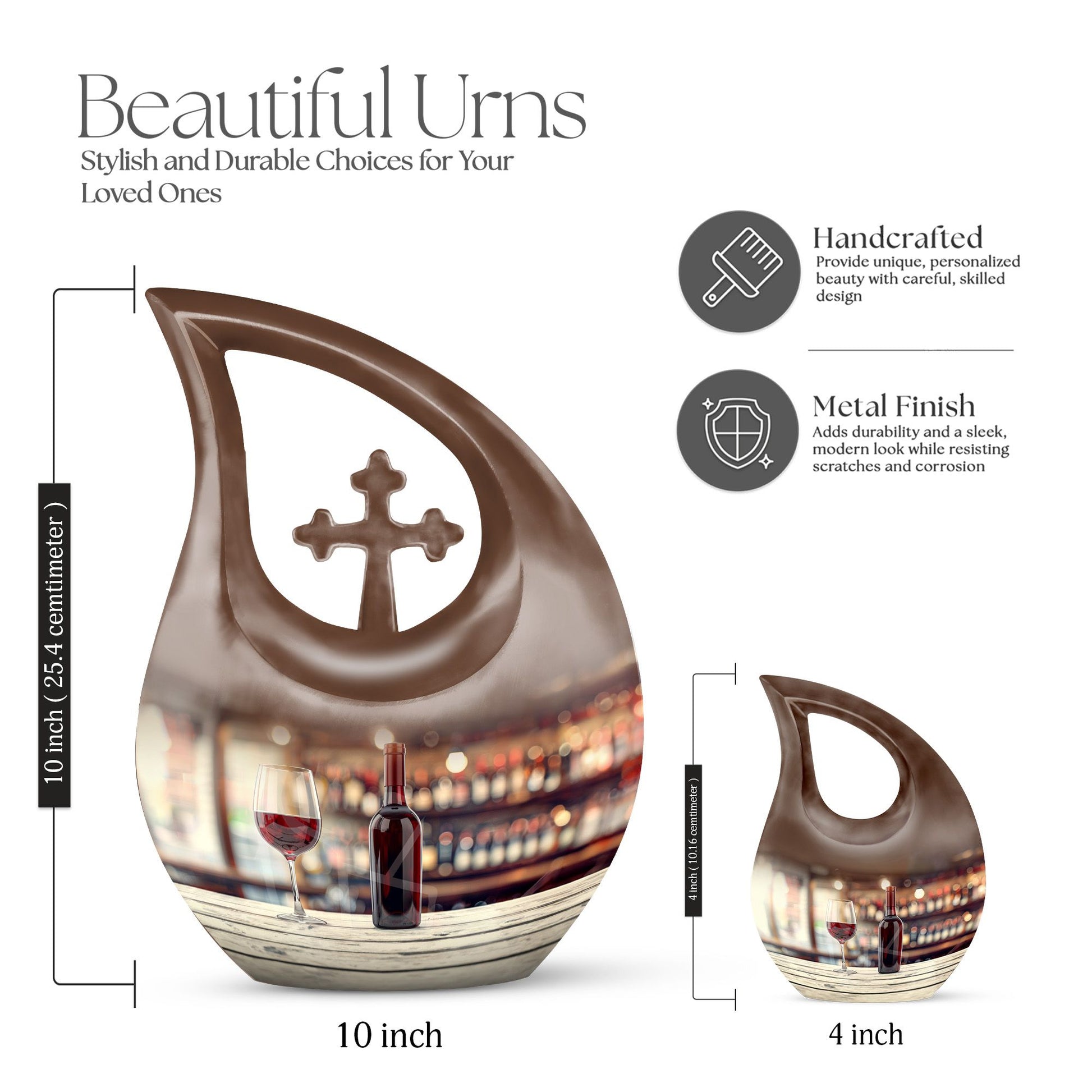 Our enchanting Wine Urn integrates a mesmerizing Cross Drop design, a splendid tribute to your cherished one. Crafted from sturdy and long-lasting Aluminium, this Large Urn measures at 10 inches high, ensuring maximum capacity, around 200 cubic inches. This Wine-colored Small Urn For Human Ashes is more than just a memorial, it's a reflection of unique personality and life. Its considerable weight of 3.3 pounds guarantees its durability, and assurance that it'll seamlessly fit into your memorial corner. Additionally, it includes an elegant velvet pouch for thoughtful containment and respectful handling of the ashes. What makes it even more special is the option to personalize with engraved names, adding a personal touch to this memorial urn. Suitable for both human and cremation ashes, this urn is not just an object but a symbol of love, respect, and remembrance. The incorporation of secular and respected themes like 'Wine' and 'Cross Drop' makes it an obvious choice for those looking to honor their beloved in a dignified manner.