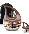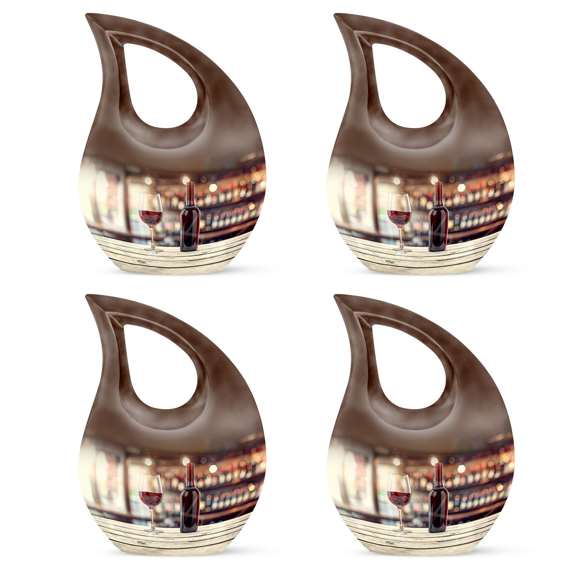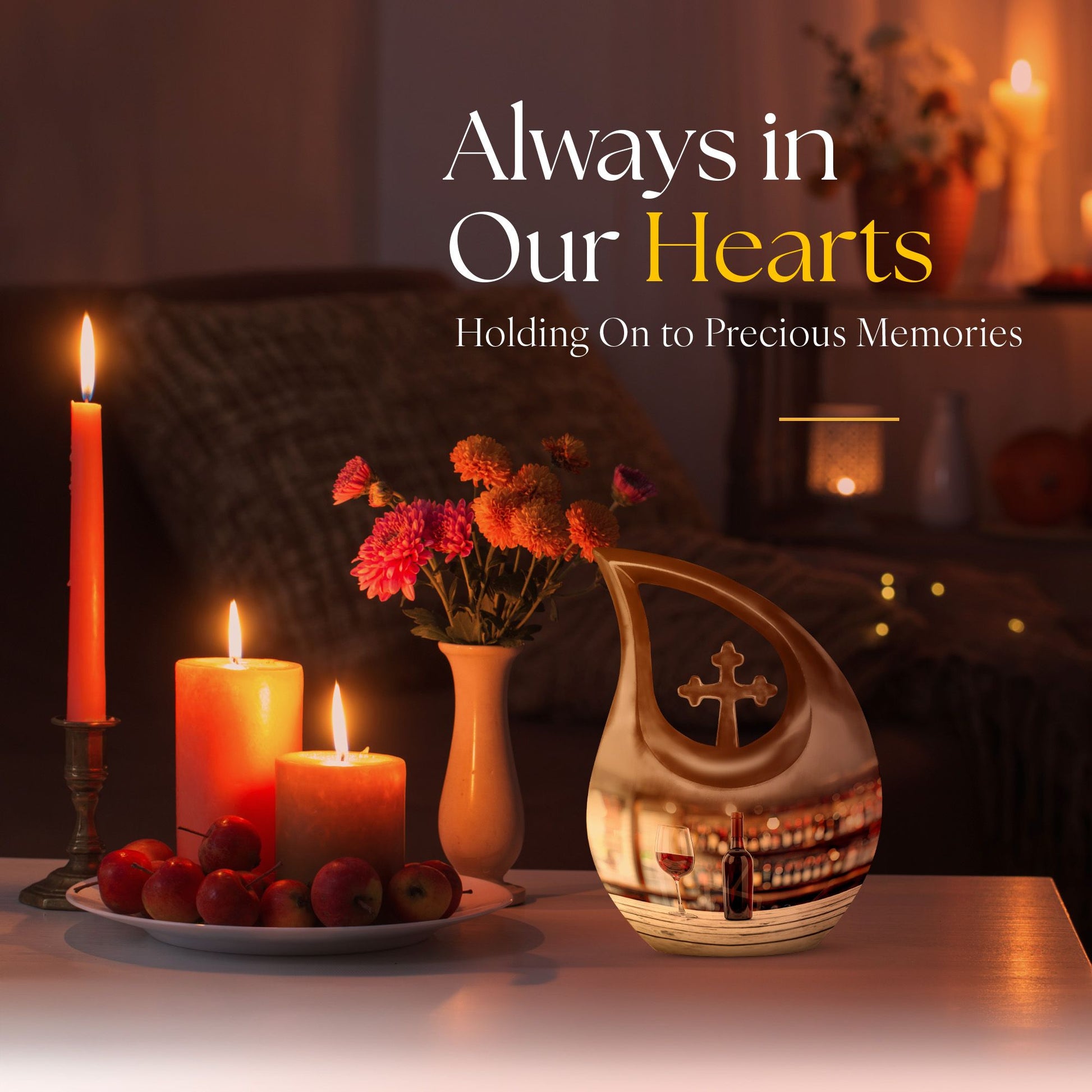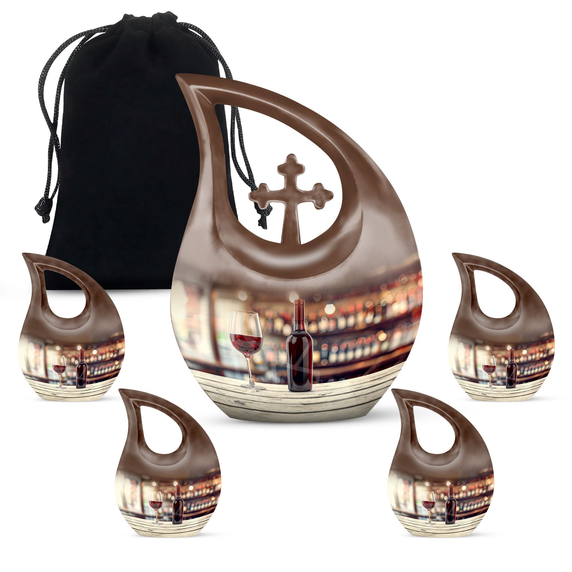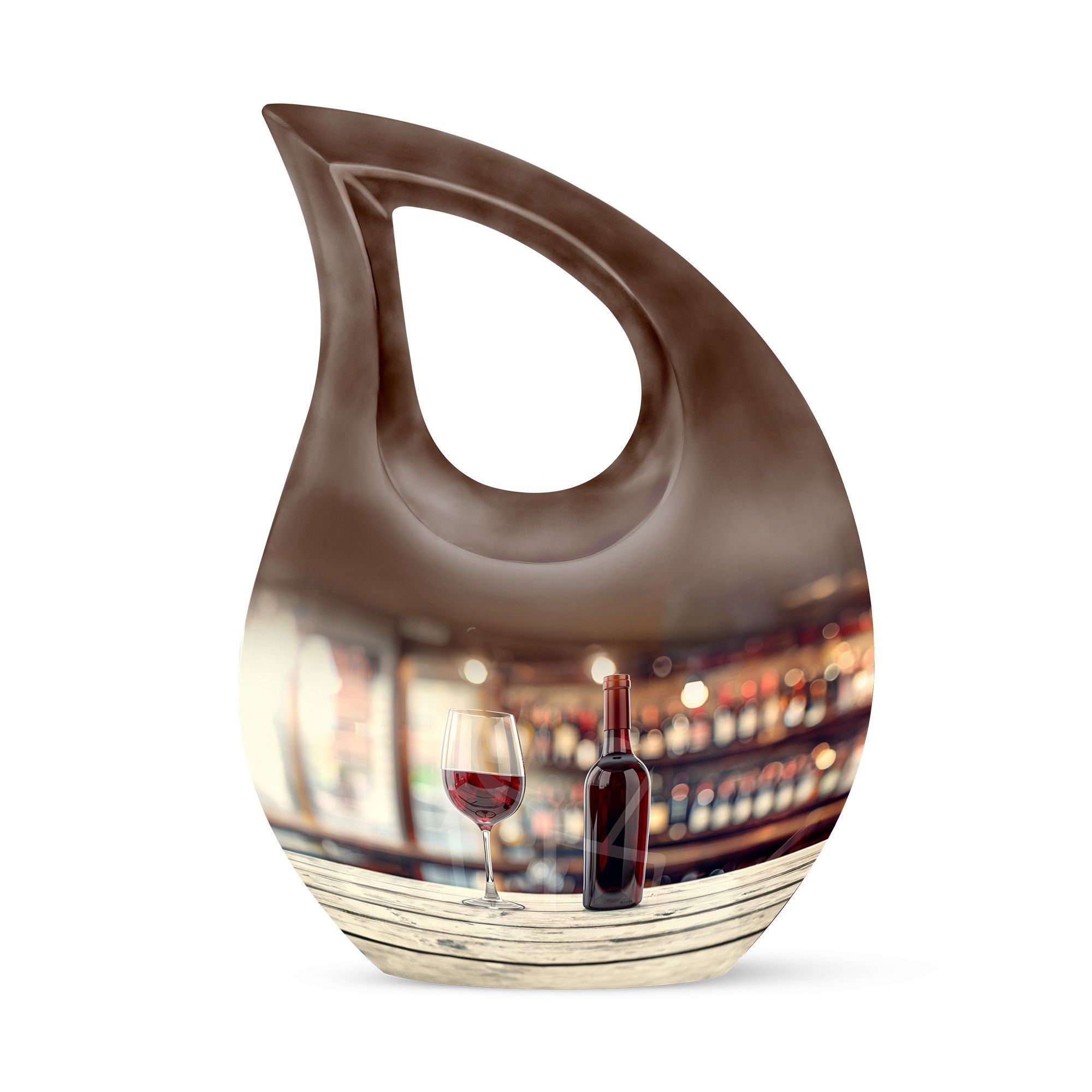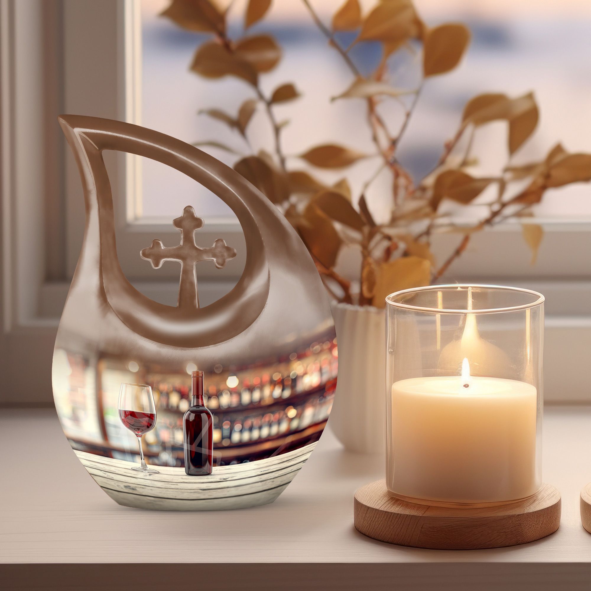Our enchanting Wine Urn integrates a mesmerizing Cross Drop design, a splendid tribute to your cherished one. Crafted from sturdy and long-lasting Aluminium, this Large Urn measures at 10 inches high, ensuring maximum capacity, around 200 cubic inches. This Wine-colored Small Urn For Human Ashes is more than just a memorial, it's a reflection of unique personality and life. Its considerable weight of 3.3 pounds guarantees its durability, and assurance that it'll seamlessly fit into your memorial corner. Additionally, it includes an elegant velvet pouch for thoughtful containment and respectful handling of the ashes. What makes it even more special is the option to personalize with engraved names, adding a personal touch to this memorial urn. Suitable for both human and cremation ashes, this urn is not just an object but a symbol of love, respect, and remembrance. The incorporation of secular and respected themes like 'Wine' and 'Cross Drop' makes it an obvious choice for those looking to honor their beloved in a dignified manner.