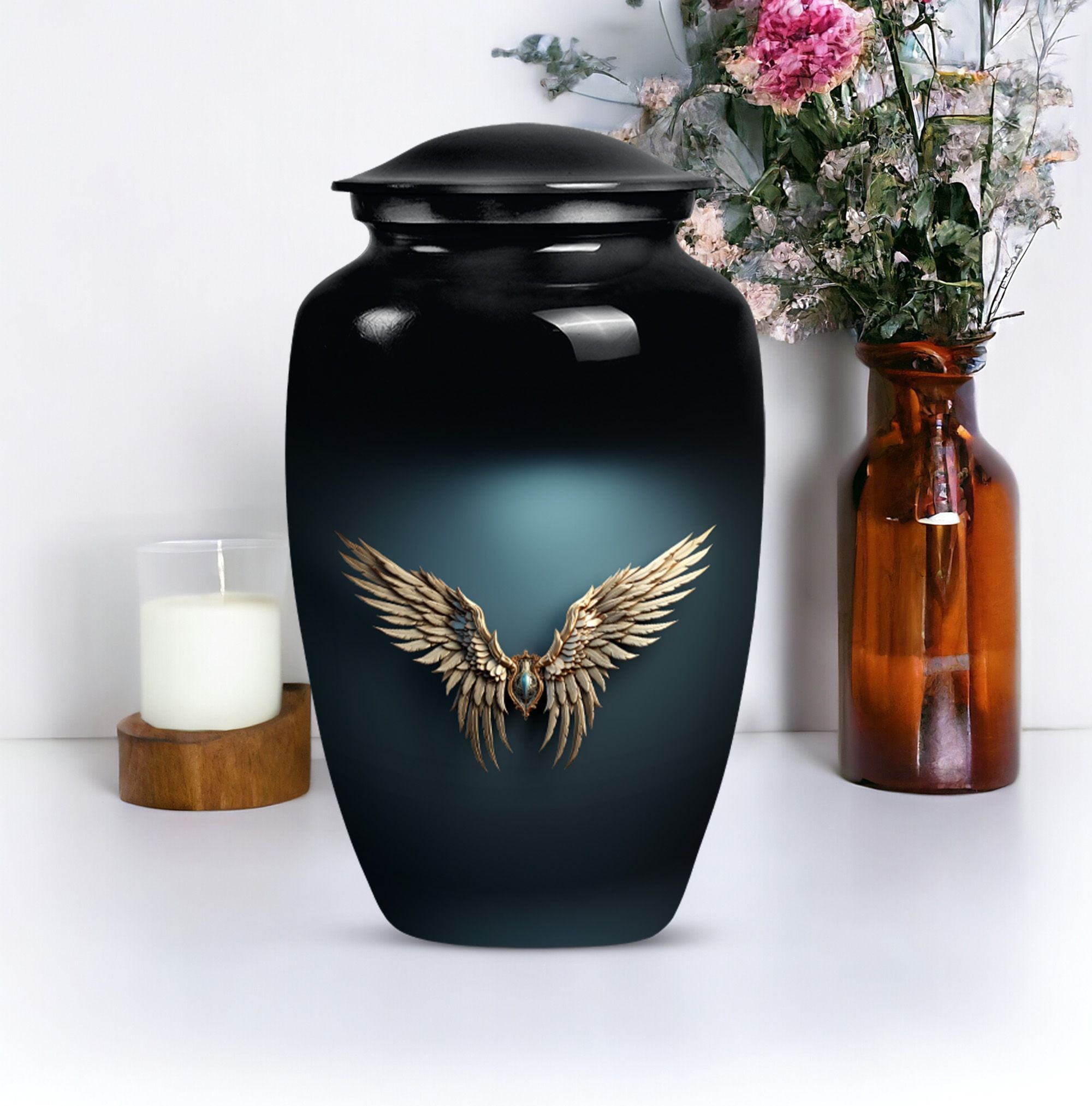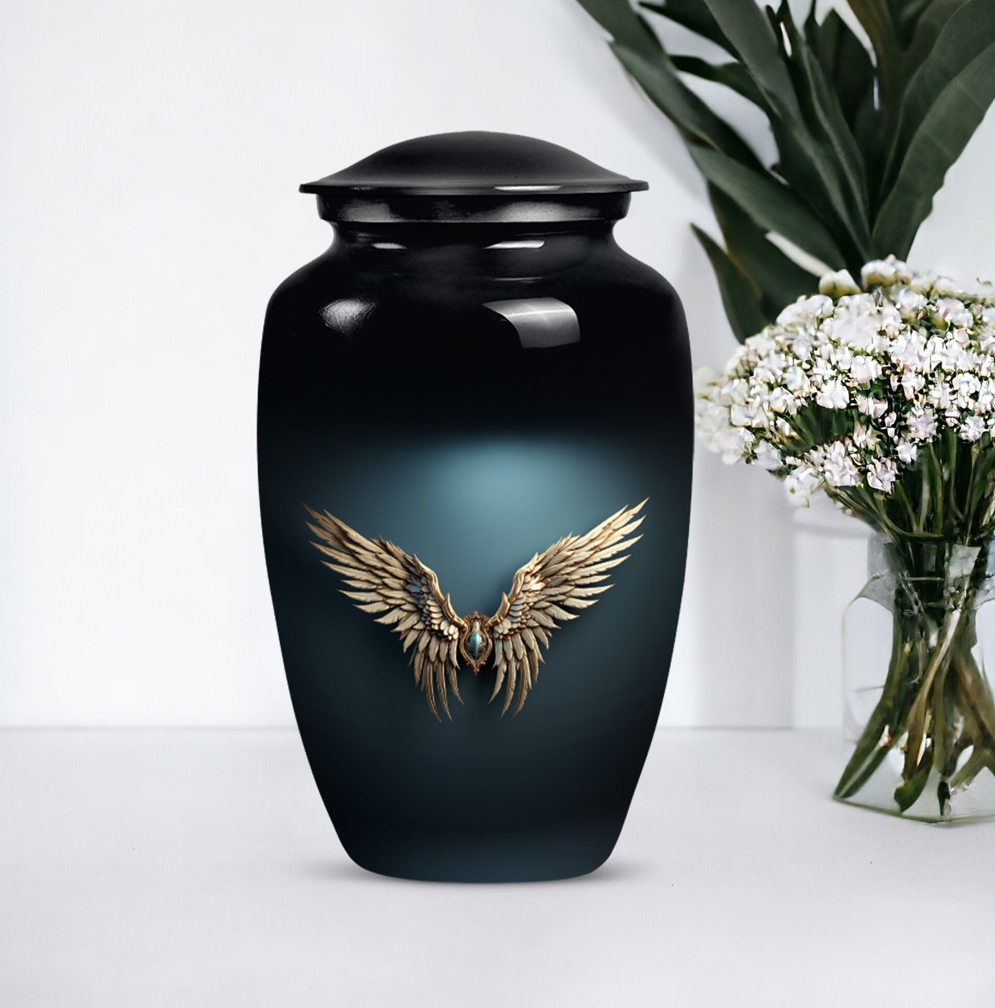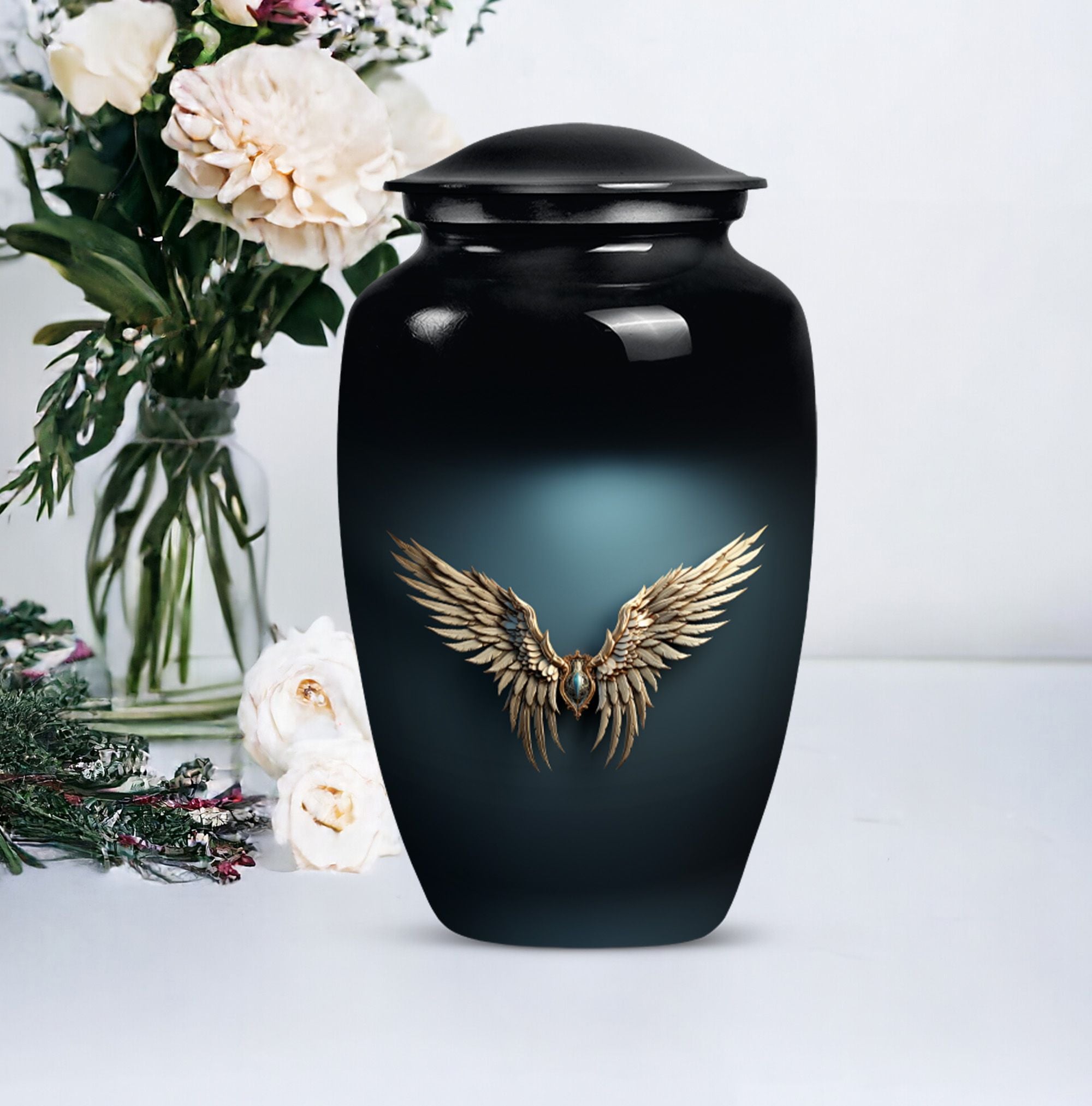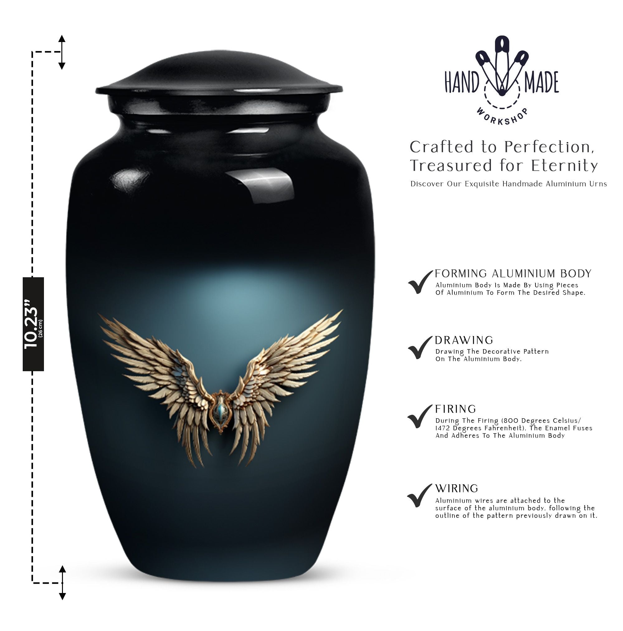 Take comfort during times of grief with this elegantly styled, meticulously crafted Wings Blue Urn, a timeless piece designed for lasting remembrance. With a primary theme of a delicate butterfly, this large urn is enriched with the utmost detail and respect, ensuring your loved one’s memory continues to flutter in your hearts. The burial urn for ashes adult is cast from premium grade aluminium, measuring a considerate 10 inches in height, with a substantial capacity of upto 200 cubic inches. It comes with a tasteful velvet pouch, providing a safe containment for the ashes. What’s more, you can also personalize this memorial urn by adding engraved names, specifically tailored to your tastes. Weighing a modest 3.3 pounds, it’s easy to place and secure in your preferred location. Yet large enough to embody a whole lot of love and memories. Note: Highly searched keywords for this product include 'Memorial adult urns', 'adult burial', 'urns for ashes for adult humans', 'cremation urns for dad'. Not just an urn, but a symbolic piece of art, this is a truly meaningful vessel worthy of preserving precious memories.