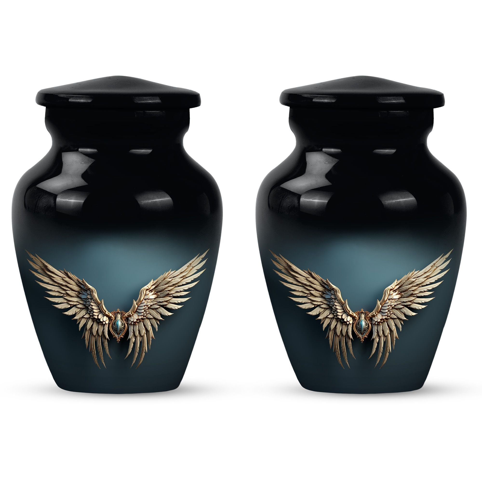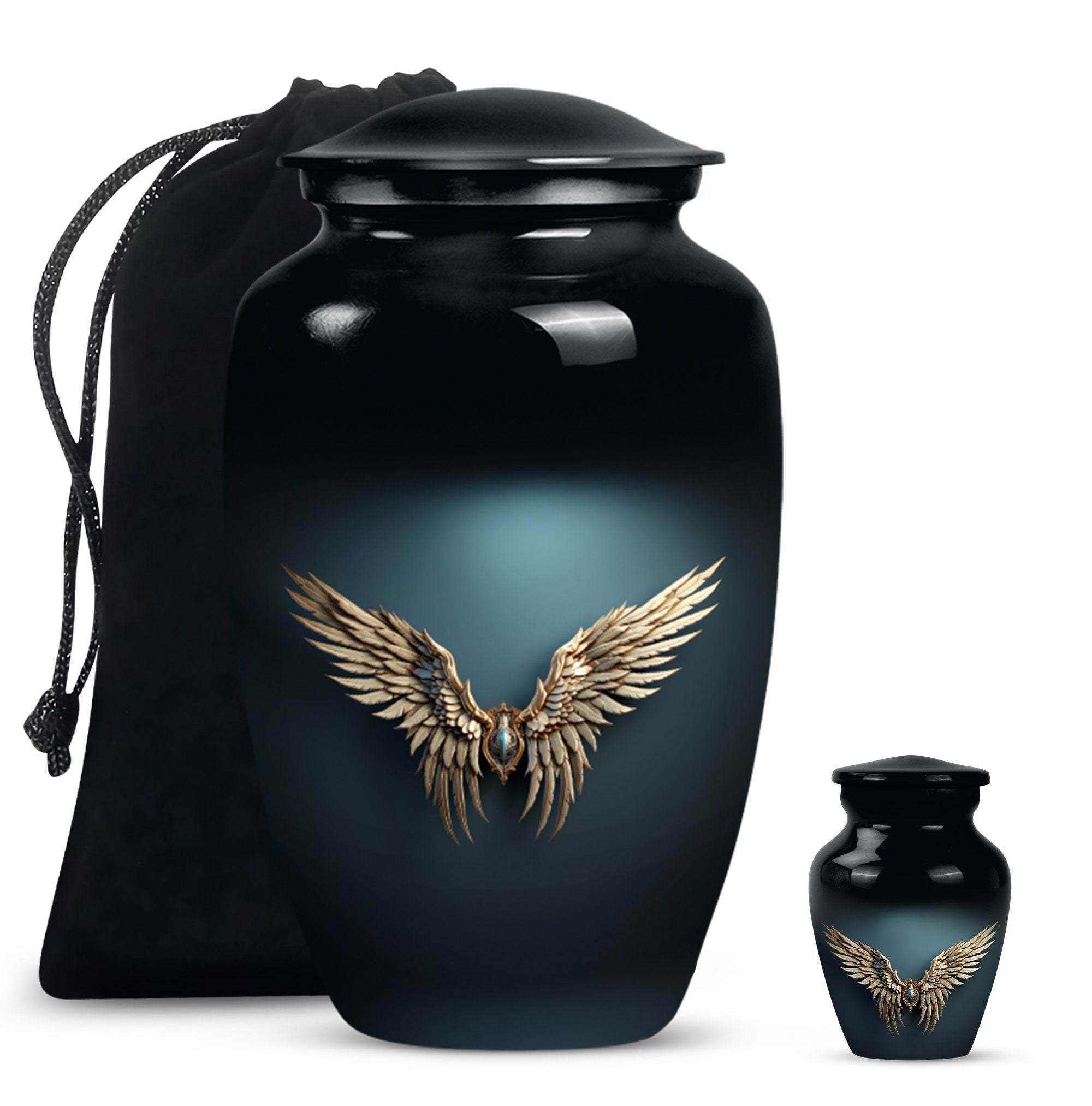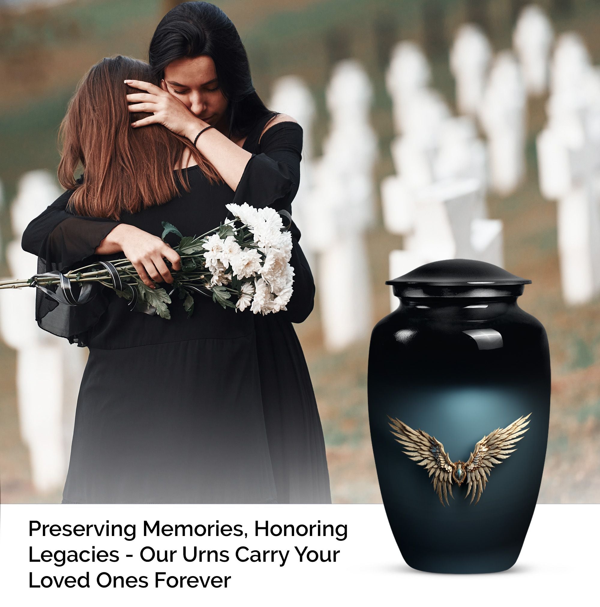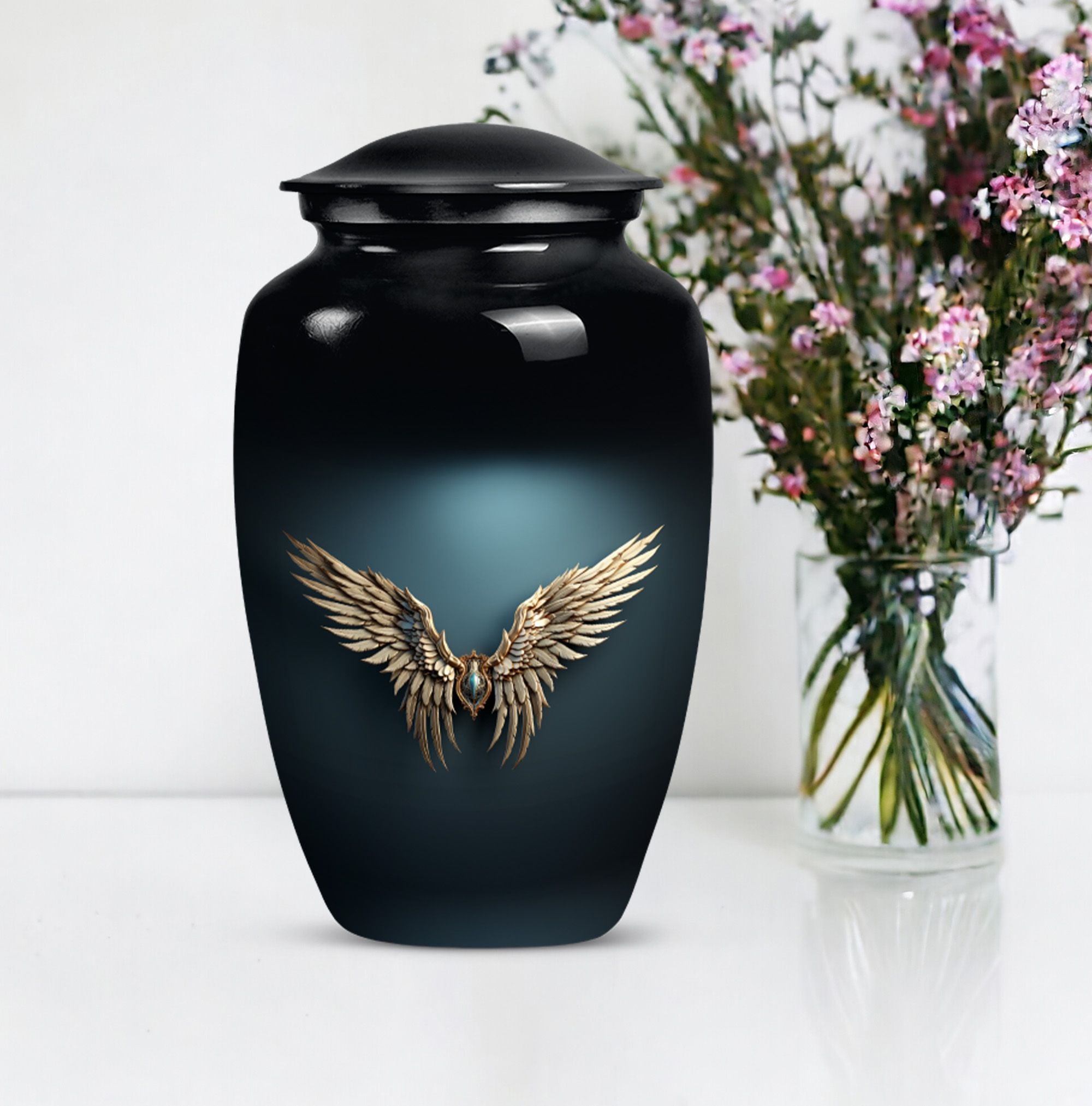 Take comfort during times of grief with this elegantly styled, meticulously crafted Wings Blue Urn, a timeless piece designed for lasting remembrance. With a primary theme of a delicate butterfly, this large urn is enriched with the utmost detail and respect, ensuring your loved one’s memory continues to flutter in your hearts. The burial urn for ashes adult is cast from premium grade aluminium, measuring a considerate 10 inches in height, with a substantial capacity of upto 200 cubic inches. It comes with a tasteful velvet pouch, providing a safe containment for the ashes. What’s more, you can also personalize this memorial urn by adding engraved names, specifically tailored to your tastes. Weighing a modest 3.3 pounds, it’s easy to place and secure in your preferred location. Yet large enough to embody a whole lot of love and memories. Note: Highly searched keywords for this product include 'Memorial adult urns', 'adult burial', 'urns for ashes for adult humans', 'cremation urns for dad'. Not just an urn, but a symbolic piece of art, this is a truly meaningful vessel worthy of preserving precious memories.