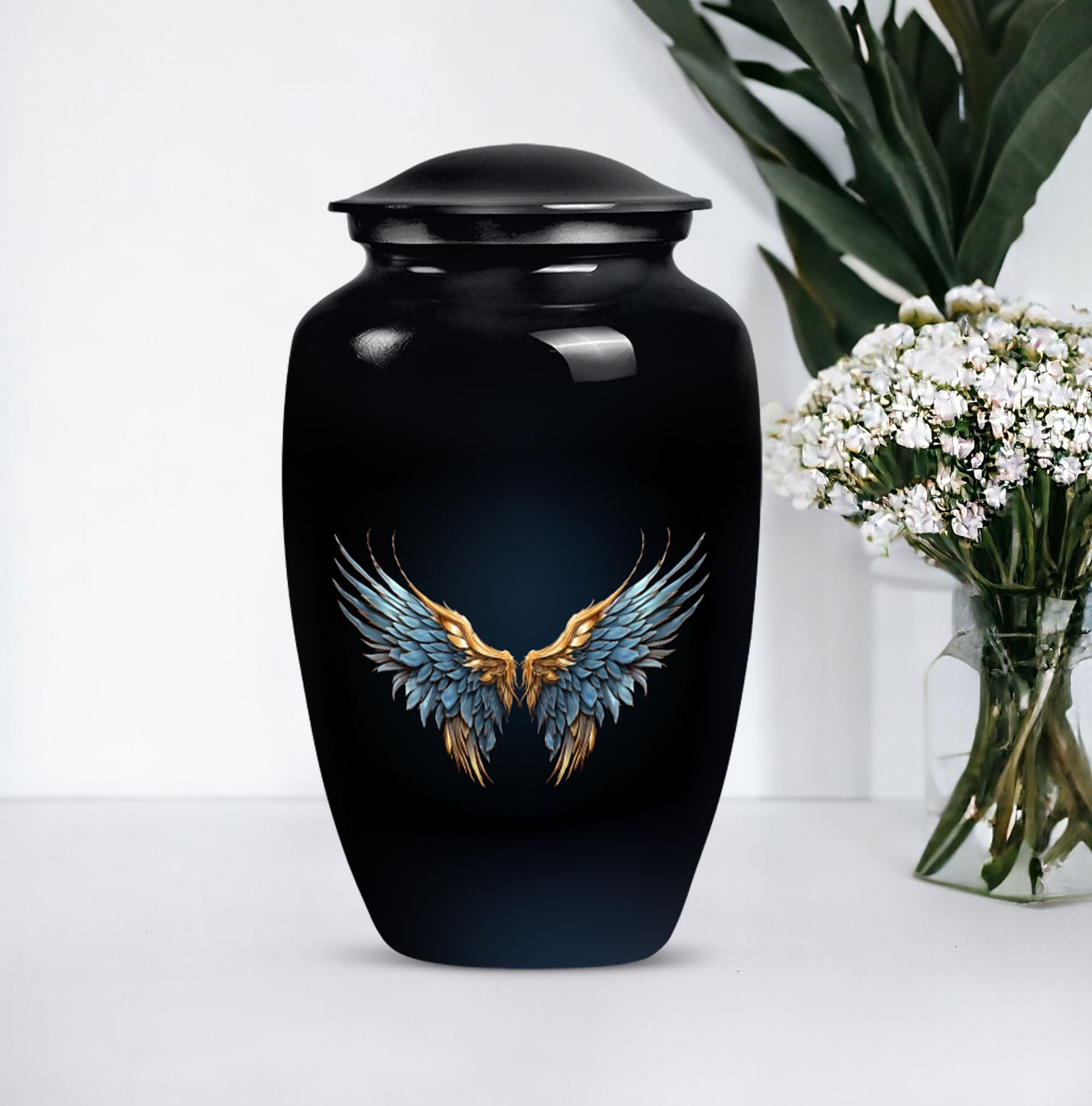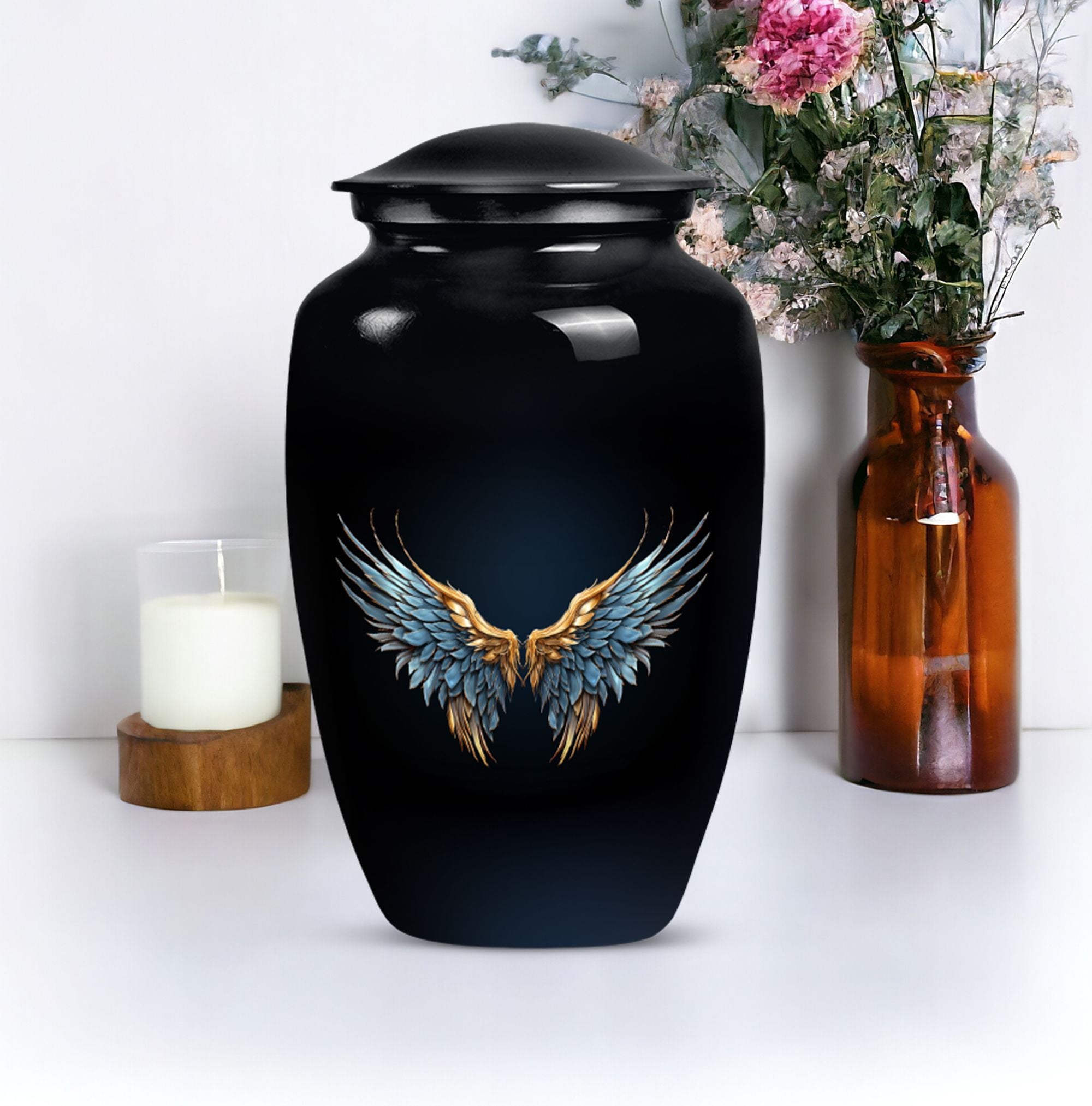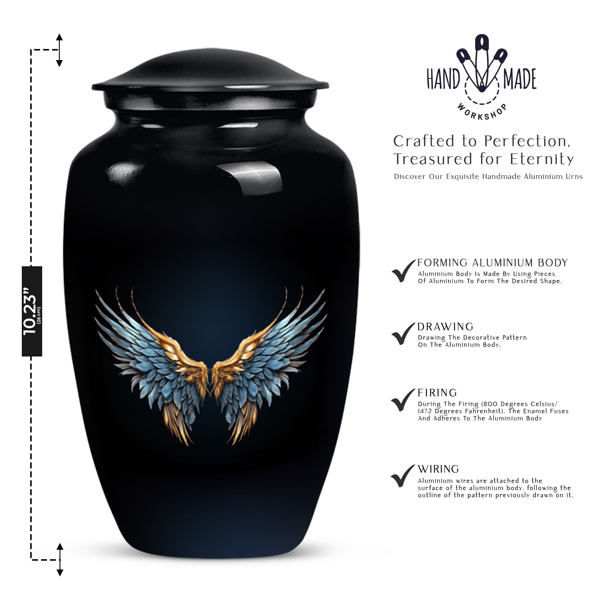 Bring honor and remembrance to your departed loved one with our unique 'Wings Blue Urn'. Not your usual fare, this funeral urn for human ashes combines a classic silhouette with a contemporary twist, showcasing an emblematic butterfly theme. Precision-crafted from high-quality aluminium, each of these large urns offers substantial capacity, holding up to 200 cubic inches of ashes inside. Accentuated by a height of 10 inches, the urn stands out in reverent dignity, weighing a solid 3.3 pounds. Adding a touch of personalized sentiment, the urn can be seamlessly customized with engraved names. Beyond its aesthetical charm, the urn comes encased in a velvet pouch, enhancing both its preservation and portability. Ideal for memorial, cremation burial, or a homely keepsake, our Wings Blue Urn bridges the realms of tradition and tasteful aesthetic, presenting a unique commemorative solution for your cherished memories. This urn perfect blend of style and functionality is likely what you've been searching for in 'cremation urn burial', 'funeral unique urns', and 'memorial medium urns for ashes'.