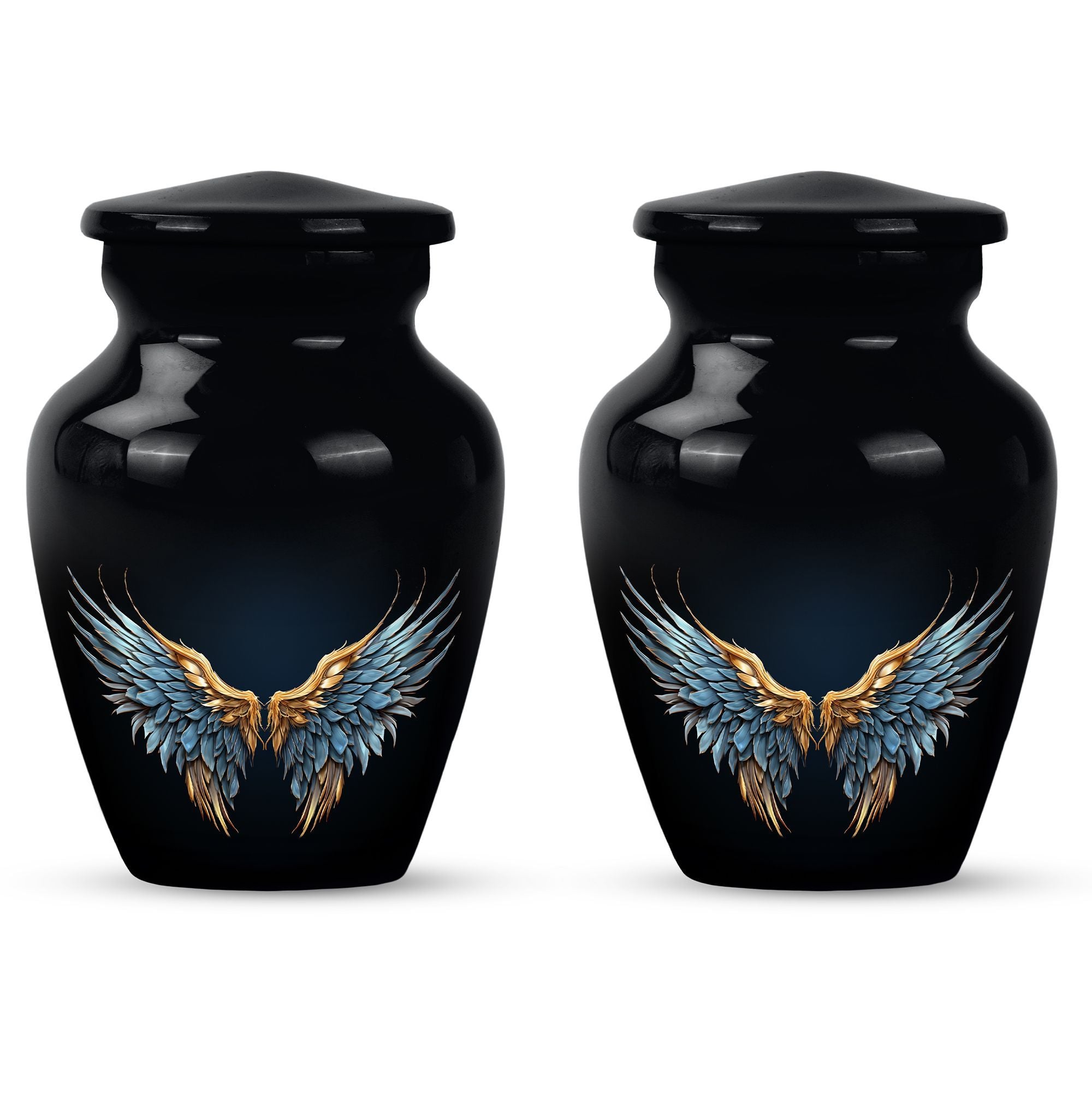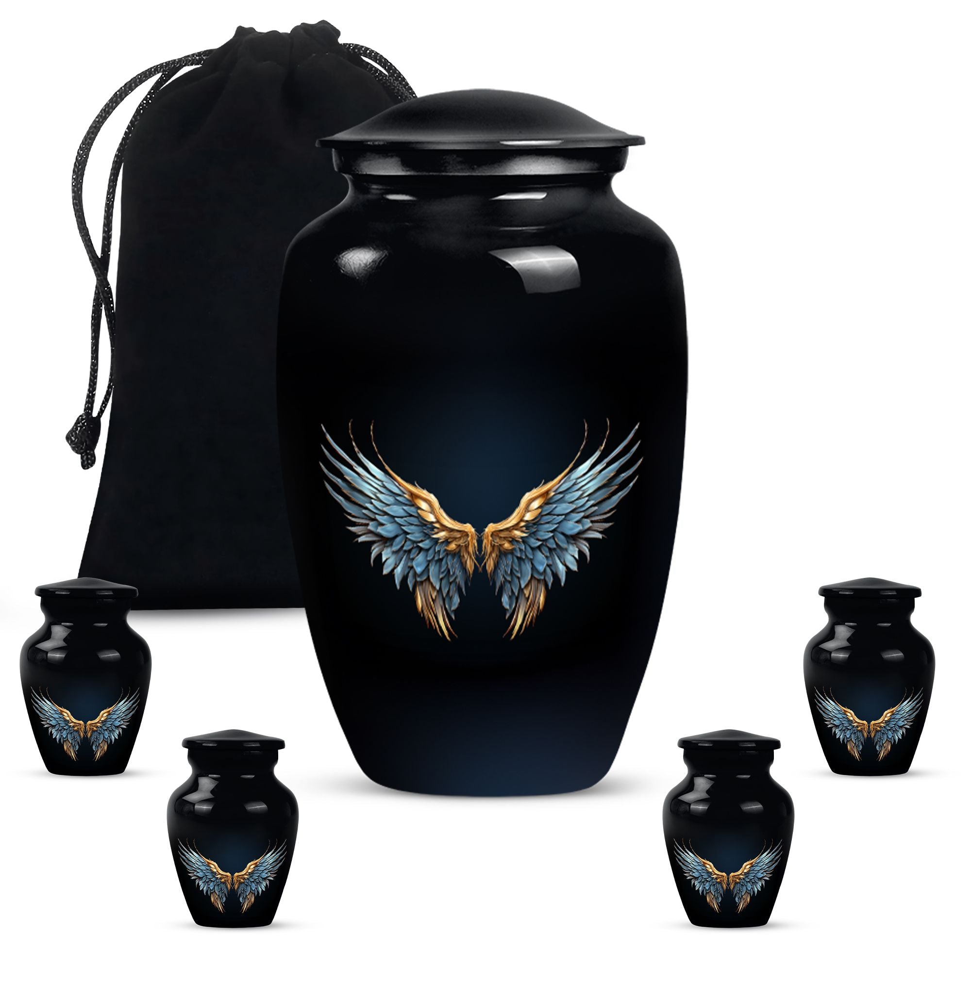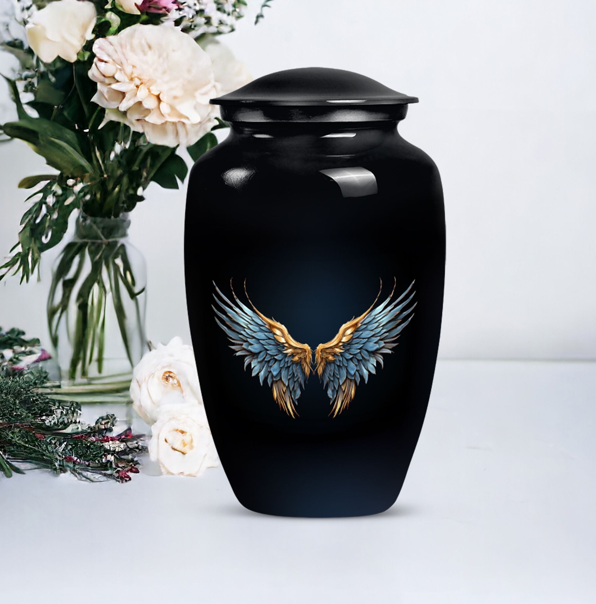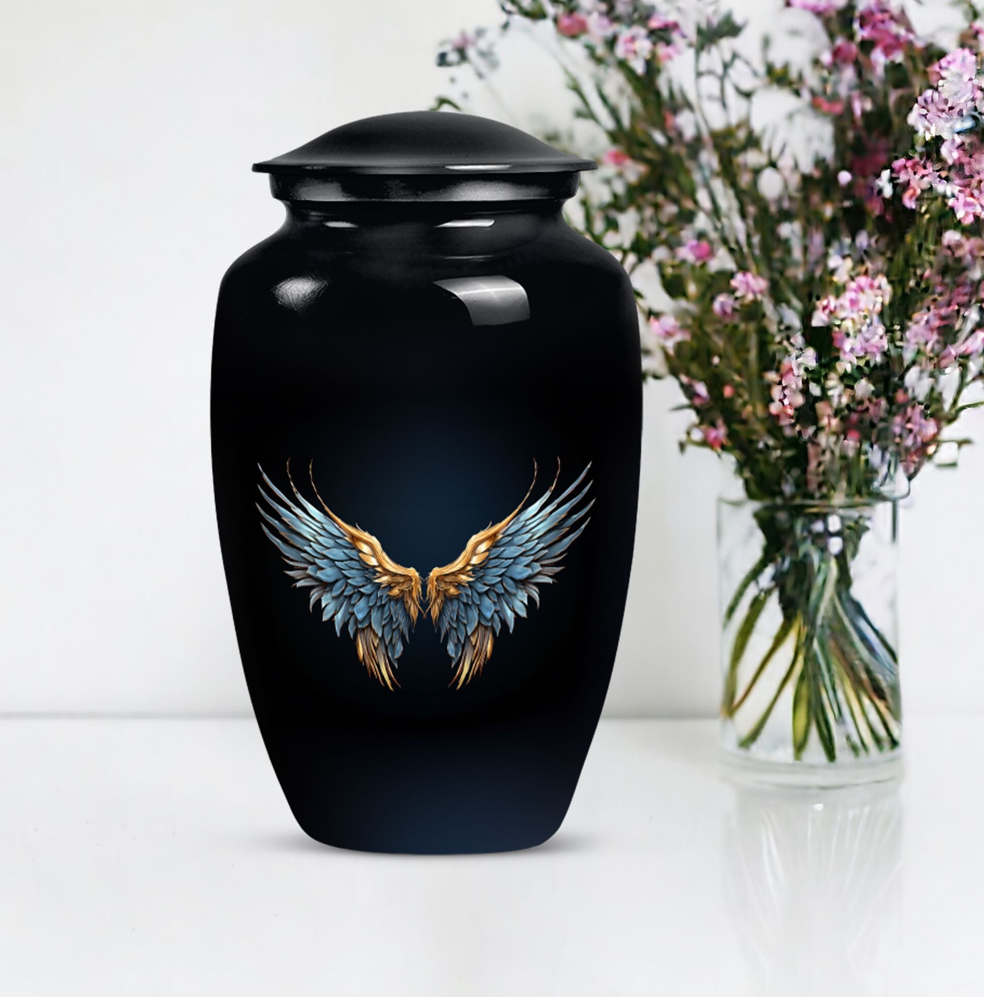 Bring honor and remembrance to your departed loved one with our unique 'Wings Blue Urn'. Not your usual fare, this funeral urn for human ashes combines a classic silhouette with a contemporary twist, showcasing an emblematic butterfly theme. Precision-crafted from high-quality aluminium, each of these large urns offers substantial capacity, holding up to 200 cubic inches of ashes inside. Accentuated by a height of 10 inches, the urn stands out in reverent dignity, weighing a solid 3.3 pounds. Adding a touch of personalized sentiment, the urn can be seamlessly customized with engraved names. Beyond its aesthetical charm, the urn comes encased in a velvet pouch, enhancing both its preservation and portability. Ideal for memorial, cremation burial, or a homely keepsake, our Wings Blue Urn bridges the realms of tradition and tasteful aesthetic, presenting a unique commemorative solution for your cherished memories. This urn perfect blend of style and functionality is likely what you've been searching for in 'cremation urn burial', 'funeral unique urns', and 'memorial medium urns for ashes'.