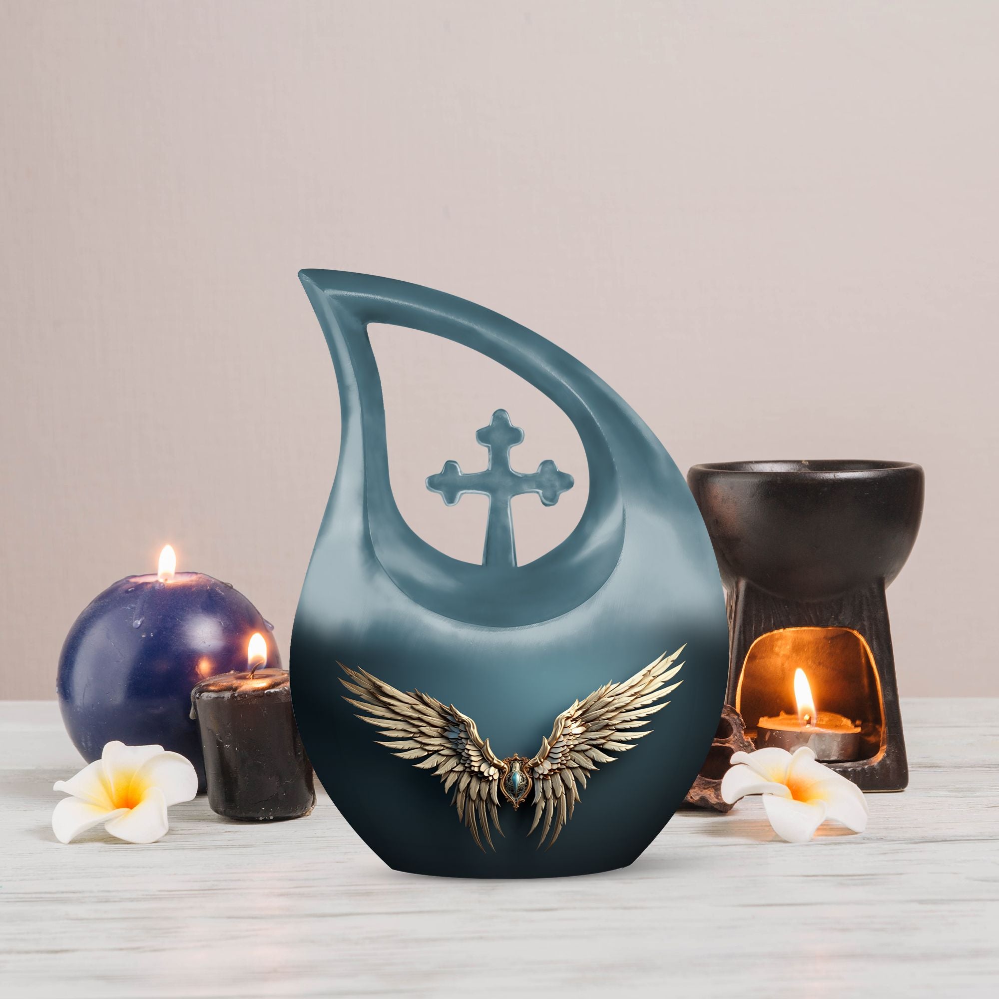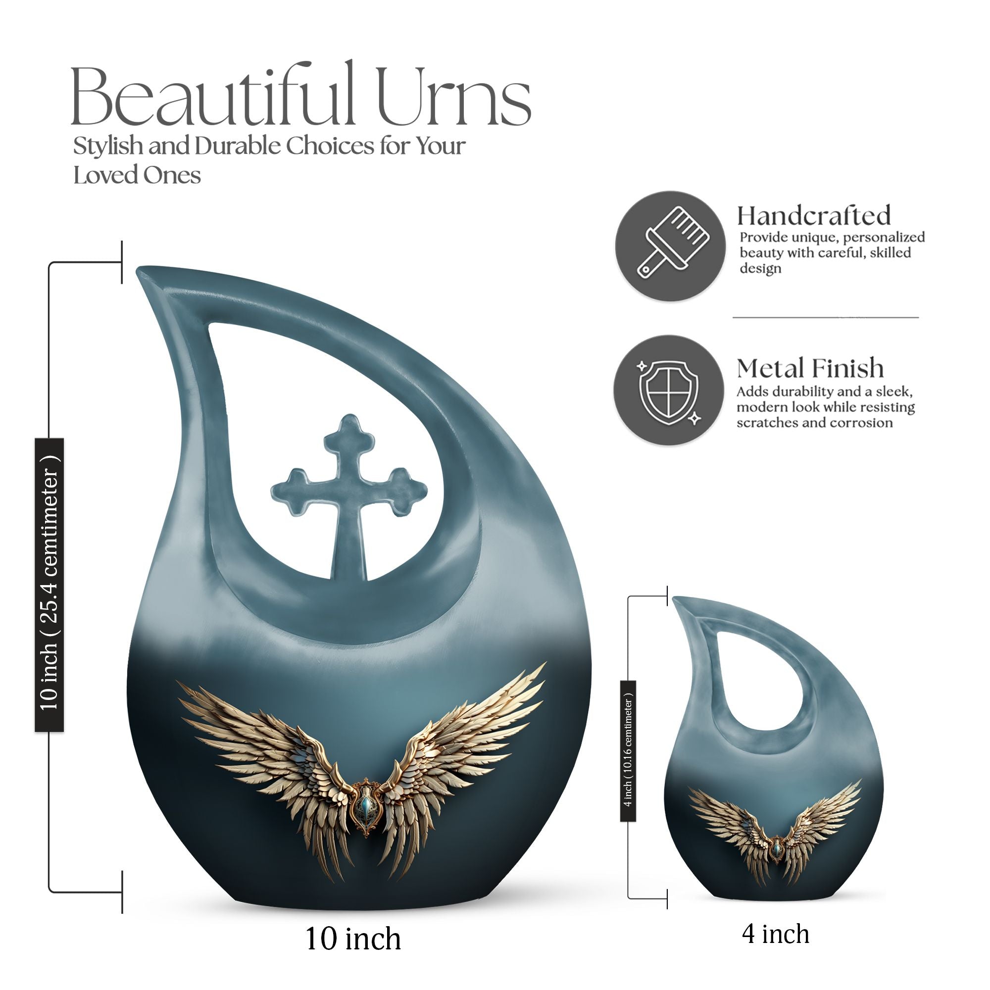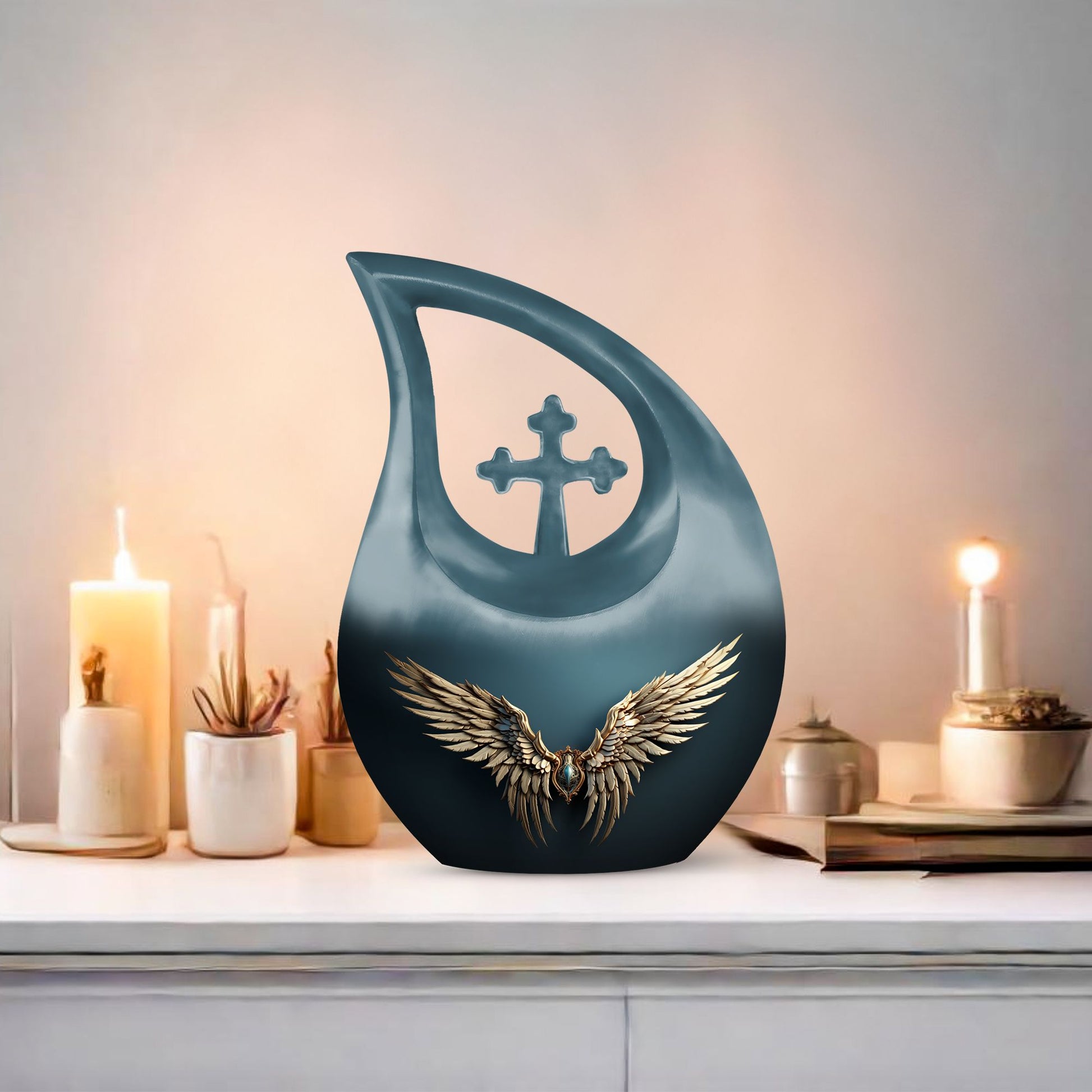 Honor the memory of your departed loved ones with our 'Wings Blue Urn'. This Large Urn, especially crafted for adults and seniors, offers a touching tribute with its unique Cross Drop design. Cast in high-grade Aluminium, it stands 10 inches high and weighs 3.3 pounds, symbolizing durability and permanence. This 'Double Urn' is capacious enough, providing 200 cubic inches of space, adequately accommodating the ashes. The noteworthy memorial urn comes with a hint of personal touch, offering the unique feature of customized engraving of names, making it distinctively yours. And yes, it comes well-packaged in a velvet pouch to contain the precious remnants. So if you are considering 'Funeral Options' or looking for 'Urns For Cremated Remains', consider our 'Beautiful Urns' and 'Outdoor Urns', specifically designed to keep the memories alive. Search for 'Wings Blue Urn' or 'memorial urns' to make your purchase today.