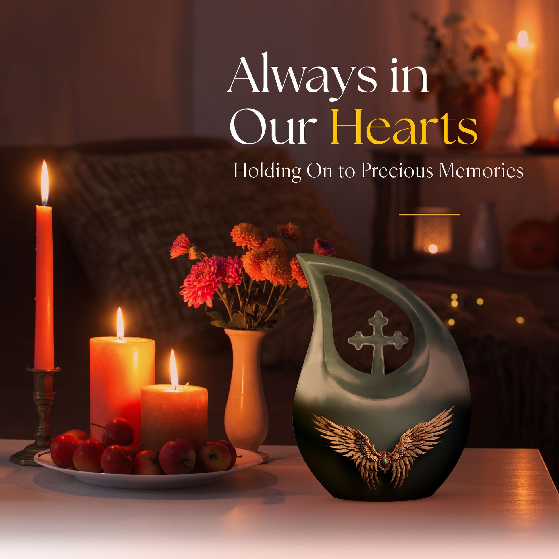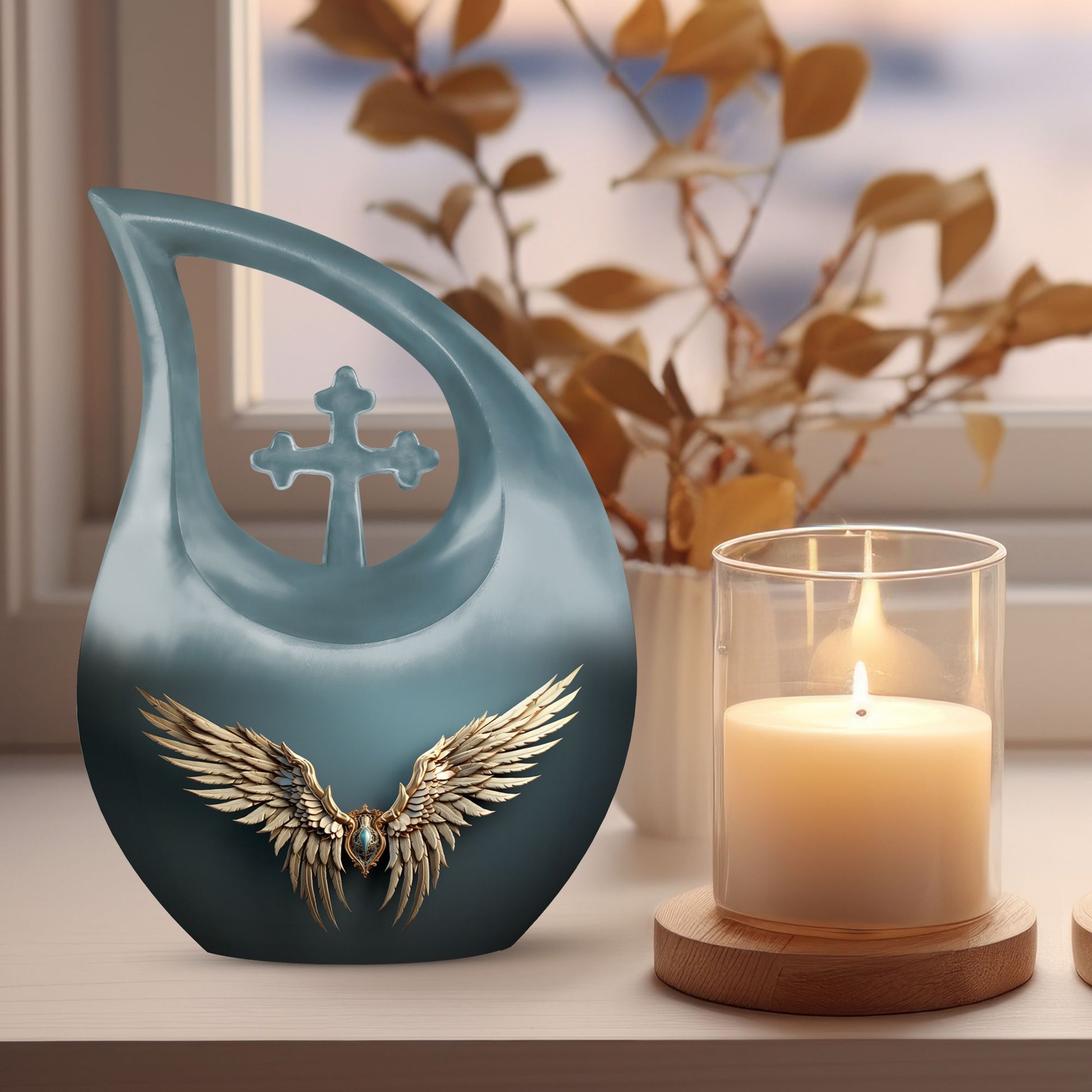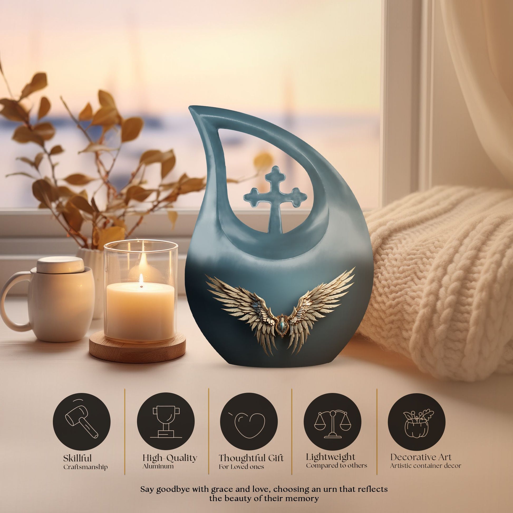 Honor the memory of your departed loved ones with our 'Wings Blue Urn'. This Large Urn, especially crafted for adults and seniors, offers a touching tribute with its unique Cross Drop design. Cast in high-grade Aluminium, it stands 10 inches high and weighs 3.3 pounds, symbolizing durability and permanence. This 'Double Urn' is capacious enough, providing 200 cubic inches of space, adequately accommodating the ashes. The noteworthy memorial urn comes with a hint of personal touch, offering the unique feature of customized engraving of names, making it distinctively yours. And yes, it comes well-packaged in a velvet pouch to contain the precious remnants. So if you are considering 'Funeral Options' or looking for 'Urns For Cremated Remains', consider our 'Beautiful Urns' and 'Outdoor Urns', specifically designed to keep the memories alive. Search for 'Wings Blue Urn' or 'memorial urns' to make your purchase today.