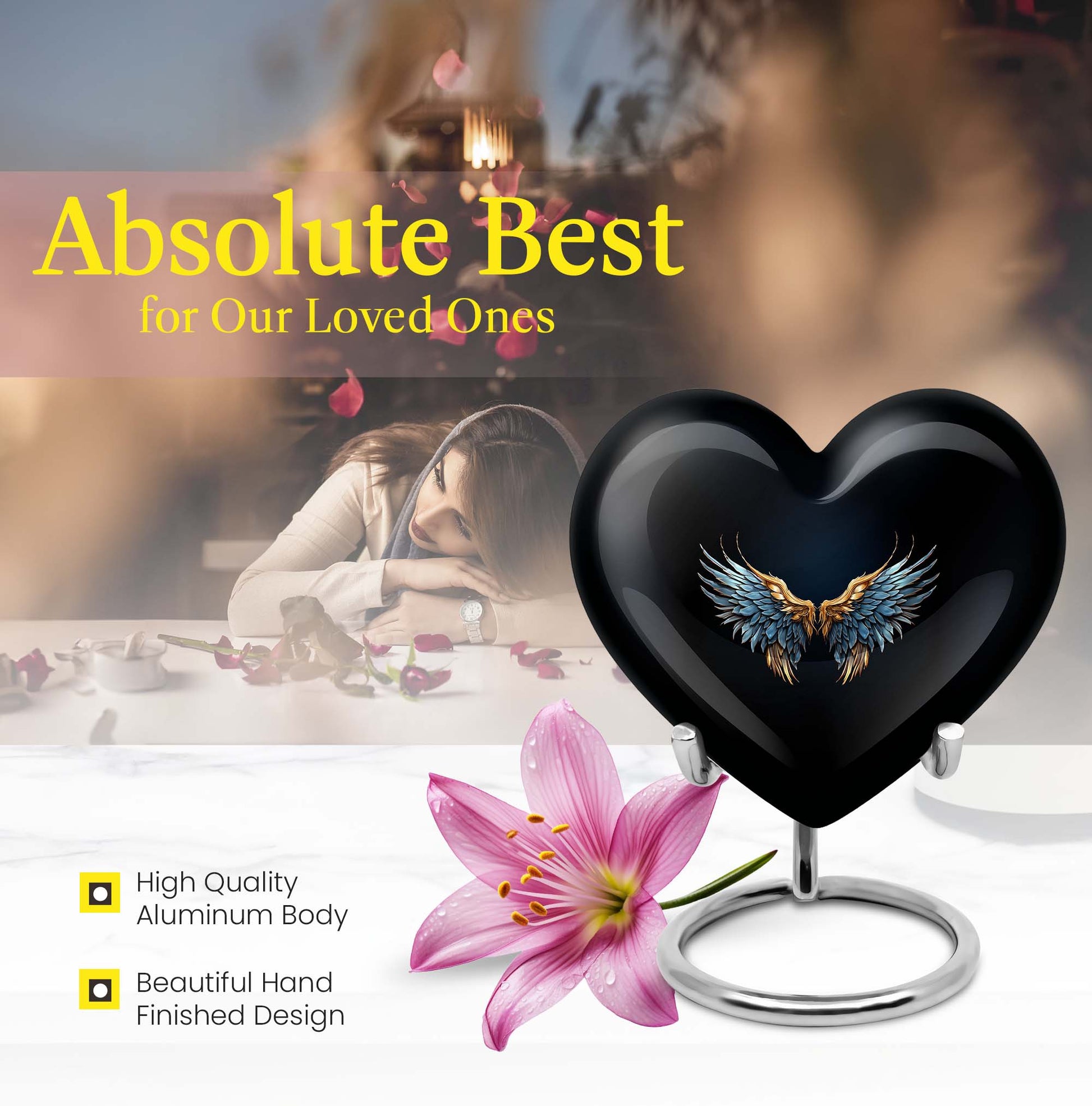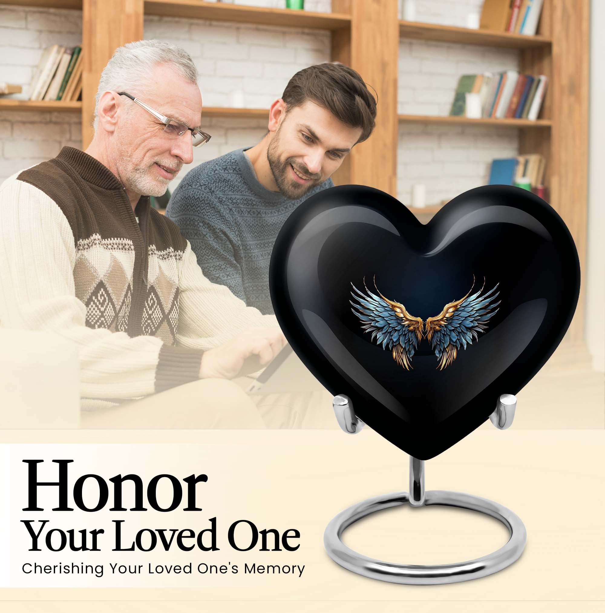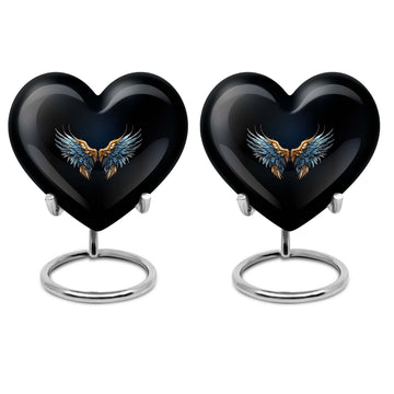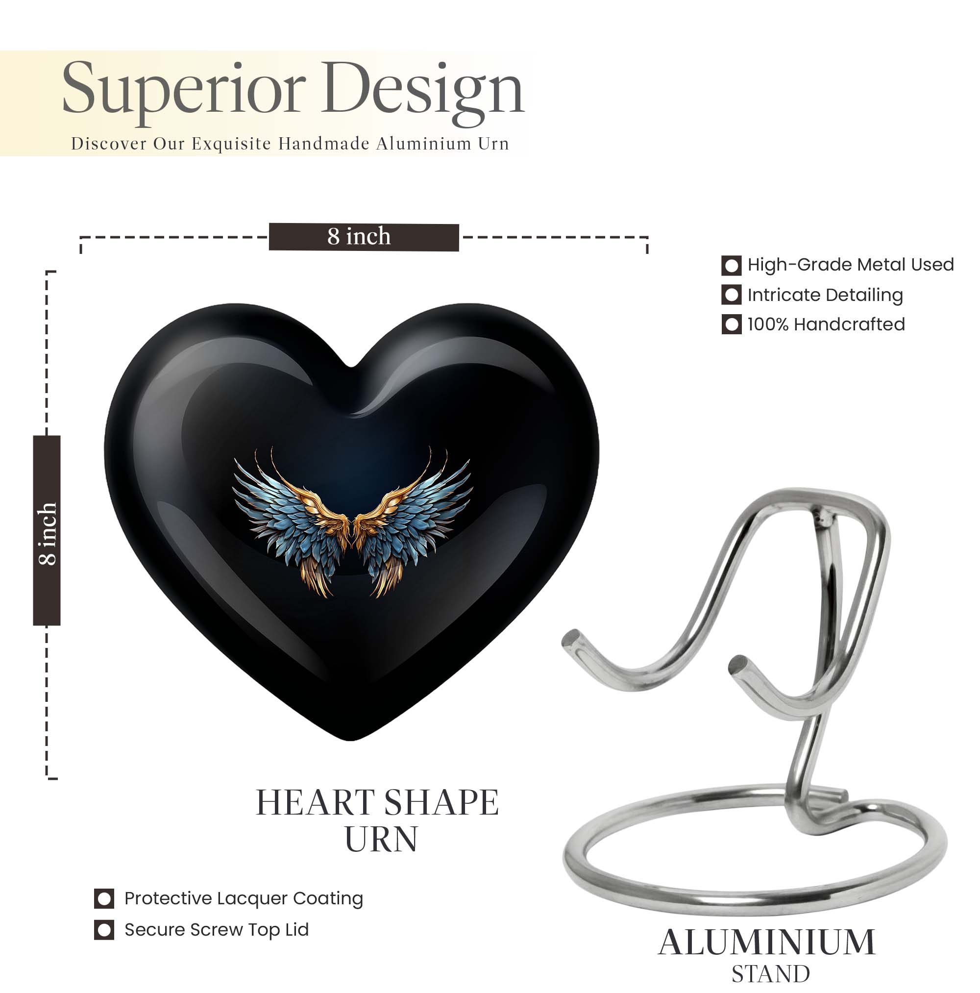 Discover an extraordinary way to cherish loved ones with this unique Wings Blue Urn. Skillfully crafted from high-quality Aluminium, this 10-inch large urn speaks volumes about the love and respect you hold for the departed. The Heart urn theme harmoniously unites the strength of love with a delicate Butterfly theme, offering a symbol of transformation and rebirth. With a remarkable capacity of 200 cubic inches, it serves as a dignified vessel for cremation ashes. Ensuring complete care and respect, the package includes a velvet pouch perfect for containment of ashes. Additionally, the weight of 3.3 pounds gives it a substantial and reassuring presence. For an unforgettable finishing touch, we offer personalization with engraved names, making this more than just a cremation urn but a unique memory keeper. Cease your search for 'funeral unique urns for human ashes' and choose this splendid memorial medium urn to celebrate a life splendidly lived.