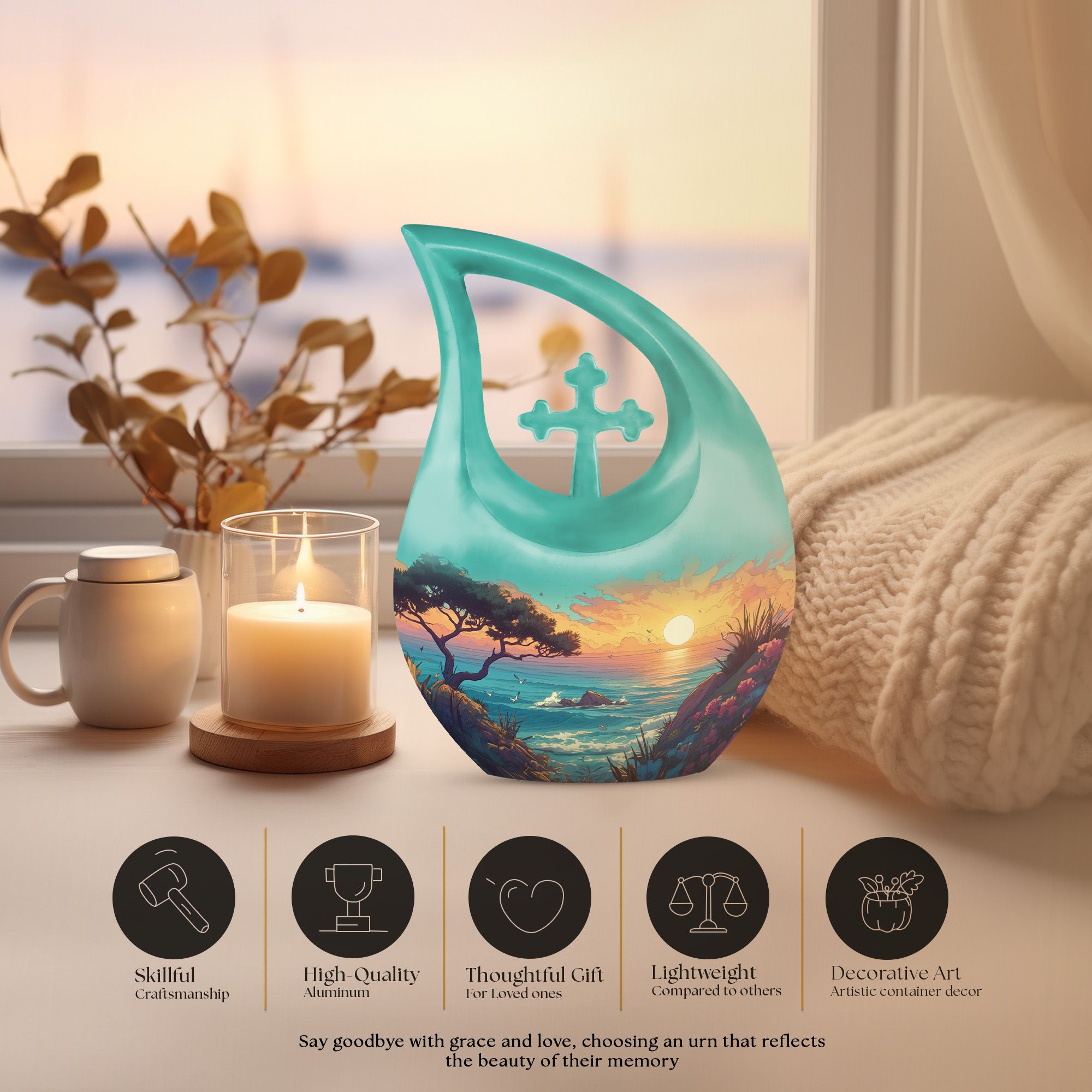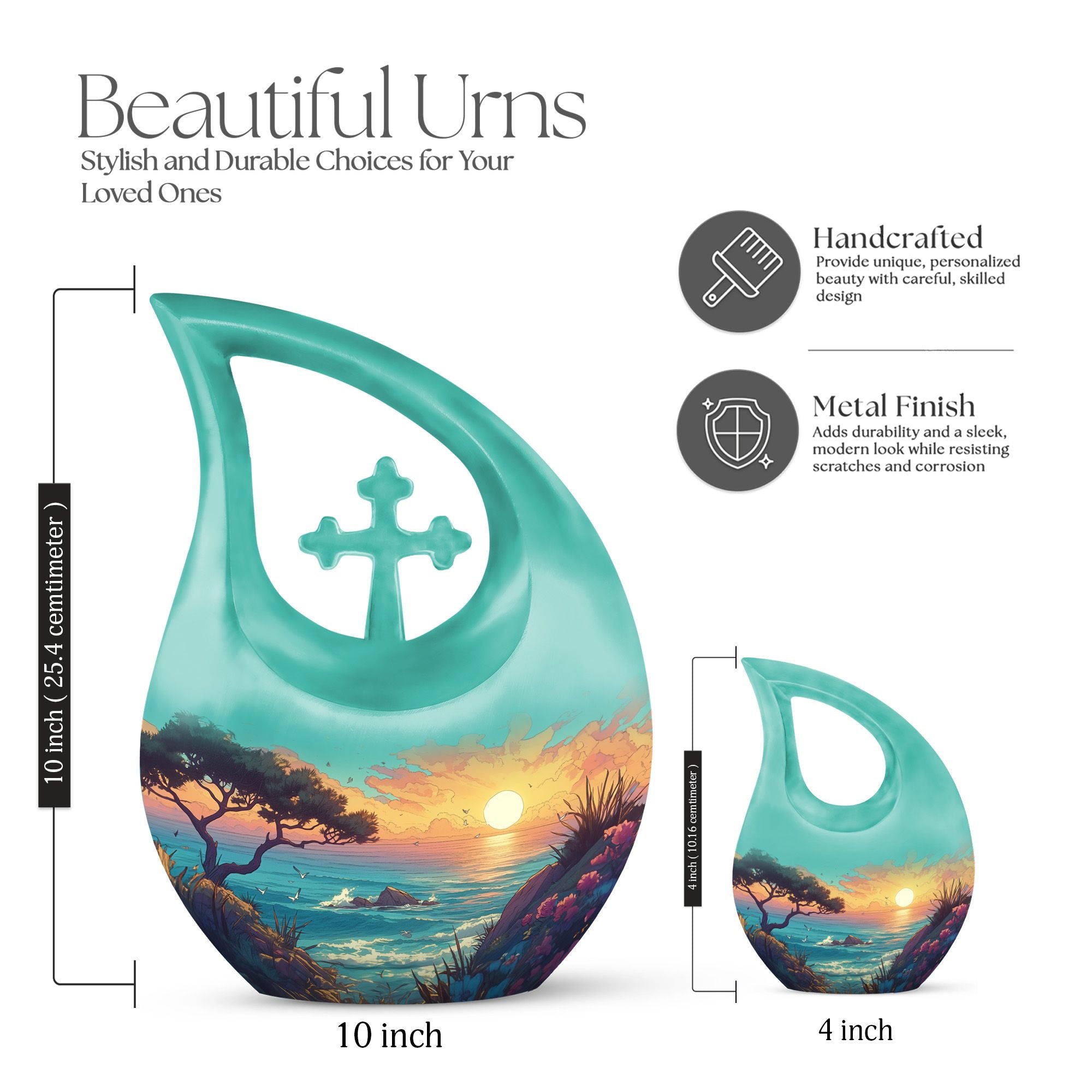 Each adult burial urn in this collection is crafted from durable aluminium, featuring a serene beach scene that evokes calm and everlasting memory. The cremation urn for ashes includes a large 10 inch urn and matching cremation keepsakes for ashes, ideal for sharing remains among family members. The craftsmanship ensures long-lasting beauty, while the secure screw-top lid provides peace of mind.