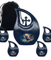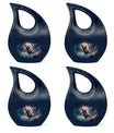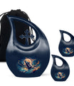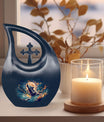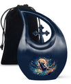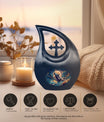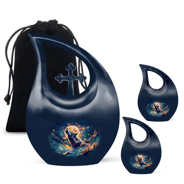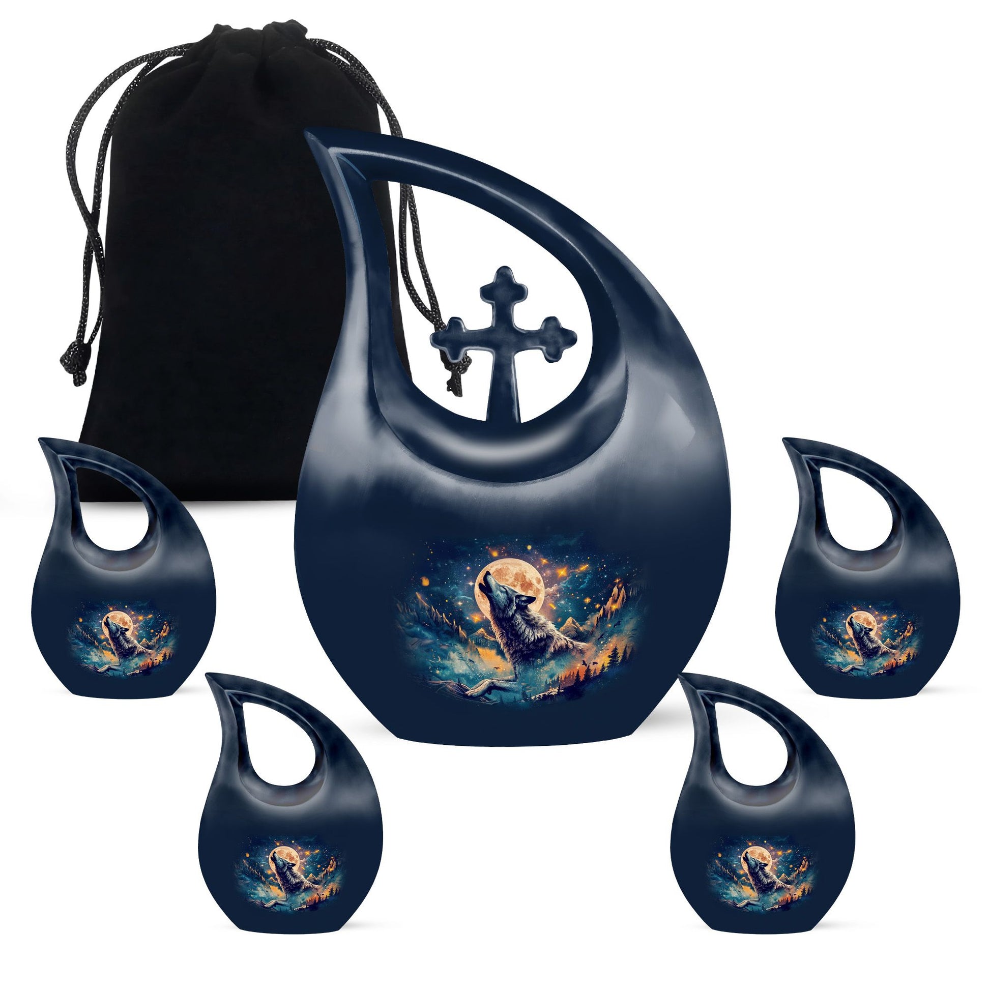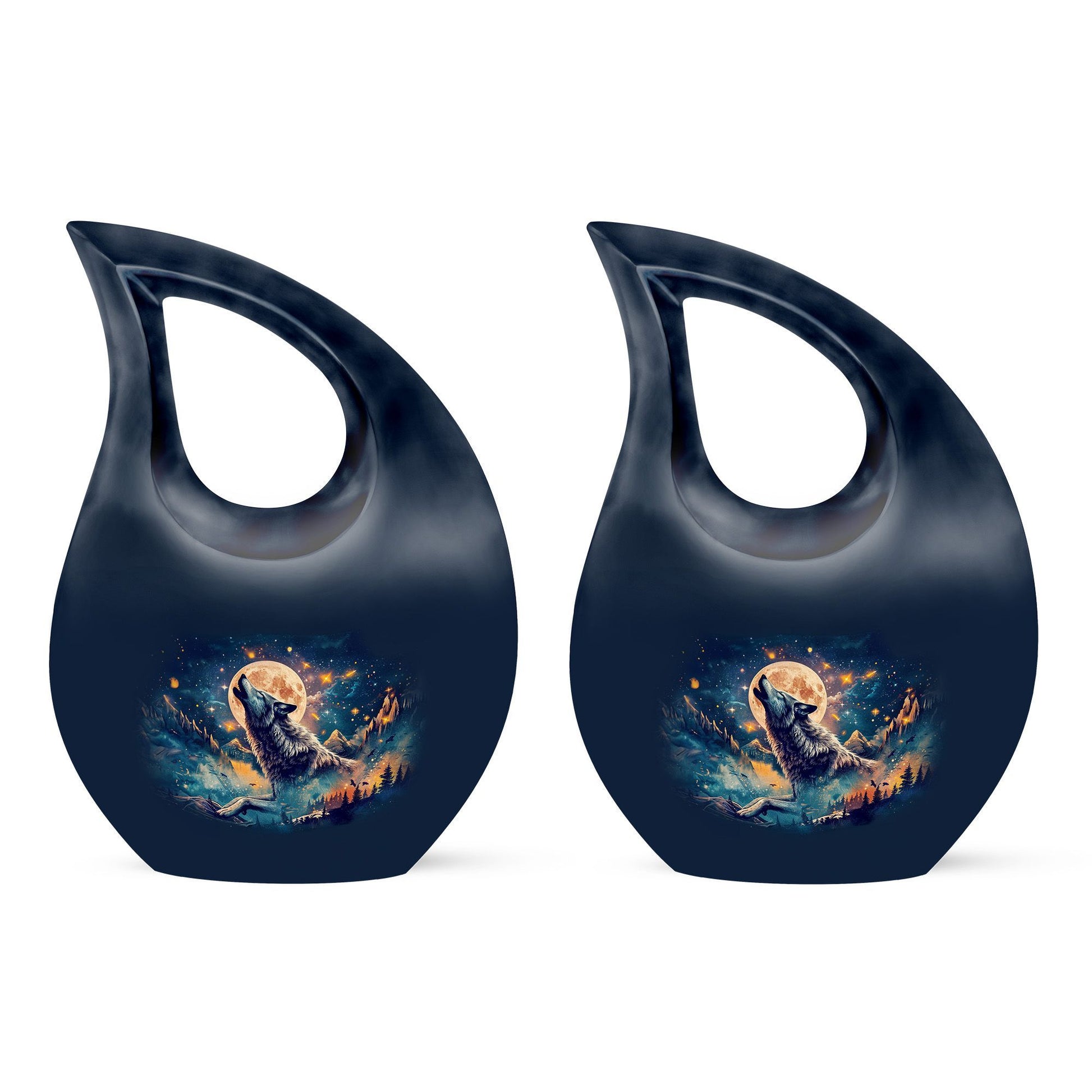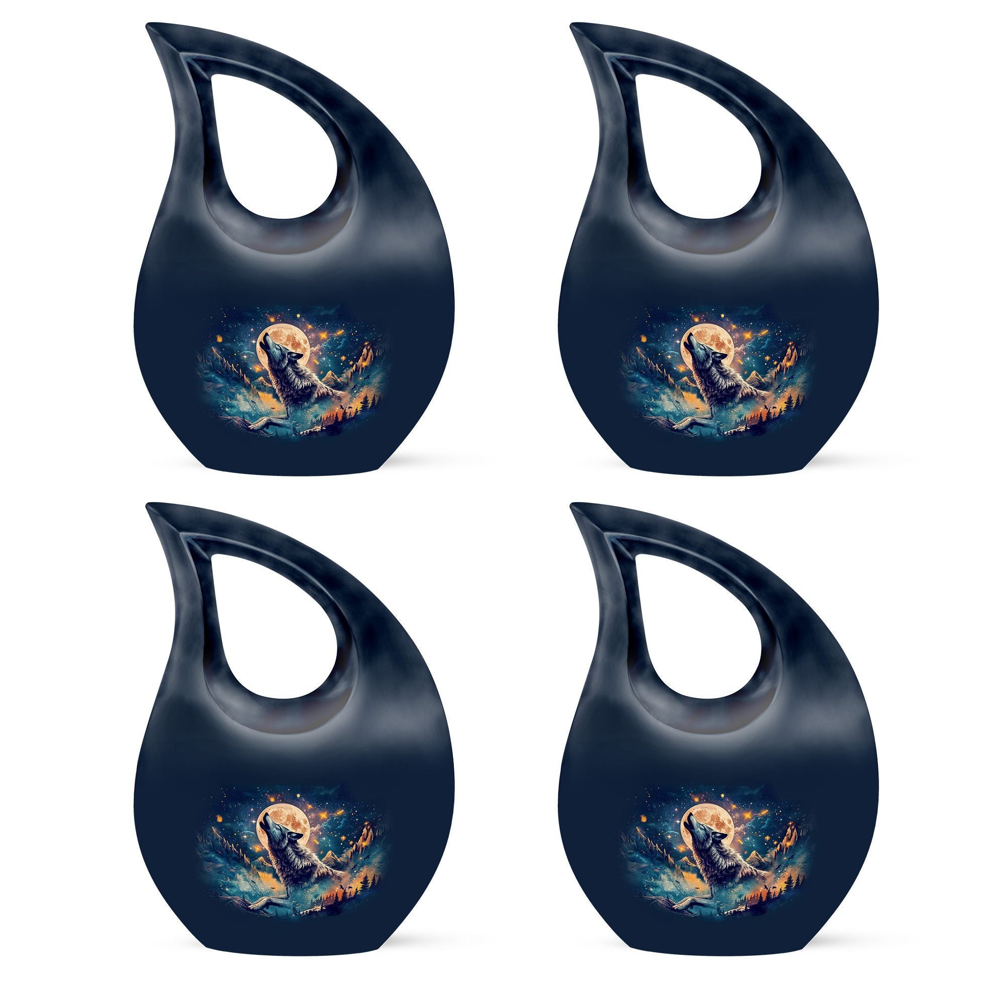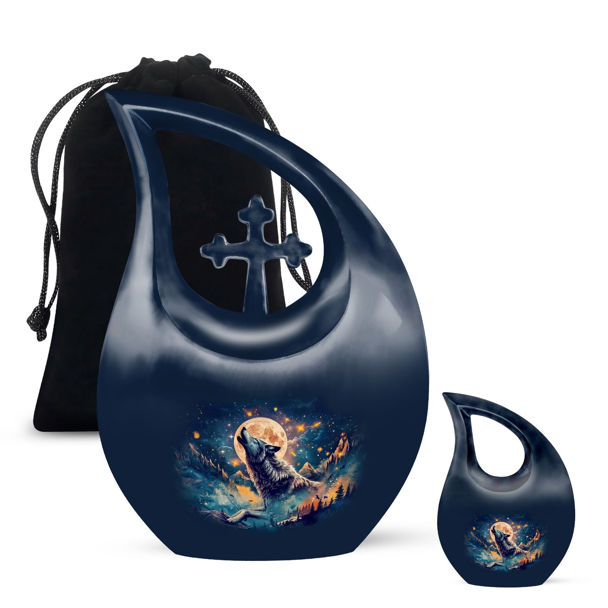 Safeguard your cherished memories with our Wolf Urn - a sentimental salute to those gone, but who still inhabit our hearts. This sturdy, 10-inch high, large cremation urn crafted in aluminium weighs a solid 3.3 pounds, thereby promising a safe haven for those precious ashes. Its capacity is an ample 200 cubic inches. The urn features a unique 'Cross Drop' design that channels a solemnly serene aura. This Wolf themed urn balances the unfamiliar with the familiar, setting it apart from conventional memorial urns. The package includes a velvet pouch to ensure the secure containment of the ashes. Looking for a more personalized touch? We offer the possibility for the urn to be engraved with names thereby giving a more intimate, yet eternal remembrance. Whether you're seeking large cremation urns, affordable urns, or cremation boxes, our collection meets diverse needs. Rest in the tranquility that our dedication to quality and attention to detail offers.
