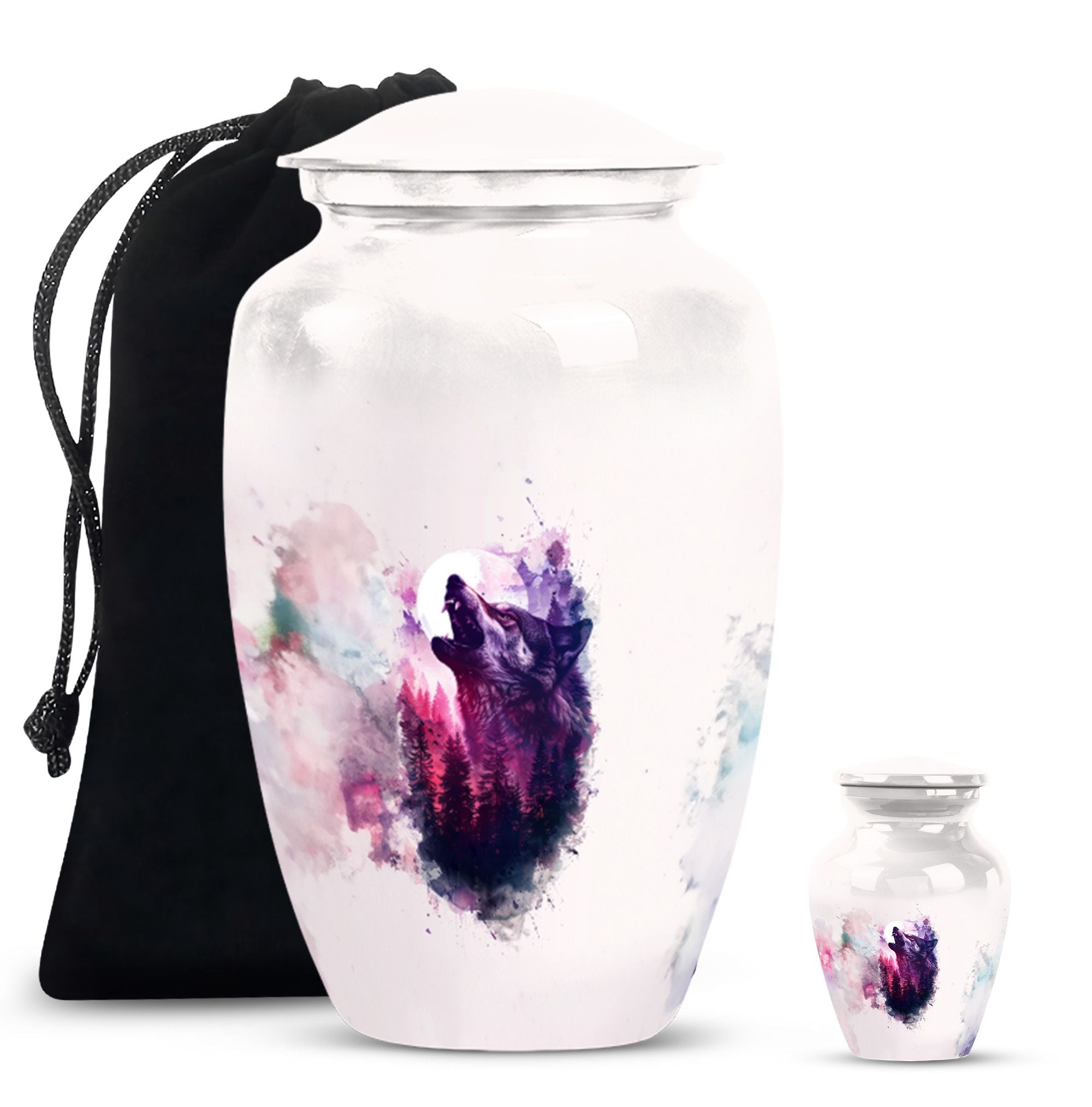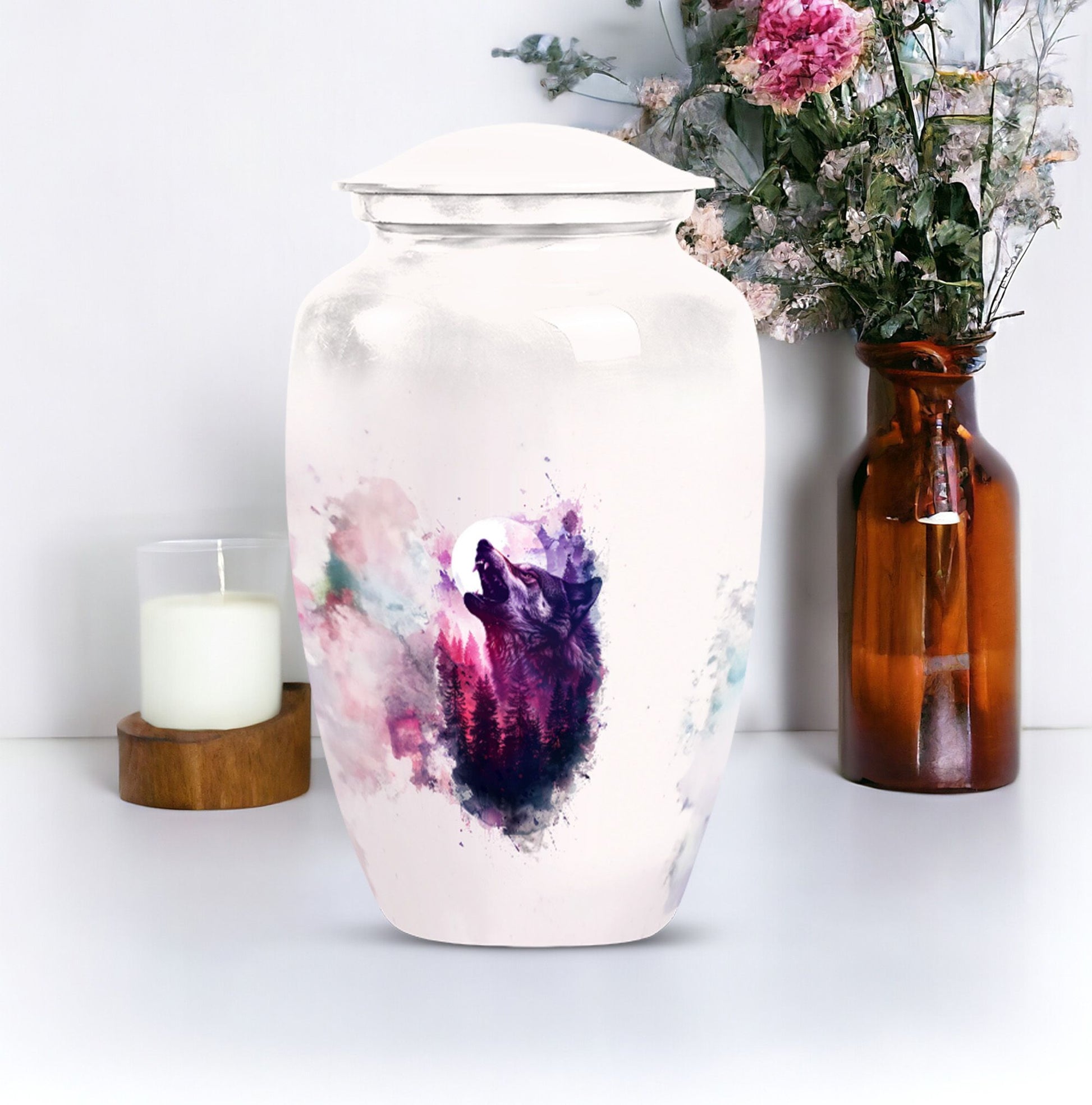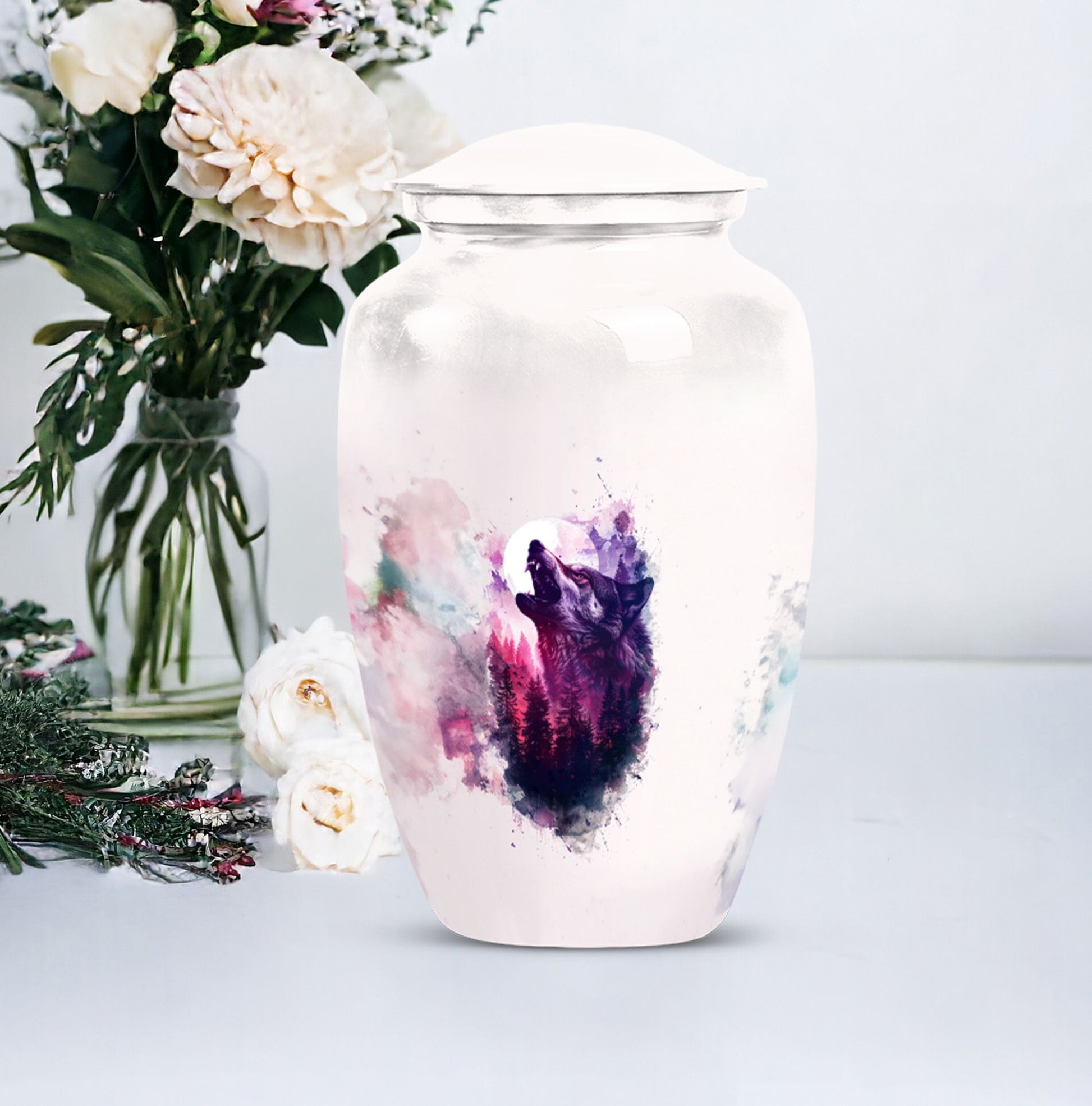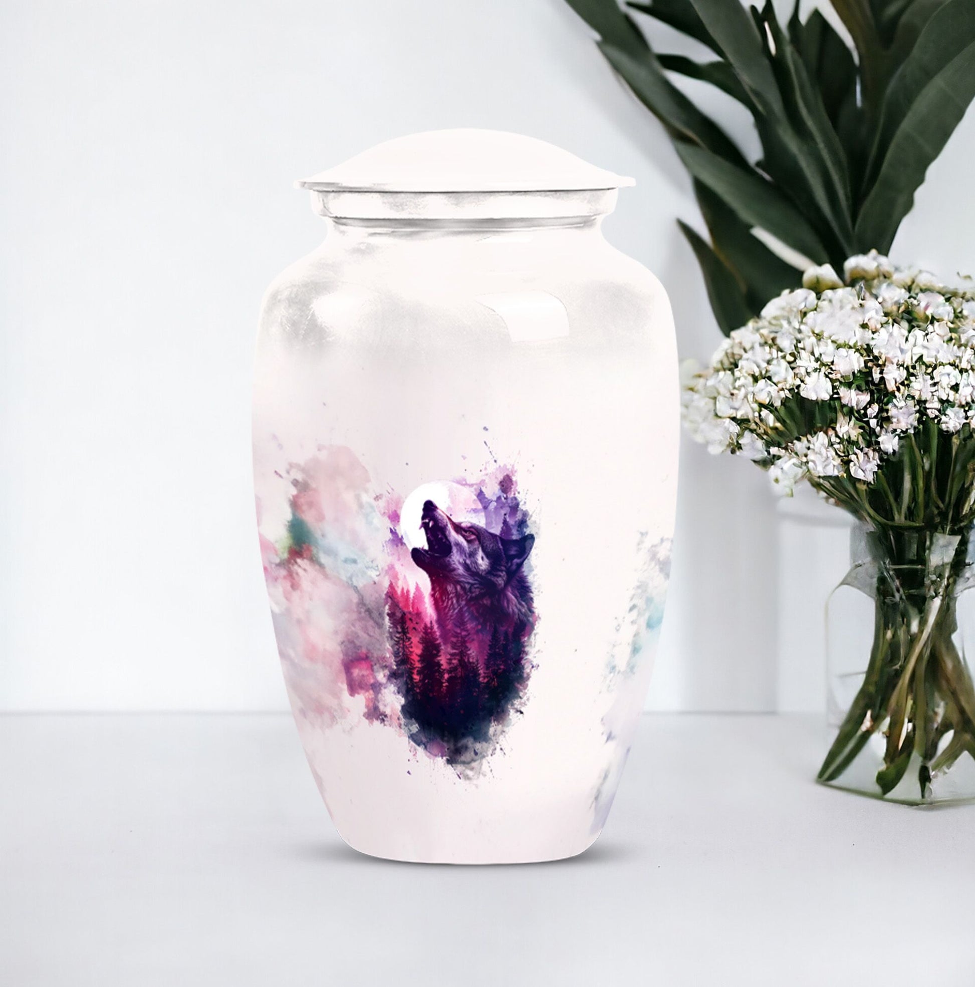 Immortalize your departed loved ones with our elegant 'Wolf Howling Urn'. Fabricated from high-grade Aluminium, this large urn stands 10-inches tall and offers an ample capacity of 200 cubic inches. The burial large urn for ashes for women and men weighs a comfortable 3.3 pounds, ensuring stability. Acknowledging the intimate nature of memorials, the urn accompanies a velvet pouch for dignified containment of ashes. Adorn this spectacular memorial urn with personalized engraved names, making it more special and intimate. Our 'Wolf Howling Urn' avoids the ordinary, and instead presents an uncommon theme that illustrates the spiritual journey beyond life. The use of heavy-duty Aluminium enhances its lifespan, letting you cherish memories forever. Frequently searched terms in this choice category include memorial gifts and large double cremation urn. Purchase our 'Wolf Howling Urn' for a unique memorial symbol that effortlessly captures the essence of your loved one's spirit.