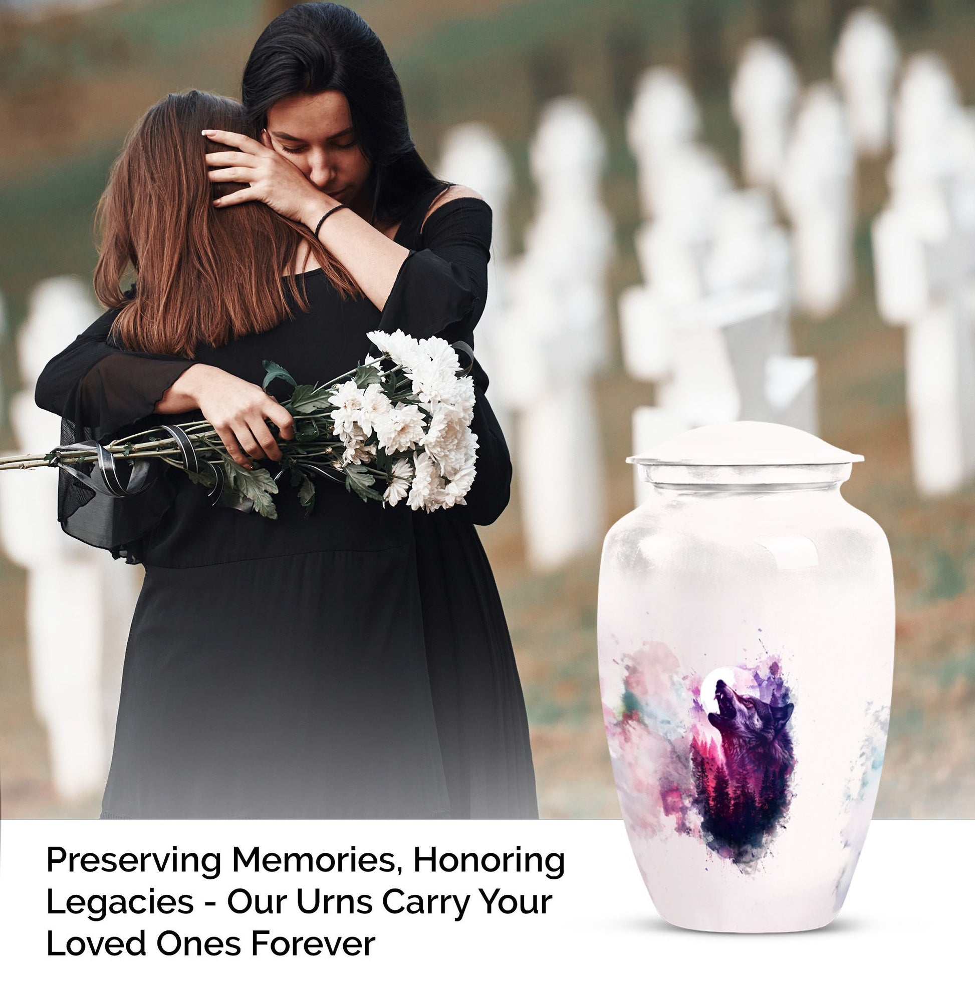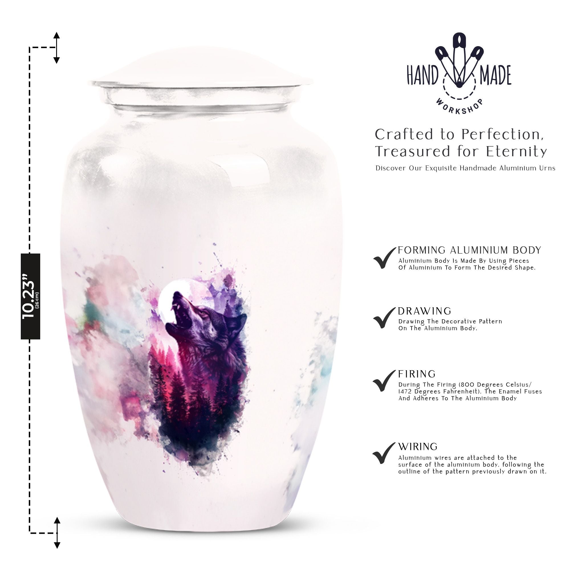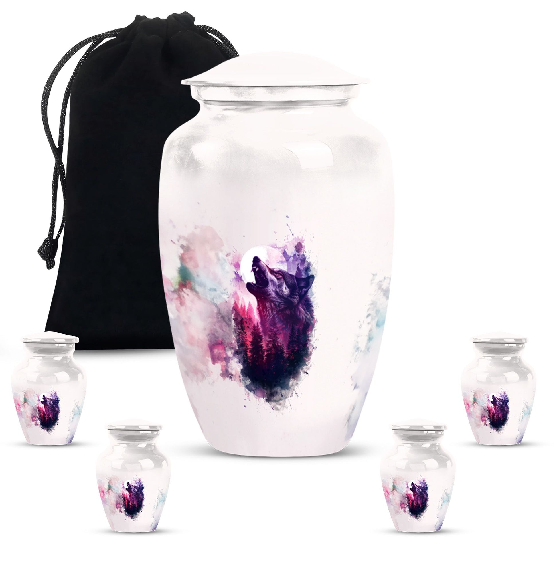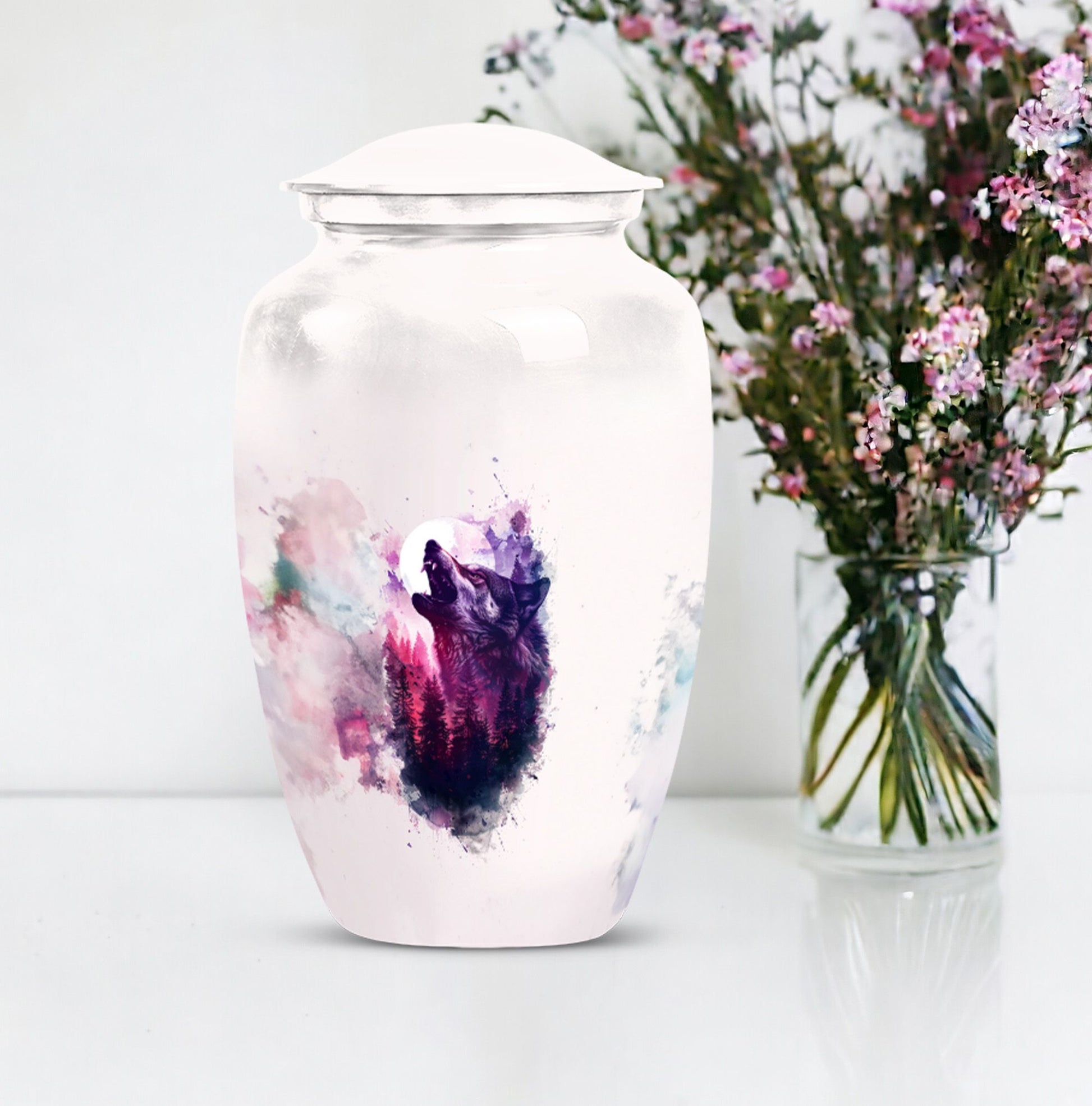 Immortalize your departed loved ones with our elegant 'Wolf Howling Urn'. Fabricated from high-grade Aluminium, this large urn stands 10-inches tall and offers an ample capacity of 200 cubic inches. The burial large urn for ashes for women and men weighs a comfortable 3.3 pounds, ensuring stability. Acknowledging the intimate nature of memorials, the urn accompanies a velvet pouch for dignified containment of ashes. Adorn this spectacular memorial urn with personalized engraved names, making it more special and intimate. Our 'Wolf Howling Urn' avoids the ordinary, and instead presents an uncommon theme that illustrates the spiritual journey beyond life. The use of heavy-duty Aluminium enhances its lifespan, letting you cherish memories forever. Frequently searched terms in this choice category include memorial gifts and large double cremation urn. Purchase our 'Wolf Howling Urn' for a unique memorial symbol that effortlessly captures the essence of your loved one's spirit.