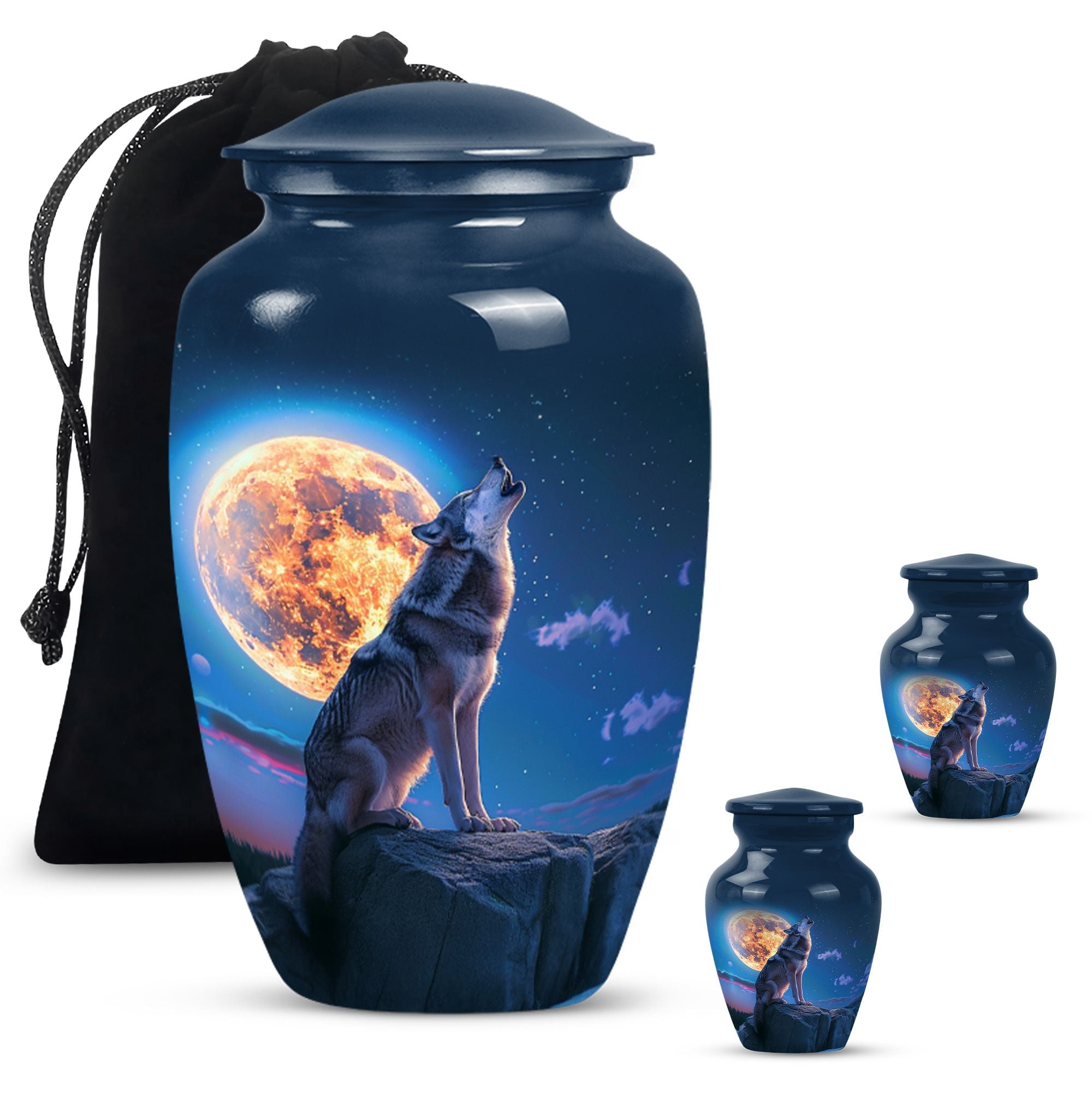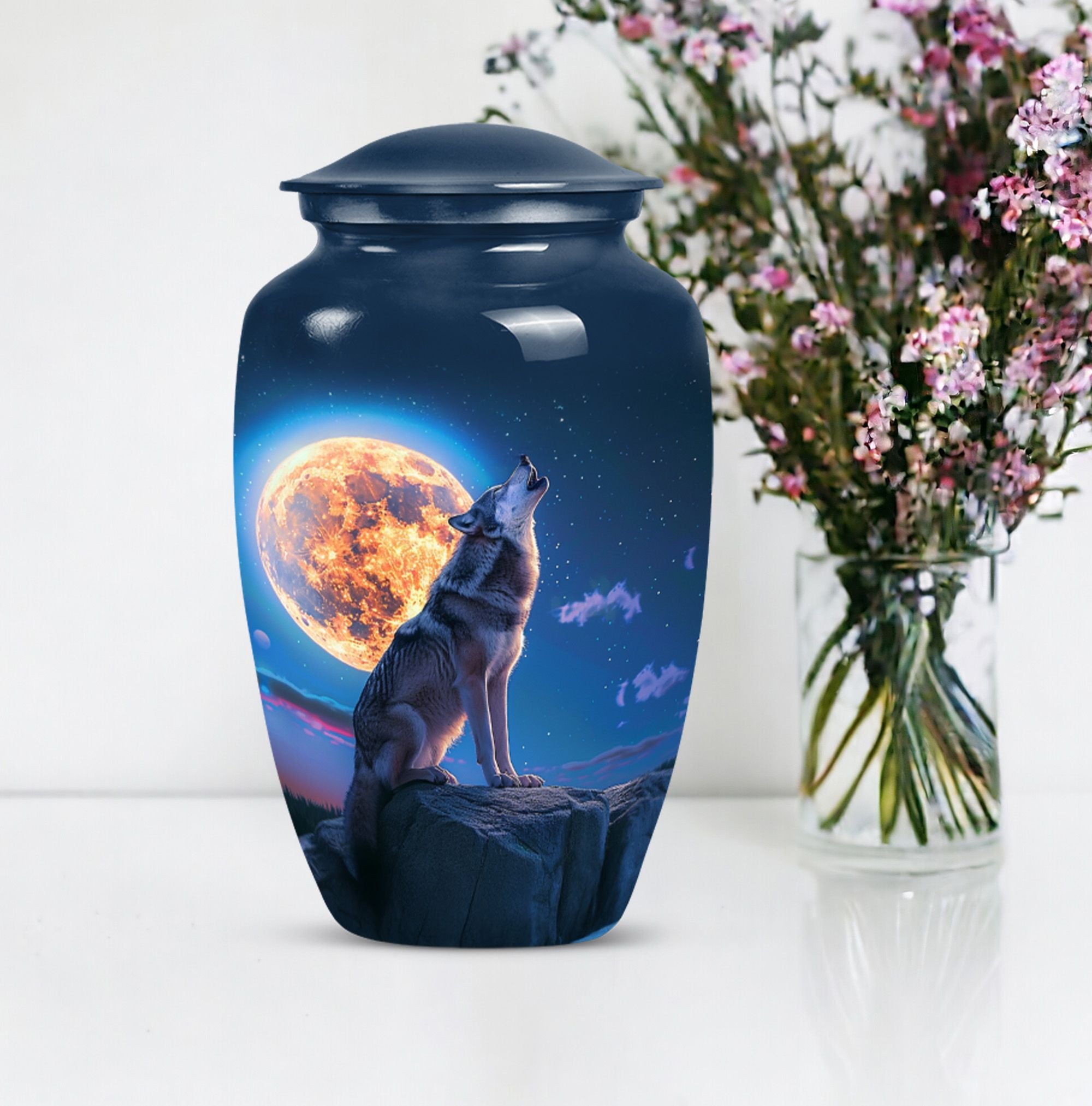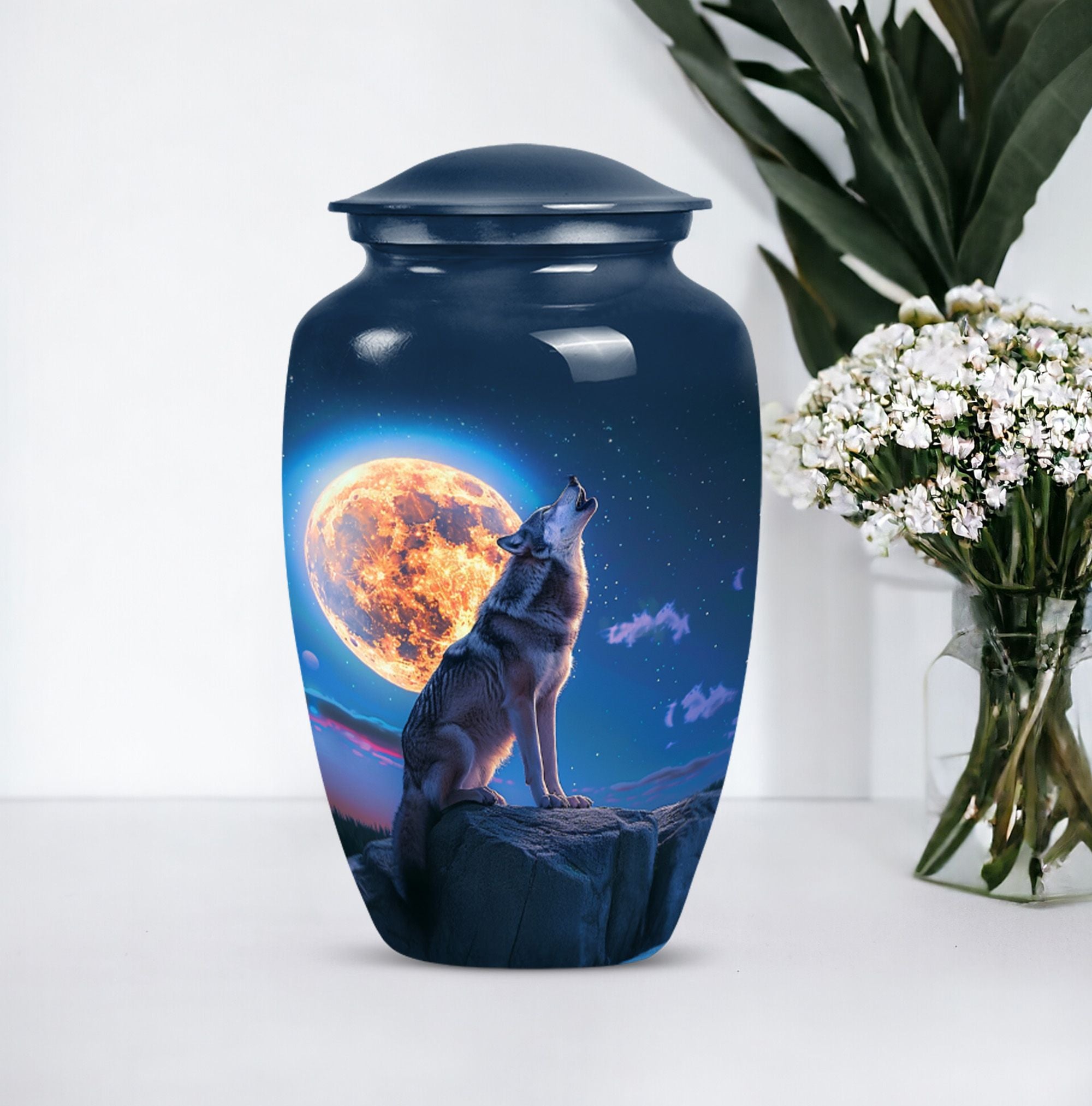 Honor your loved ones with our profound 10-inch Wolf Howling Urn, a perfect piece for those searching 'cremation urns for women' or 'memorial urns'. With a classic urn design paying tribute to the enduring spirit, the theme encapsulates the timeless nature, strength, and beauty of a howling wolf. This large urn, weighing 3.3 pounds, is engineered from high-quality aluminium that ensures longevity and reverence. It is spacious with a capacity of 200 cubic inches, ample to safeguard the ashes of your loved ones. The urn comes with a velvet pouch to carefully contain the ashes. We value your sentiments; thereby, the urn can be personalized with engraved names, adding a unique touch to your remembrance. This grand tribute is ideal for those seeking 'burial large urn for women ashes', 'funeral urns ashes', 'unisex gifts for adults', or 'metal urns for human ashes adult female'. Cherish memories and honorably celebrate life with our Wolf Howling Urn.