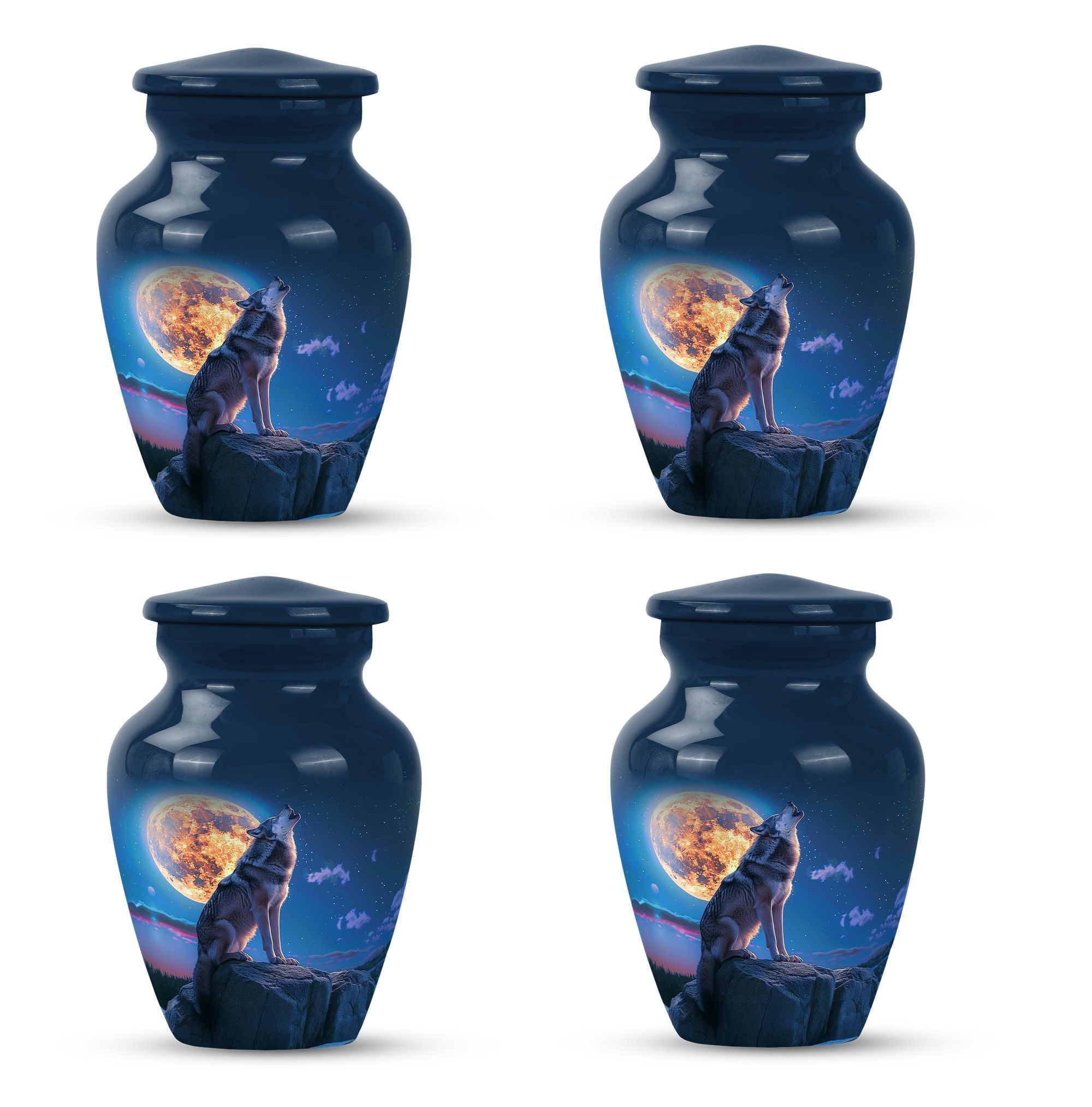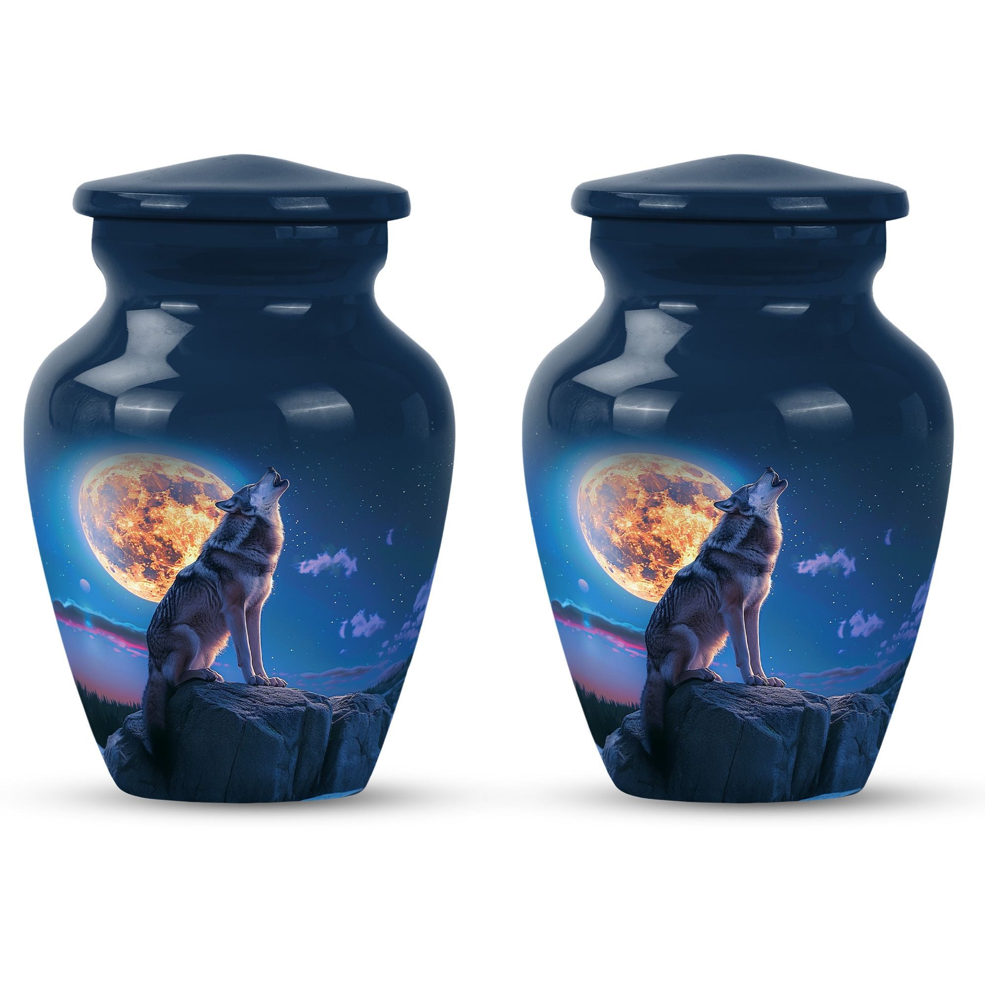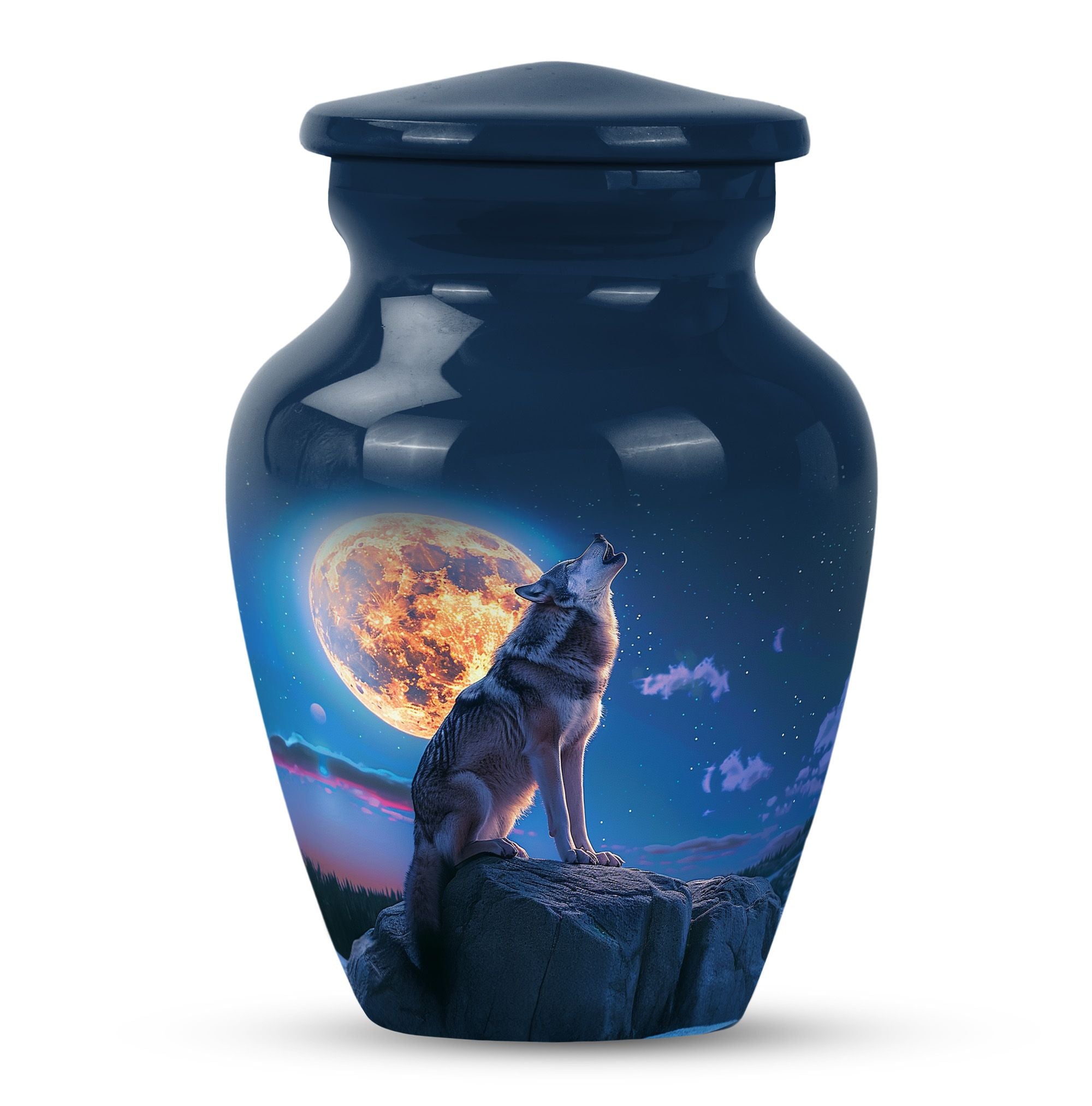 Honor your loved ones with our profound 10-inch Wolf Howling Urn, a perfect piece for those searching 'cremation urns for women' or 'memorial urns'. With a classic urn design paying tribute to the enduring spirit, the theme encapsulates the timeless nature, strength, and beauty of a howling wolf. This large urn, weighing 3.3 pounds, is engineered from high-quality aluminium that ensures longevity and reverence. It is spacious with a capacity of 200 cubic inches, ample to safeguard the ashes of your loved ones. The urn comes with a velvet pouch to carefully contain the ashes. We value your sentiments; thereby, the urn can be personalized with engraved names, adding a unique touch to your remembrance. This grand tribute is ideal for those seeking 'burial large urn for women ashes', 'funeral urns ashes', 'unisex gifts for adults', or 'metal urns for human ashes adult female'. Cherish memories and honorably celebrate life with our Wolf Howling Urn.