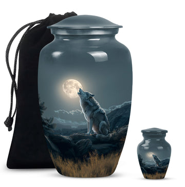 Our Wolf Howling Large Urn is more than just a resting place—it's a breathtaking tribute to your loved one's memory. Handcrafted from durable aluminium, this 10-inch cremation urn is as enduring as your loved one’s memory, featuring a profound visual of a wolf howling to ignite a feeling of peace and serenity. The urn weighs a substantial 3.3 pounds, symbolizing the significant impact your loved one left behind. Its spacious interior can accommodate up to 200 cubic inches of ashes, making it ideal for adults. Personalize this lasting keepsake with engraved names to make it even more extraordinary. The urn comes with a plush velvet pouch, providing tender containment for the ashes. Built to bury in the ground, this wolf howling urn serves as a timeless memorial. Honor your loved one's spirit with this exquisite tribute.