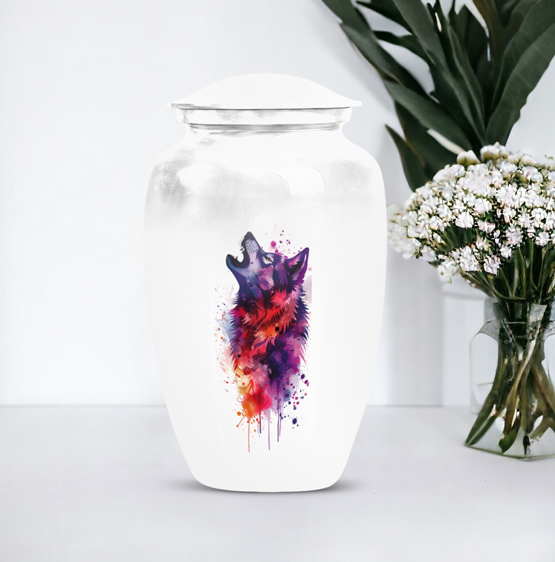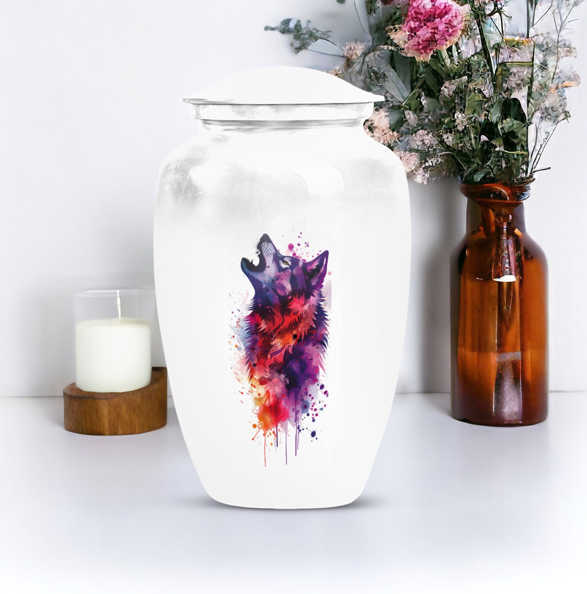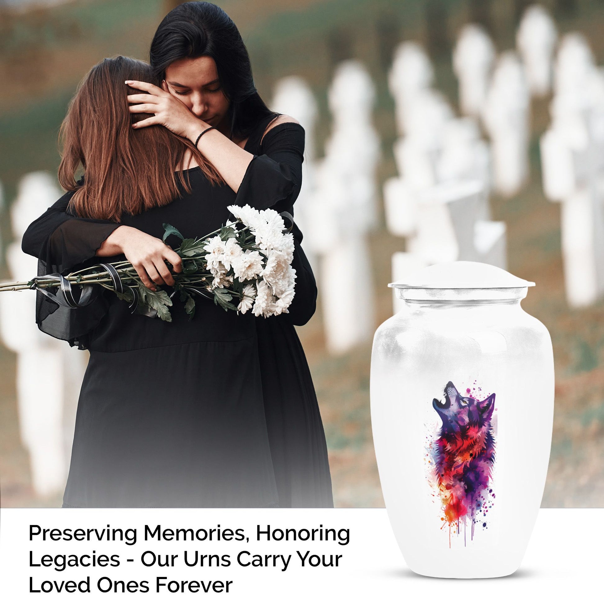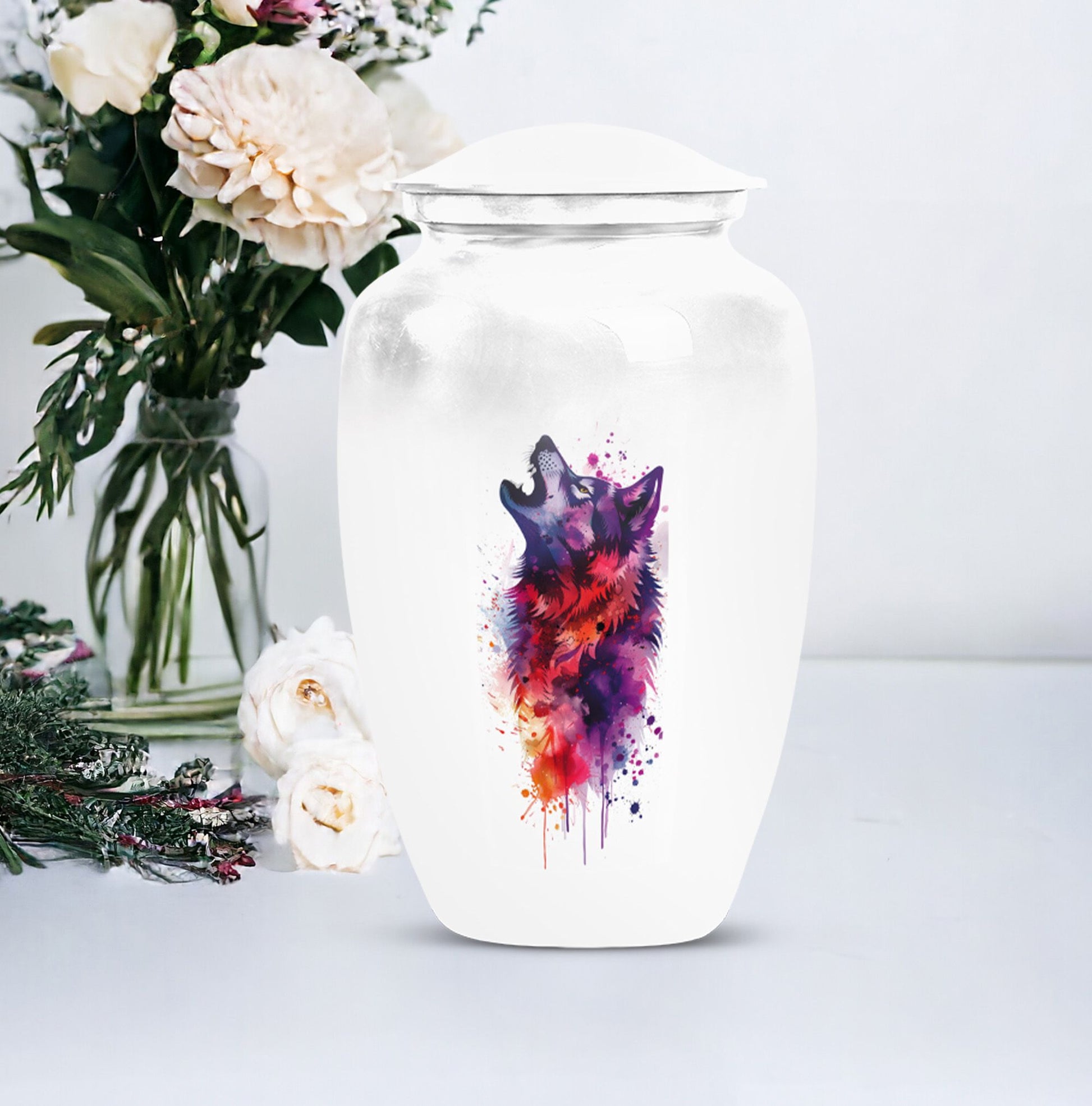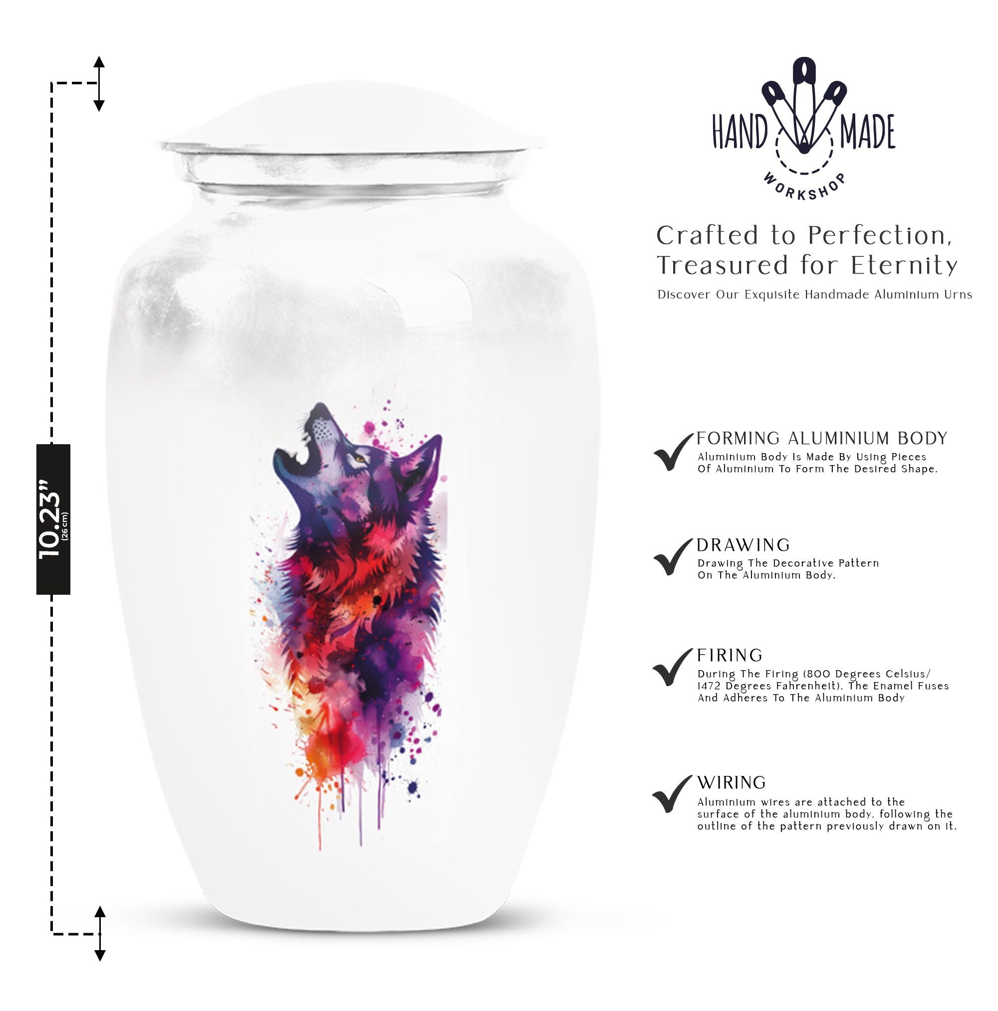Experience the solemn beauty of our 10 Inch Wolf Howling Urn, a testament to eternal remembrance. Exceptionally crafted from high-quality Aluminium, this weighty, large urn defines durability. Its enchanting Wolf Howling theme transcends the ordinary, adding a unique, somber touch to bid farewell. As a delicate gesture, each order includes a velvet pouch for secure containment of ashes, thus preserving the integrity of your lost ones. Situating at 10 inches in height, with a capacity of 200 cubic inches, this funeral ash urn is purposeful in design and function. Seal in the memories of your departed ones with the option to personalize with engraved names, making each urn a bespoke piece of remembrance. Ideal for adult human ashes, this cremation urn outstands in elegance and sentiment. Discover a comforting closeness with your departed ones in this unique, metal funeral urn, reminiscing their essence every time you glance at it.