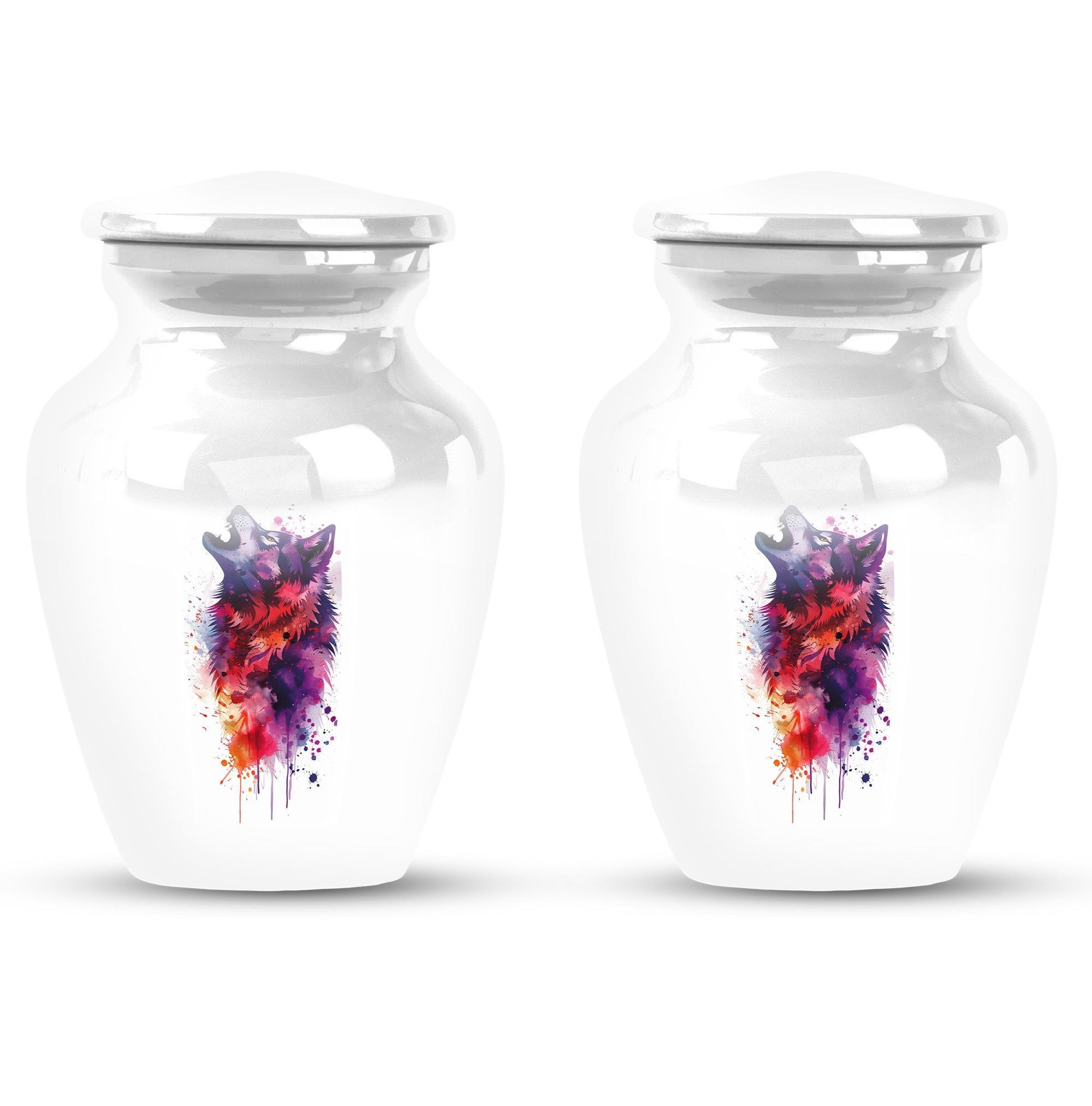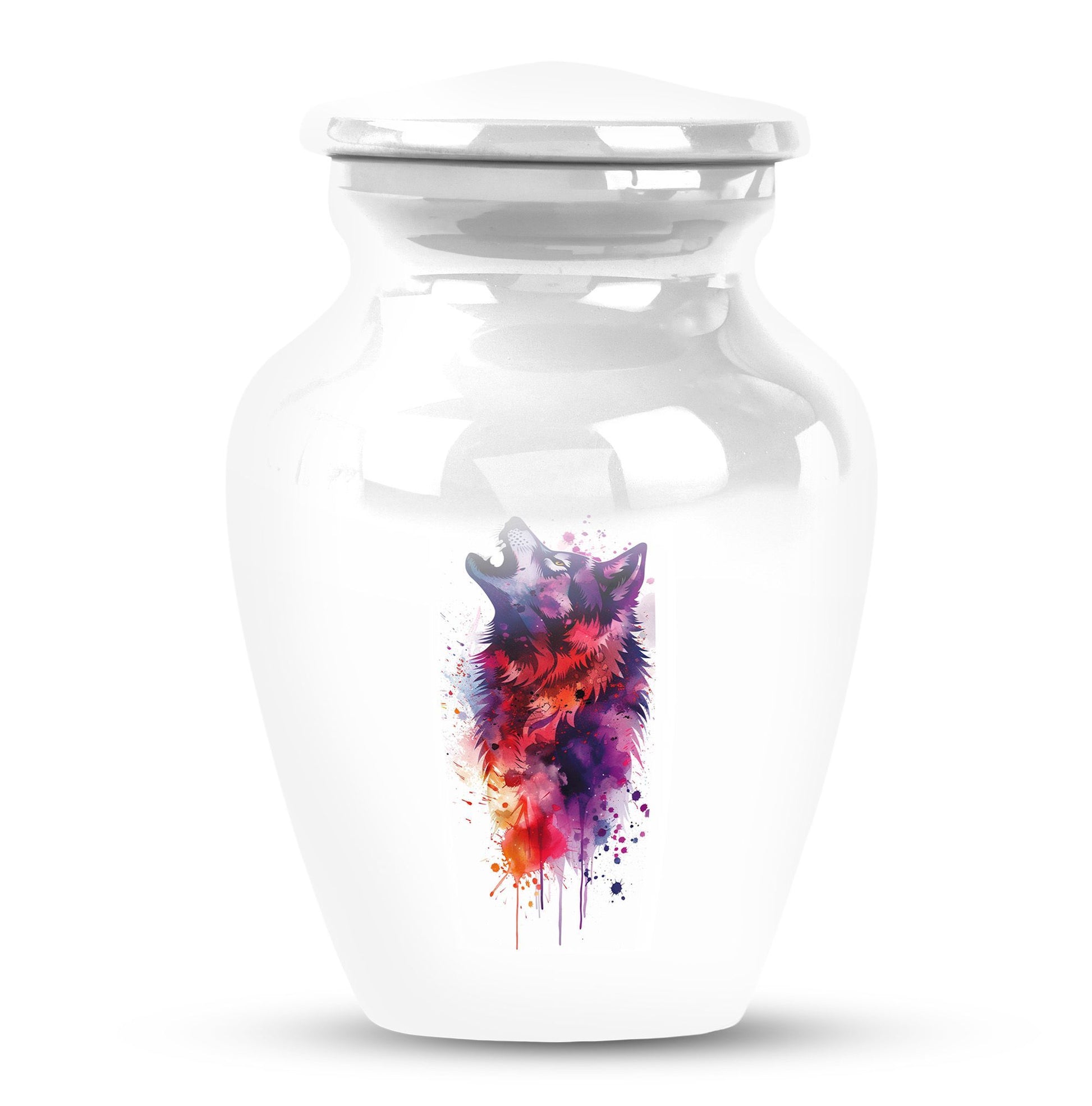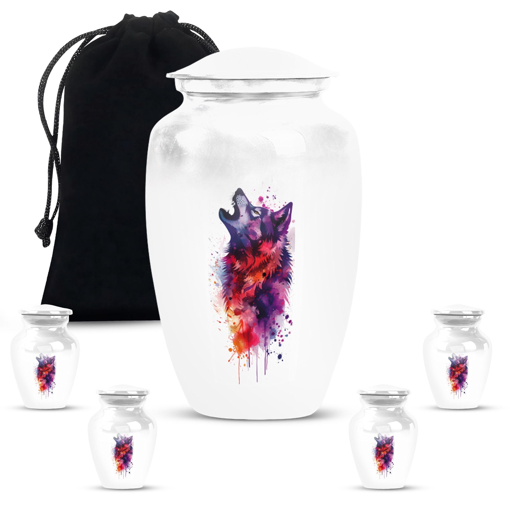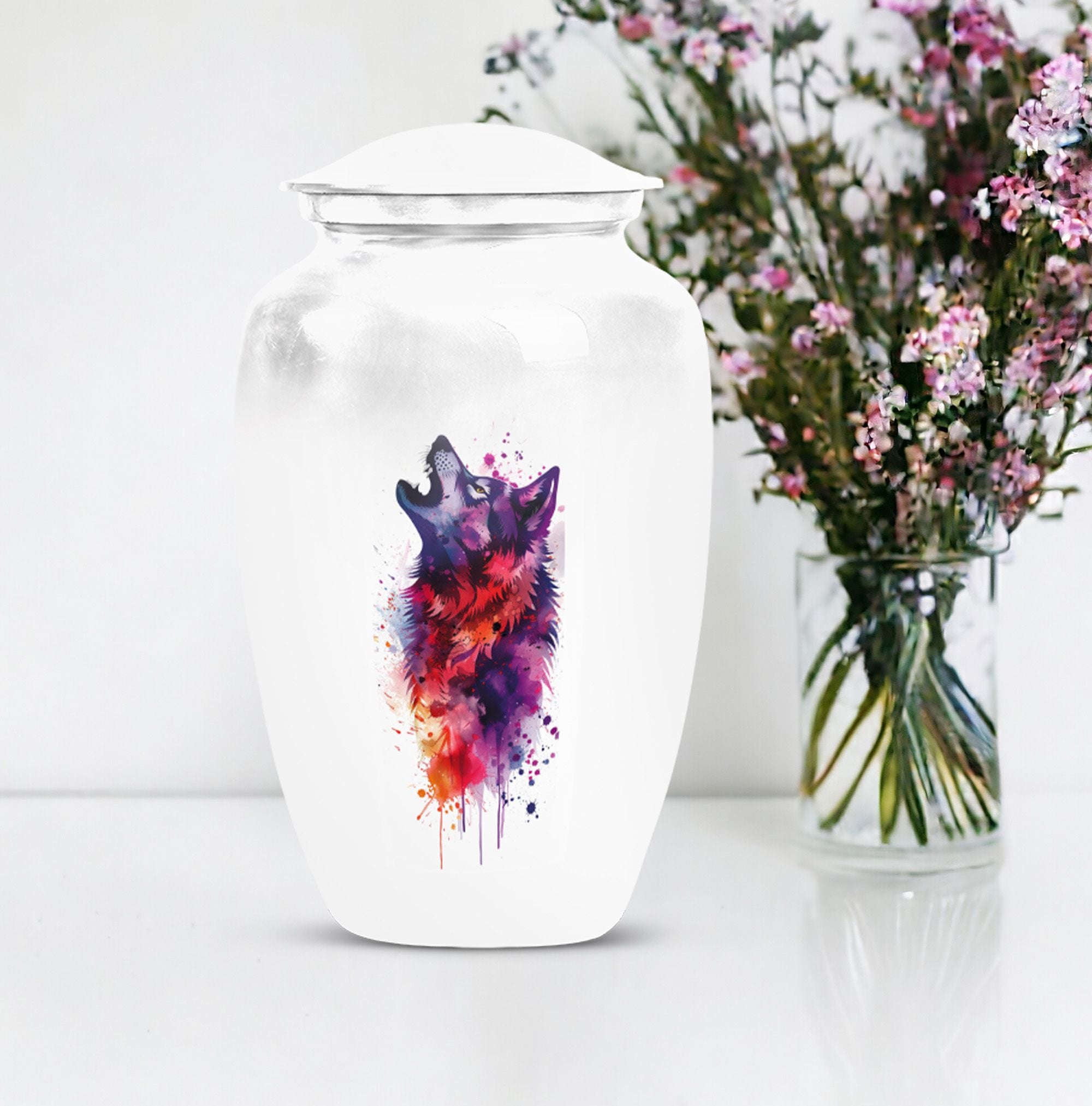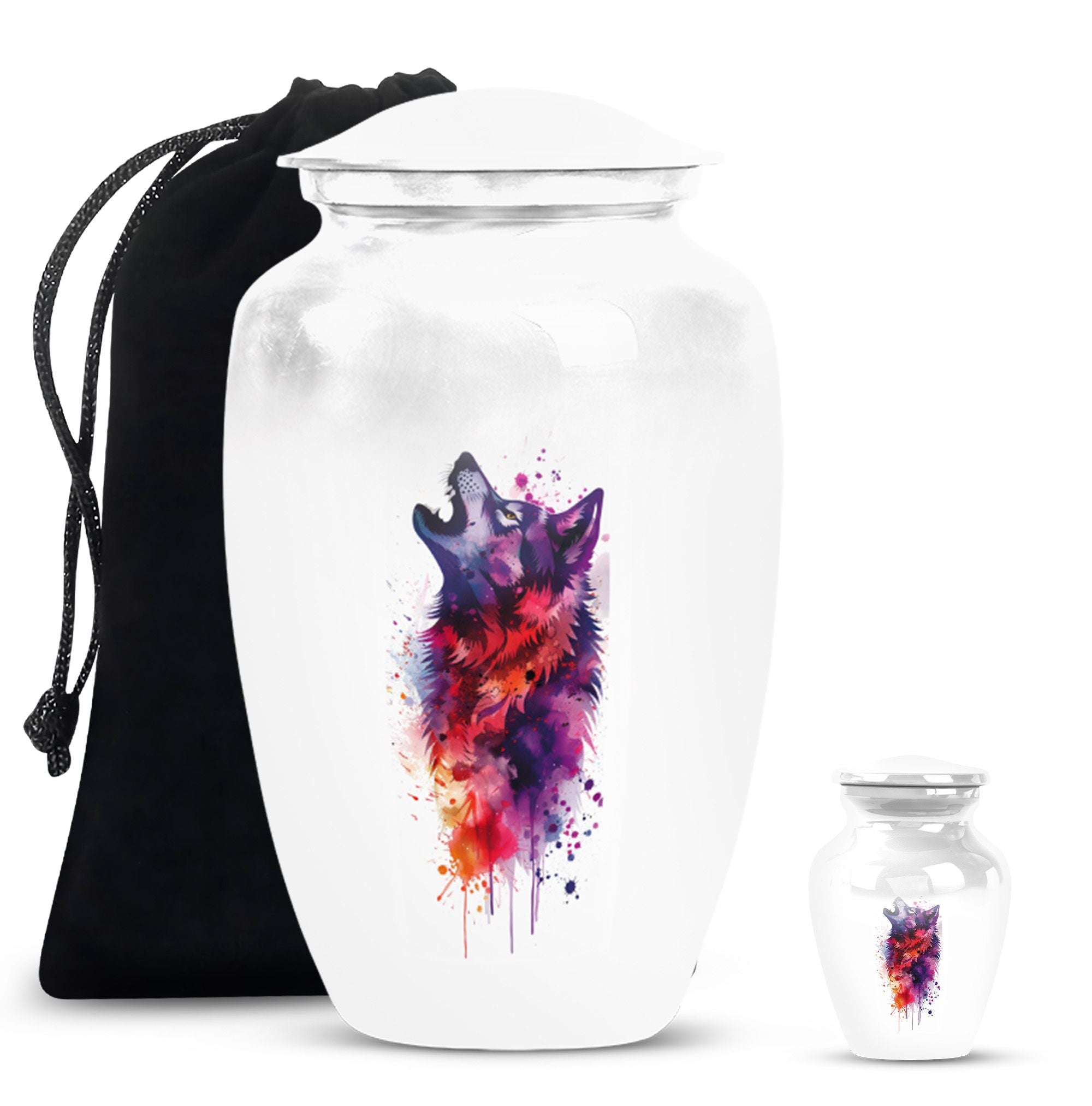 Experience the solemn beauty of our 10 Inch Wolf Howling Urn, a testament to eternal remembrance. Exceptionally crafted from high-quality Aluminium, this weighty, large urn defines durability. Its enchanting Wolf Howling theme transcends the ordinary, adding a unique, somber touch to bid farewell. As a delicate gesture, each order includes a velvet pouch for secure containment of ashes, thus preserving the integrity of your lost ones. Situating at 10 inches in height, with a capacity of 200 cubic inches, this funeral ash urn is purposeful in design and function. Seal in the memories of your departed ones with the option to personalize with engraved names, making each urn a bespoke piece of remembrance. Ideal for adult human ashes, this cremation urn outstands in elegance and sentiment. Discover a comforting closeness with your departed ones in this unique, metal funeral urn, reminiscing their essence every time you glance at it.