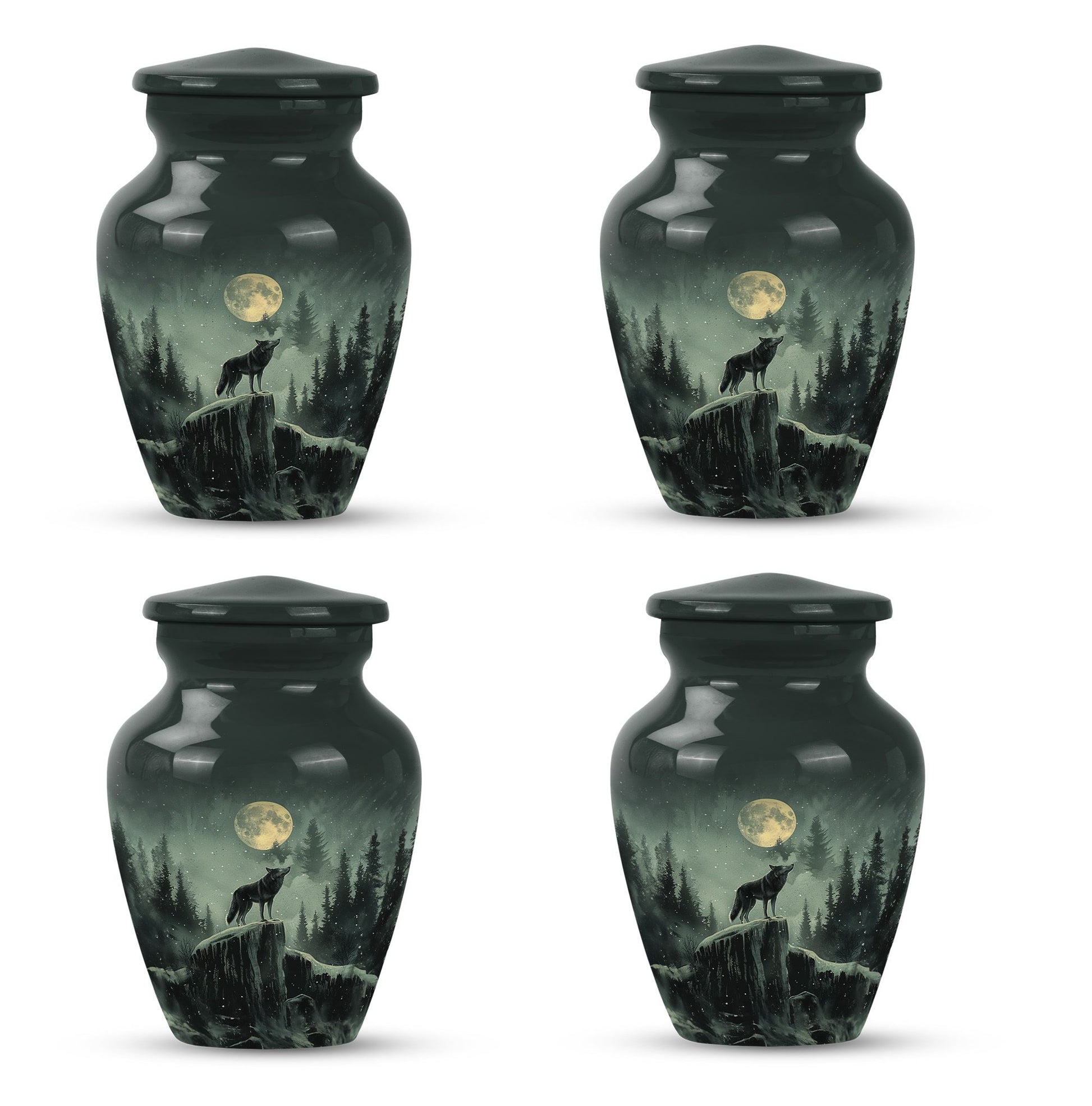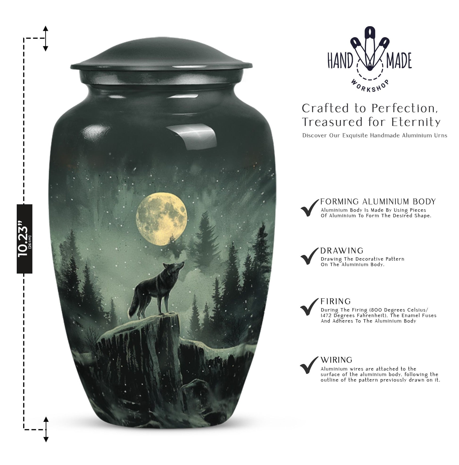 Exuding strength and serenity, this 10 inch Aluminium 'Wolf Howling Urn' resonates honor and memory for your departed adult loved ones. It is more than just a funeral urn - it's a regal tribute. The large urn which weighs 3.3 pounds, boasts an exquisite 'Wolf Howling' theme, symbolizing courage and spiritual guidance, making it an ideal choice for those seeking funeral urns for ashes adult or urn ash men. The 'Wolf Howling Urn' can securely store up to 200 cubic inches of ashes. This emblematic cremation urn comes with a velvet pouch for dignified containment of the ashes. With an option to personalize with engraved names, this urn will make a beautiful centerpiece for any memorial setting. Reflective of the spirit that was, this wolf howling urn is not just a funeral item but a commemorative treasure for your loved ones.