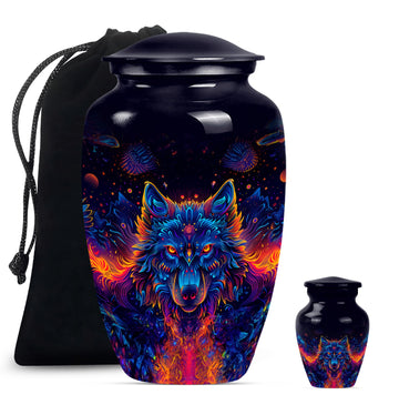 This beautiful 'Wolf Urn' is a comforting and respectful way to say goodbye to a loved one. It is a large urn that carries a meaningful 200 cubic inches of capacity, perfect for memorial ceremonies. Crafted from durable Aluminium, this cremation urn stands 10 inches in height and weighs 3.3 pounds, ensuring stability and longevity. Carefully designed with a classic, abstract theme, this urn provides a respectful tribute to a profound life lived. The urn comes with the thoughtful addition of a velvet pouch for containment of ashes, ensuring your loved ones' legacy is considered with the utmost care. Furthermore, this cremation urn for men comes with personalization options for you to engrave names, making each urn unique and personal. Keywords such as 'burial urns for cremation ashes mother', 'urn ash funeral urn', and 'shaped urn box,' are commonly searched in this category highlighting the need and interest for such a product.