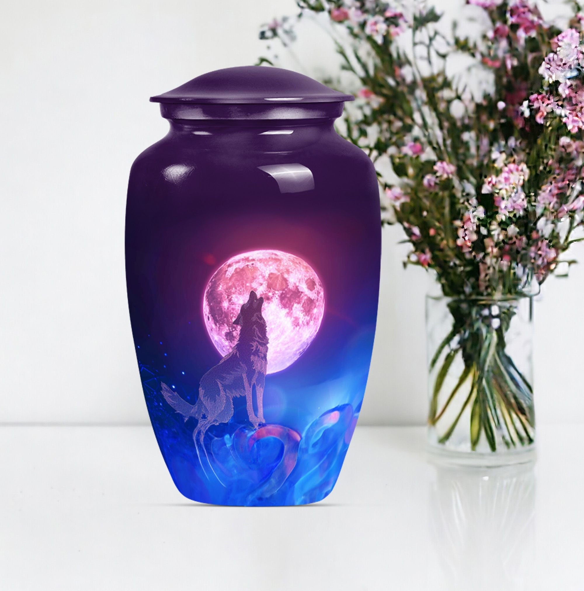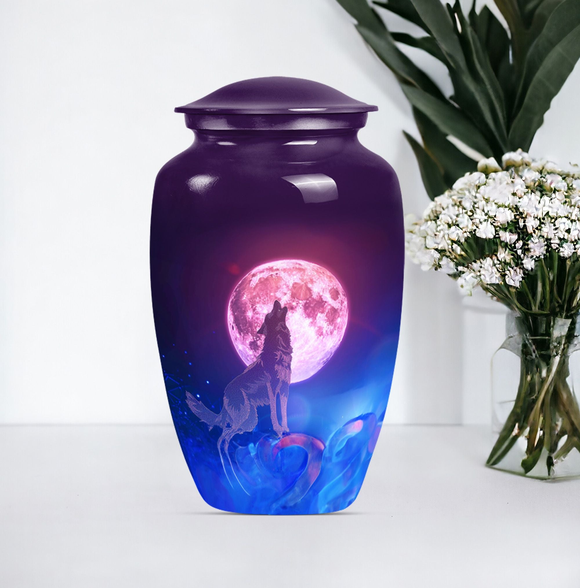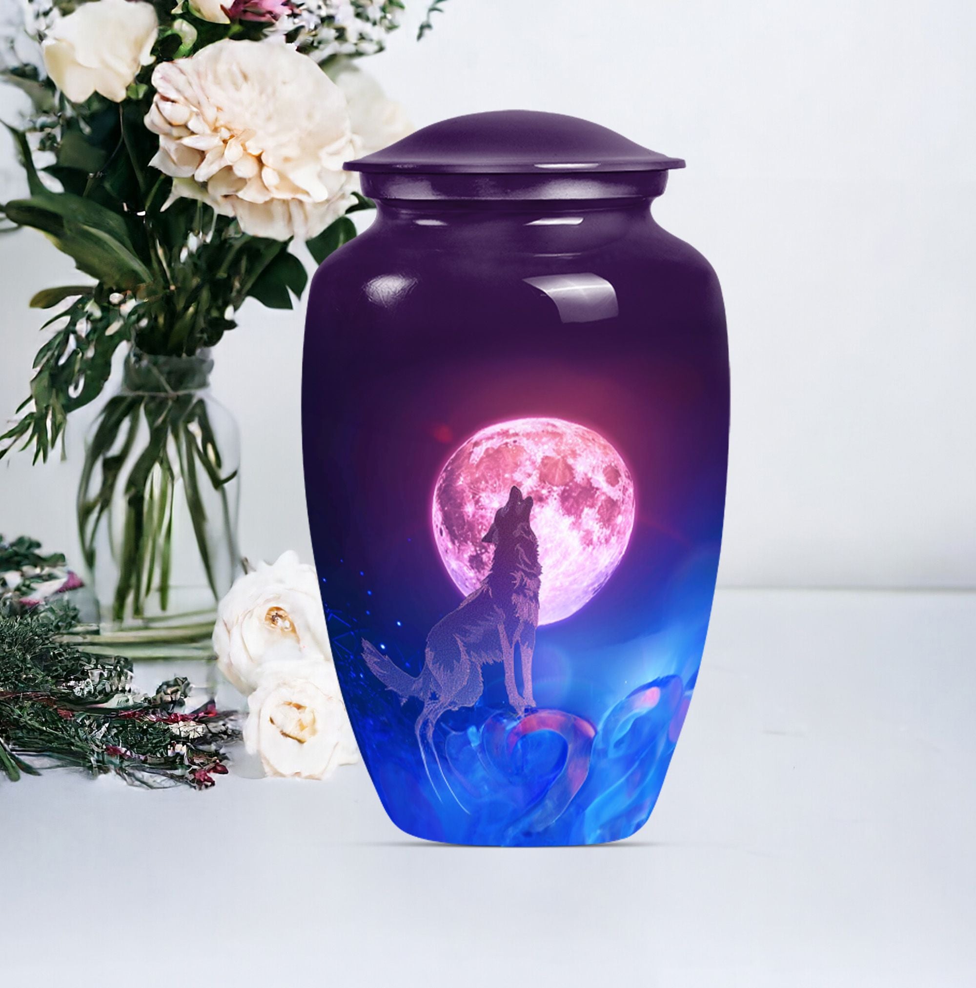 Expertly handcrafted, this adult urn for human ashes men combines artistic design with lasting durability. Made from premium materials, it serves as both a functional memorial and a decorative centerpiece. The stunning wolf motif beneath a pink moon adds depth and symbolism, while the smooth metallic finish enhances its presence as a large decorative urn. Ideal as an urn for ashes for men, it offers both style and solace for your home or memorial display.