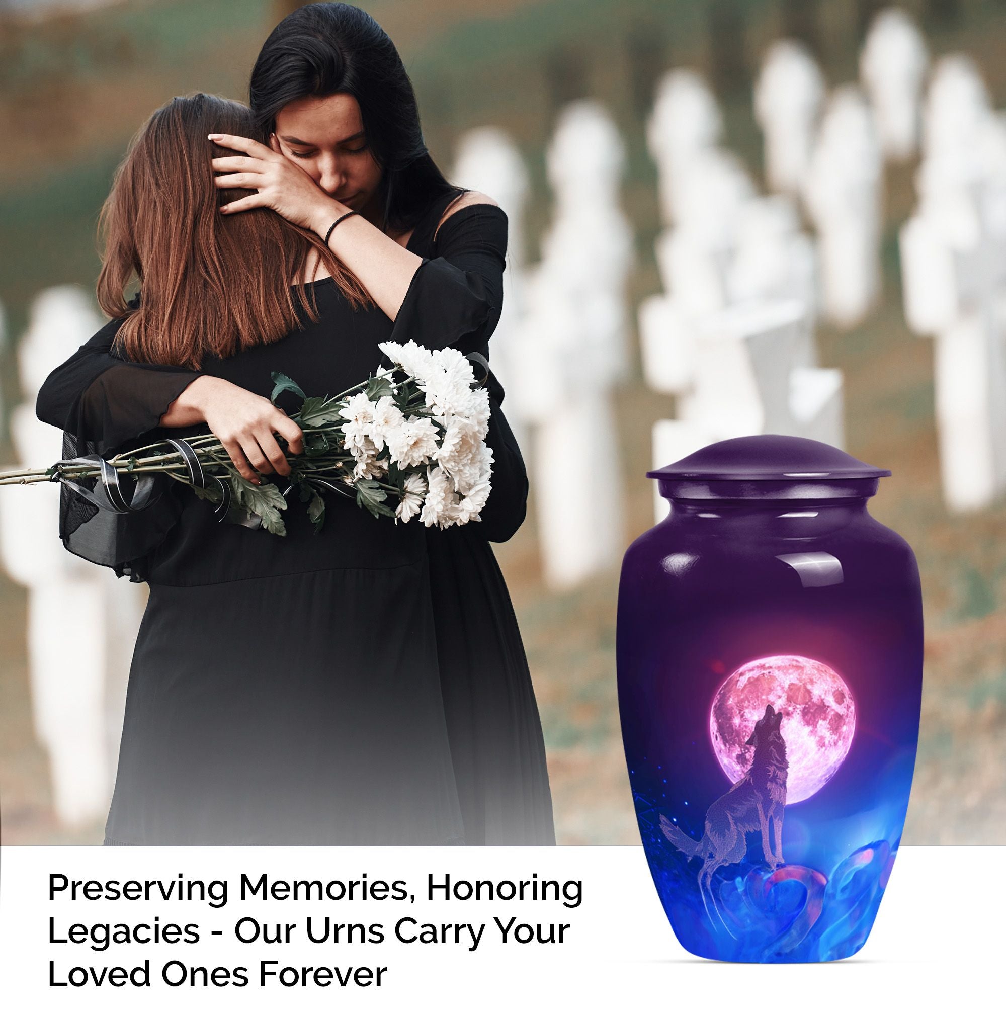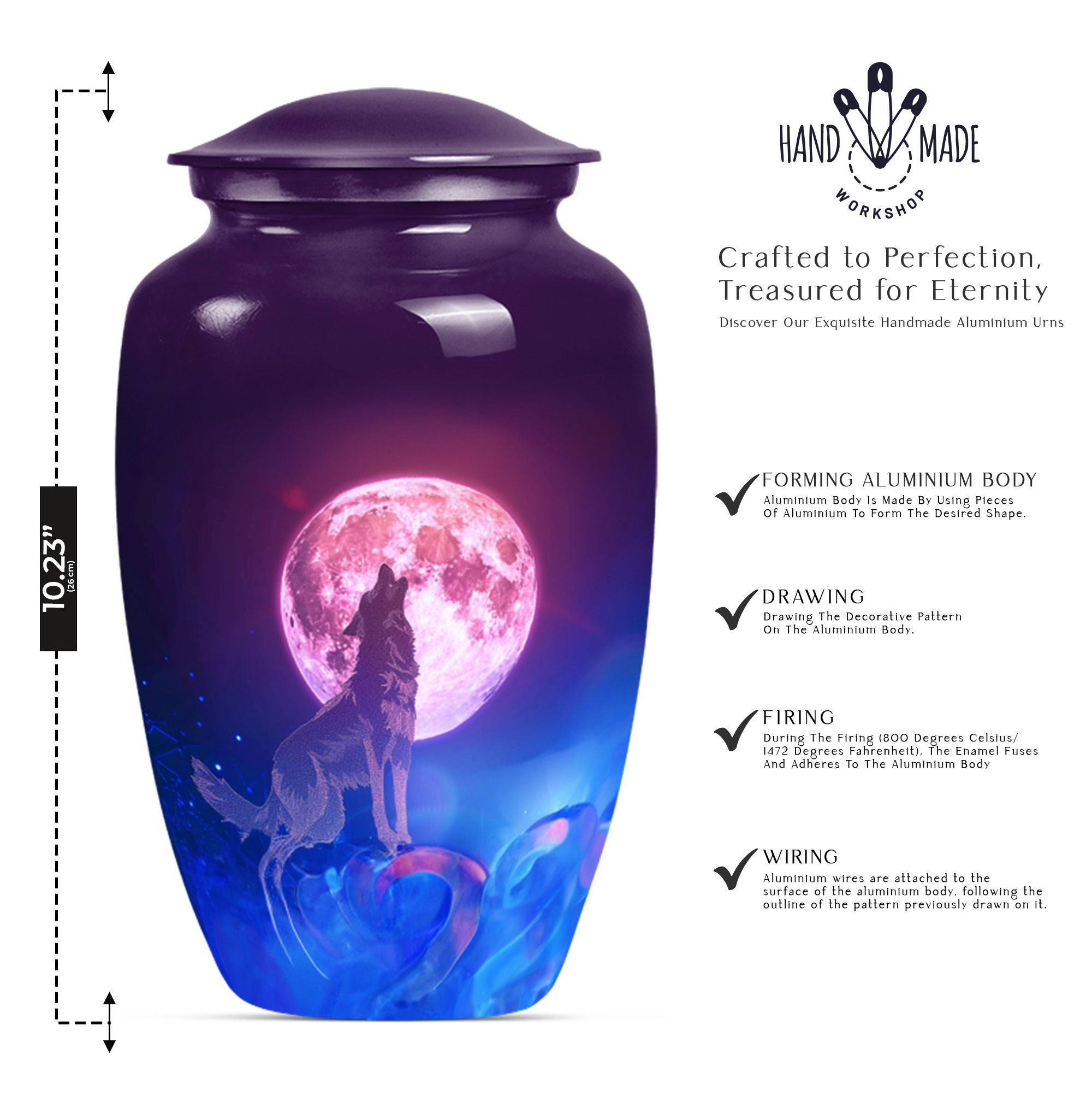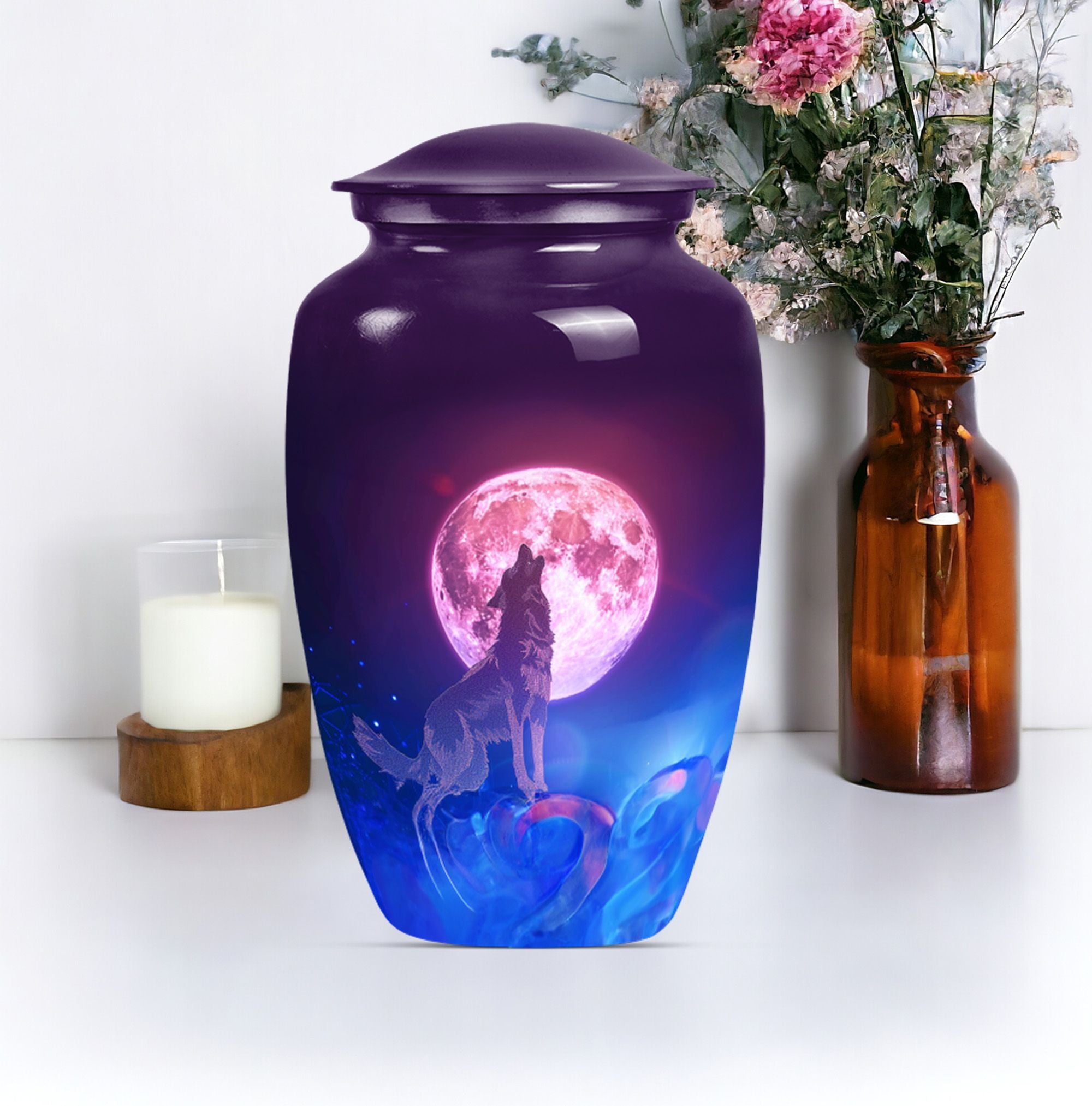 Expertly handcrafted, this adult urn for human ashes men combines artistic design with lasting durability. Made from premium materials, it serves as both a functional memorial and a decorative centerpiece. The stunning wolf motif beneath a pink moon adds depth and symbolism, while the smooth metallic finish enhances its presence as a large decorative urn. Ideal as an urn for ashes for men, it offers both style and solace for your home or memorial display.