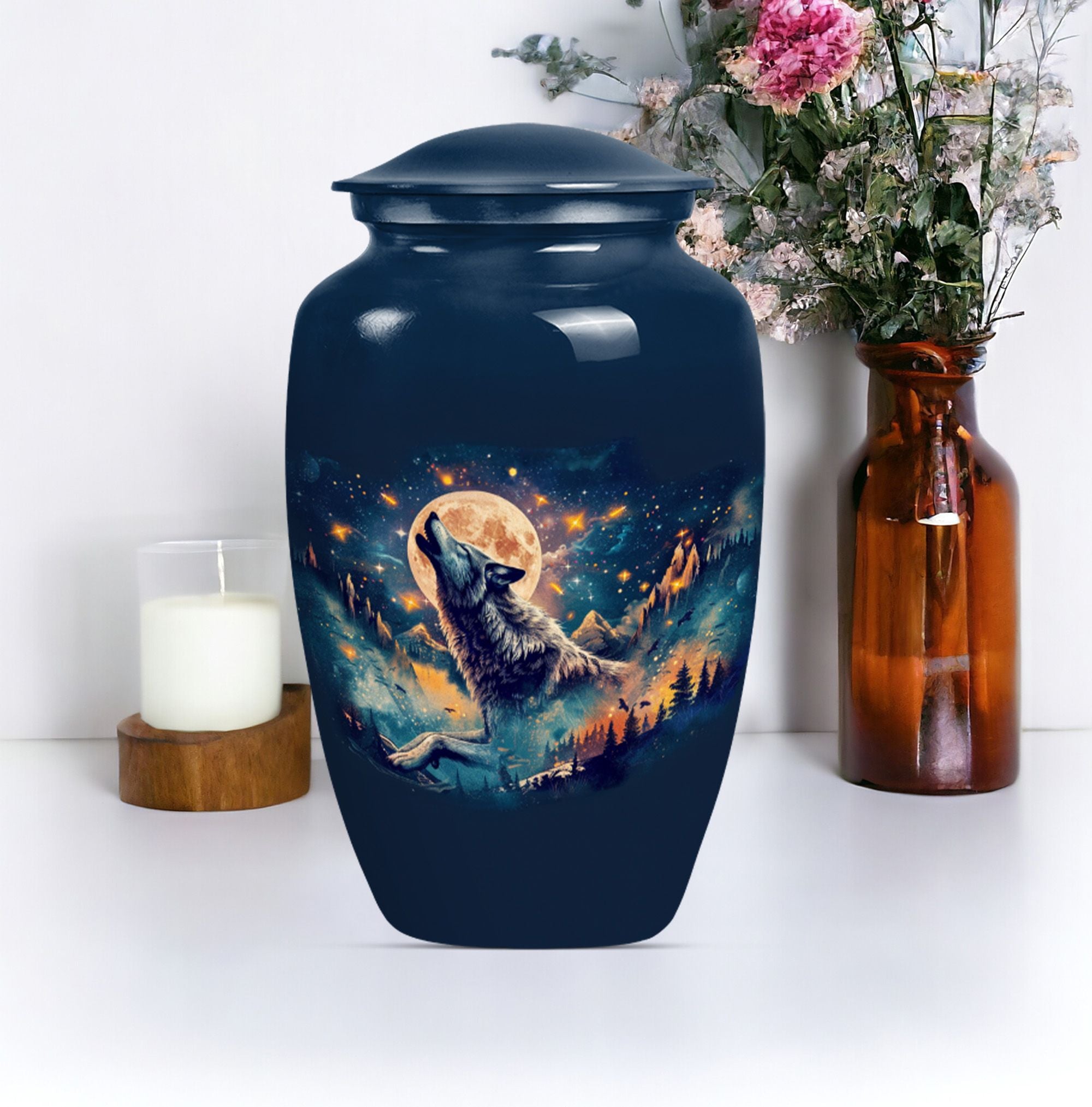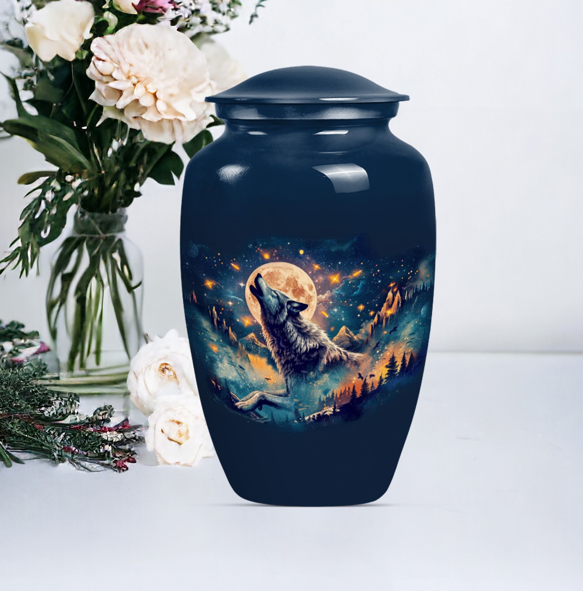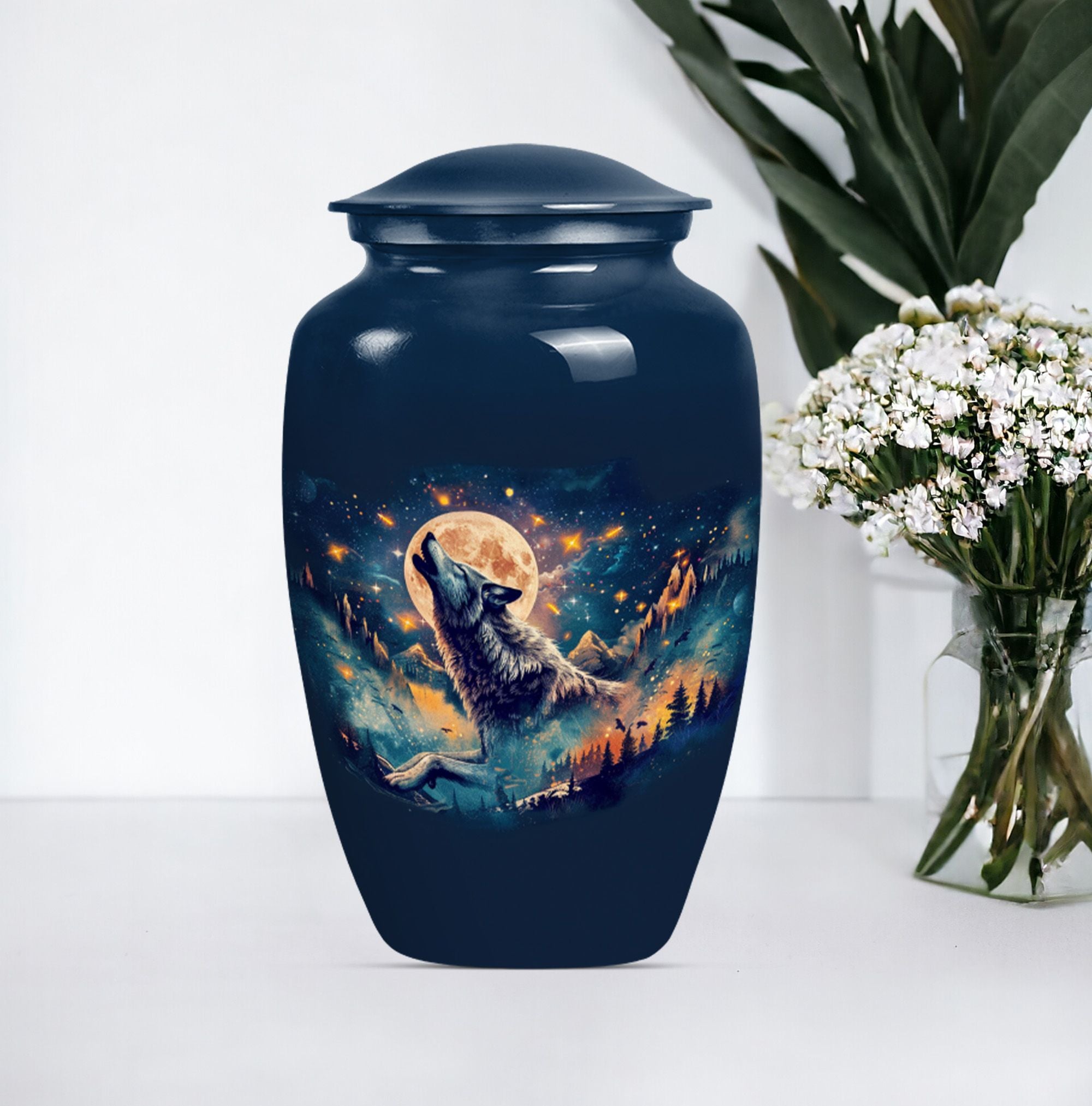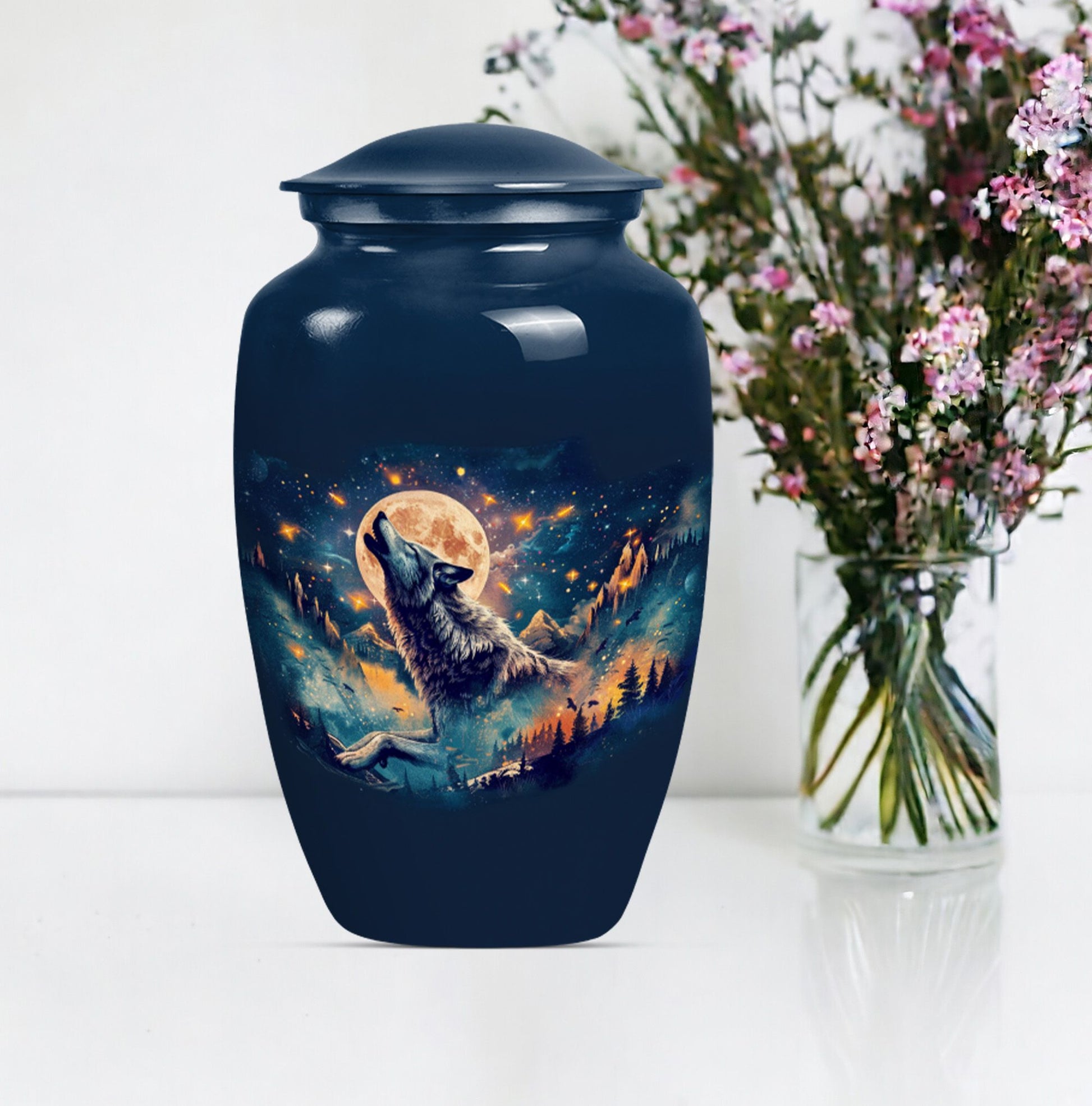 Take hold of a tangible memory of a loved one with this elegant Wolf urn, an ideal memorial large urn for ashes. With its 10-inch stature, it strikes a prominent and dignified presence in the room. Crafted from resilient aluminum, this large urn weighs 3.3 pounds and can hold up to 200 cubic inches of ashes. Its abstract theme channels a sense of artistry and spirit, a perfect homage for those artistic souls. The urn comes with a velvet pouch to safely hold the ashes and allows for personalization, adding a touch of intimacy to a memorial reminder. Unlike common cremation urns, this handcrafted urn features ornate detailing synonymous with luxurious design. Frequently sought out for s ash urn for adults and funeral urns for women's ashes, this memorabilia is a poignant reminder of shared moments and personal connections. Set a loving ambience to any memorial ceremony with this abstract-themed urn. A tribute for all times, capturing remembrance in an artistically handcrafted form.