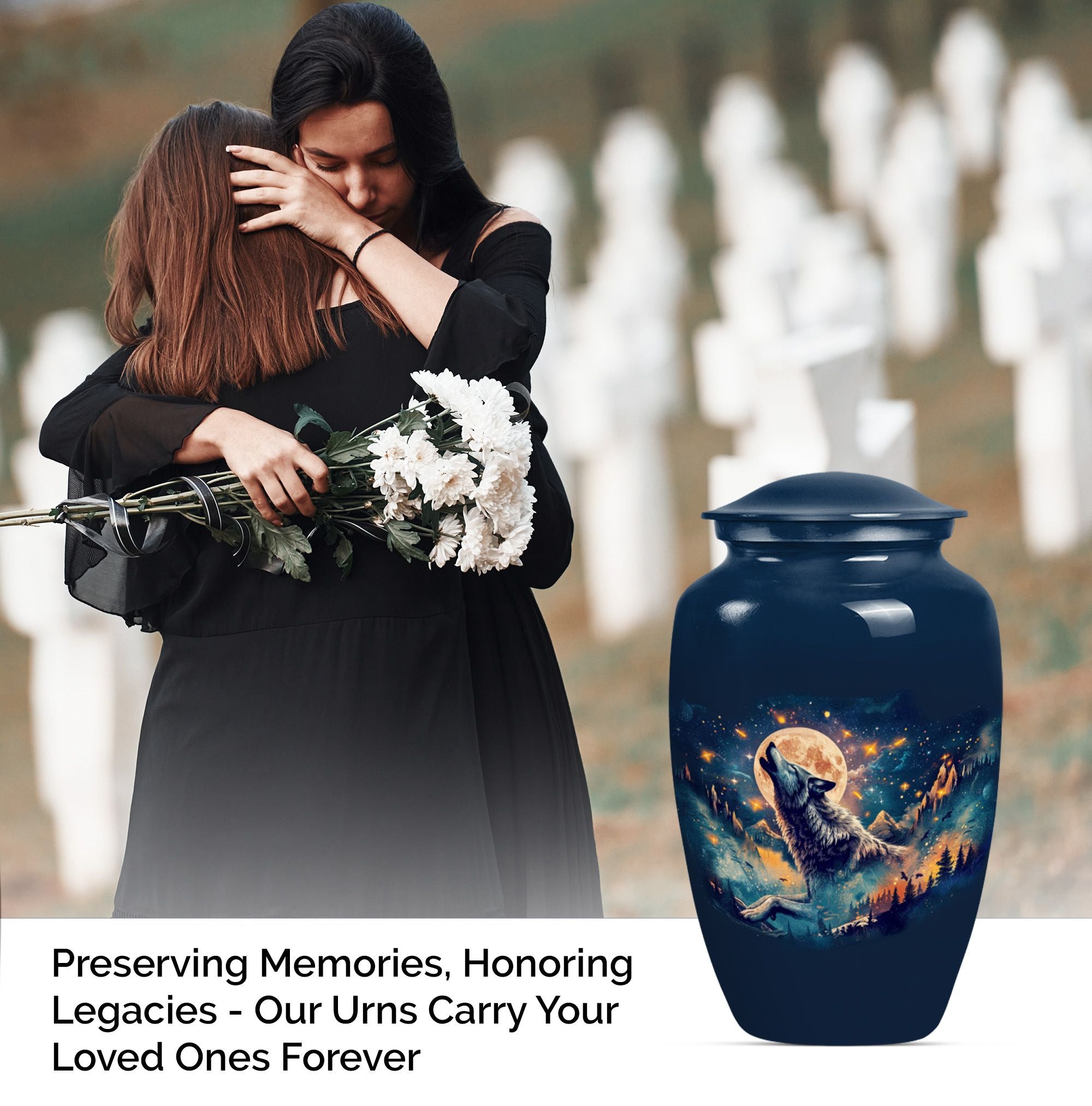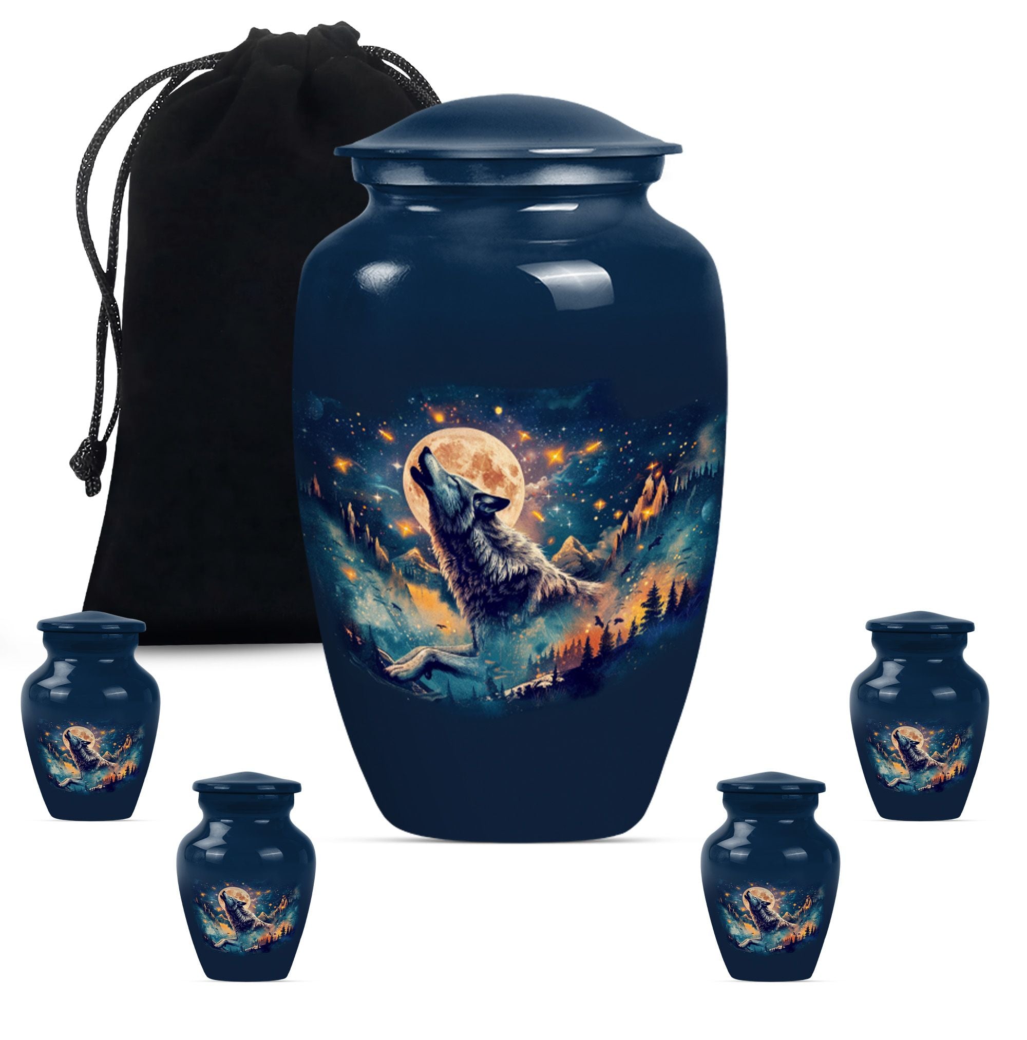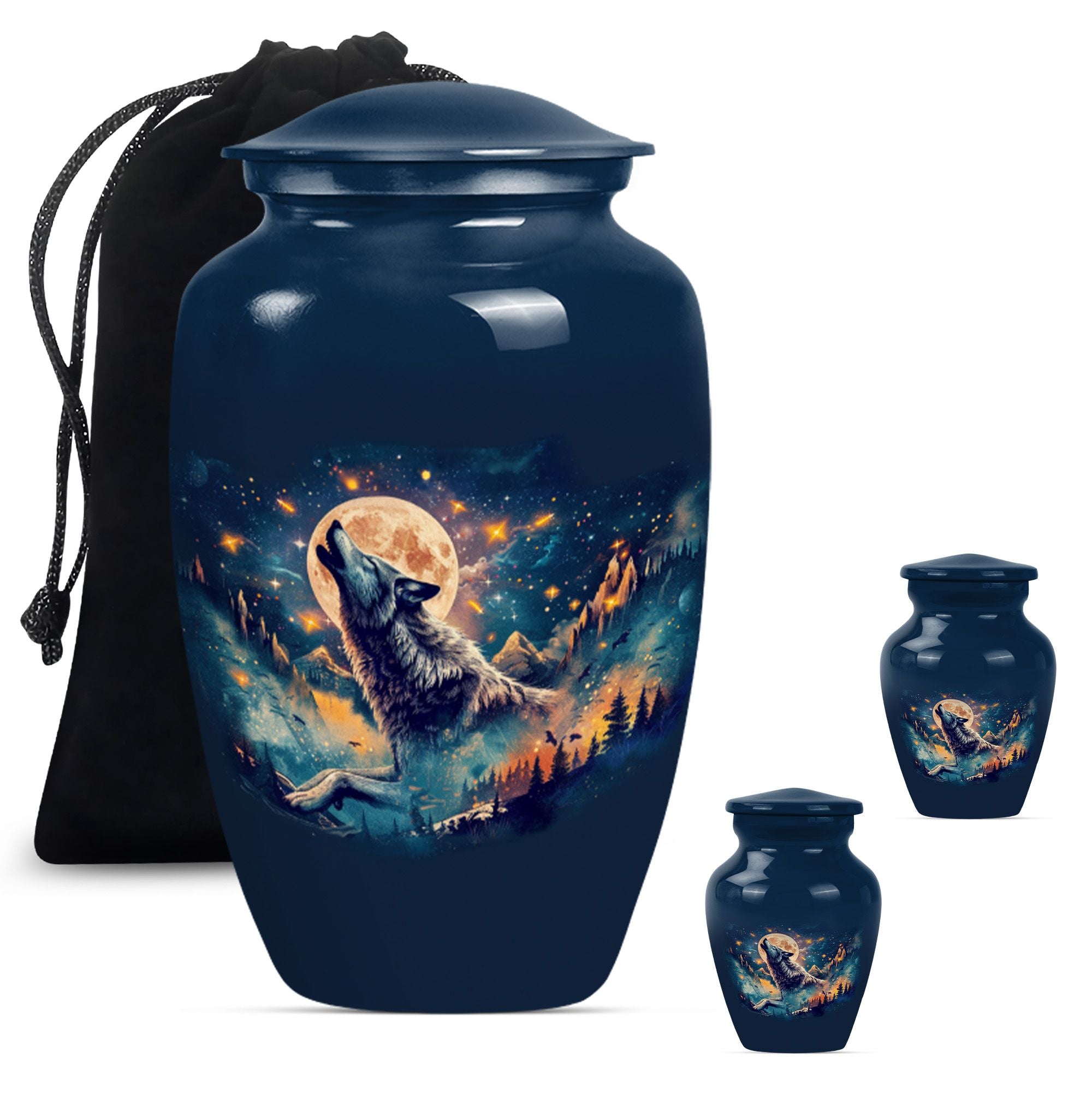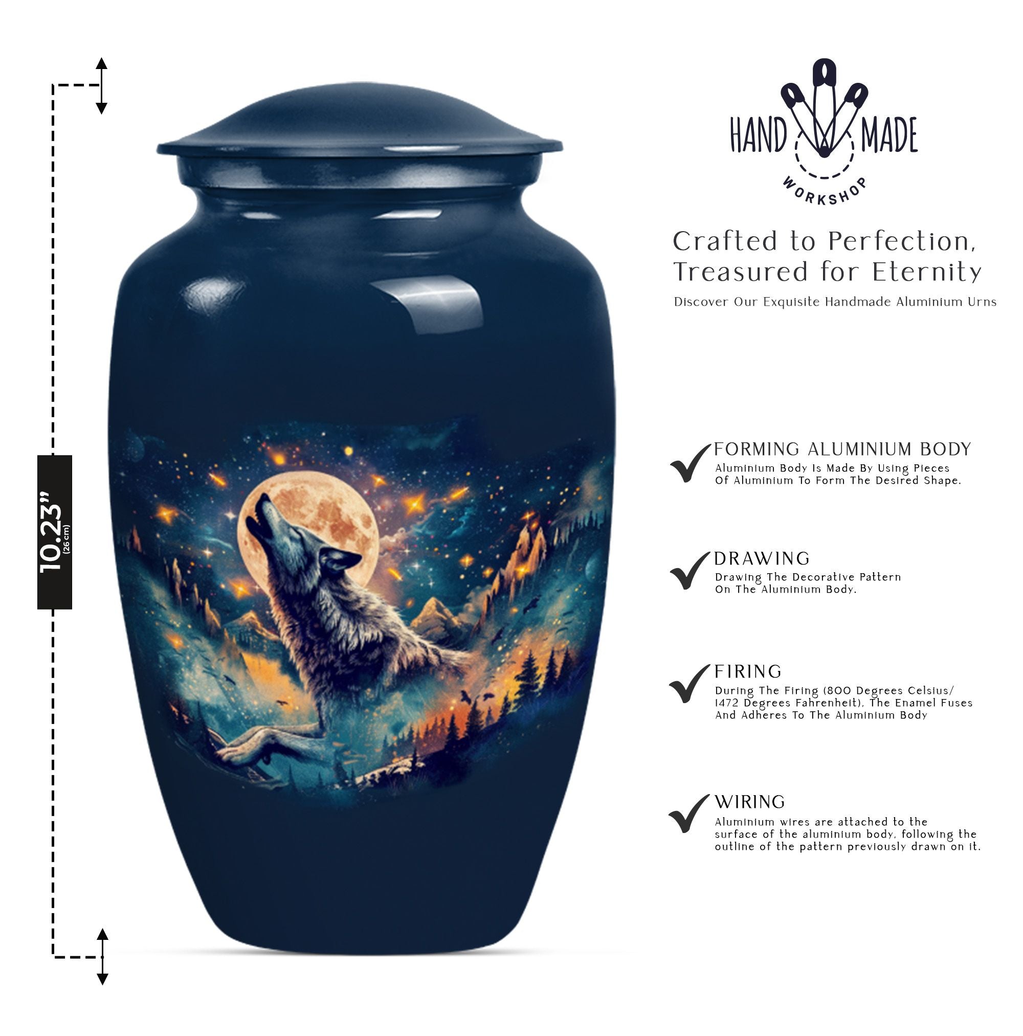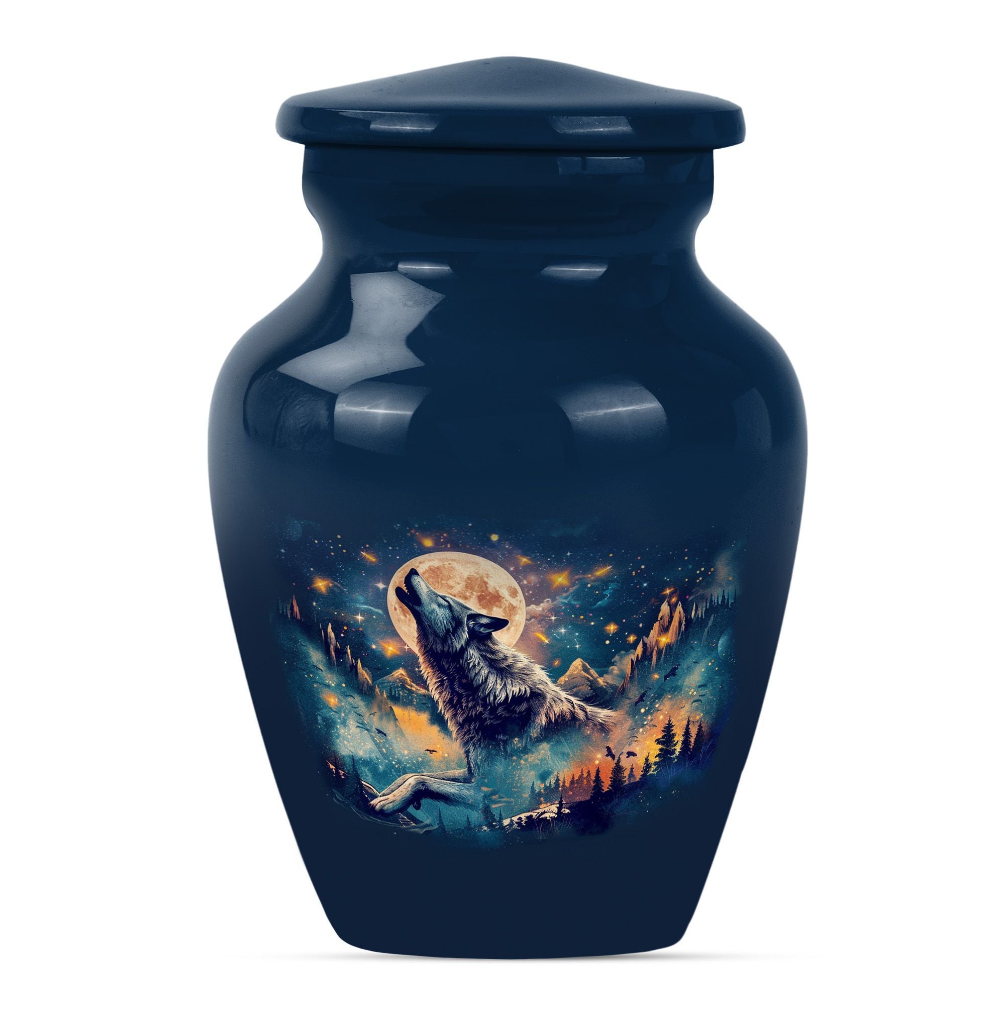 Take hold of a tangible memory of a loved one with this elegant Wolf urn, an ideal memorial large urn for ashes. With its 10-inch stature, it strikes a prominent and dignified presence in the room. Crafted from resilient aluminum, this large urn weighs 3.3 pounds and can hold up to 200 cubic inches of ashes. Its abstract theme channels a sense of artistry and spirit, a perfect homage for those artistic souls. The urn comes with a velvet pouch to safely hold the ashes and allows for personalization, adding a touch of intimacy to a memorial reminder. Unlike common cremation urns, this handcrafted urn features ornate detailing synonymous with luxurious design. Frequently sought out for s ash urn for adults and funeral urns for women's ashes, this memorabilia is a poignant reminder of shared moments and personal connections. Set a loving ambience to any memorial ceremony with this abstract-themed urn. A tribute for all times, capturing remembrance in an artistically handcrafted form.