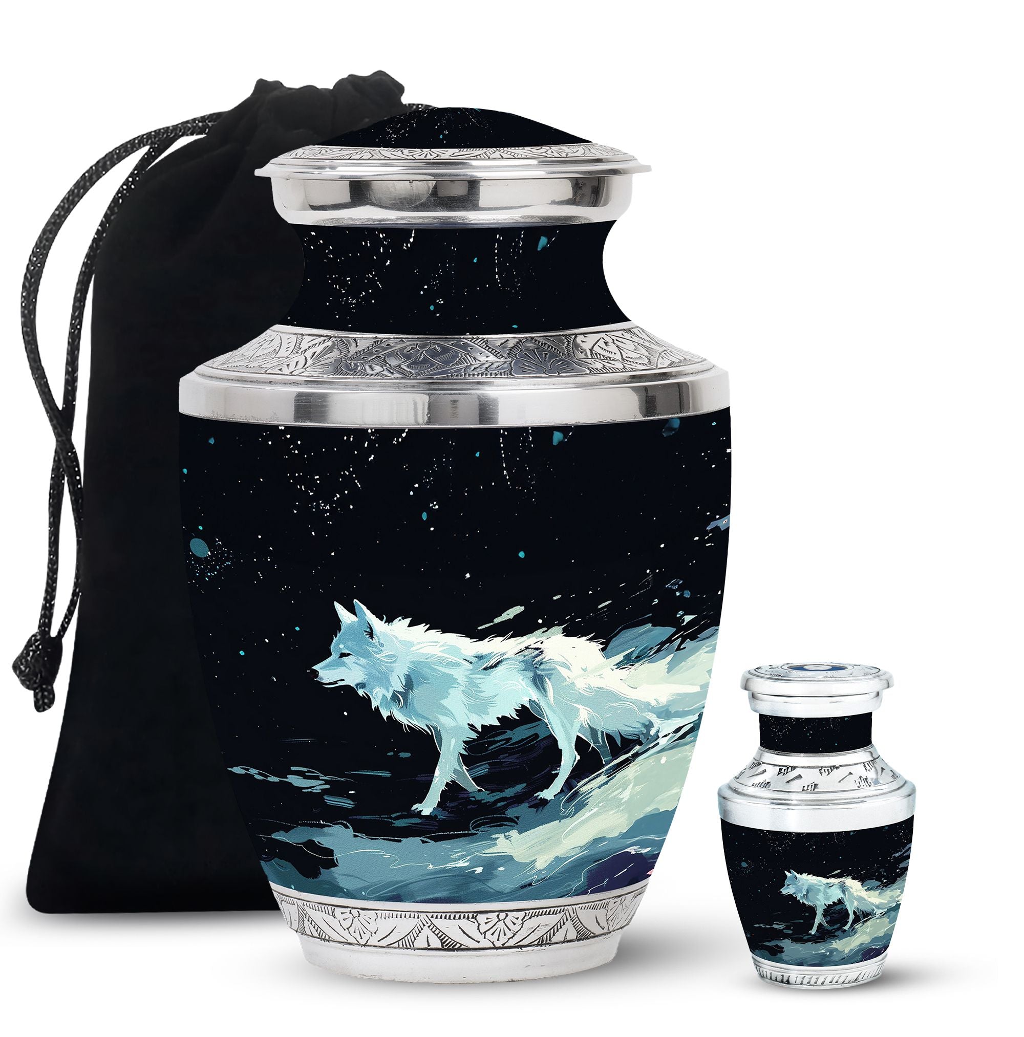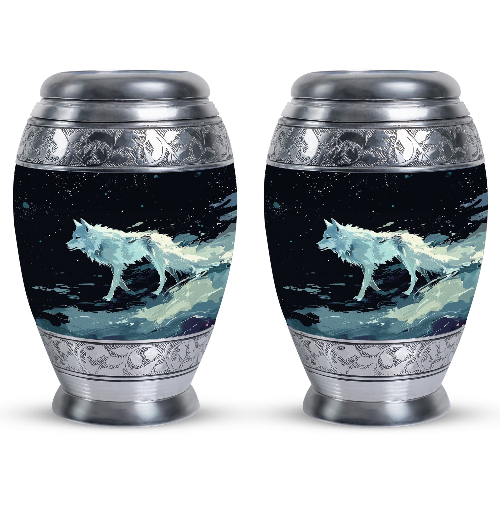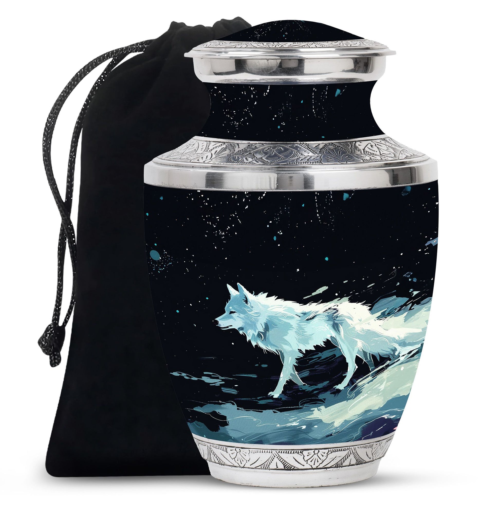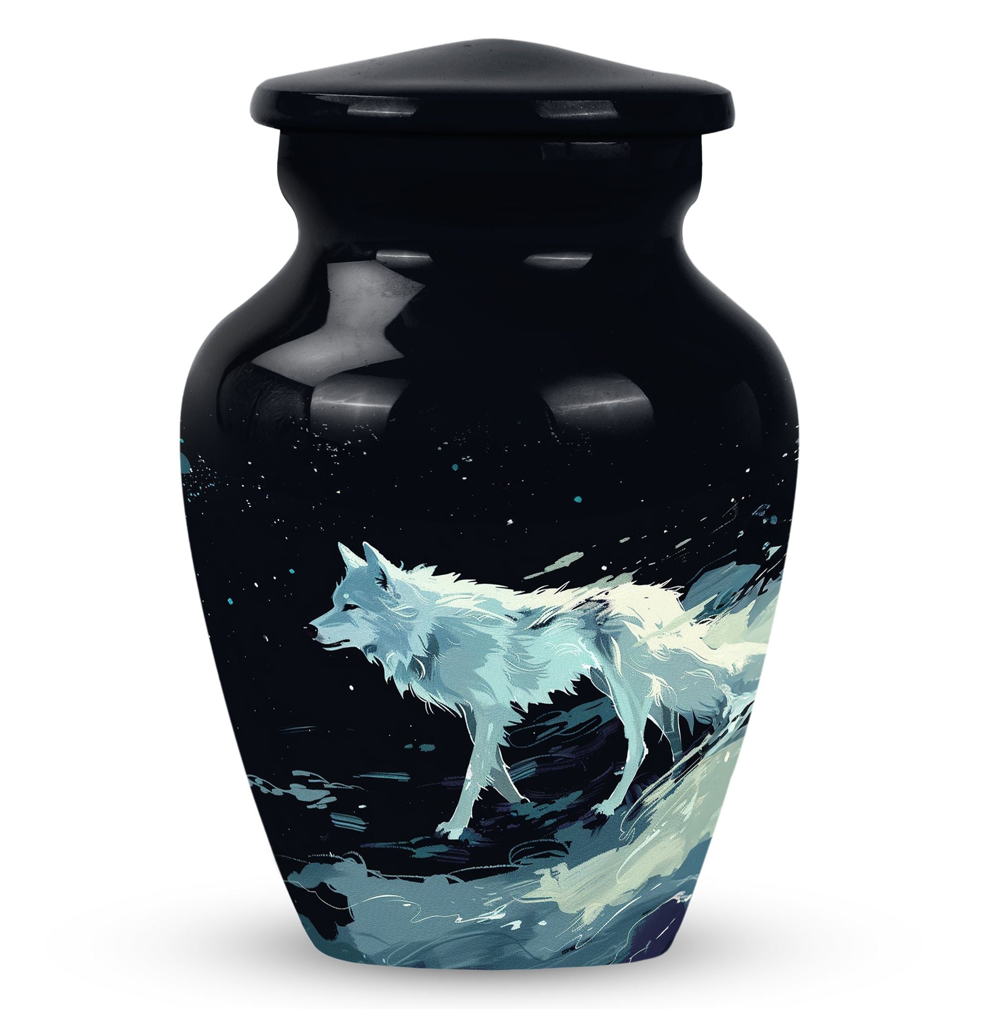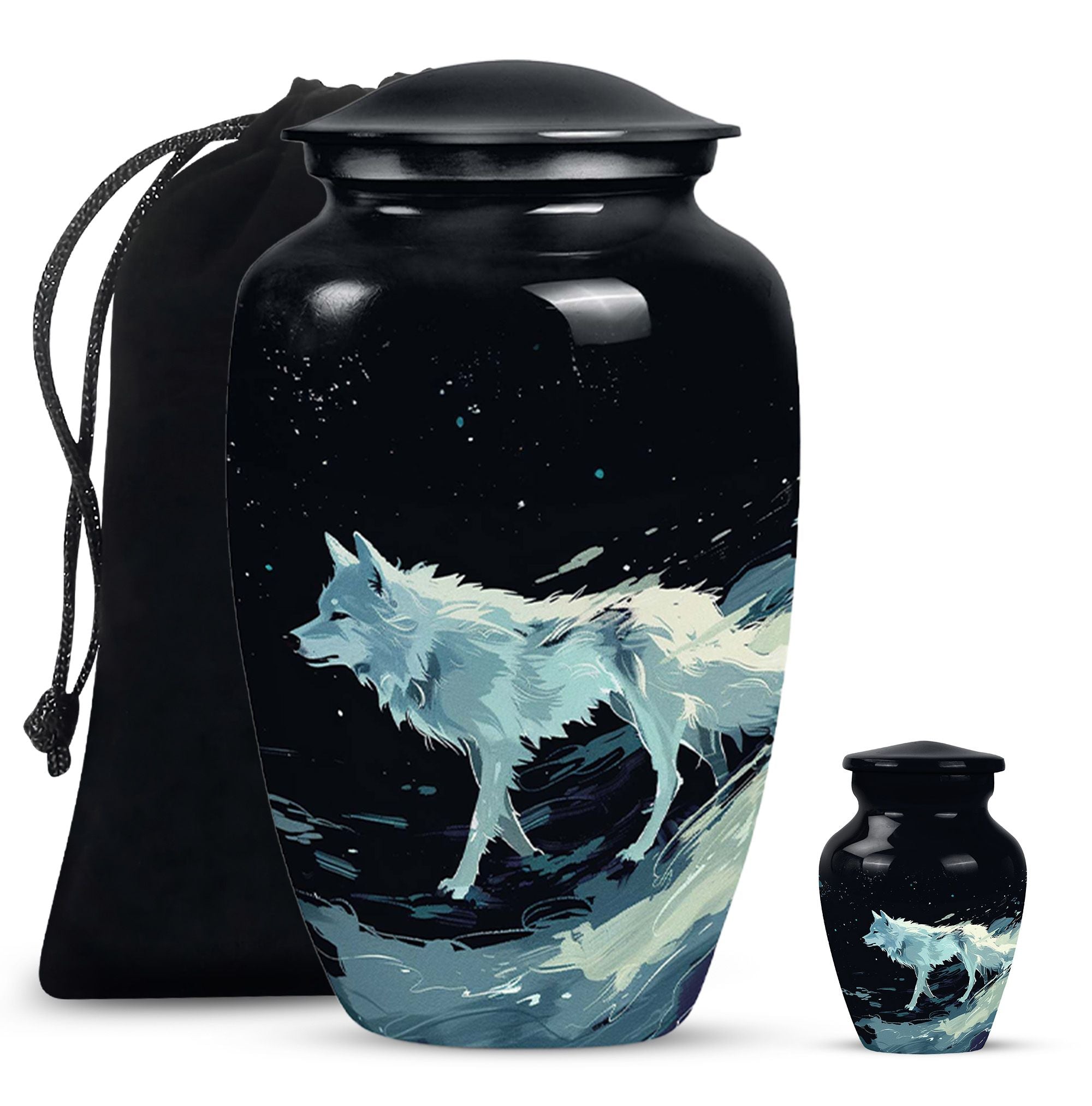 Expertly crafted from high-quality ceramic, this wolf cremation urn combines elegance with durability. The detailed wolf drawing embodies grace and power, making it a striking piece among wolf urns for cremation or cremation urn wolf collections. Its design balances artistry and functionality, offering a secure and stylish resting place for ashes. Ideal as a wolf urn for ashes, it complements both traditional and contemporary urnes style wolf displays.