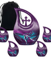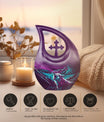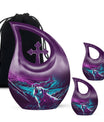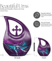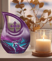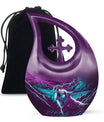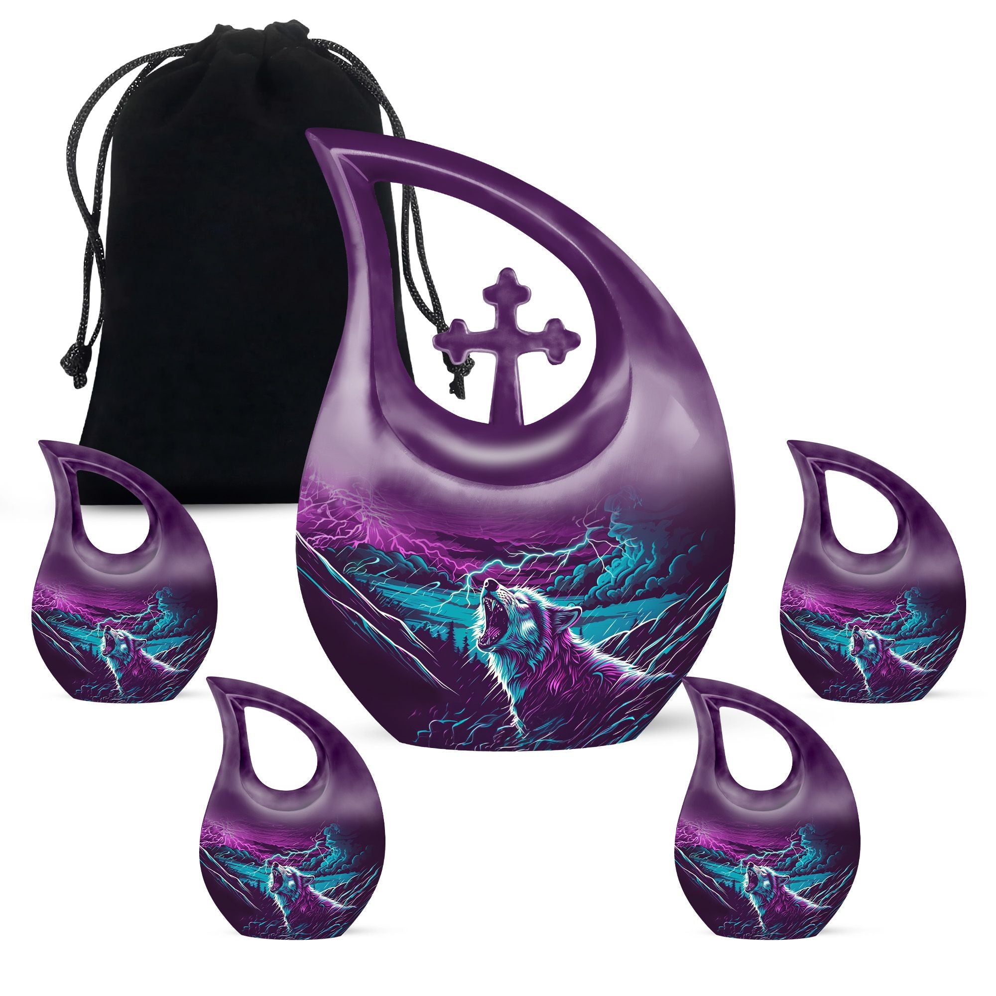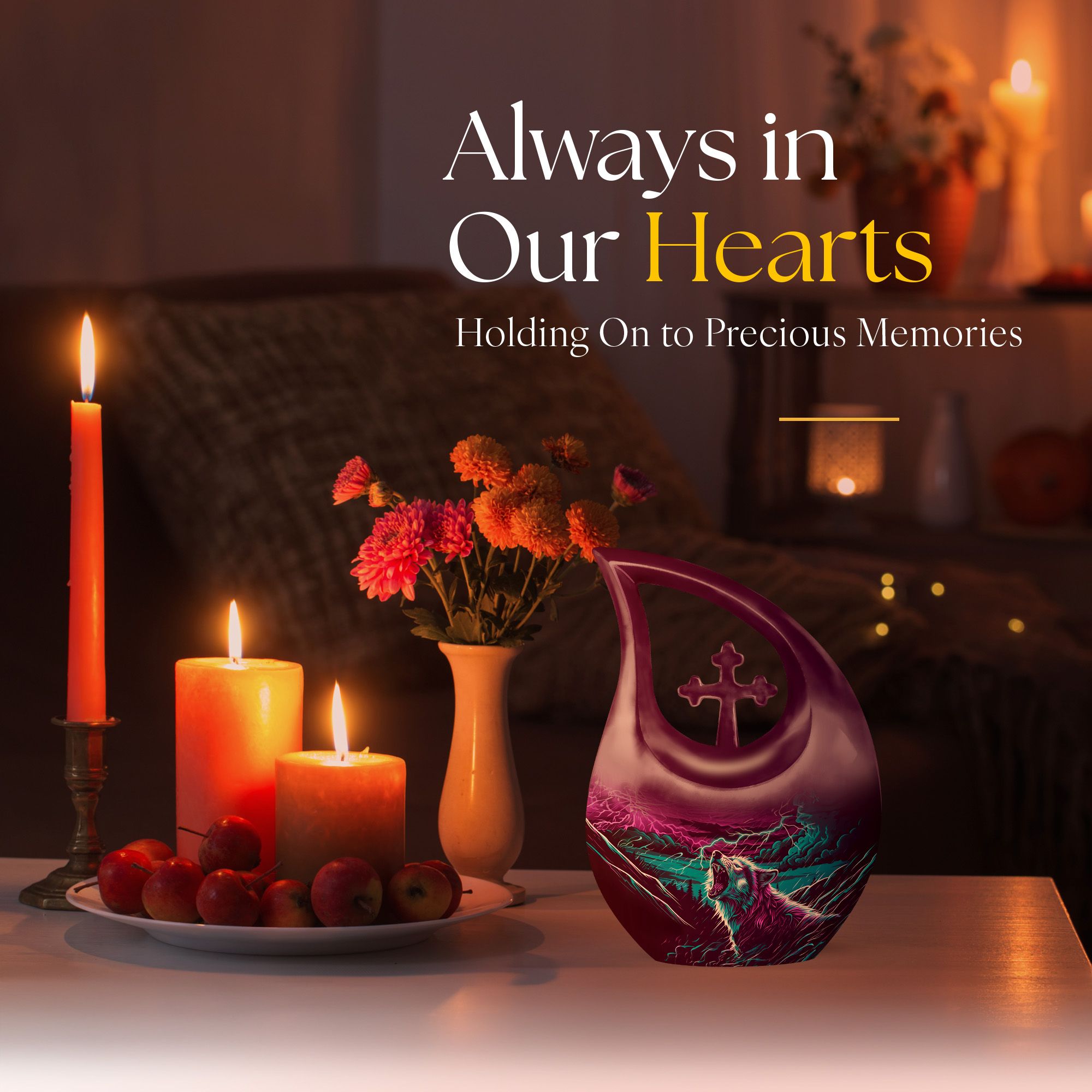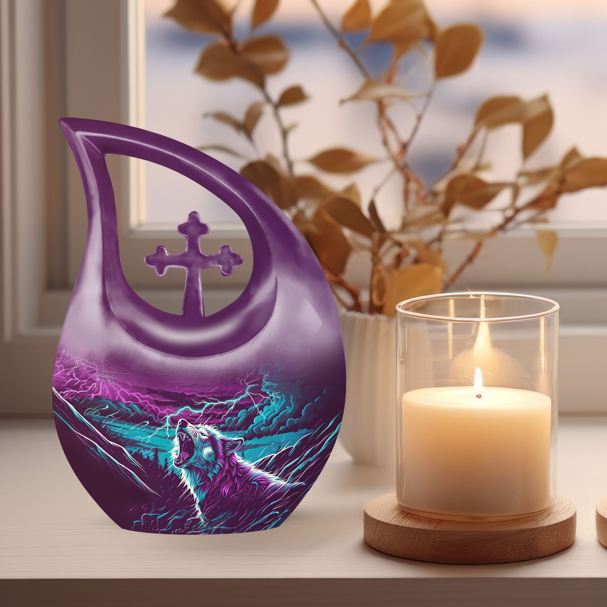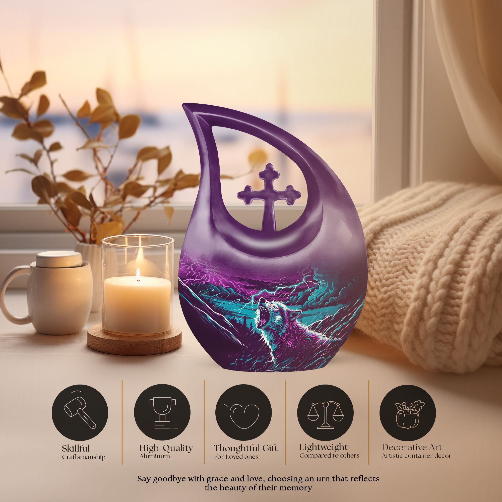 Honor your beloved with our beautifully designed Wolf Urn. Within the religious and ceremonial sector, this urn excels with its distinct cross drop layout showcasing an evocative wolf theme. Standing at a notable 10 inches and a weight of 3.3 pounds, this urn has the profound capacity to contain 200 cubic inches, making it categorically ideal as a large urn. Crafted meticulously from durable Aluminium, our urn stands as a testament to the talent of our artisans and your lasting love. Each urn is accompanied by a velvet pouch, excellent for the safeguarding of ash remnants. The Wolf Urn also offers enhancement through personalization, allowing you to etch names into its surface for a more intimate touch. Renowned as one of the most affordable urns in our collection, it brings together practicality and sentimental value. Though it effectively functions as an urn for human ashes, its unique design also makes it highly covetable as a miniature urn for ashes. Discover harmony in remembrance with our Wolf Urn.