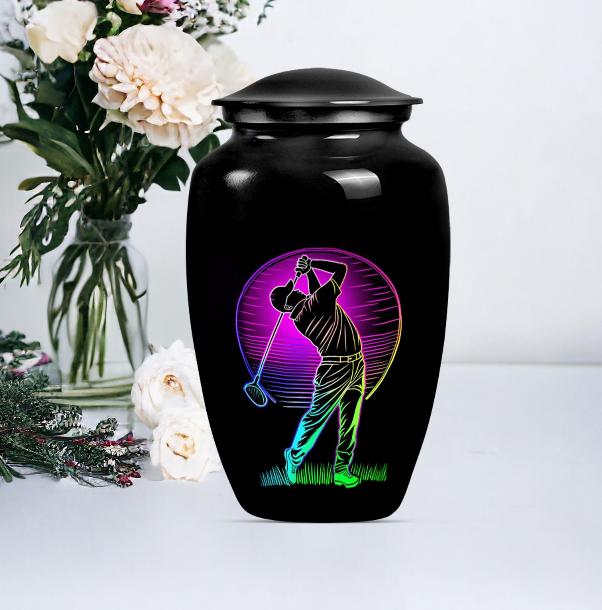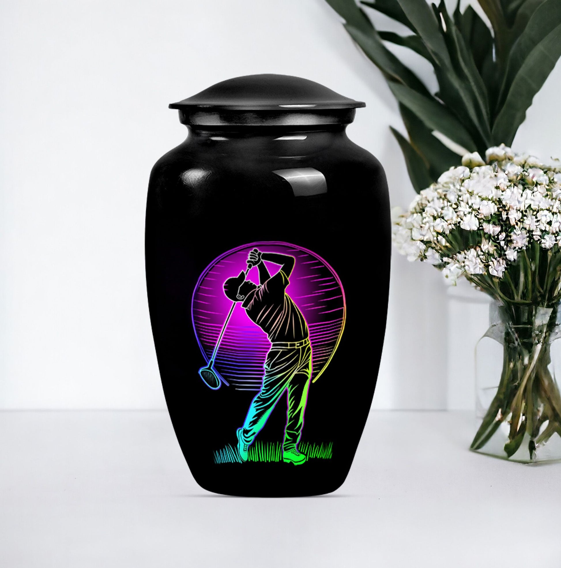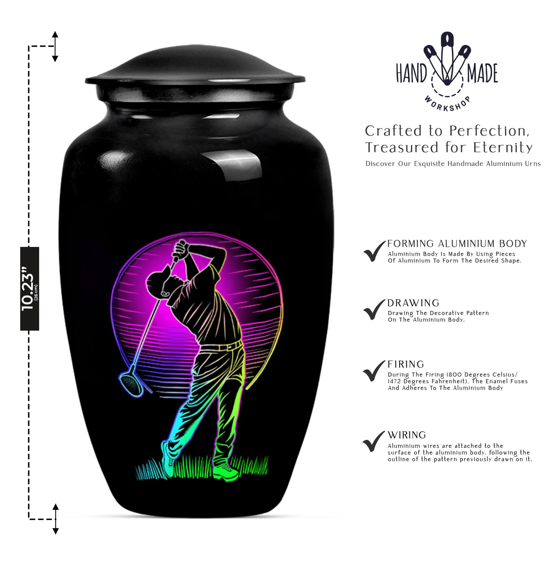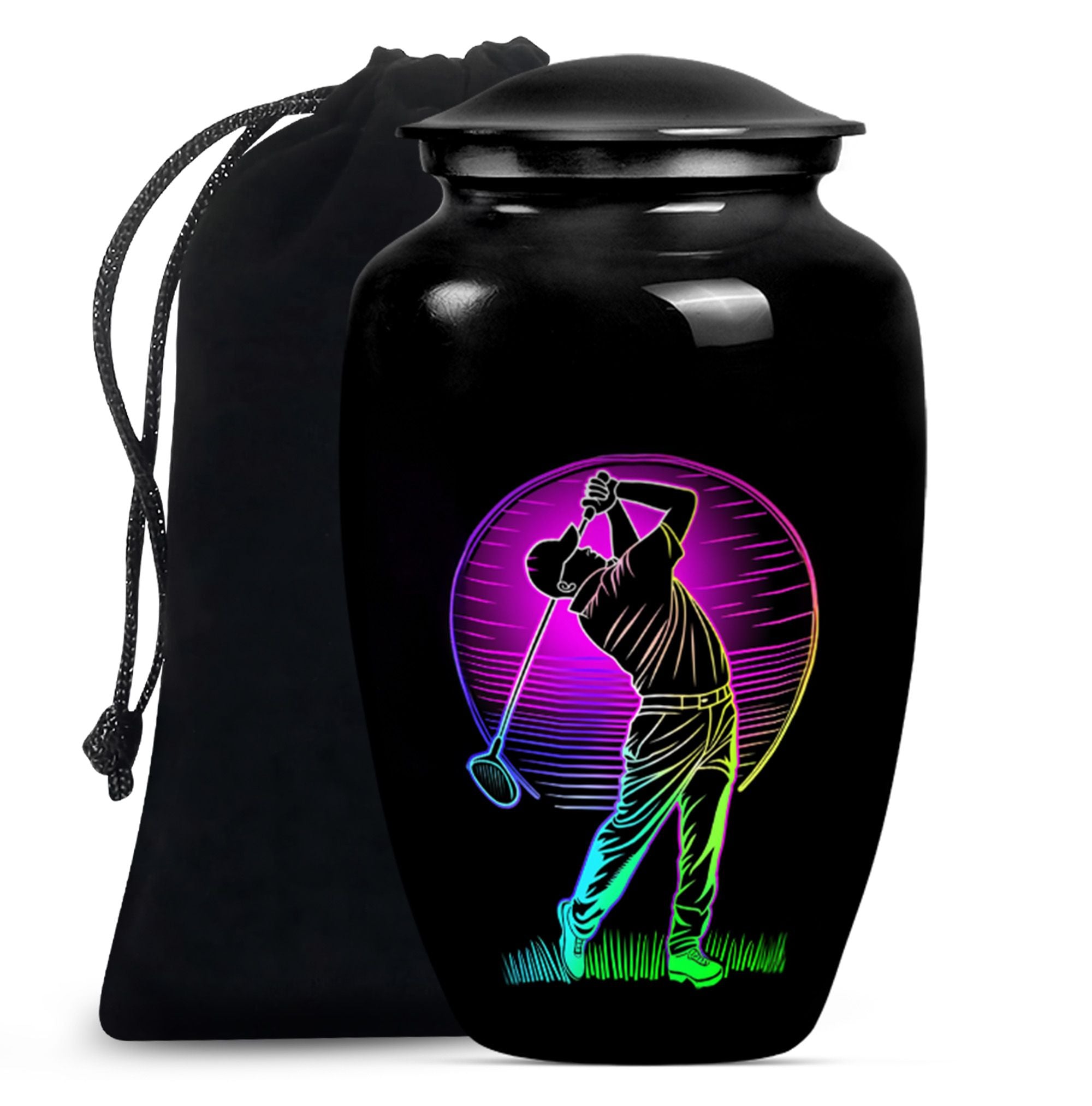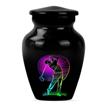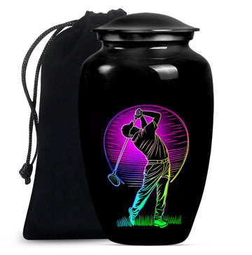 Designed with compassion and meticulous attention to detail, this 'Classic Urn' offers a dignified and beautiful resting place for your beloved one. Built with lasting Aluminium, this 10-inch 'Golf Urn' exhibits a subtle abstract theme, reflecting tranquility and timeless elegance. The urn has a weight of 3.3 pounds and dimensions of a stately 10 inches in height, ensuring an ideal choice for large urns or burial urns for adult women to commemorate their lives. With a capacity of 200 cubic inches, it comfortably houses the ashes, providing a serene embrace in the velvet pouch included. An opportunity to personalize with engraved names adds a unique touch to each urn, making it not only a memorial piece but also a lasting memento. Search for 'memorial urns' or 'large double cremation urn for two adults' to discover this piece. Avoid the mainstream and opt for this stunning, premium-quality piece.