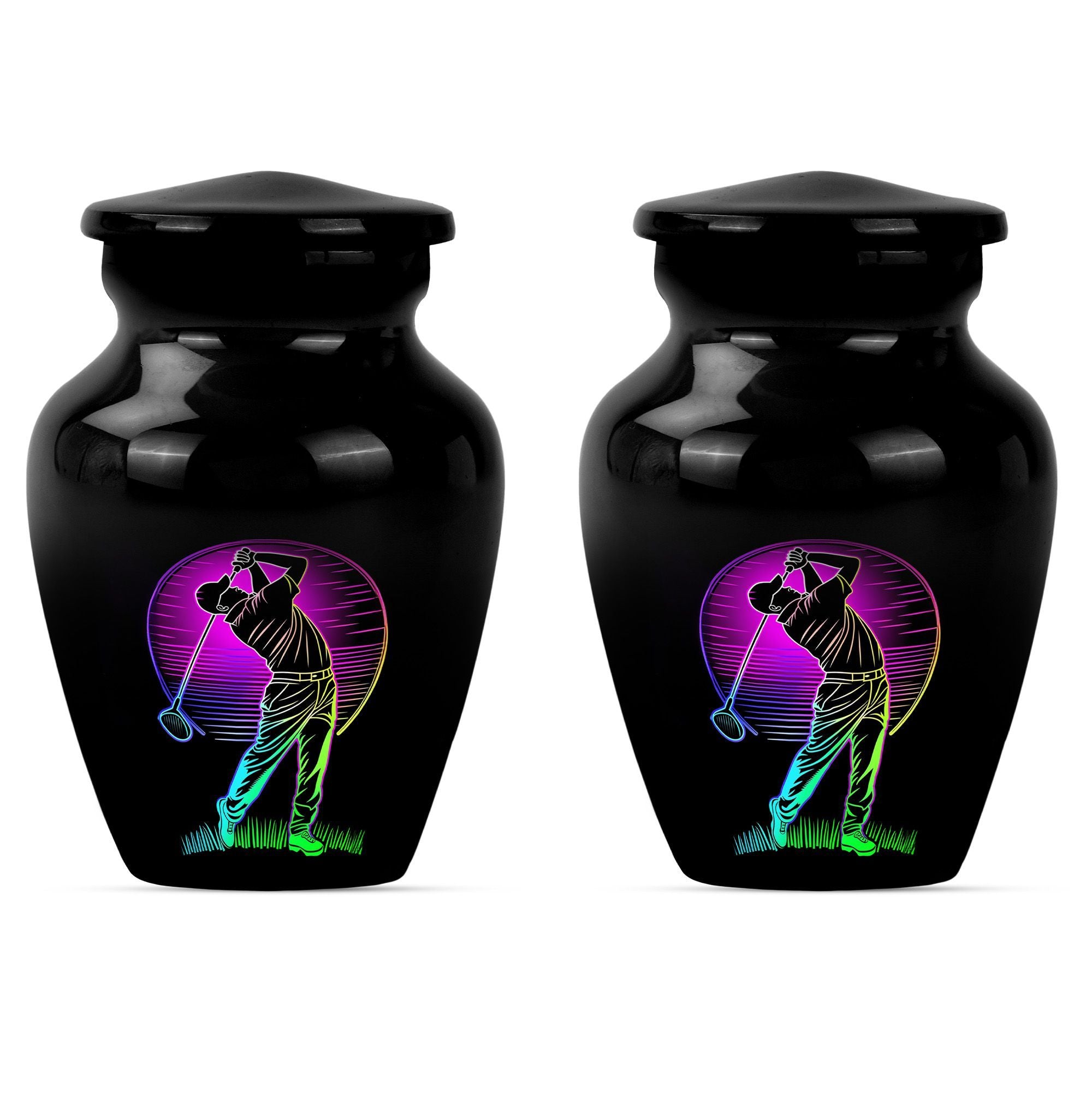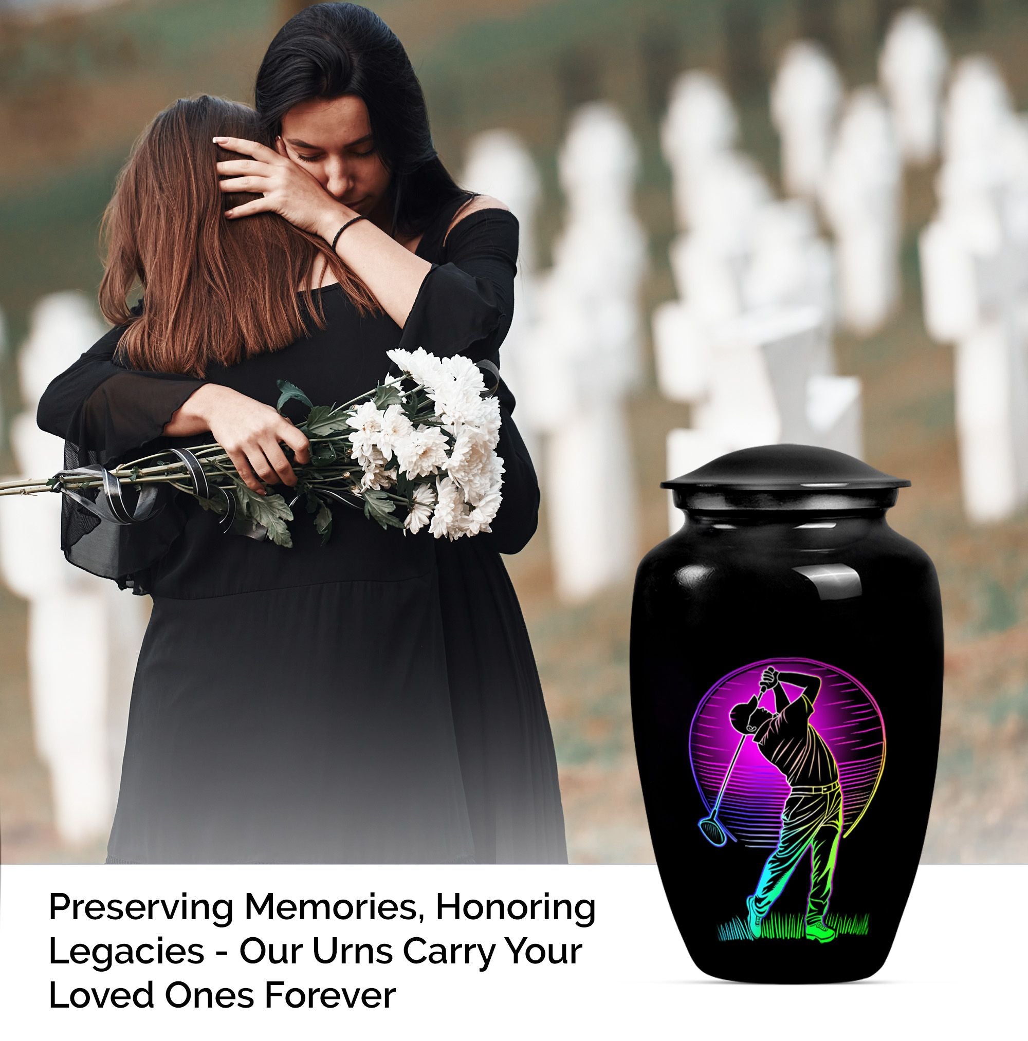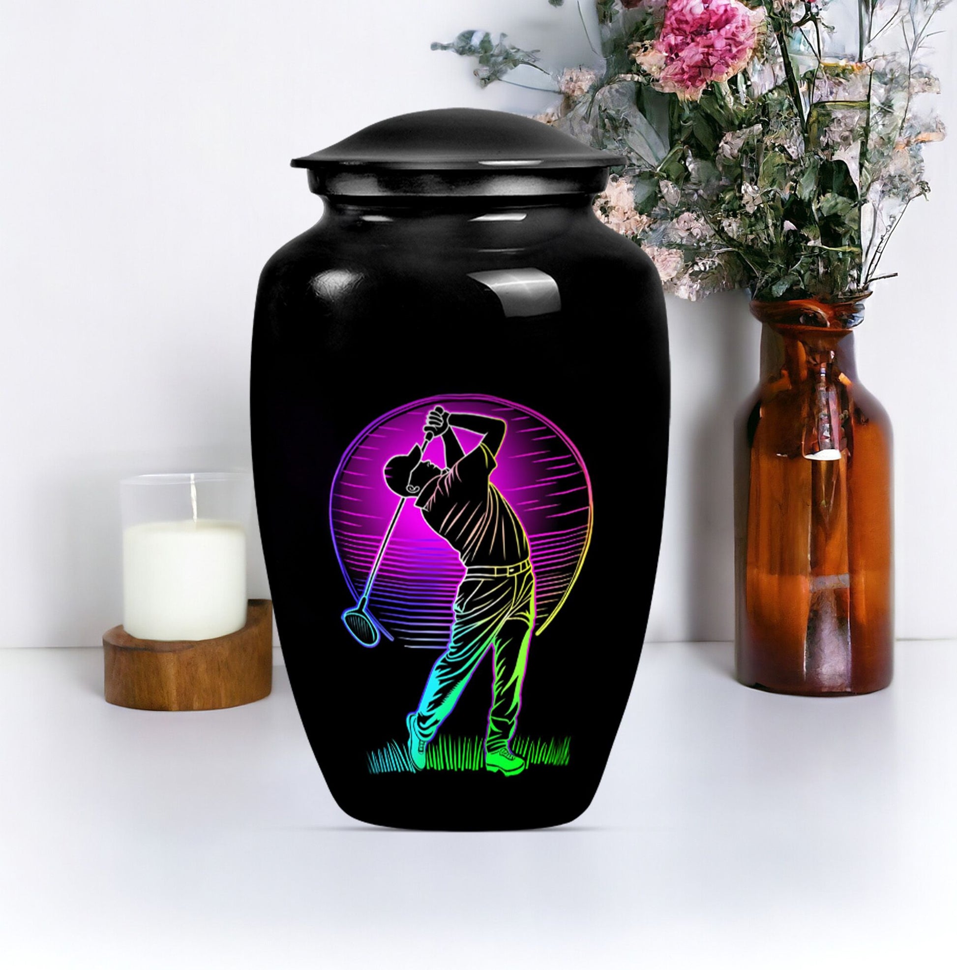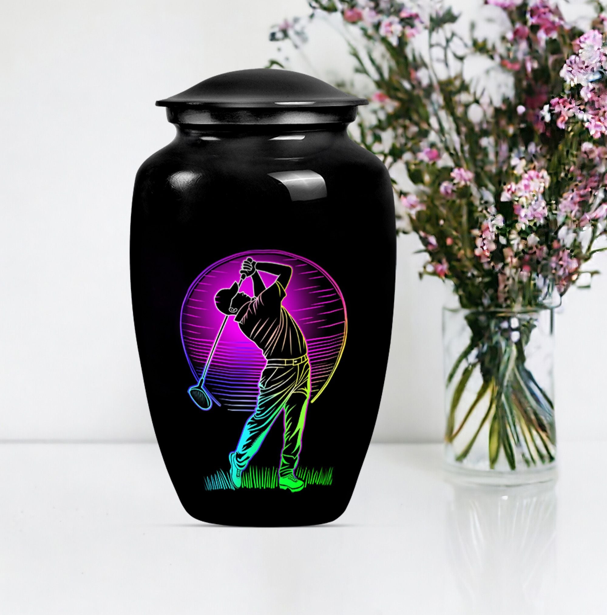 Designed with compassion and meticulous attention to detail, this 'Classic Urn' offers a dignified and beautiful resting place for your beloved one. Built with lasting Aluminium, this 10-inch 'Golf Urn' exhibits a subtle abstract theme, reflecting tranquility and timeless elegance. The urn has a weight of 3.3 pounds and dimensions of a stately 10 inches in height, ensuring an ideal choice for large urns or burial urns for adult women to commemorate their lives. With a capacity of 200 cubic inches, it comfortably houses the ashes, providing a serene embrace in the velvet pouch included. An opportunity to personalize with engraved names adds a unique touch to each urn, making it not only a memorial piece but also a lasting memento. Search for 'memorial urns' or 'large double cremation urn for two adults' to discover this piece. Avoid the mainstream and opt for this stunning, premium-quality piece.