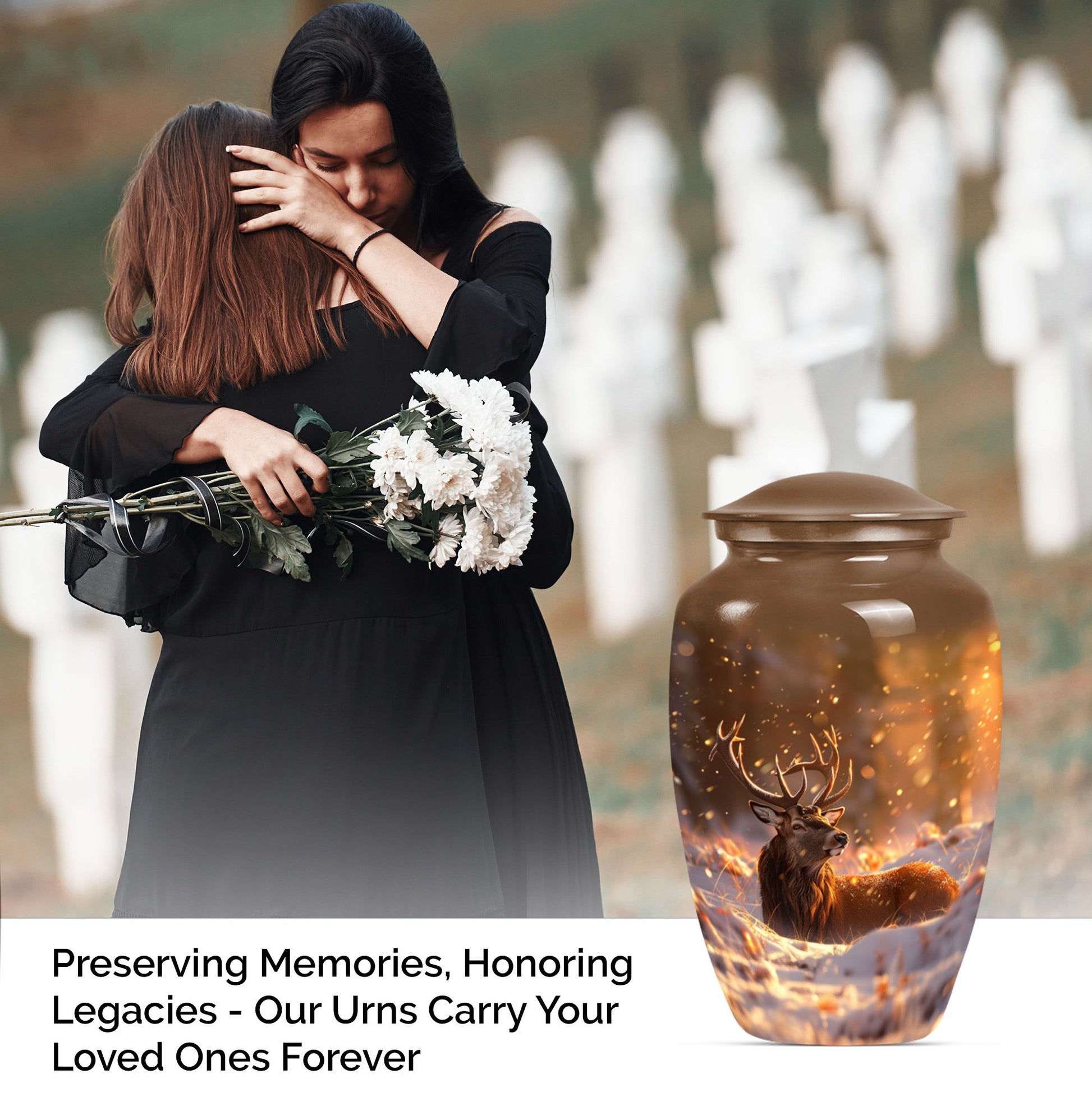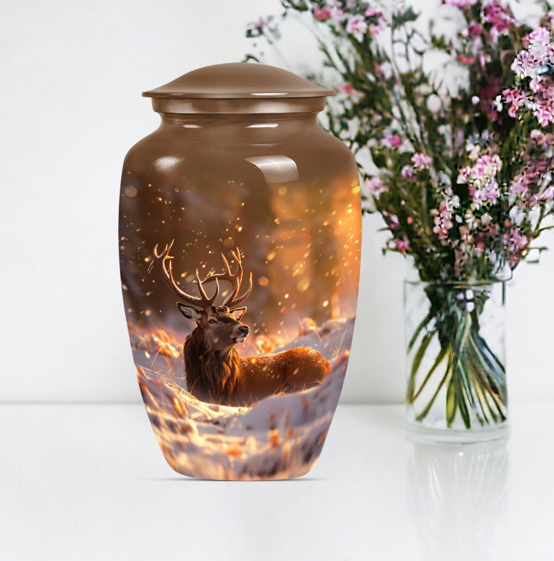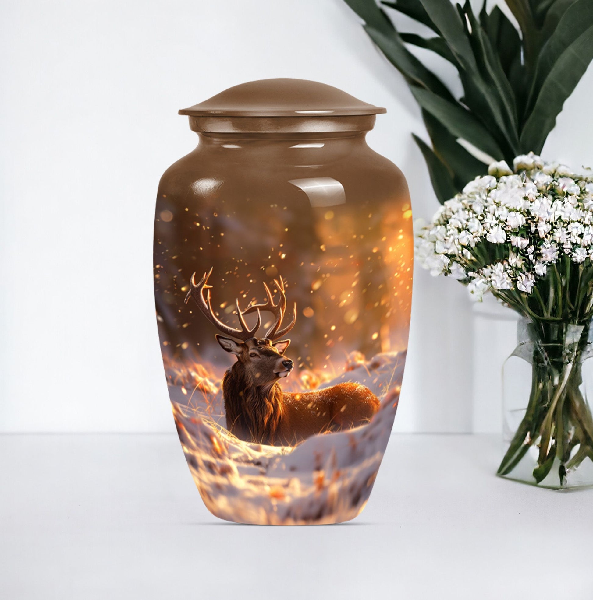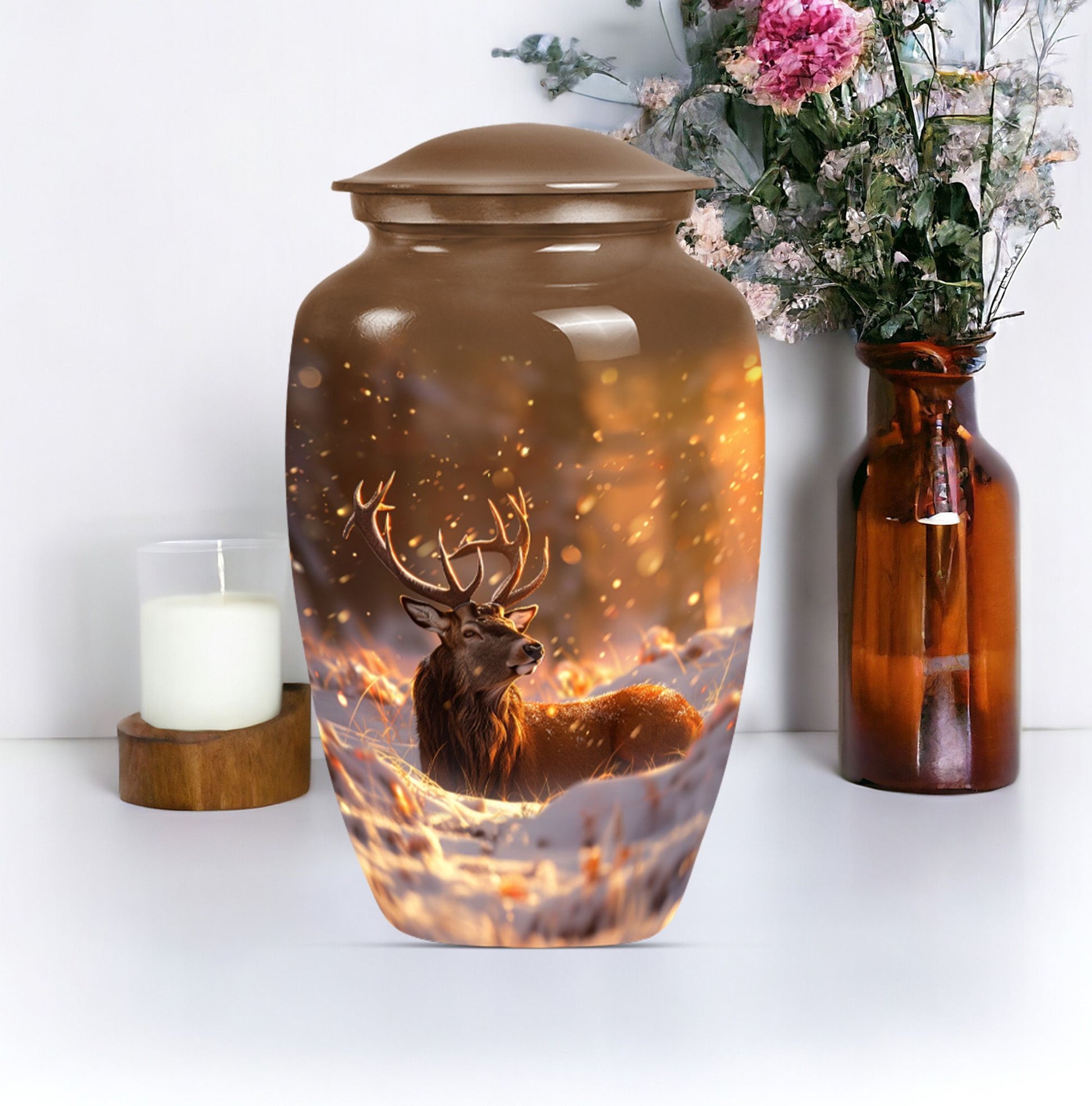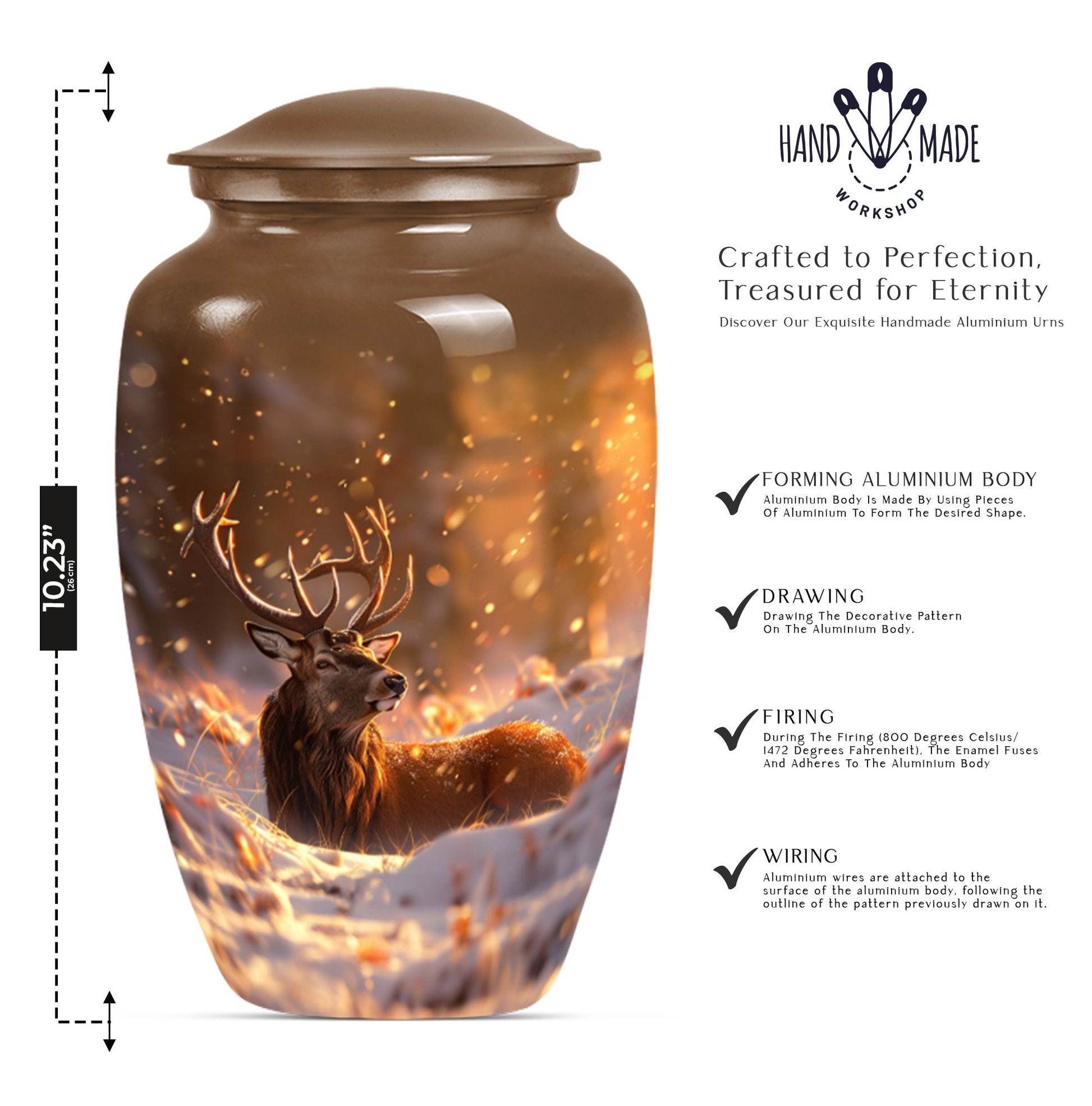 Elevate your memorial tribute with our unique 10 Inch Deer Urn, a classic piece of ceremonial sophistication that pays touching homage to your departed loved one. Crafted from strong and durable aluminium, it boasts a weight of a solid 3.3 pounds, comforting in its substantial heft and impeccable craftmanship. Its size and capacity of 200 cubic inches makes it an eminent choice for those seeking burial large urns for ashes for women, or even memorial cremation urns for men. Enhancing the personalization aspect, we offer the ability to engrave names on this special urn for a more intimate touch. Our standout Deer Urn is gracefully adorned with an evocative 'Wolf Howling' theme, marrying deep symbolism with timeless style. Your purchase includes a velvet pouch, providing an elegant and secure containment for ashes. In the world of burial cremation urns, memorial gifts and double cremation urns for two adults, our Deer Cremation Urn stands robustly unique, a testament to the love and memories you hold dear.
