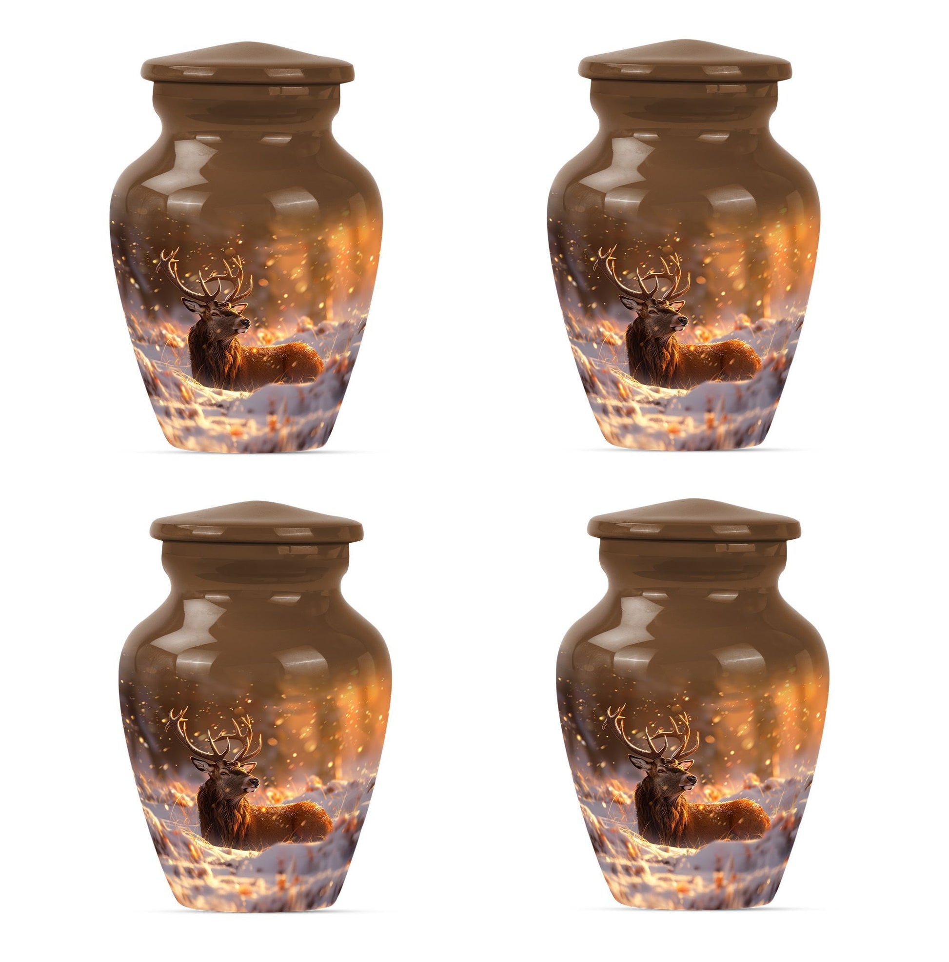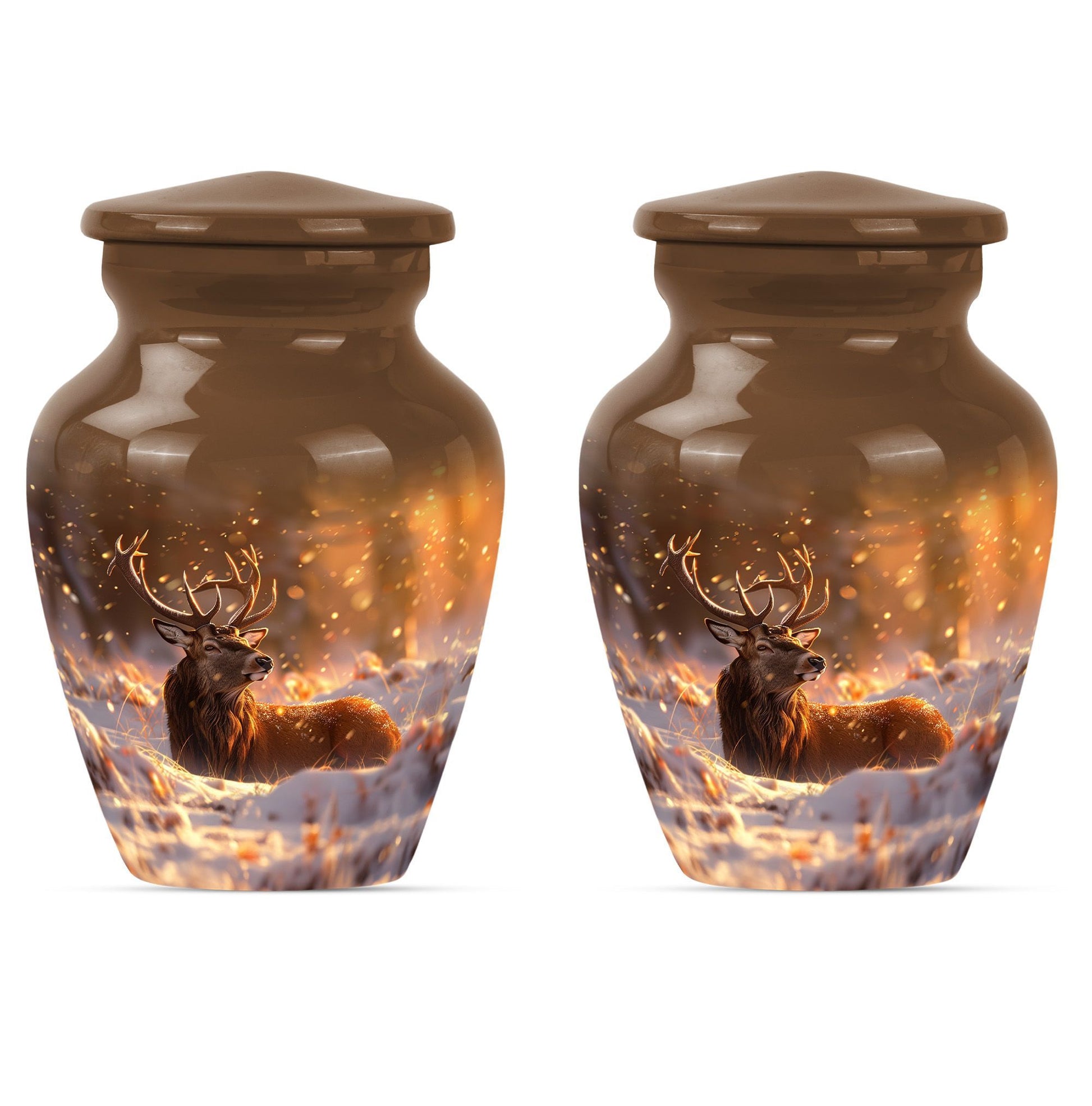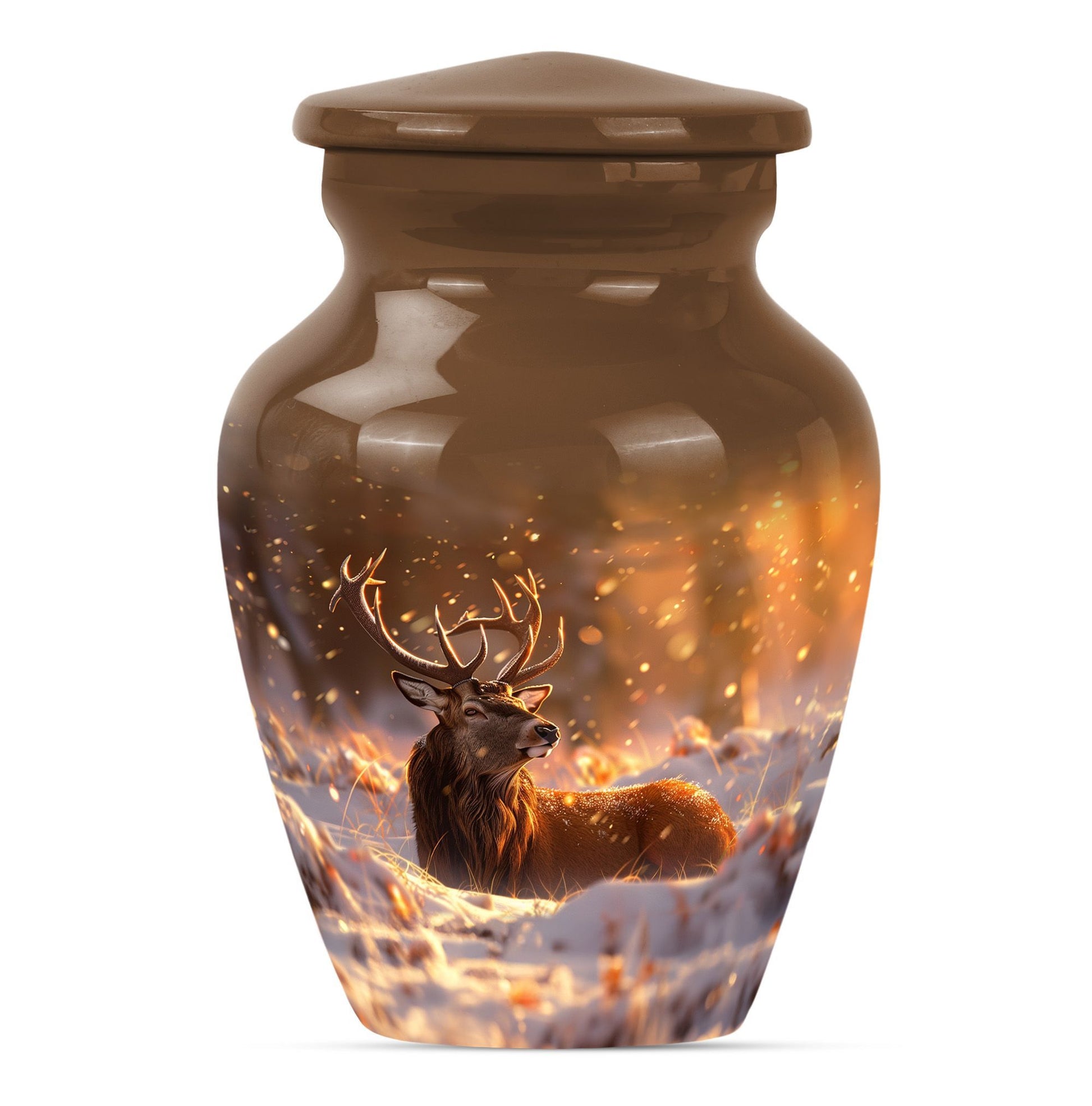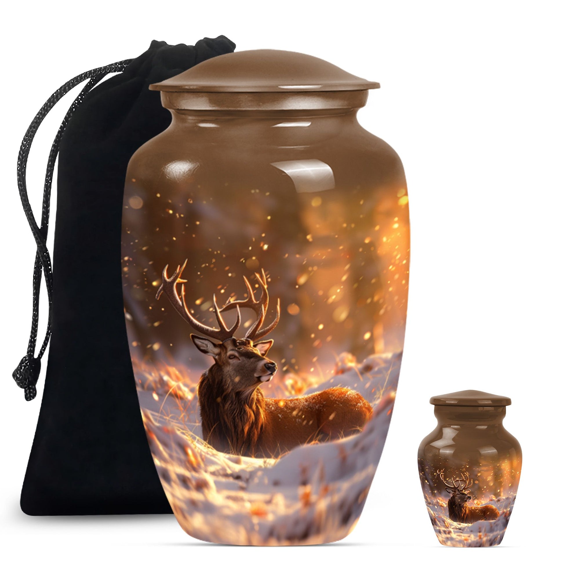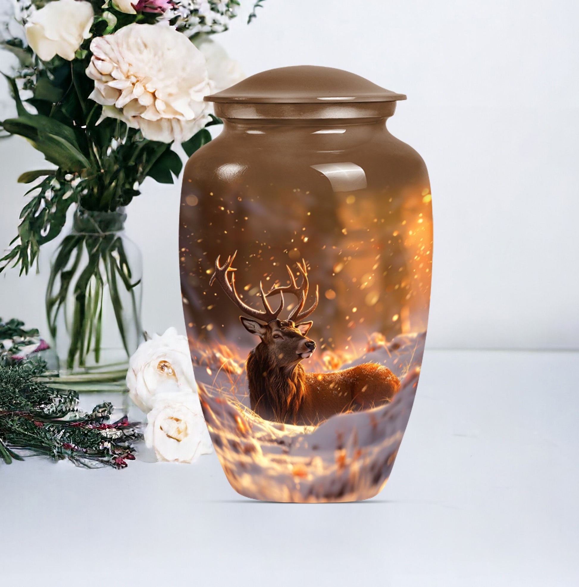 Elevate your memorial tribute with our unique 10 Inch Deer Urn, a classic piece of ceremonial sophistication that pays touching homage to your departed loved one. Crafted from strong and durable aluminium, it boasts a weight of a solid 3.3 pounds, comforting in its substantial heft and impeccable craftmanship. Its size and capacity of 200 cubic inches makes it an eminent choice for those seeking burial large urns for ashes for women, or even memorial cremation urns for men. Enhancing the personalization aspect, we offer the ability to engrave names on this special urn for a more intimate touch. Our standout Deer Urn is gracefully adorned with an evocative 'Wolf Howling' theme, marrying deep symbolism with timeless style. Your purchase includes a velvet pouch, providing an elegant and secure containment for ashes. In the world of burial cremation urns, memorial gifts and double cremation urns for two adults, our Deer Cremation Urn stands robustly unique, a testament to the love and memories you hold dear.